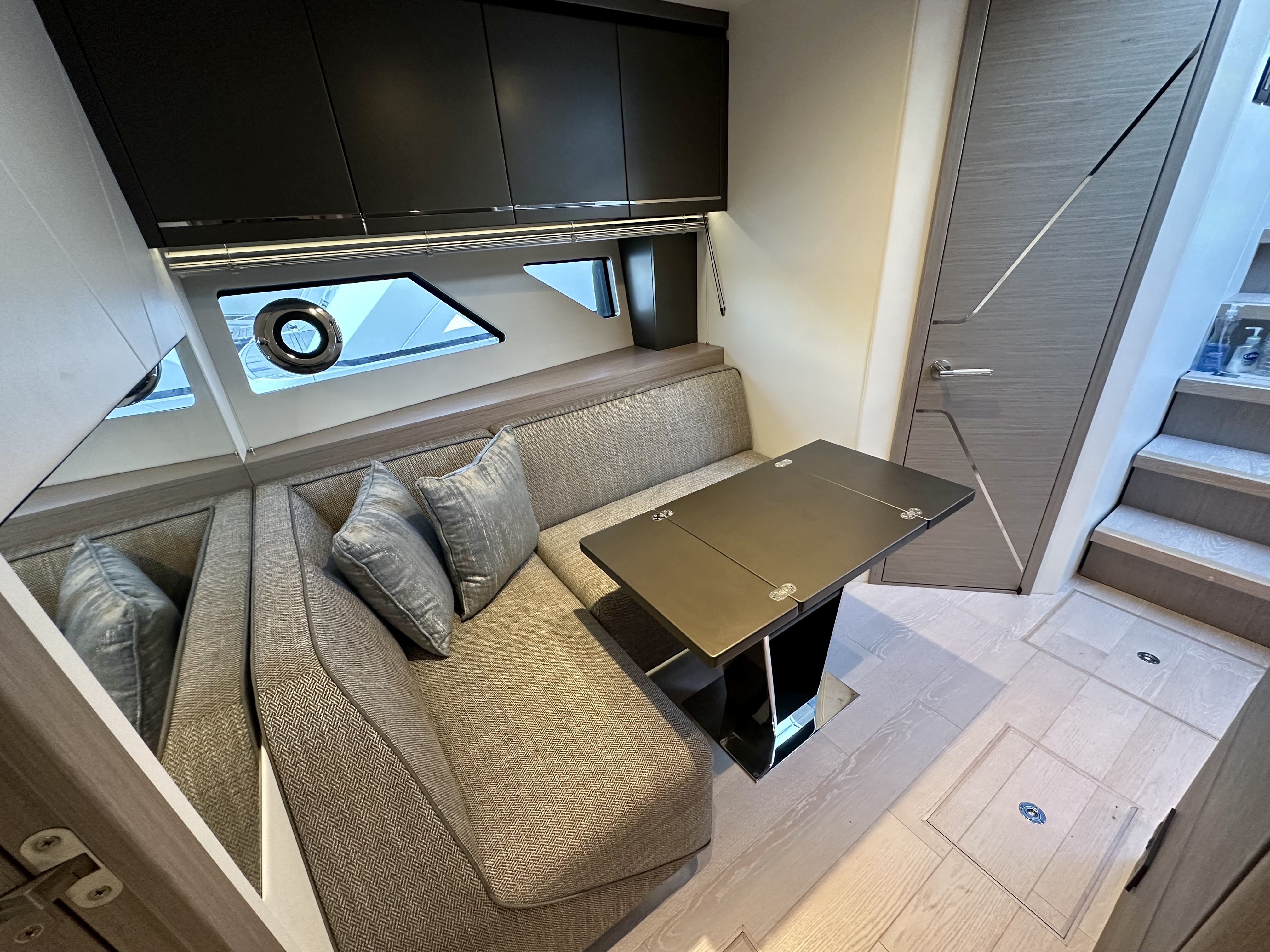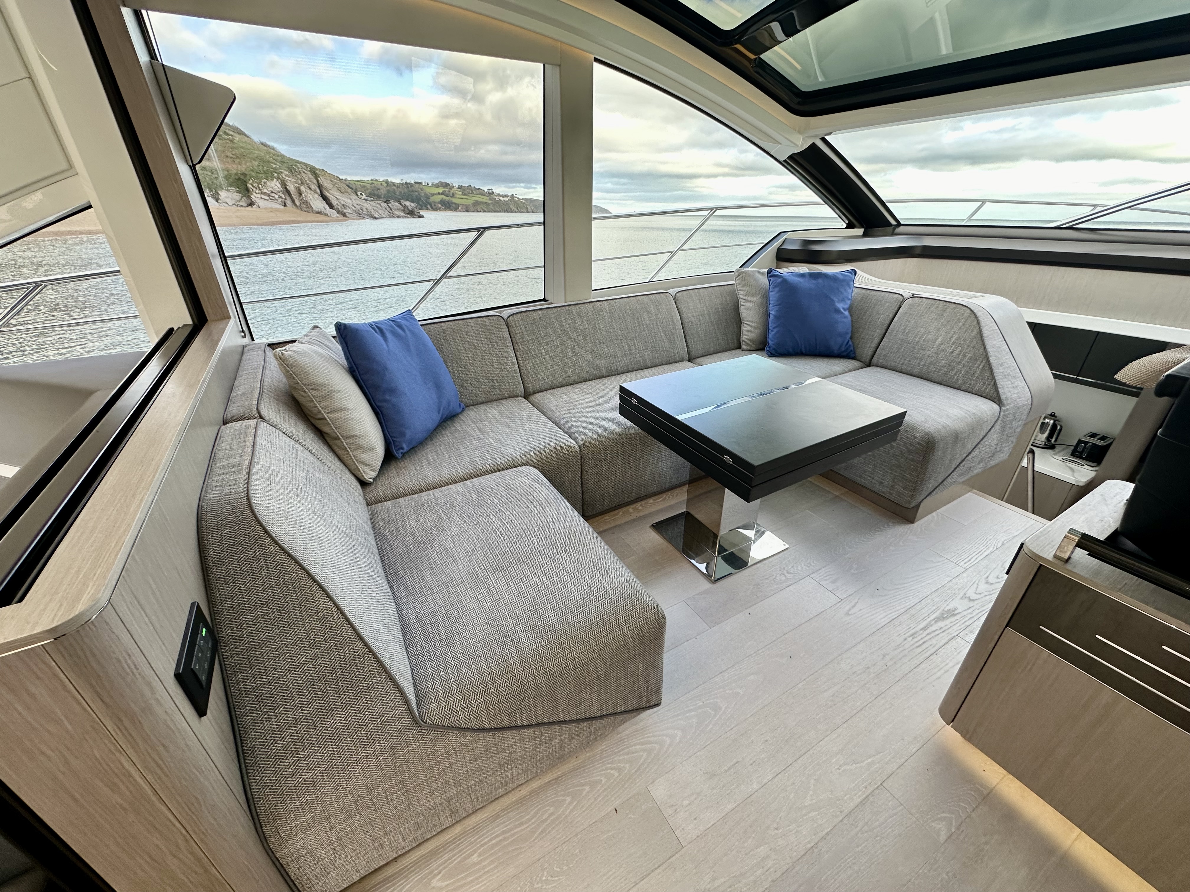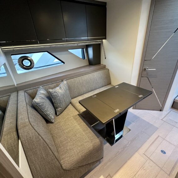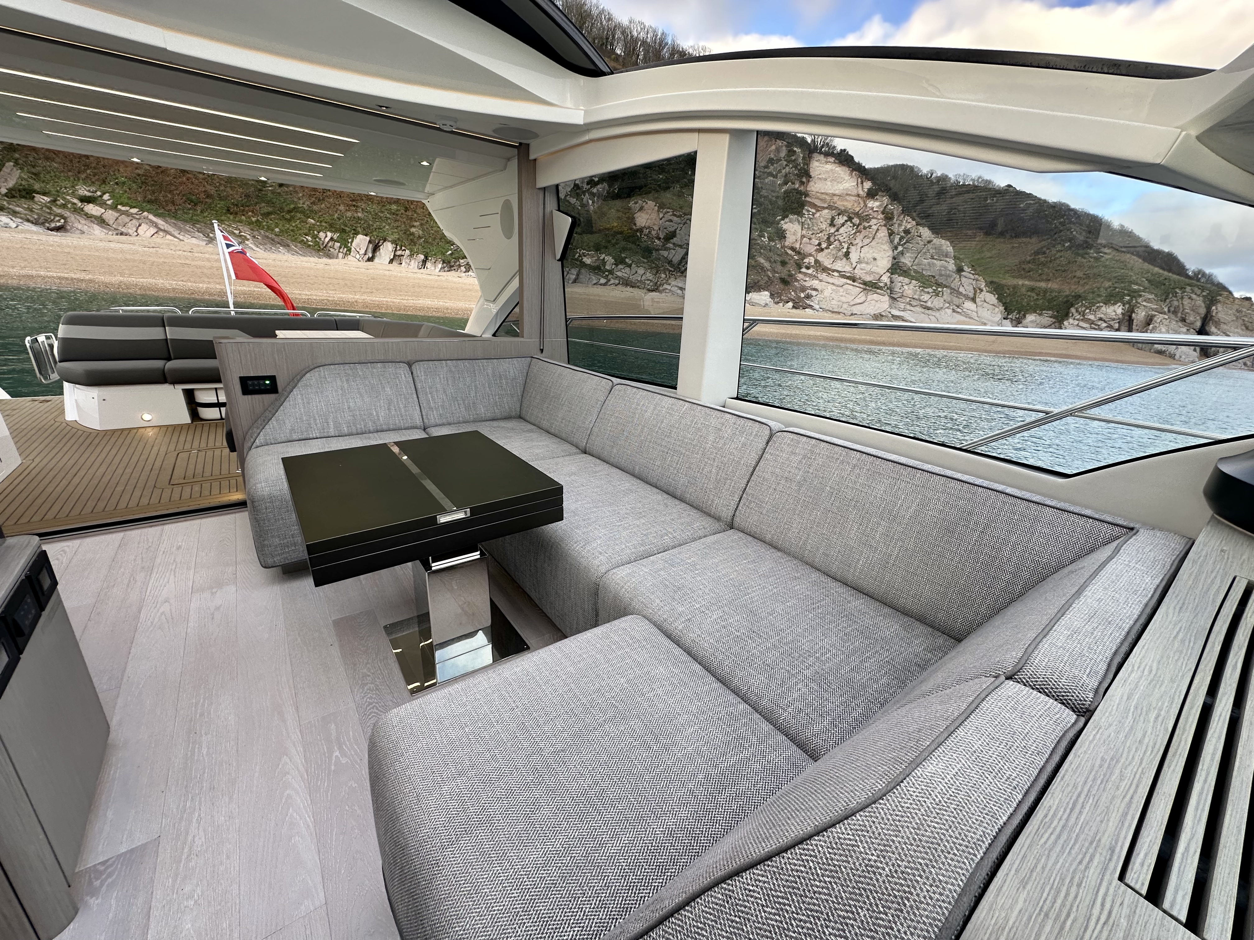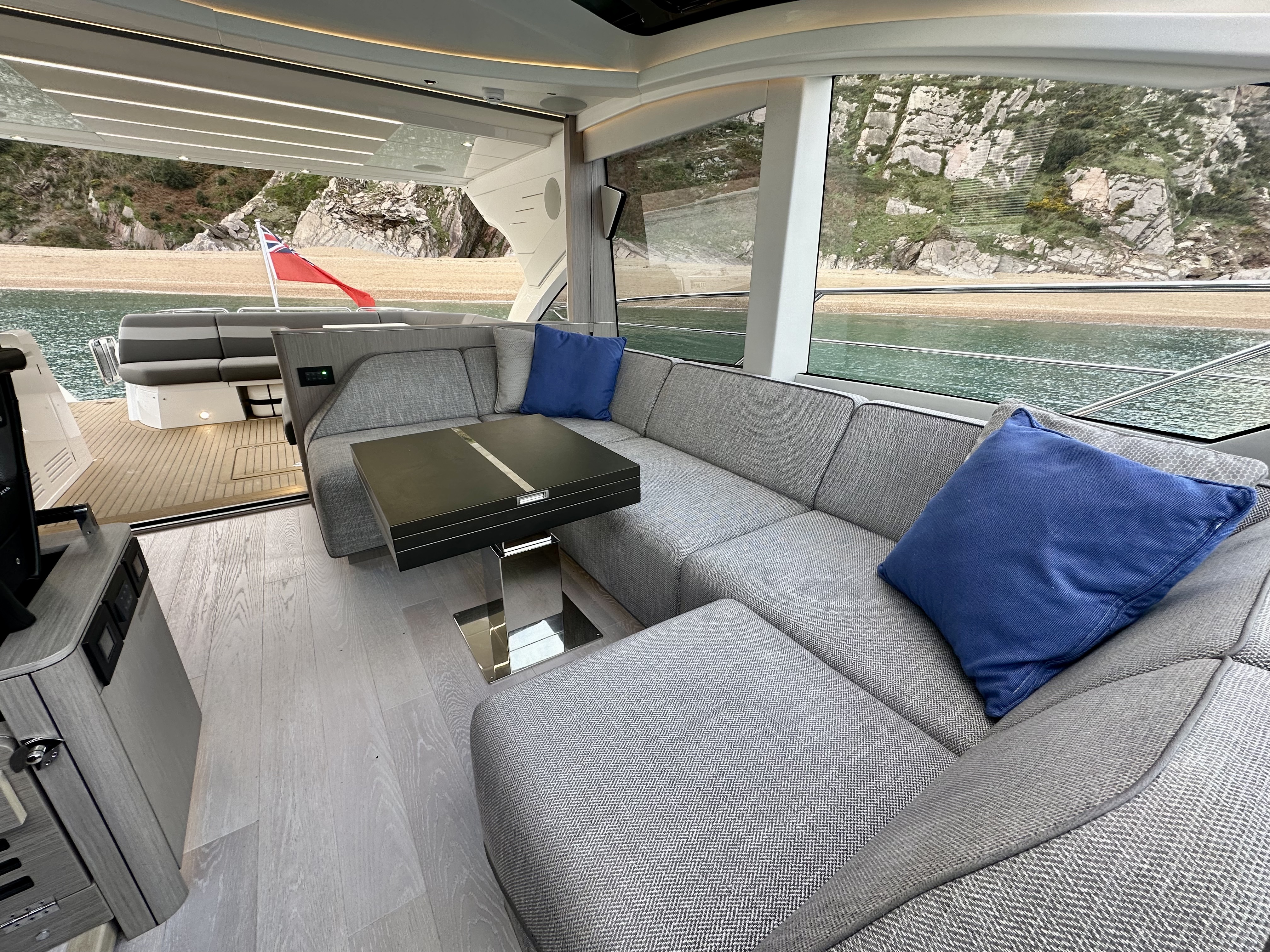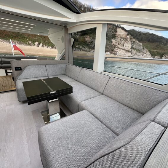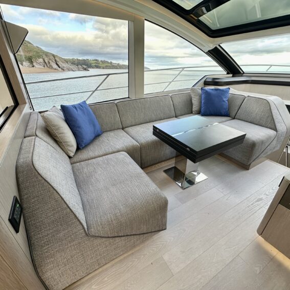 Main-deck day saloon with large expanding electric adjustable-height dining/lounge table and twin helm seats opposite!