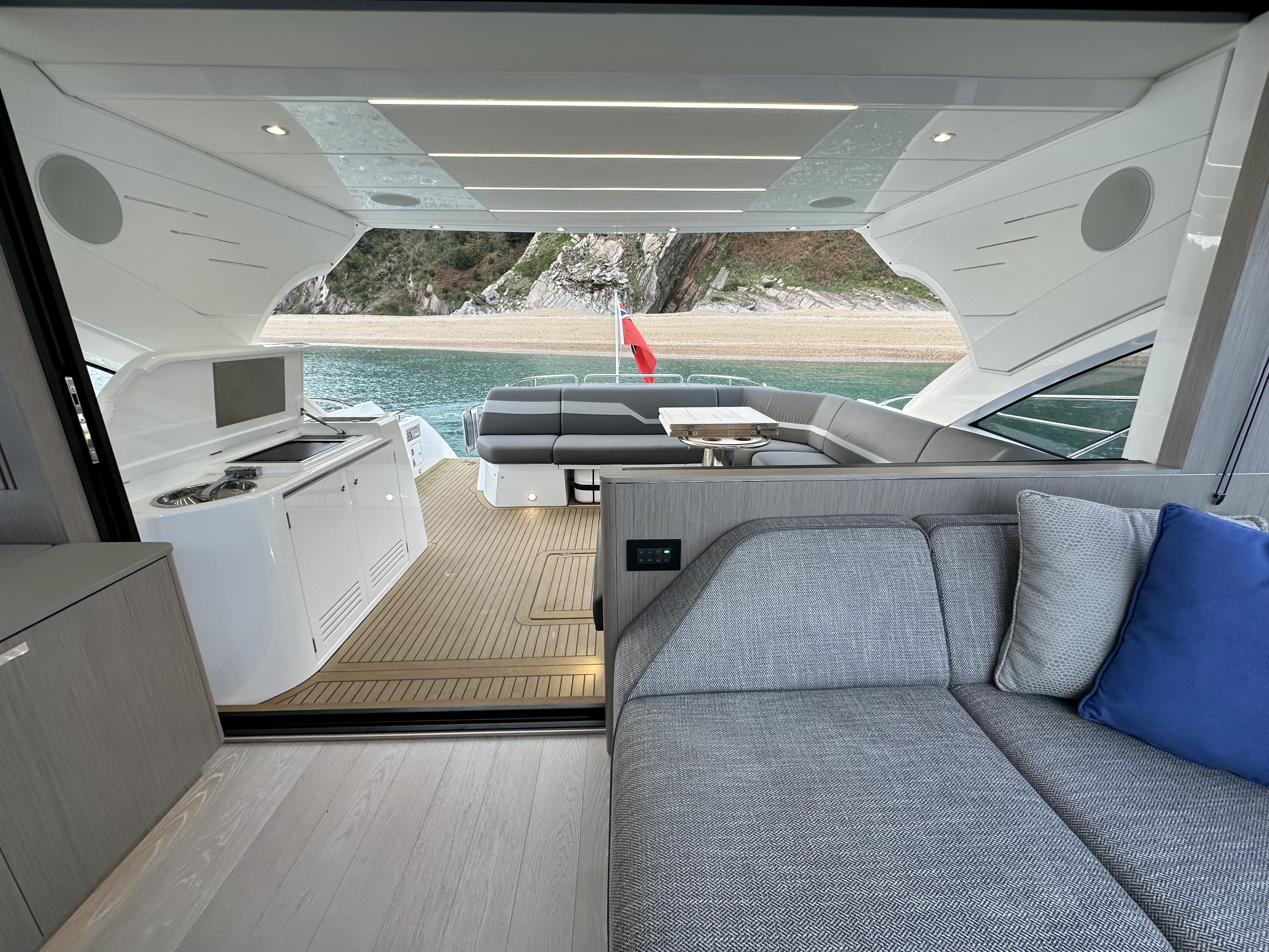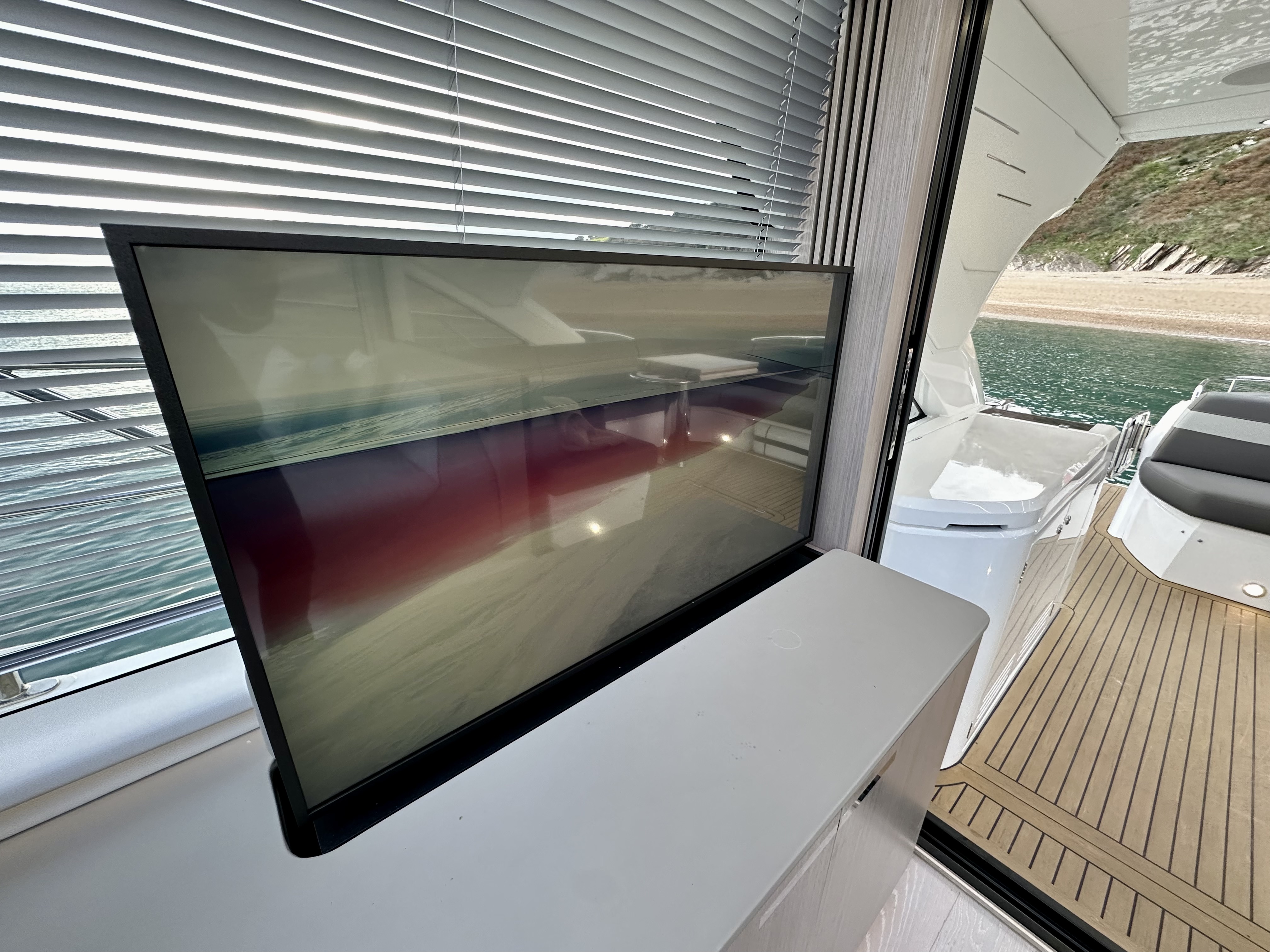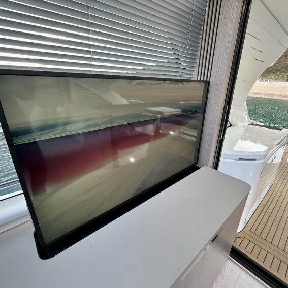 5. Lower saloon Samsung 32″ Television. Sonos Amp connecting TV with the built in Sonance VP62R speakers allowing music streaming. Apple TV 4K for streaming content from your Apple device.