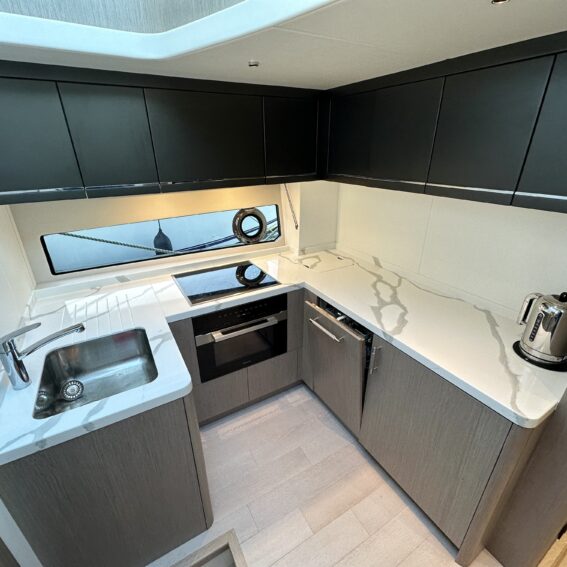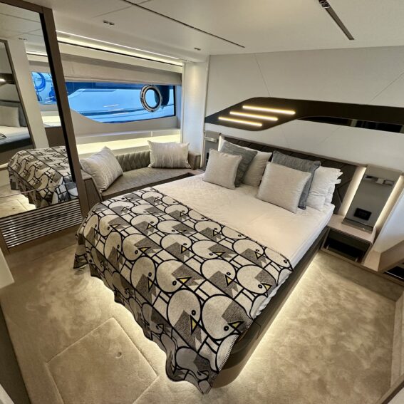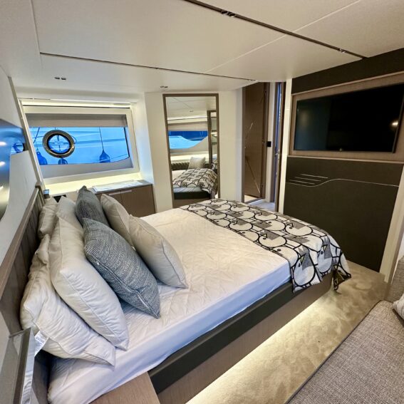 The Predator 60 Cabin layout consist of a large full beam master cabin with ensuite access, a forward double VIP cabin with a large central berth, this cabin is also ensuite. The third cabin is a well sized bunk cabin with its own hanging wardrobe space and ample natural light from the large hull window!