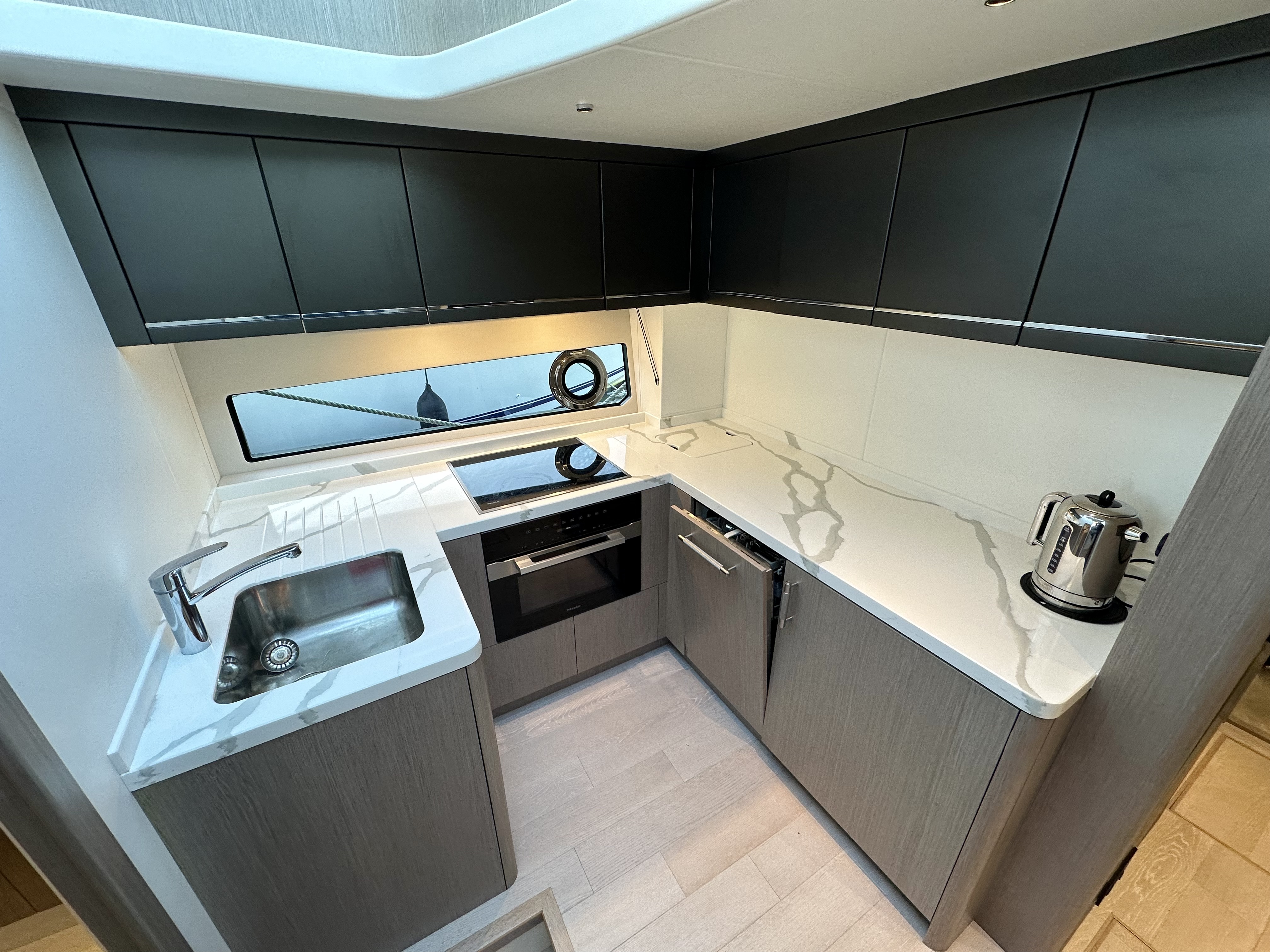 Well-equipped lower-deck galley with plenty of cupboard storage space, electric oven, fridge/freezer, large stainless sink, dishwasher and electric ceramic hob. L-shaped dinette snug opposite with high level storage cupboards and expanding top coffee table!