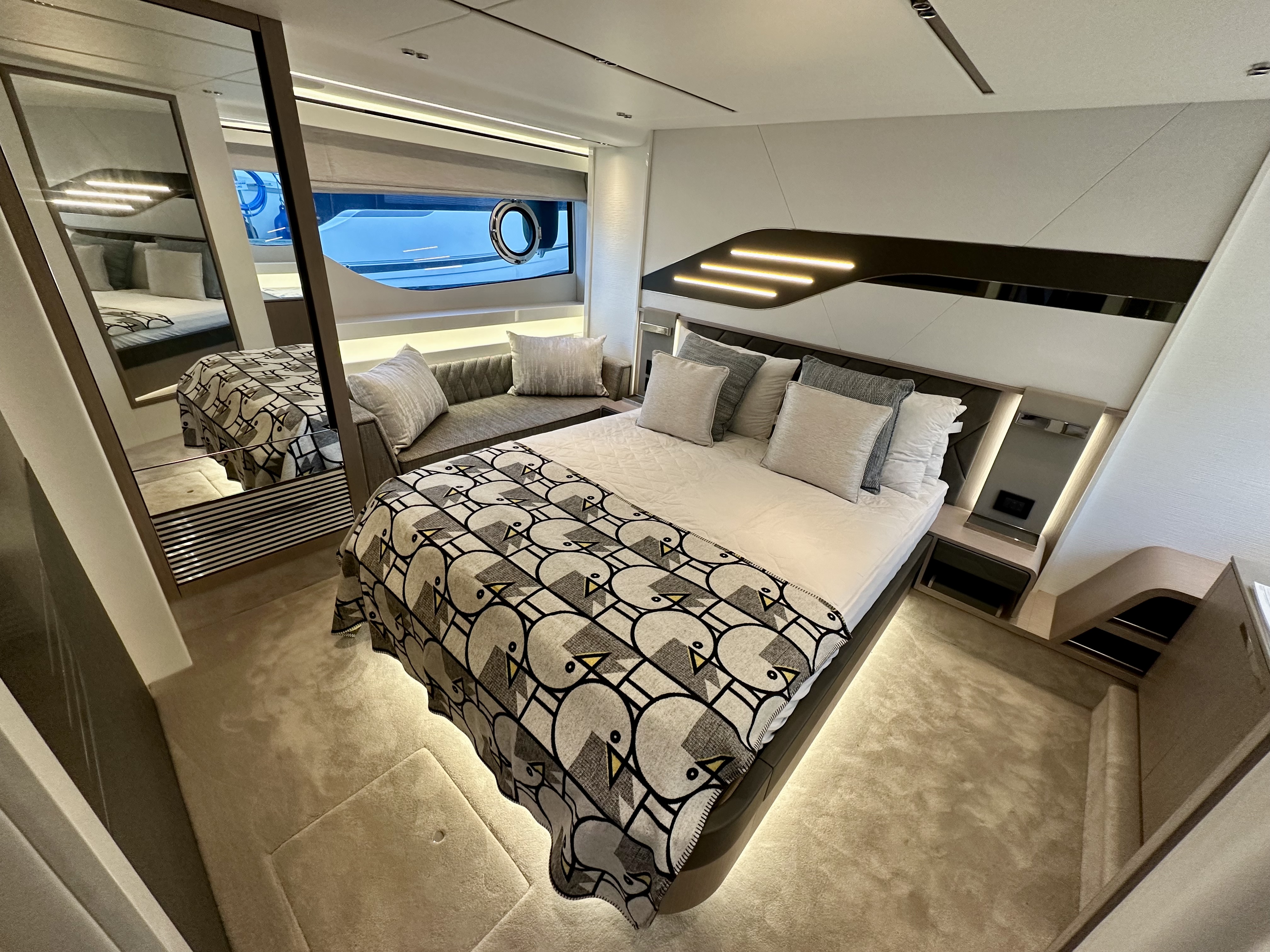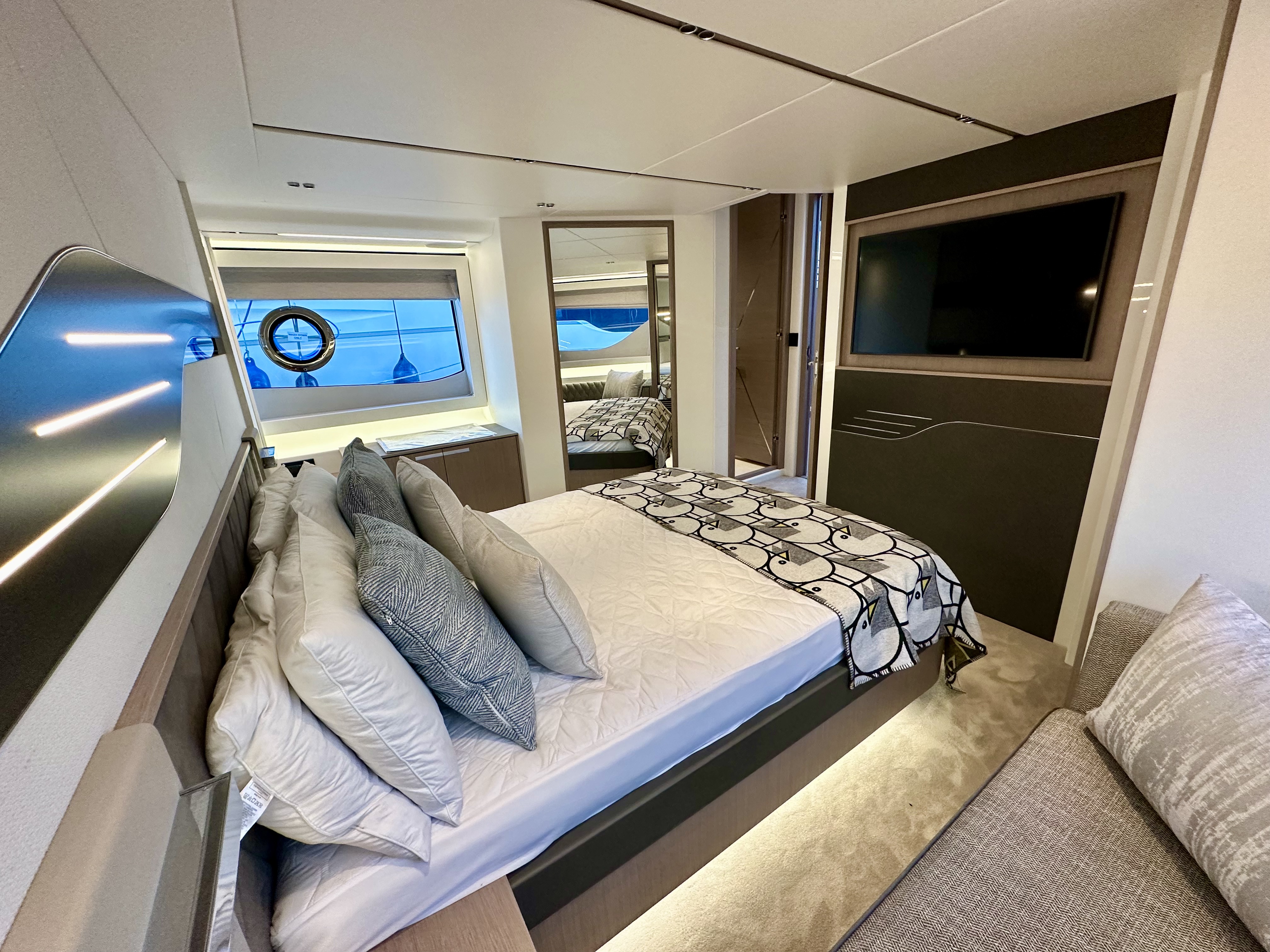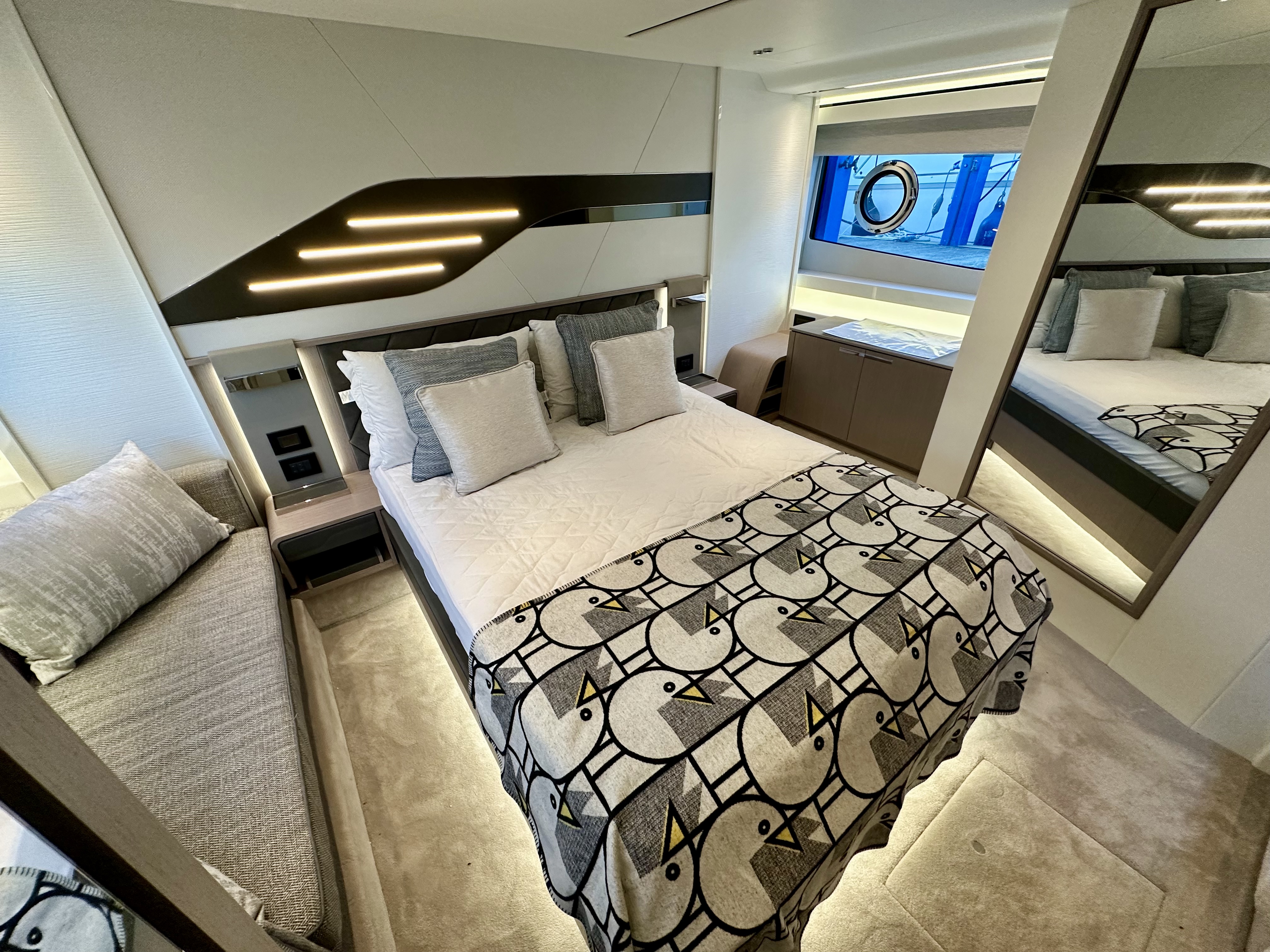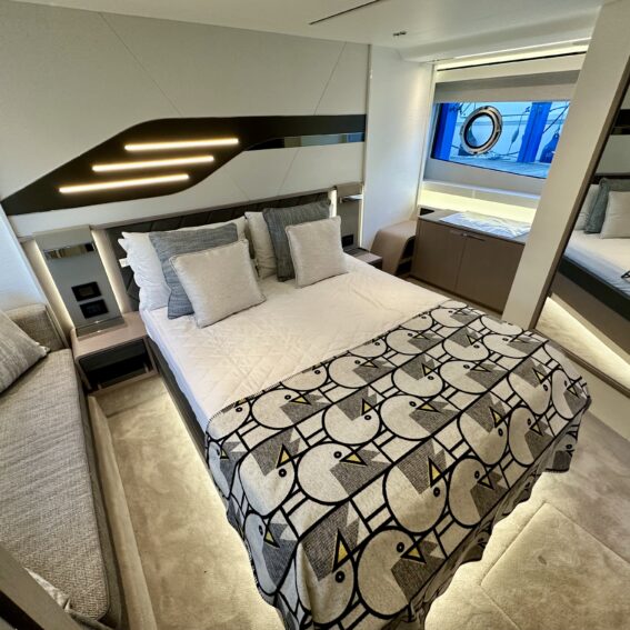 Master stateroom midships with large centreline island double berth, optional linear sofa to starboard, a good sized wardrobe, plus standard linear sideboard to port side of bed, making light work of extended time onboard!