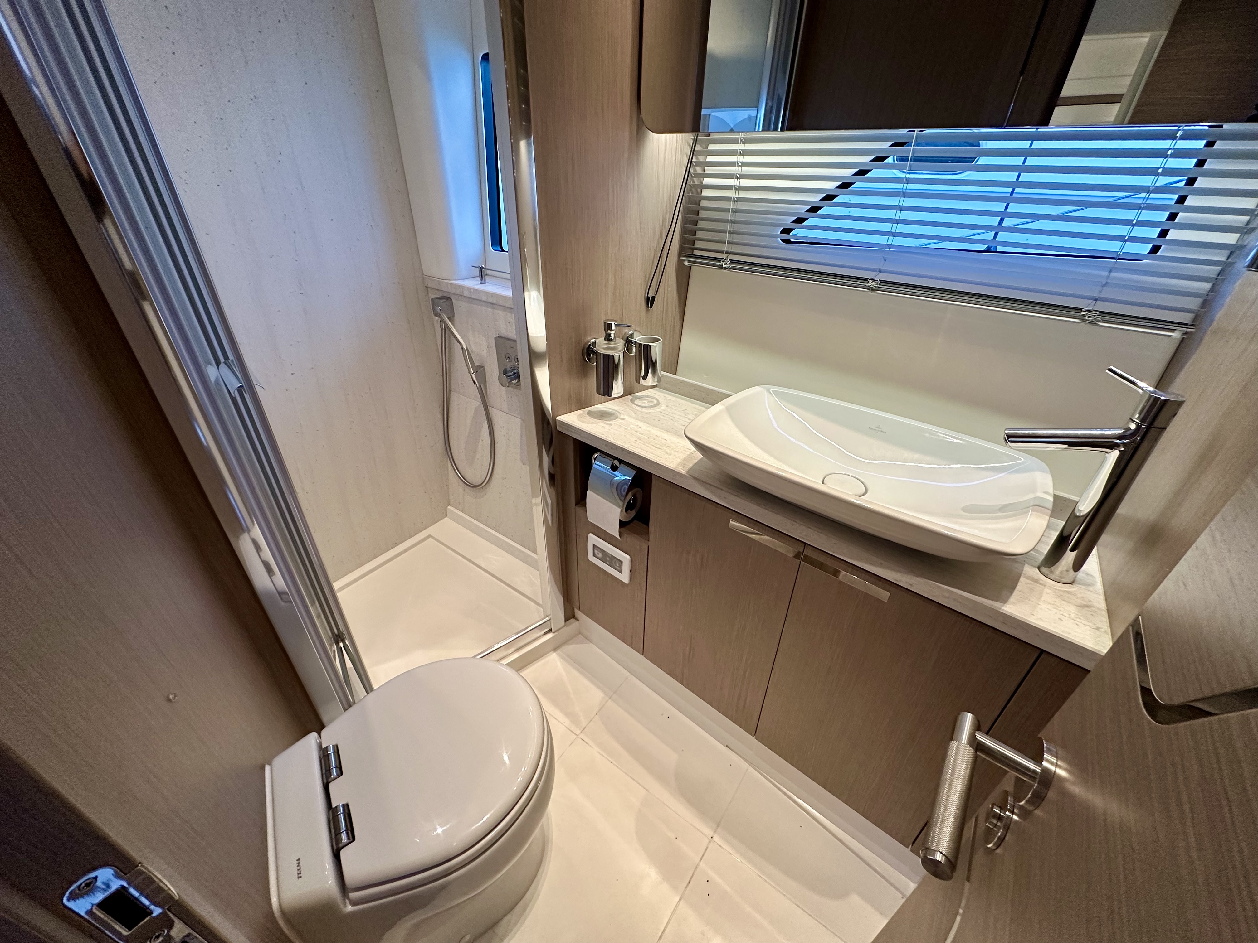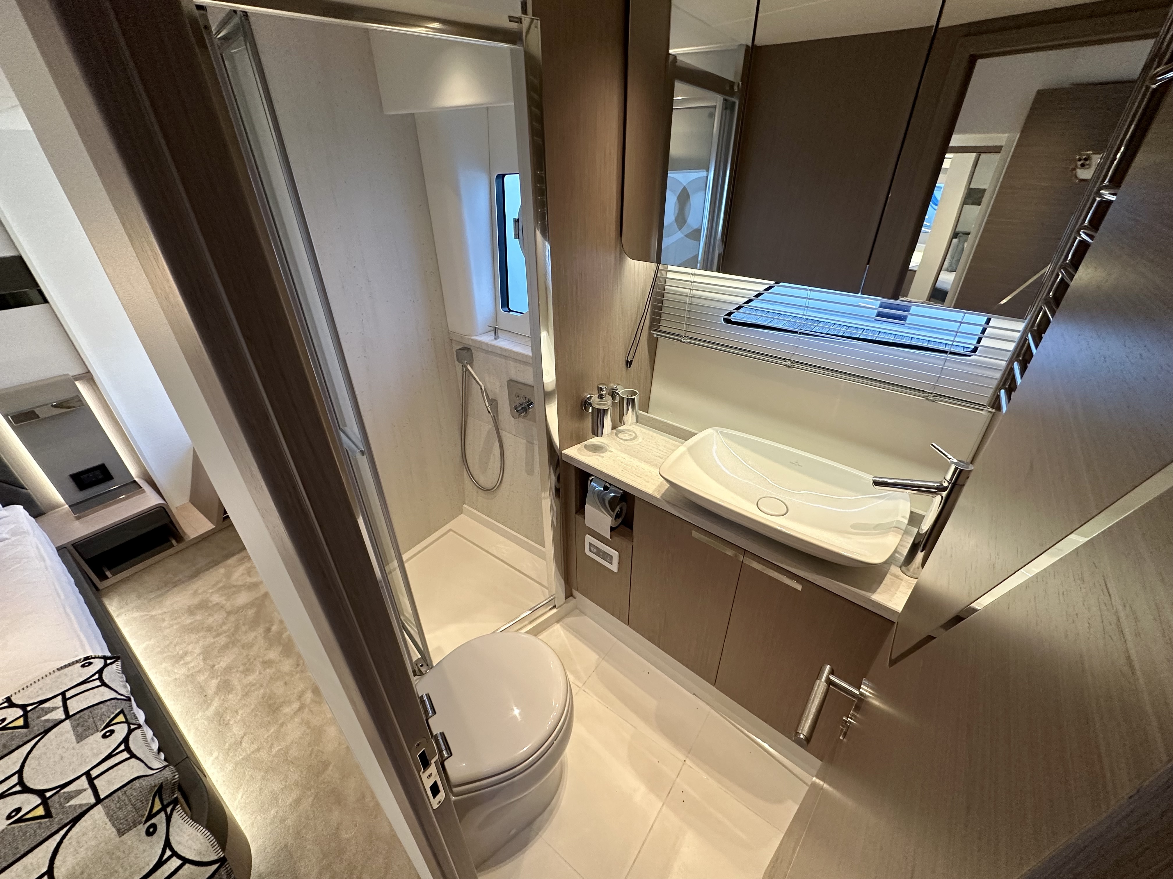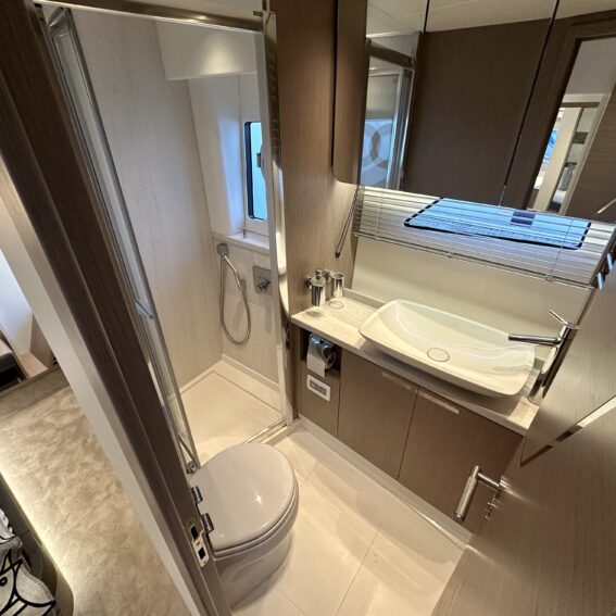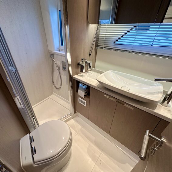 Direct access to en-suite heads compartment (which doubles up as a day heads), with shower stall, vacu-flush toilet system and hand basin!