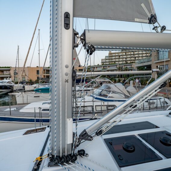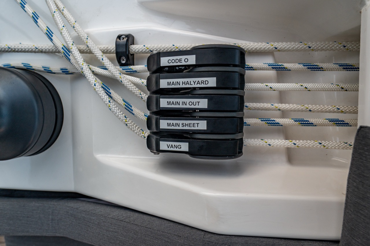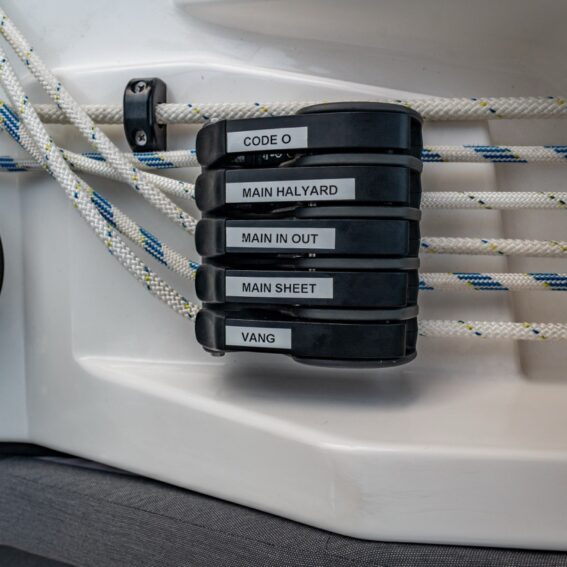 Blocks, organizers and jammers for running rigging, padeyes for safety lines and flagpole support
