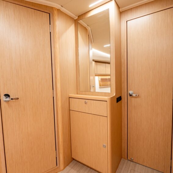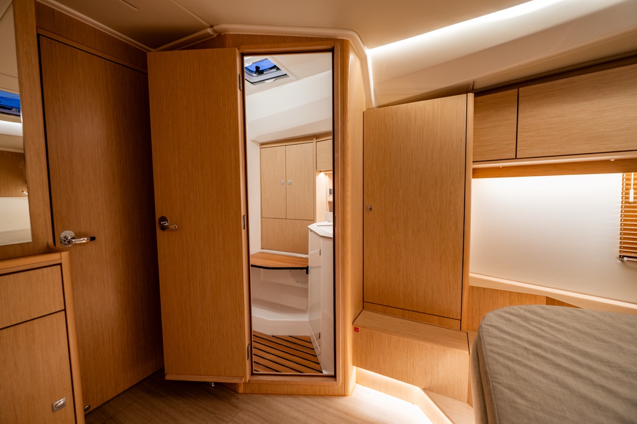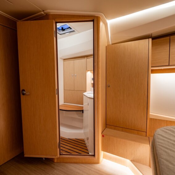 B1: Forward cabin with Queen size “island” double berth, storage, separate head and shower stall