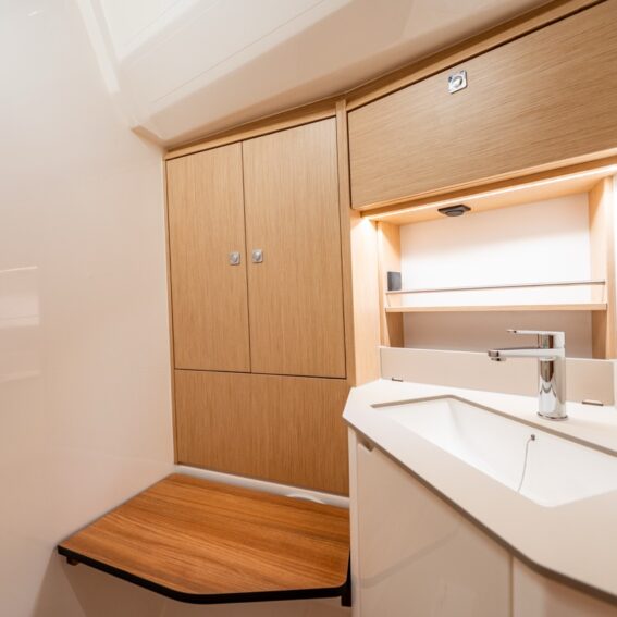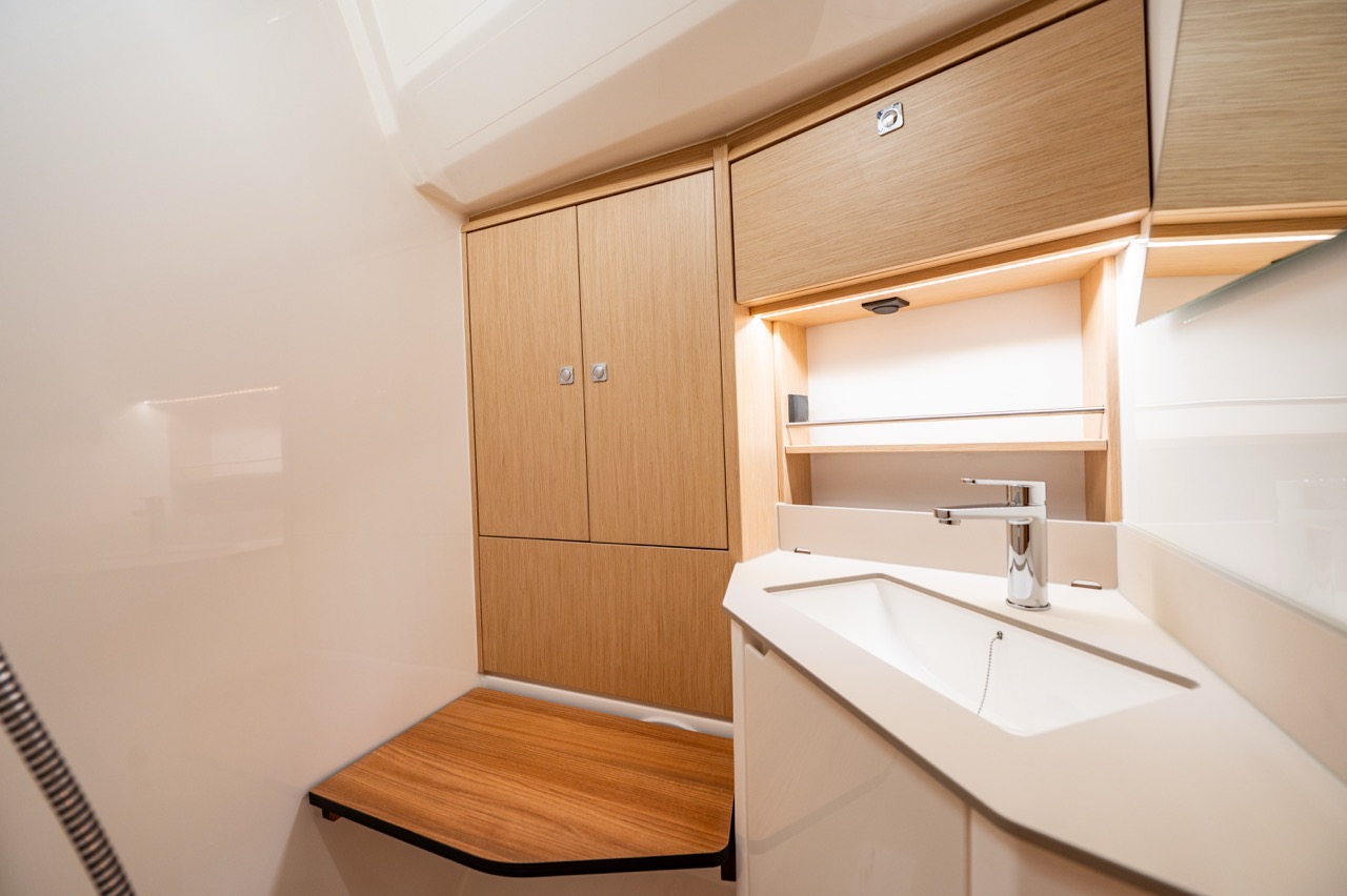 Headboard for berth owner cabin, seat in shower ps B1 layout.