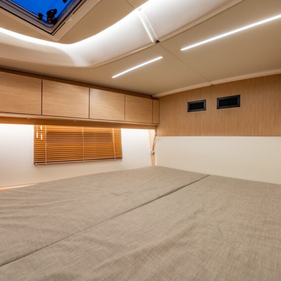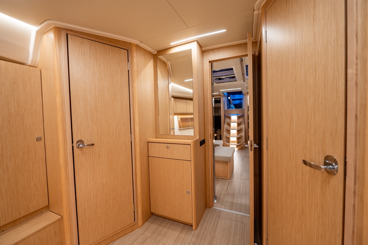 Ambient lights in ceiling panel and below upper cupboards in salon and cabins