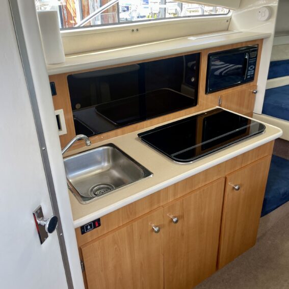 The living space below deck is well thought out; with a very usable galley area, that has plenty of storage. There is a roomy forward berth, that can be separated off by a privacy curtain. The Dining area is a suitable space for 4/6 people and also coverts to a further double bed. There is then a separate aft cabin, which is opposite the heads/shower room.