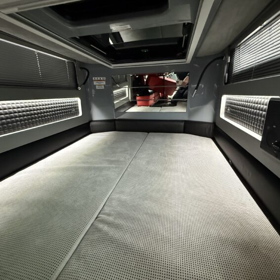 Day Cruiser Aft Cabin Option – Spacious Aft Cabin accommodating additional two persons, Extensive use of exclusive BRABUS „Fine Leather“® on all upholstery, 2 x roof hatches with integrated blackout and mosquito net, Fixed side windows, Leather side bolsters with red contrast stitching, Spring bed mattress in grey/black patterned, Roof panels in grey leather, Ambient led lighting package, including reading lights and floor lights, BRABUS® exclusive leather carpet, Aft Wall Panels with sport pattern stitching in cool grey leather, Sun Deck cushions red