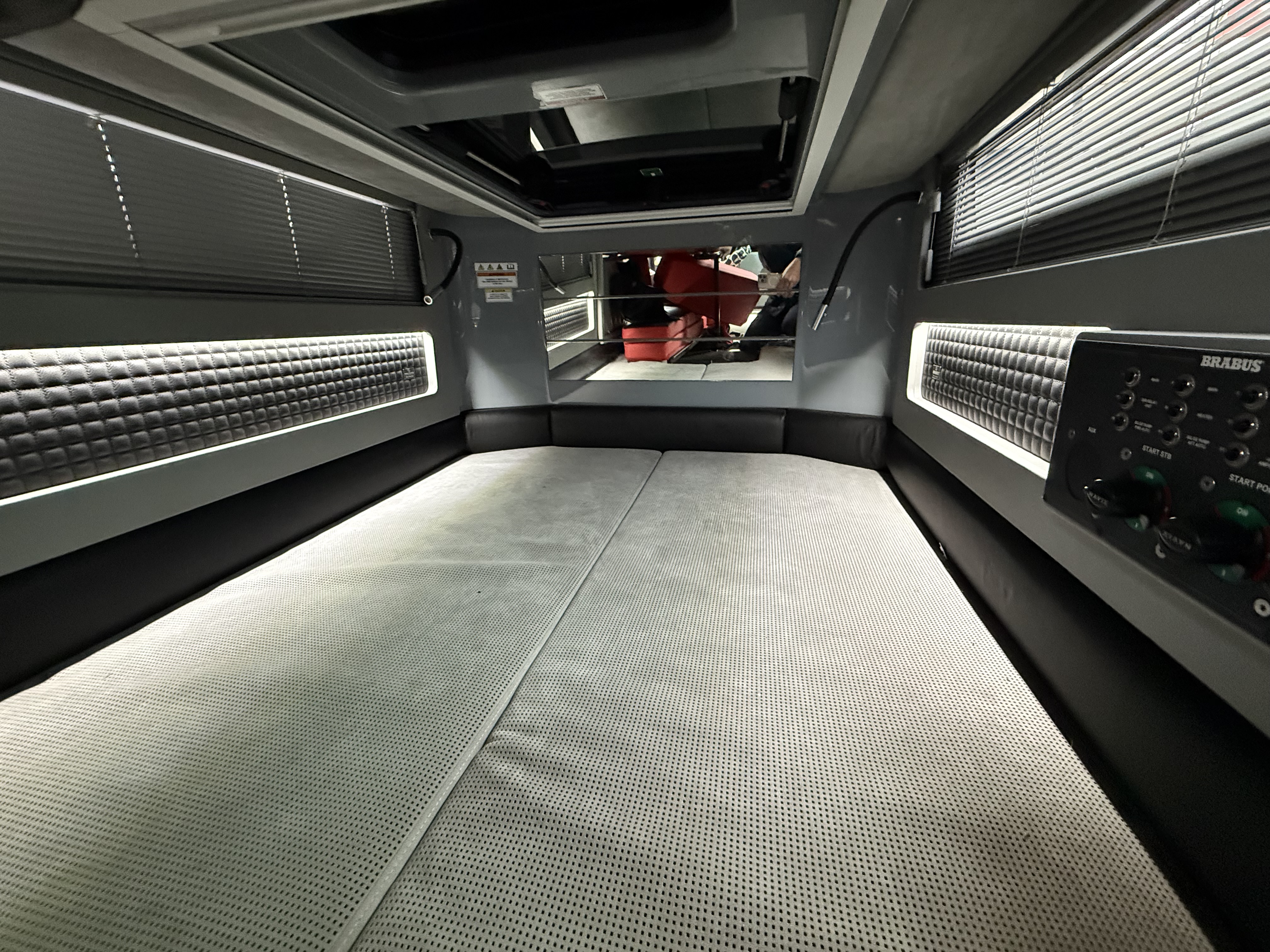 Day Cruiser Aft Cabin Option – Spacious Aft Cabin accommodating additional two persons, Extensive use of exclusive BRABUS „Fine Leather“® on all upholstery, 2 x roof hatches with integrated blackout and mosquito net, Fixed side windows, Leather side bolsters with red contrast stitching, Spring bed mattress in grey/black patterned, Roof panels in grey leather, Ambient led lighting package, including reading lights and floor lights, BRABUS® exclusive leather carpet, Aft Wall Panels with sport pattern stitching in cool grey leather, Sun Deck cushions red