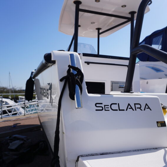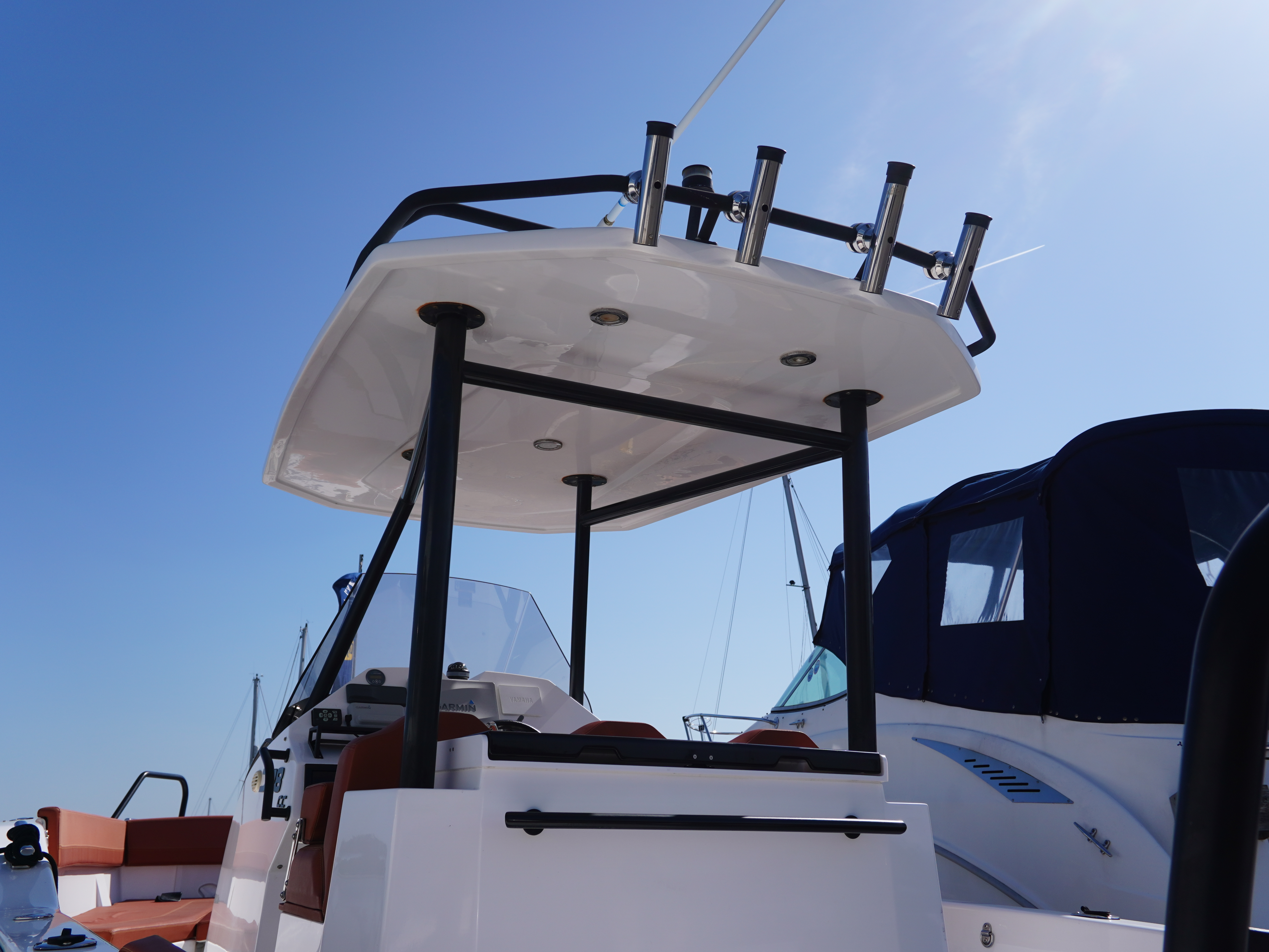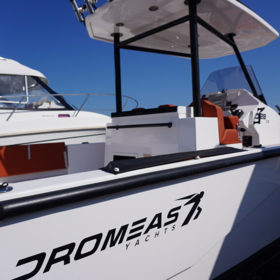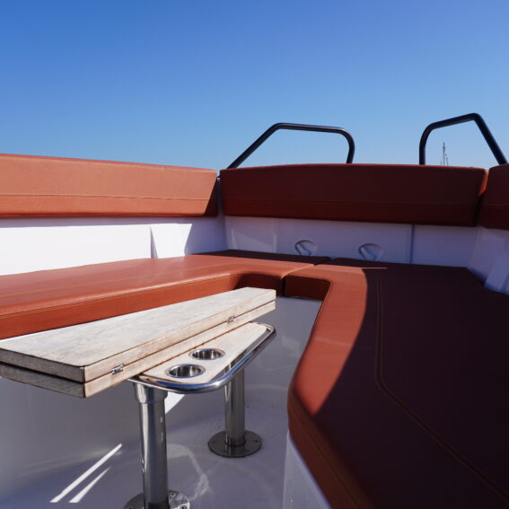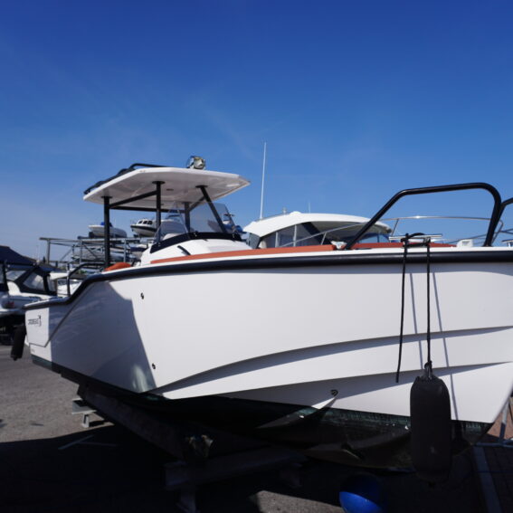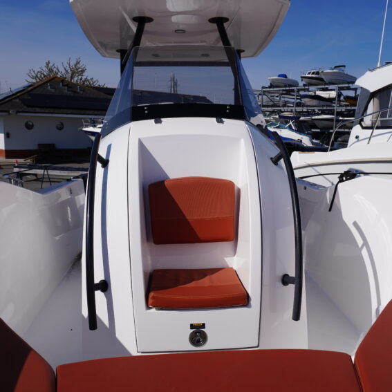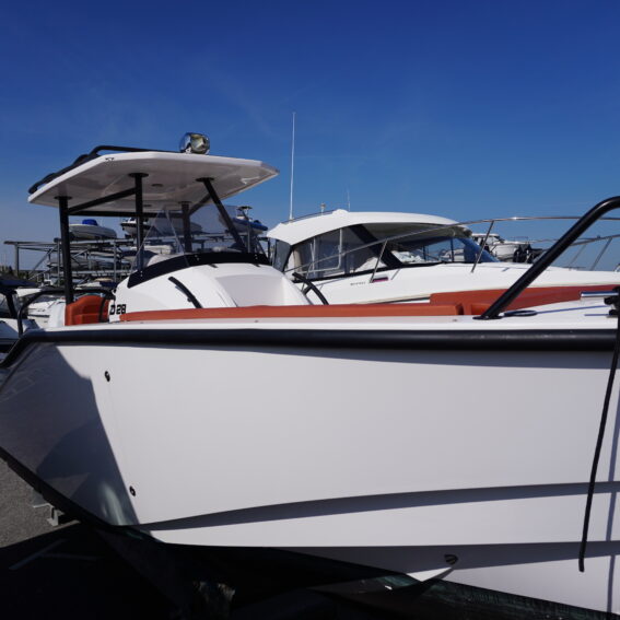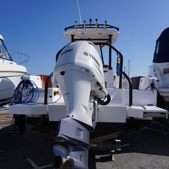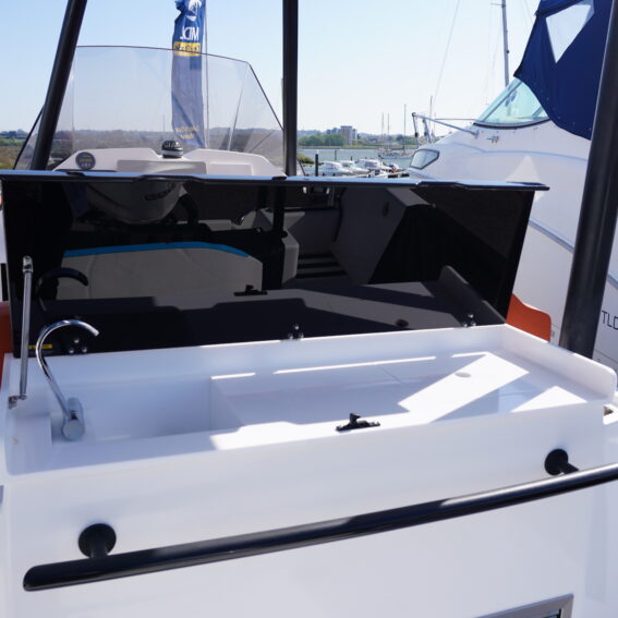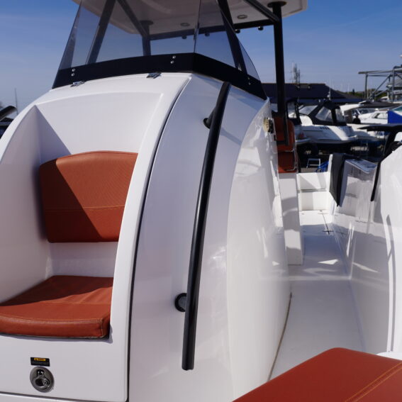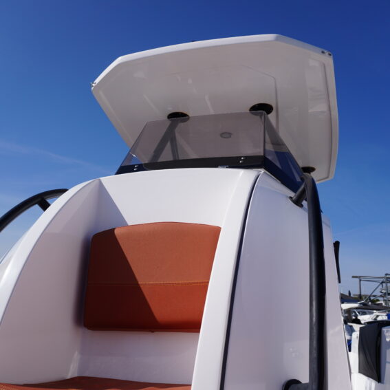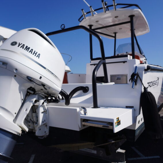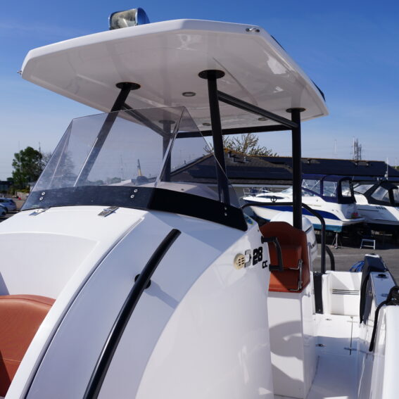 For lifestyle and watersports use, she is equipped with a waterski frame and fishing arch with rod holders, allowing her to easily transition between family cruising and active days on the water. Additional features such as LED courtesy lighting, shore power connection, search light, roof rack and comprehensive safety equipment further enhance her practicality!