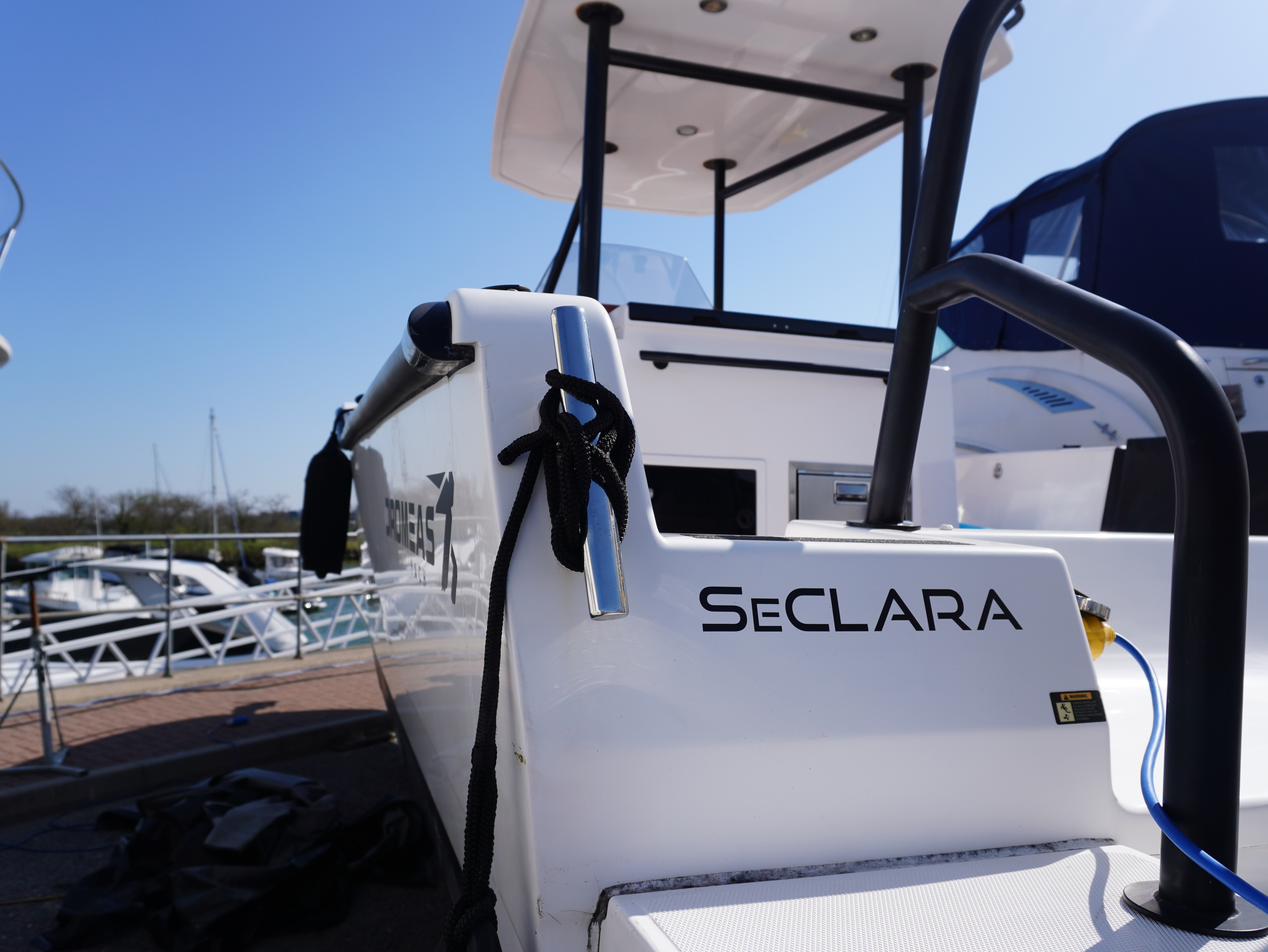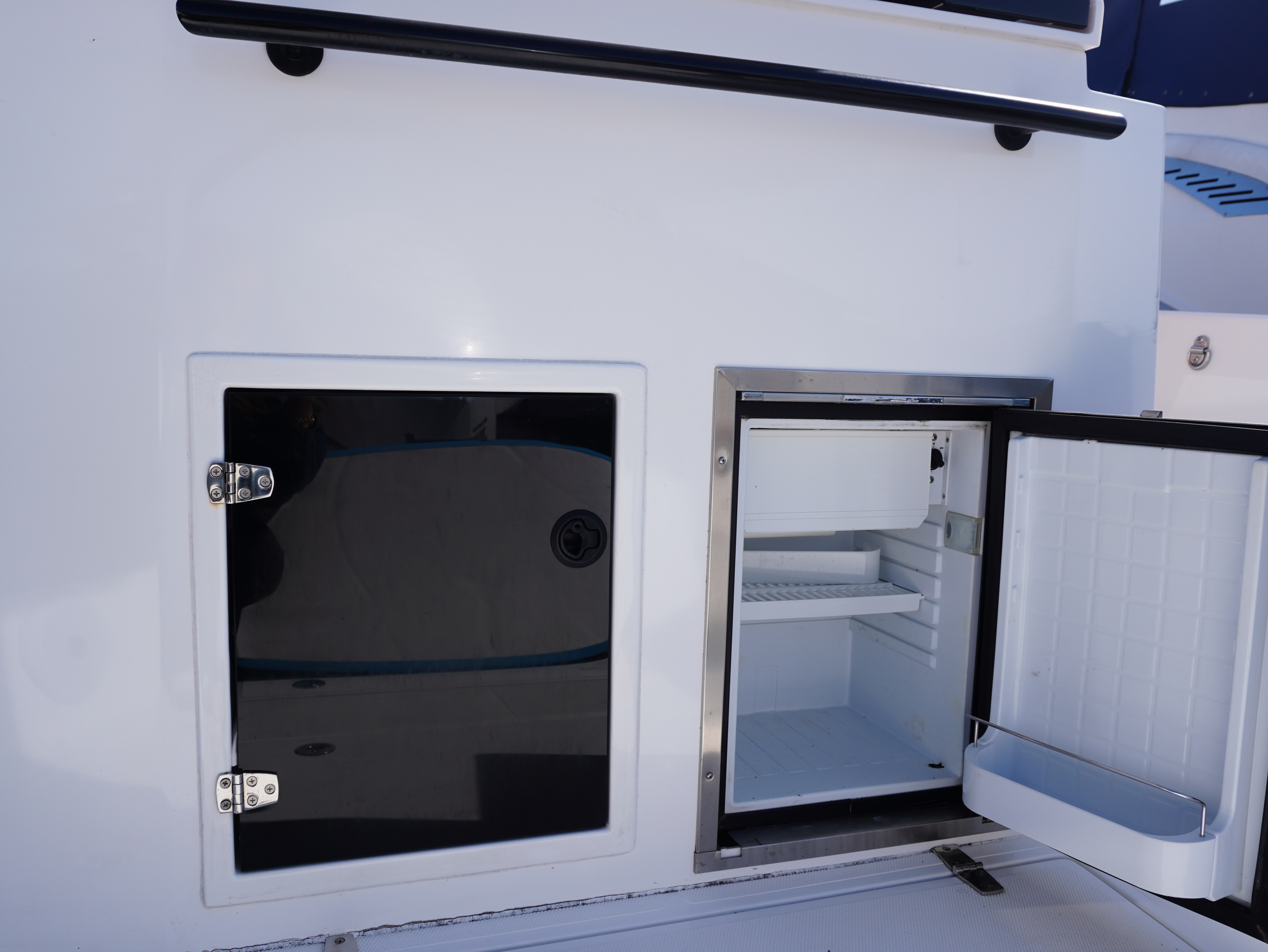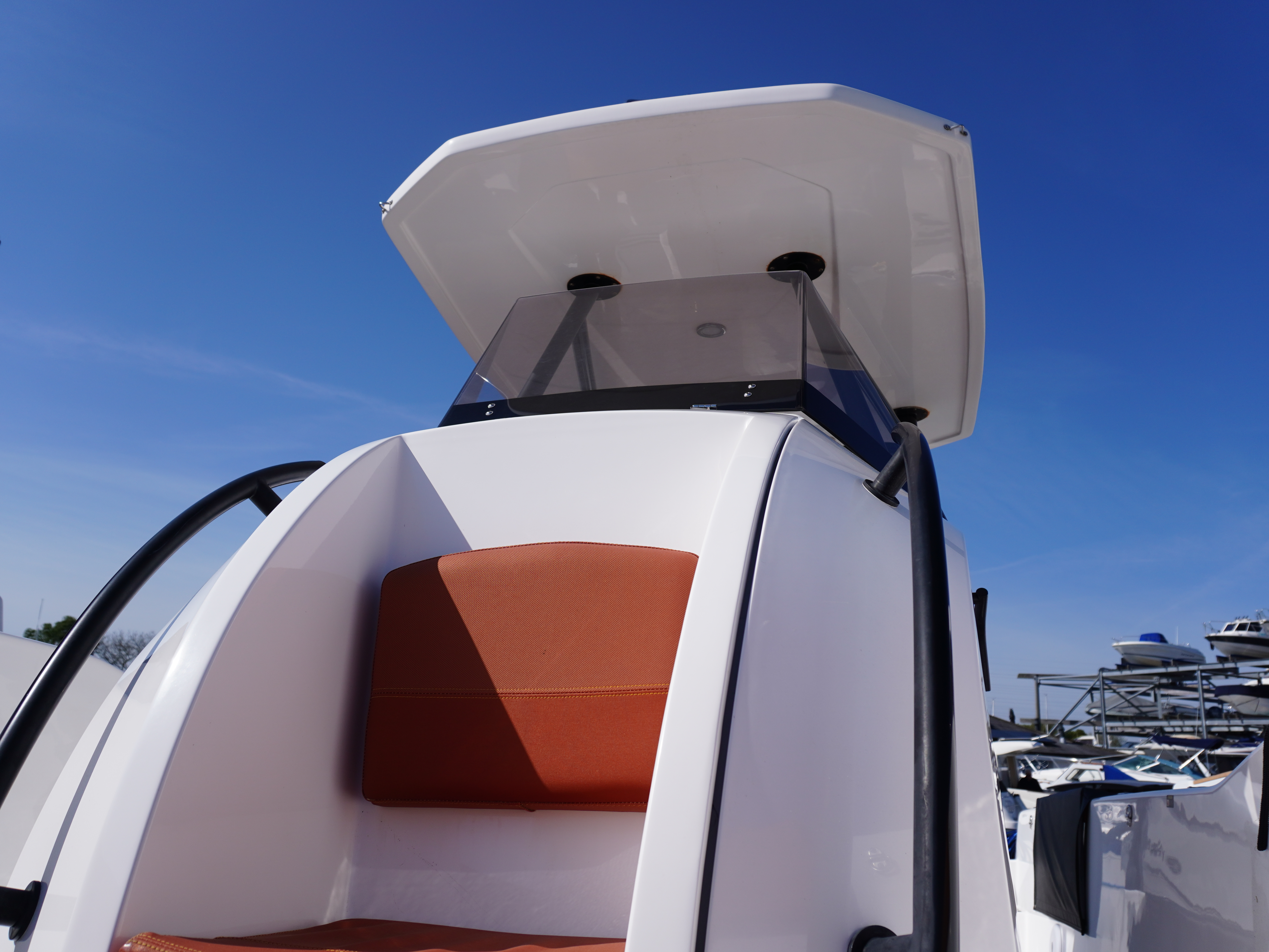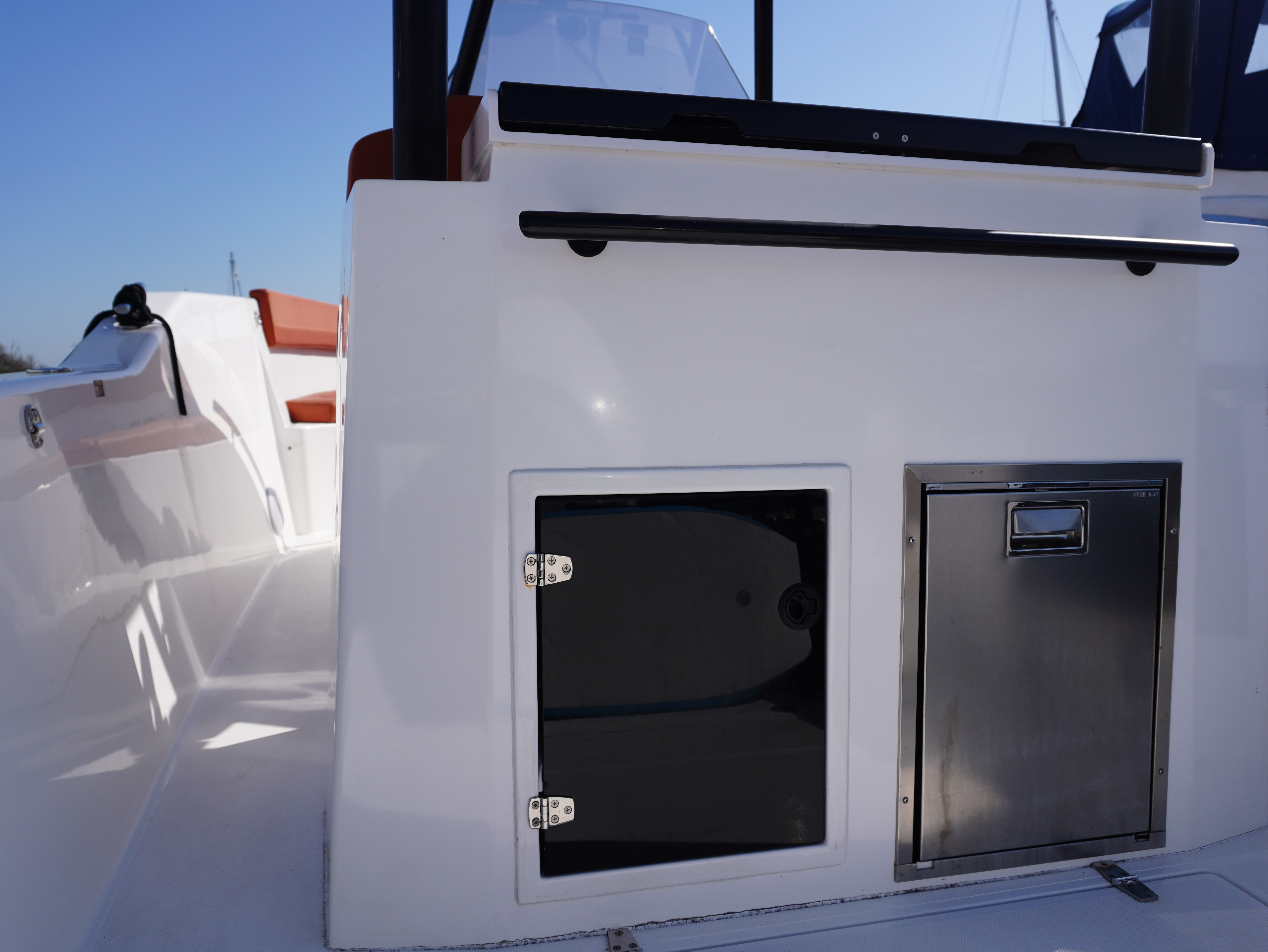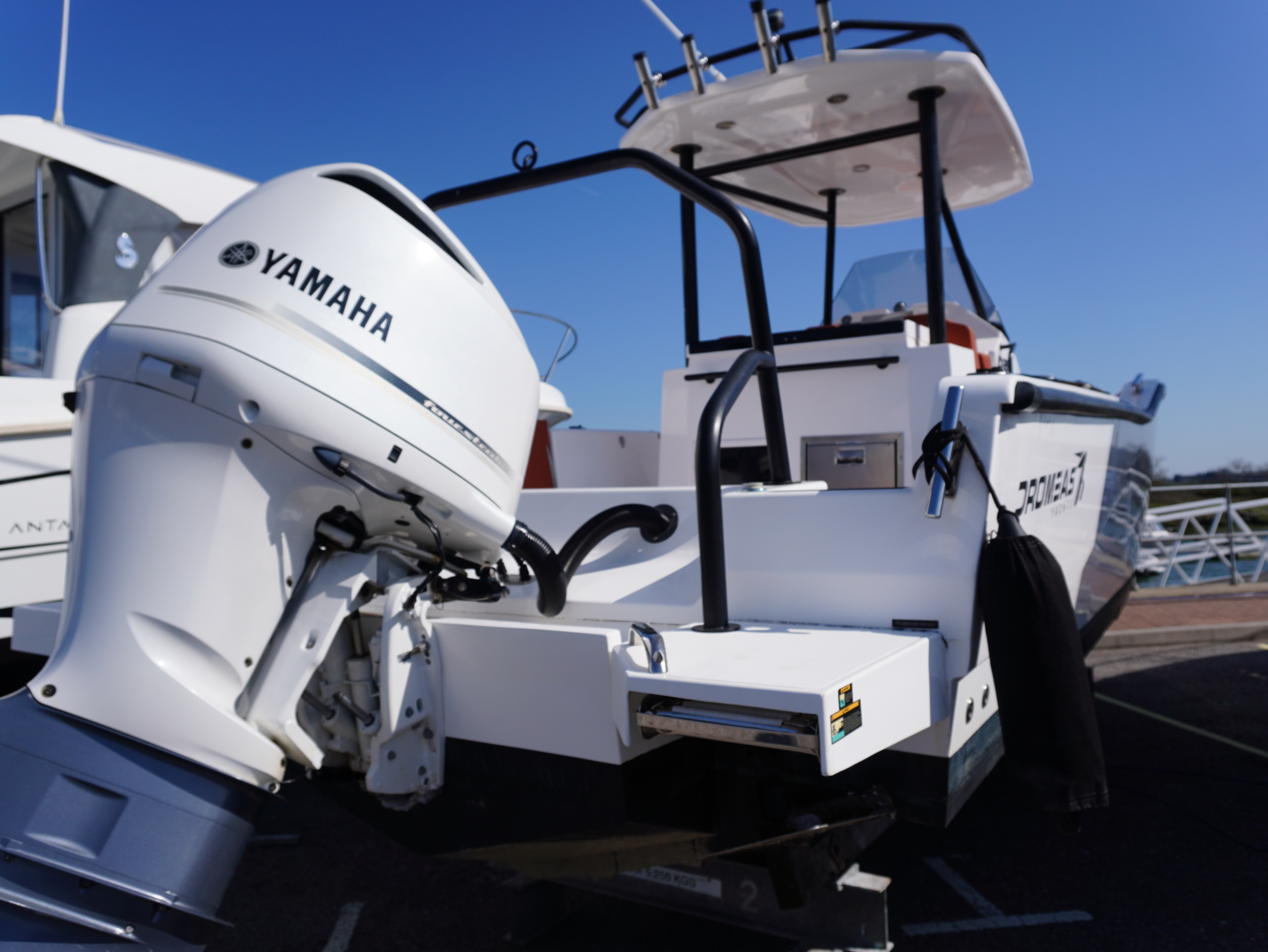 For lifestyle and watersports use, she is equipped with a waterski frame and fishing arch with rod holders, allowing her to easily transition between family cruising and active days on the water. Additional features such as LED courtesy lighting, shore power connection, search light, roof rack and comprehensive safety equipment further enhance her practicality!