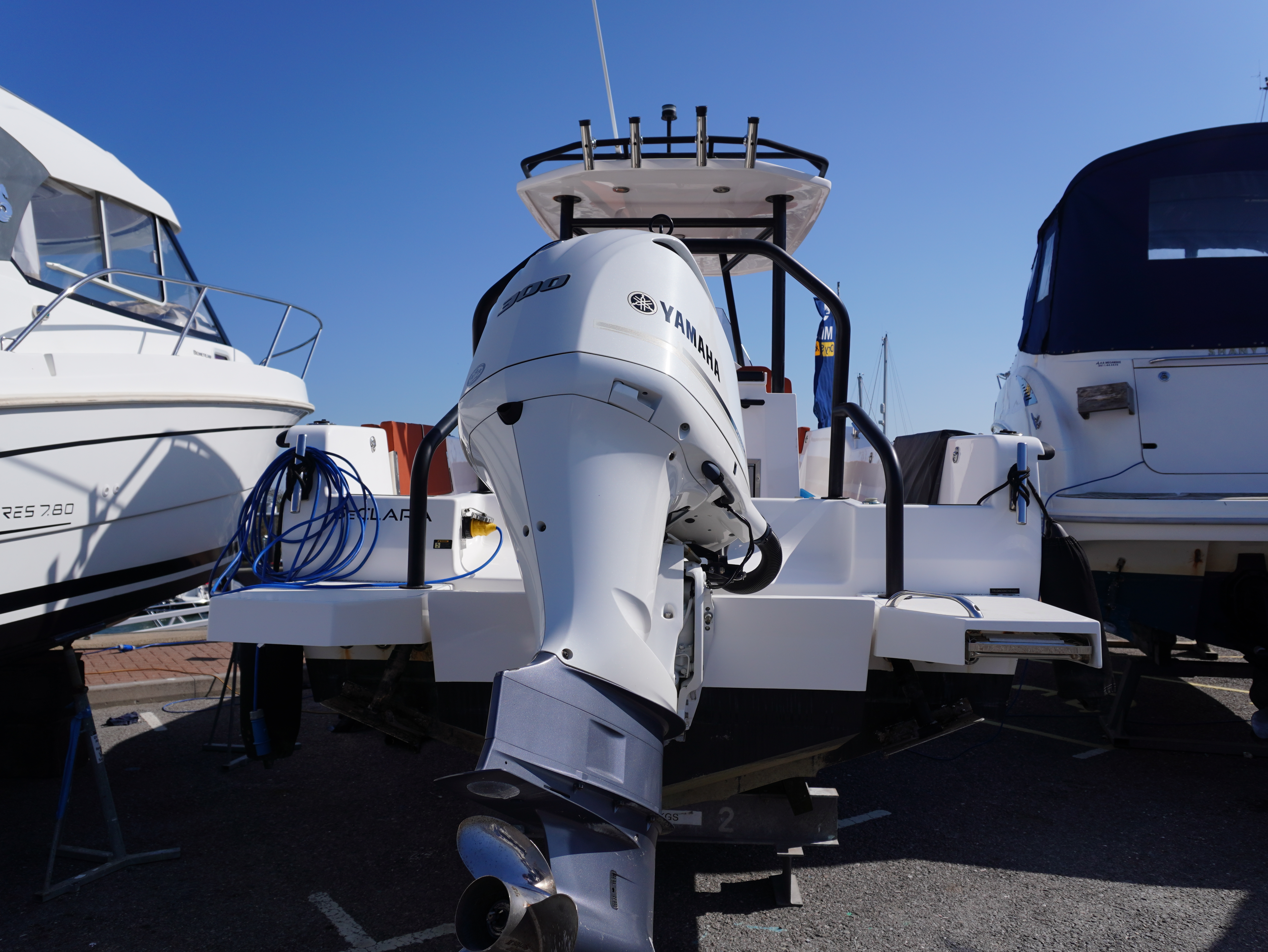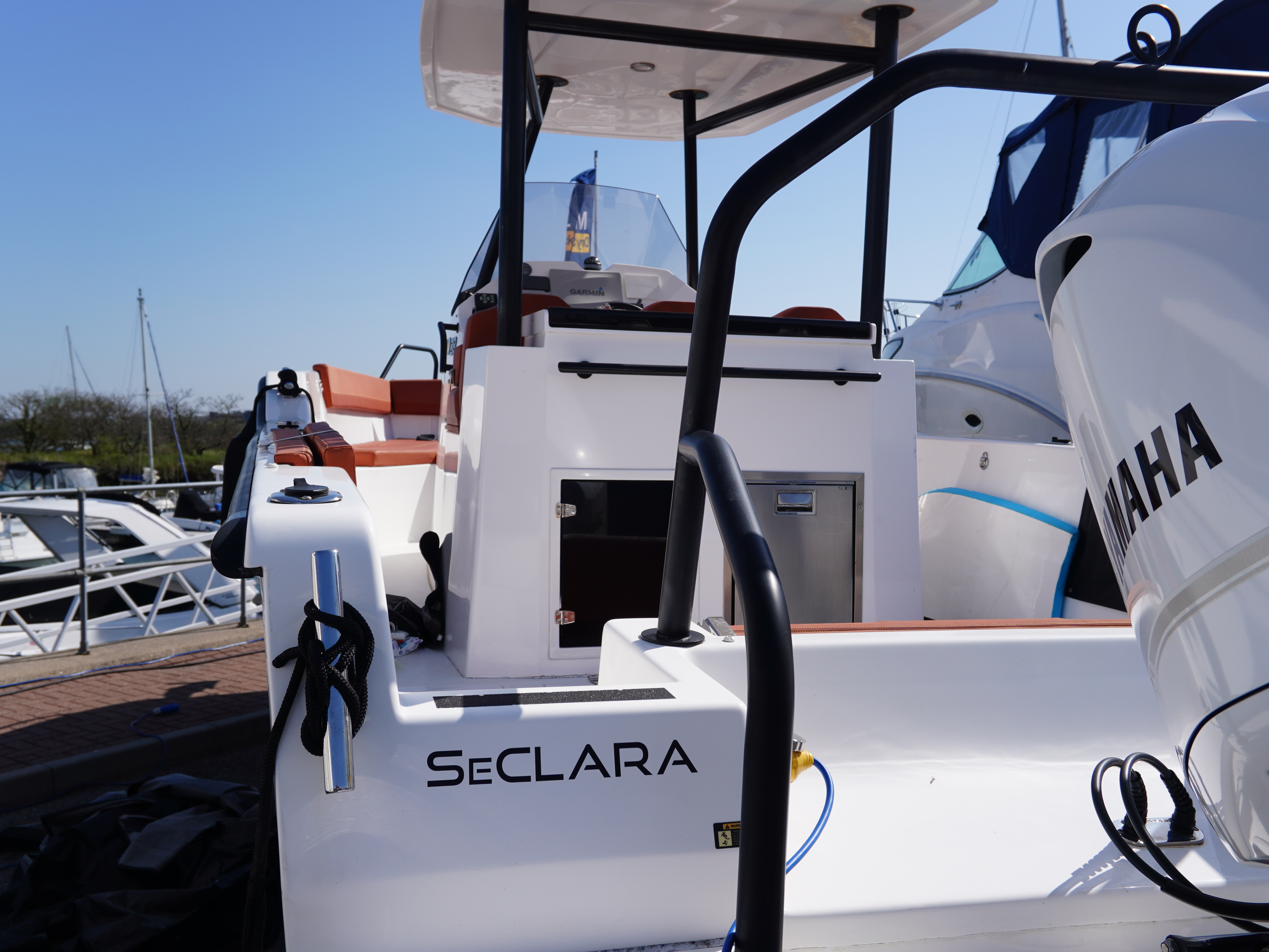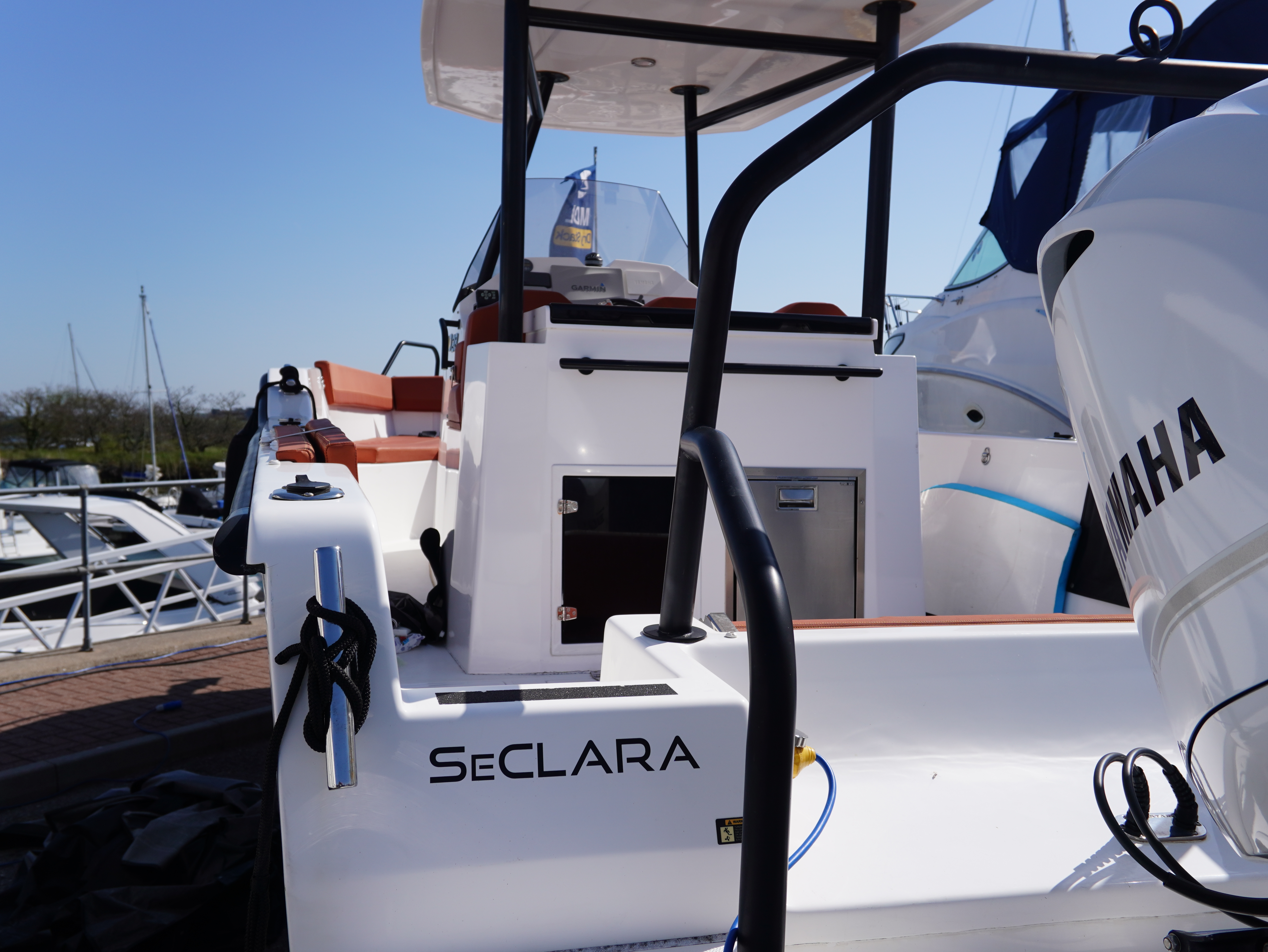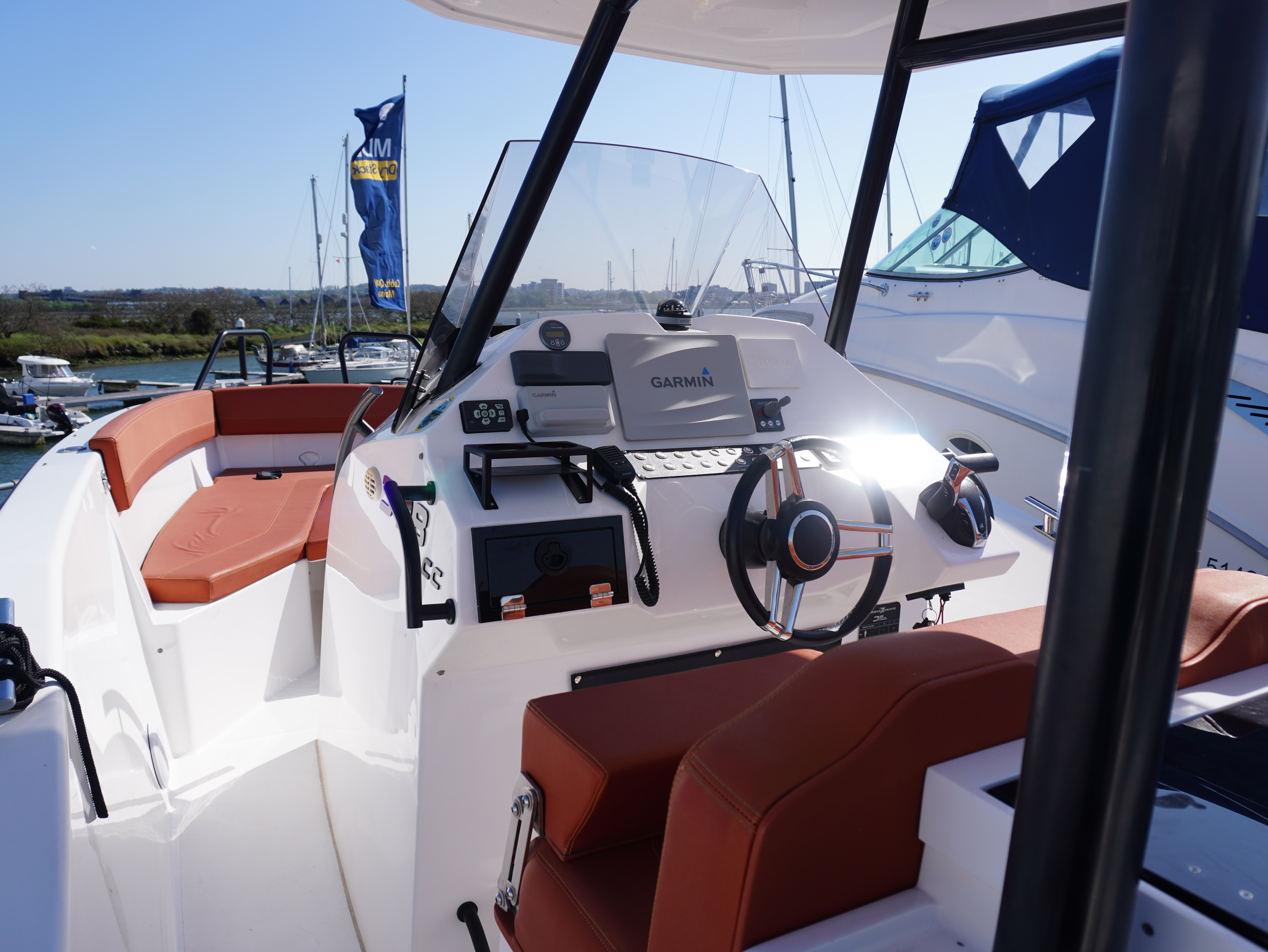 On board, she features a comprehensive navigation and electronics package including Garmin chartplotter and VHF, Yamaha engine data display and Fusion entertainment system with cockpit speakers. Manoeuvring is made effortless thanks to the addition of a Side Power bow thruster and Lectrotab trim tabs, giving excellent control in all conditions and tight marina spaces!