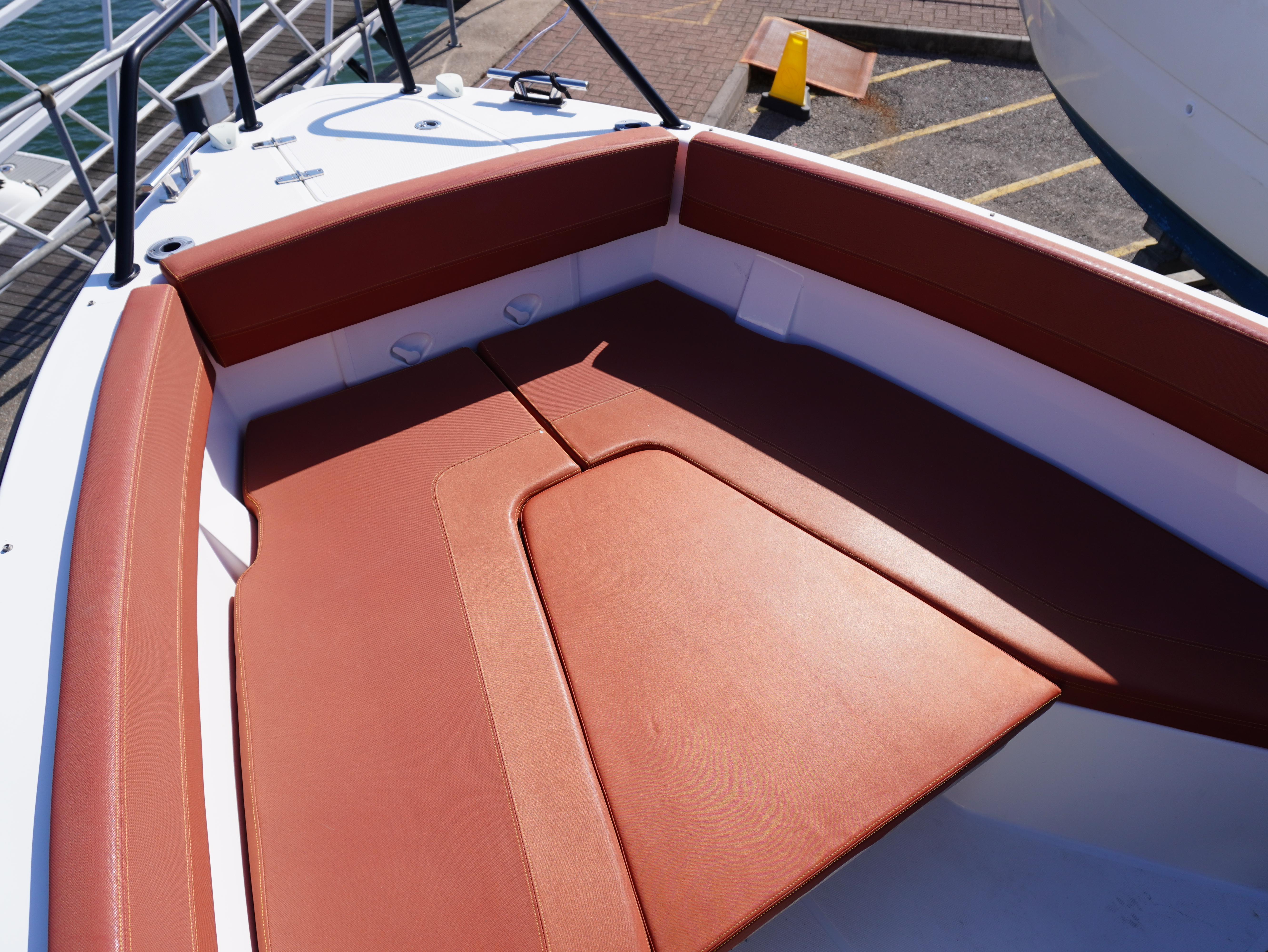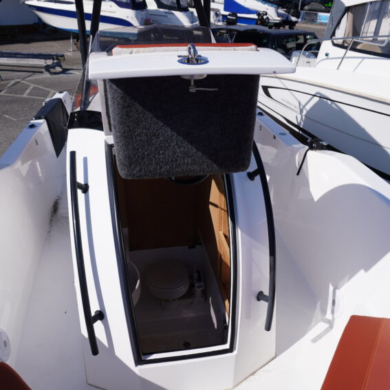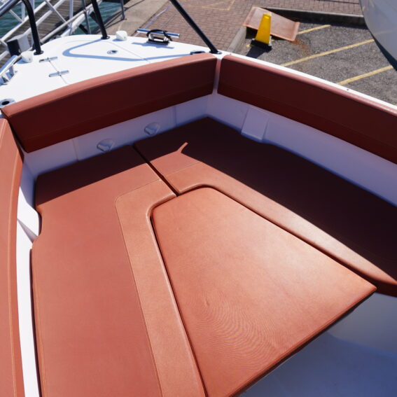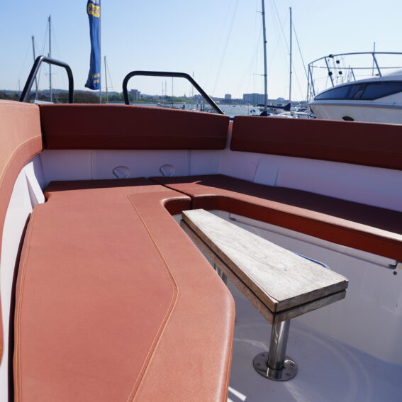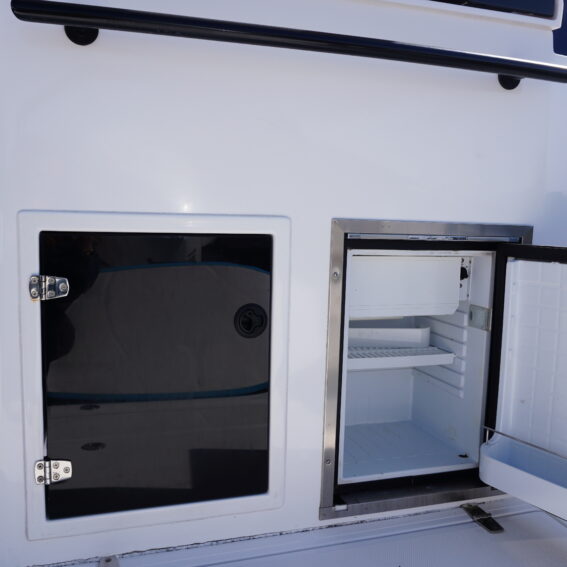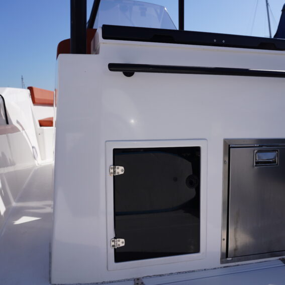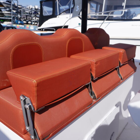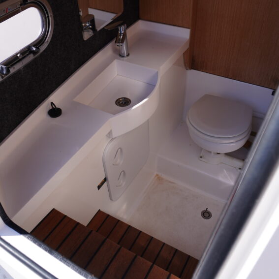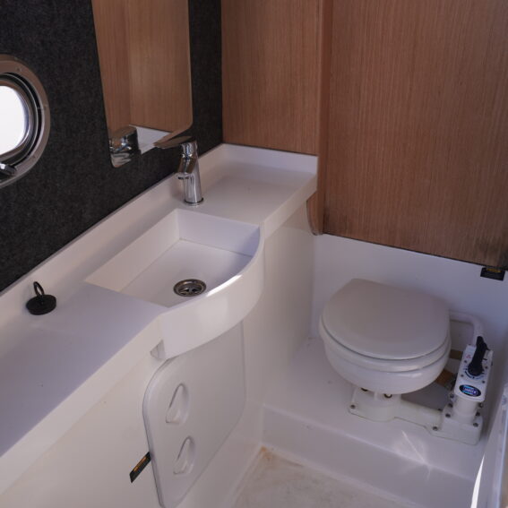 Her cockpit layout is designed for both comfort and flexibility, with bow sunpad conversion and table, full cockpit cushions, and a wet bar area complete with sink, tap and refrigerator. A Jabsco manual toilet is fitted within the console, alongside storage and practical use of space. The self-draining cockpit, stainless steel deck hardware, electric anchor windlass and re-boarding swim ladder all reinforce her usability as a proper all-rounder!