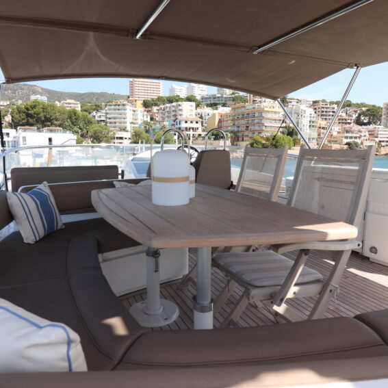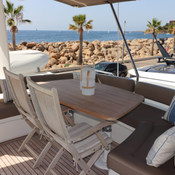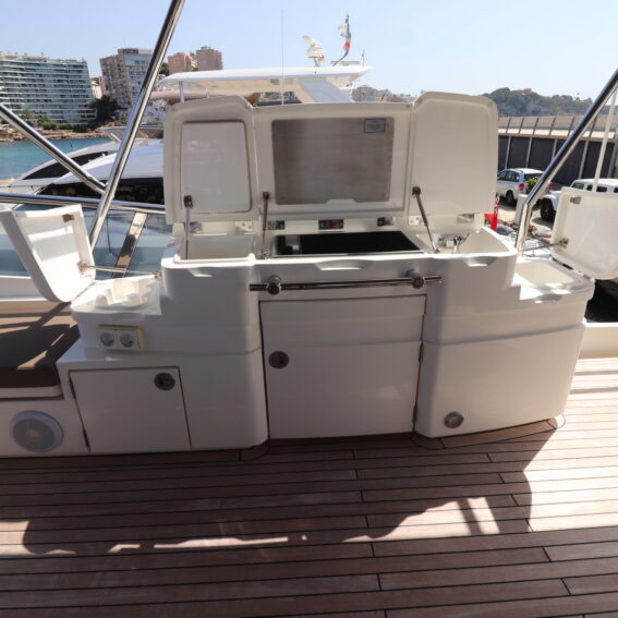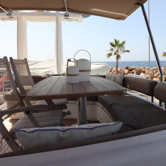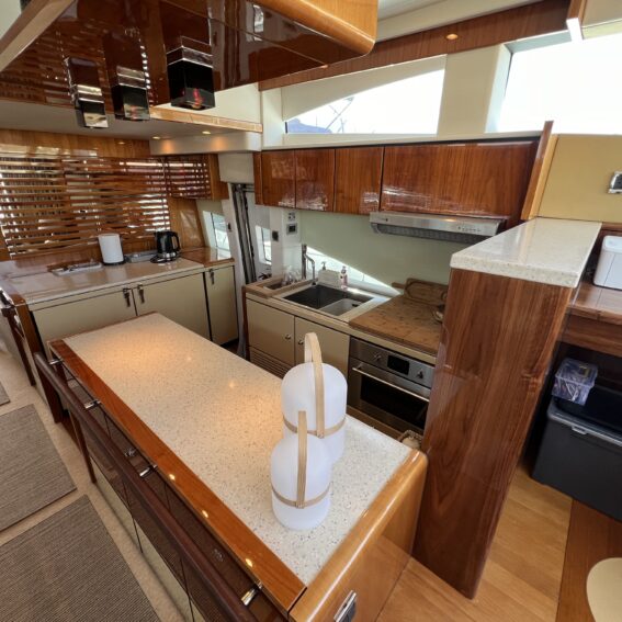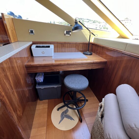 Entry into the saloon from the aft cockpit with central opening patios doors. The salon has a rise and fall Television on the stdb side and large L shaped sofa to the port side. The semi enclosed divide behind the sofa leads to an open plan Galley on the port side which faces the dining table on the stbd side. Forward of this the helm is located on the stdb side and a workstation has been cleverly positioned on the port side forward and above the Galley!