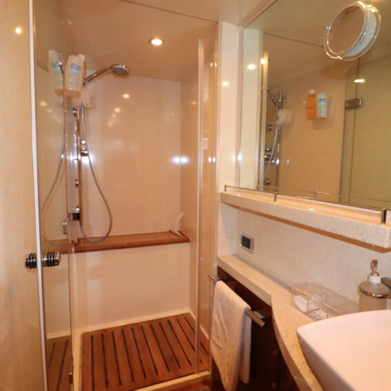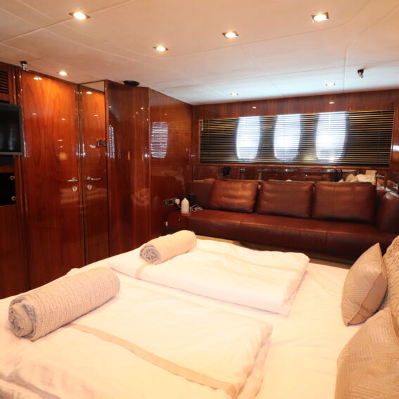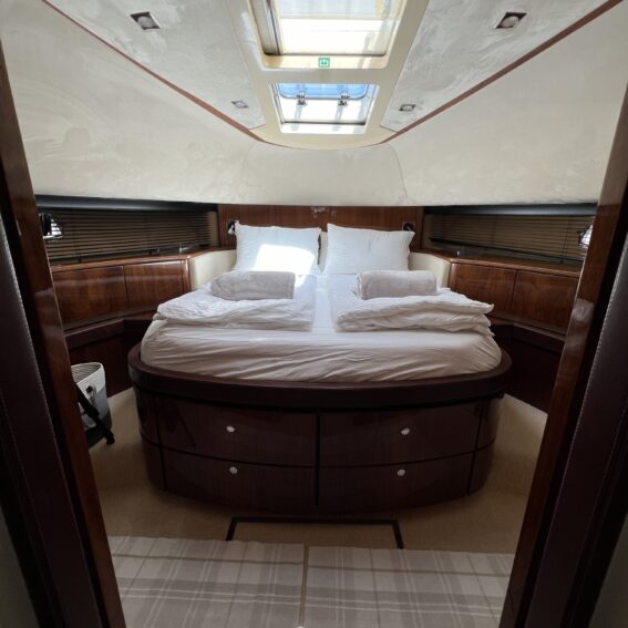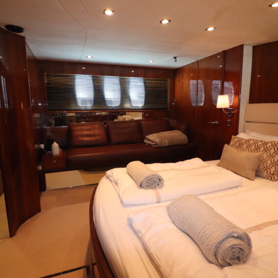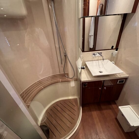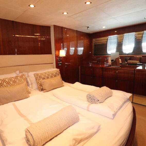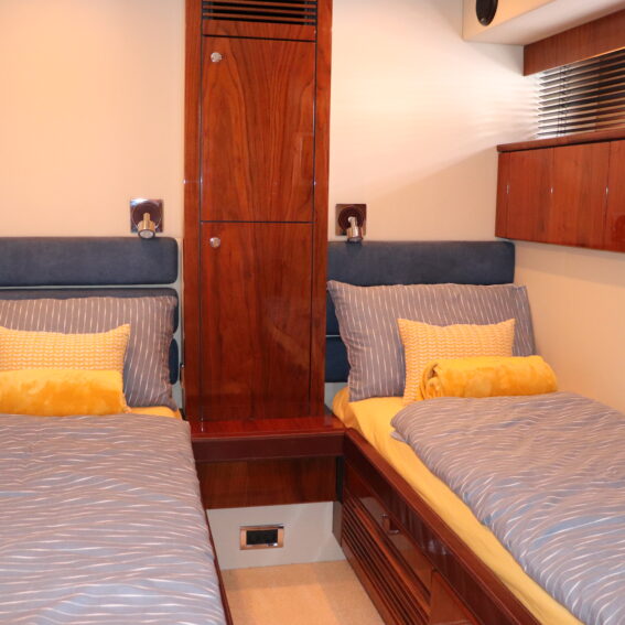 Central stairs lead down the accommodation, port side twin cabin with ensuite Head/ day head, forward to the double Guest cabin with en suite also. Moving back there is a Fourth twin Pullman cabin, the top bunk is foldable so the cabin set a single or bunks. Then we move aft the Full been owners cabin in the midship of the boat, with walk in wardrobe and well sized en suite!