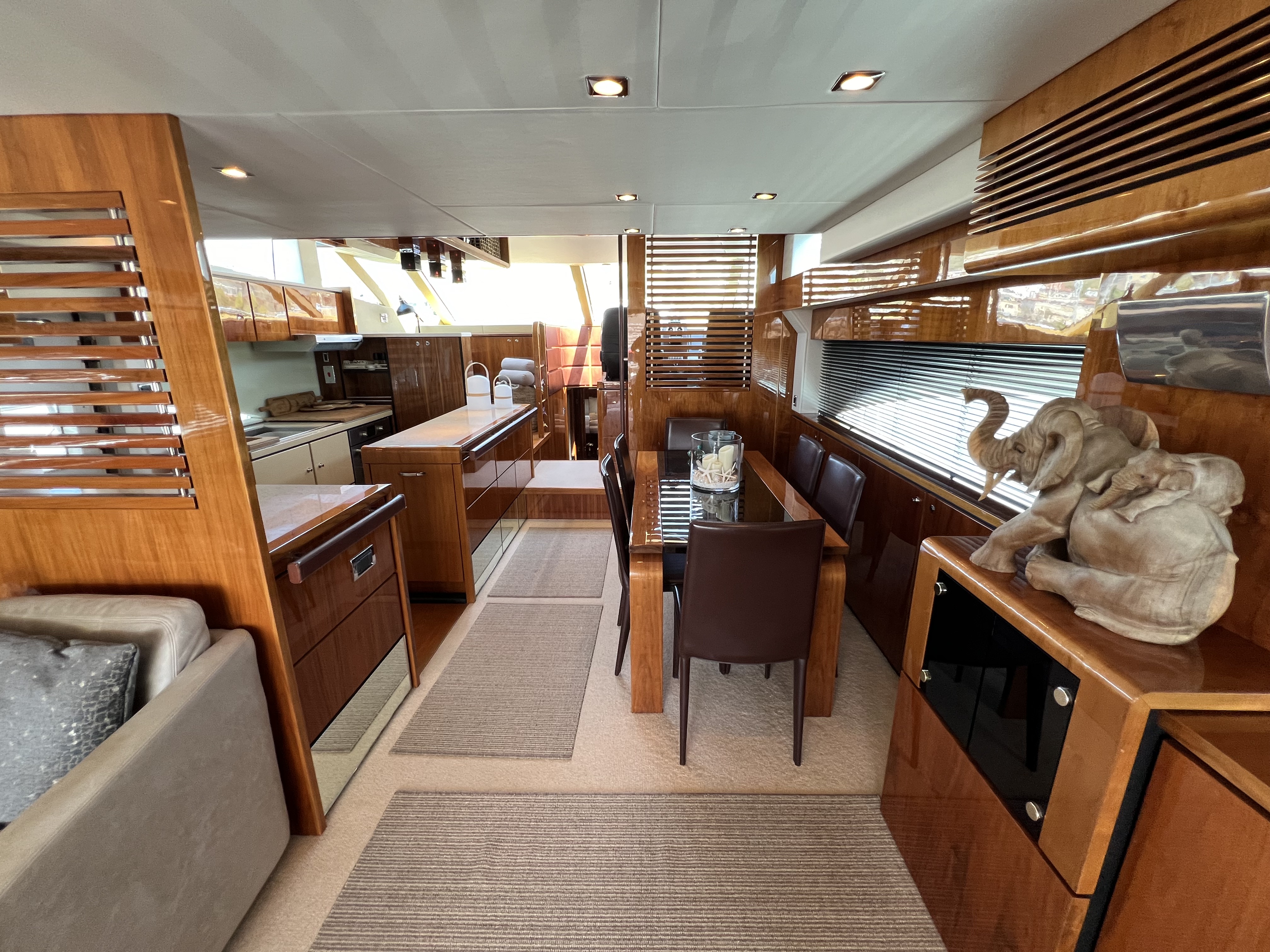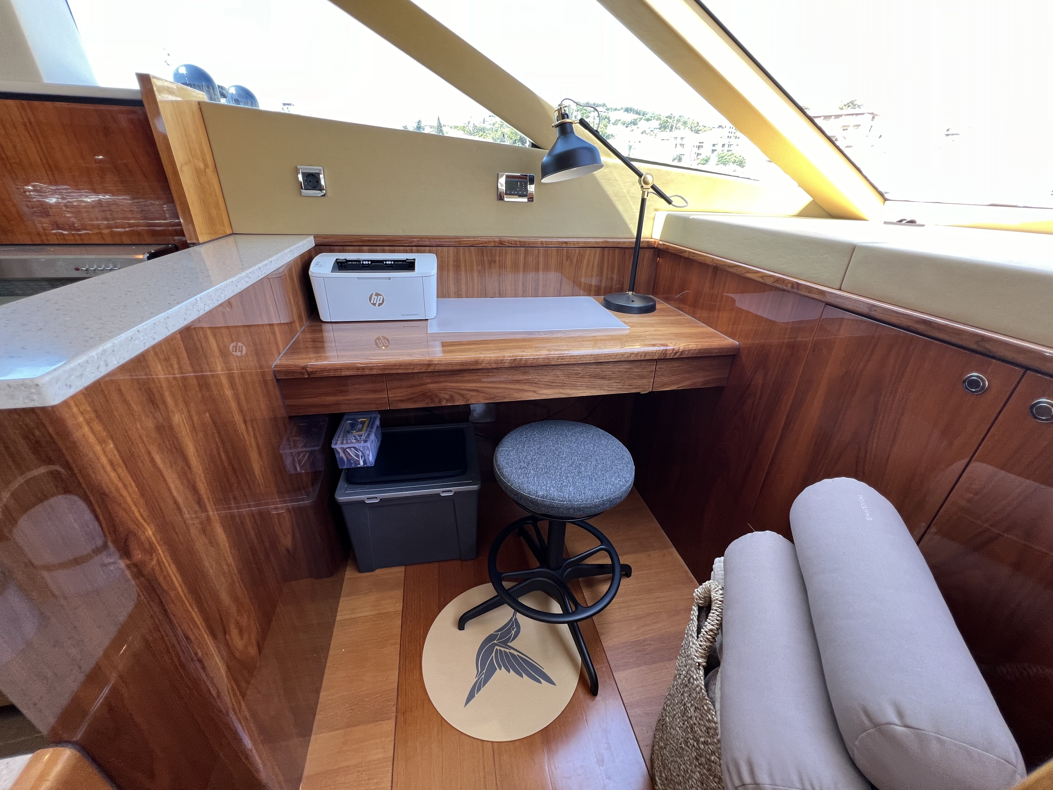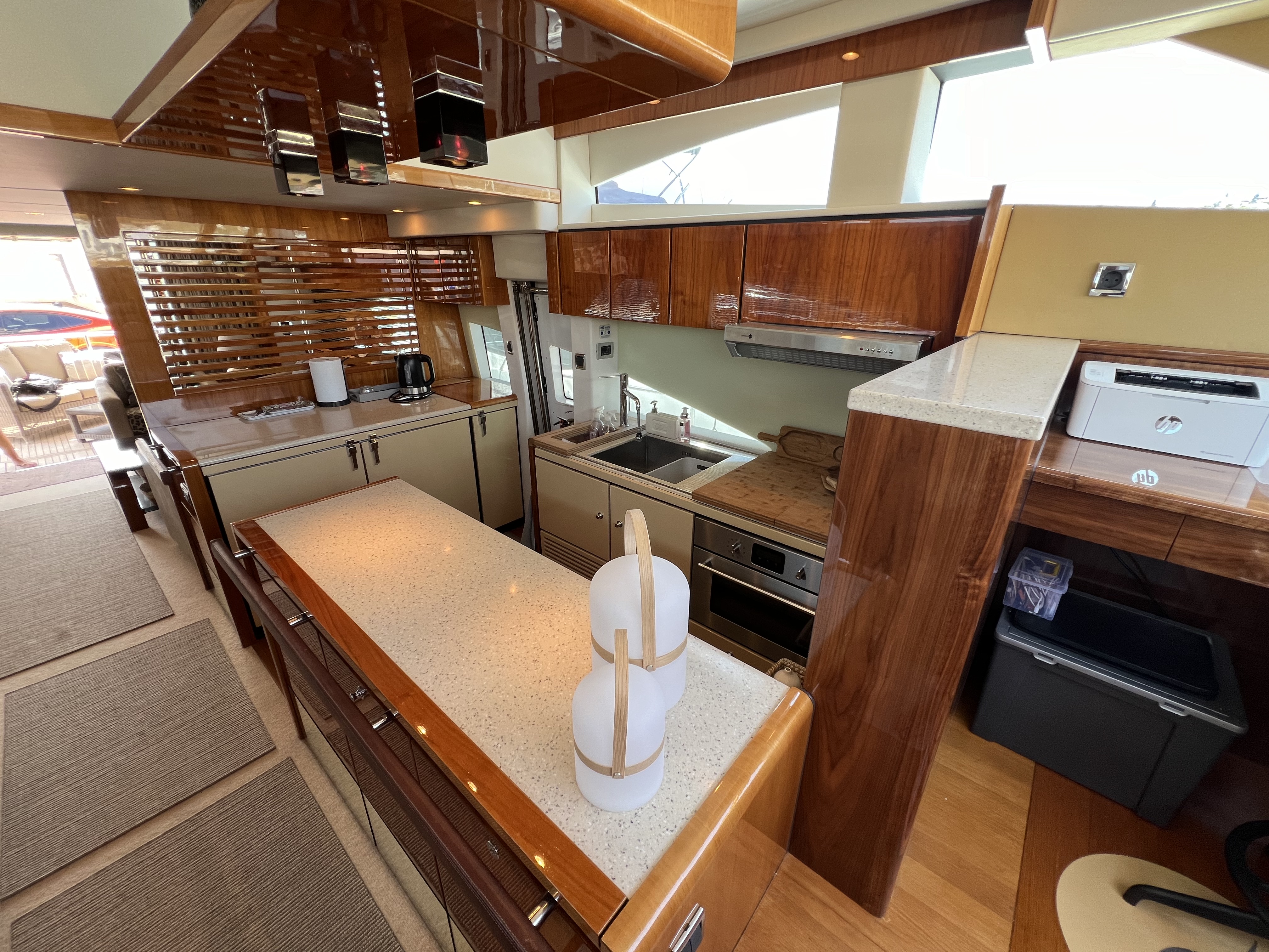 Entry into the saloon from the aft cockpit with central opening patios doors. The salon has a rise and fall Television on the stdb side and large L shaped sofa to the port side. The semi enclosed divide behind the sofa leads to an open plan Galley on the port side which faces the dining table on the stbd side. Forward of this the helm is located on the stdb side and a workstation has been cleverly positioned on the port side forward and above the Galley!