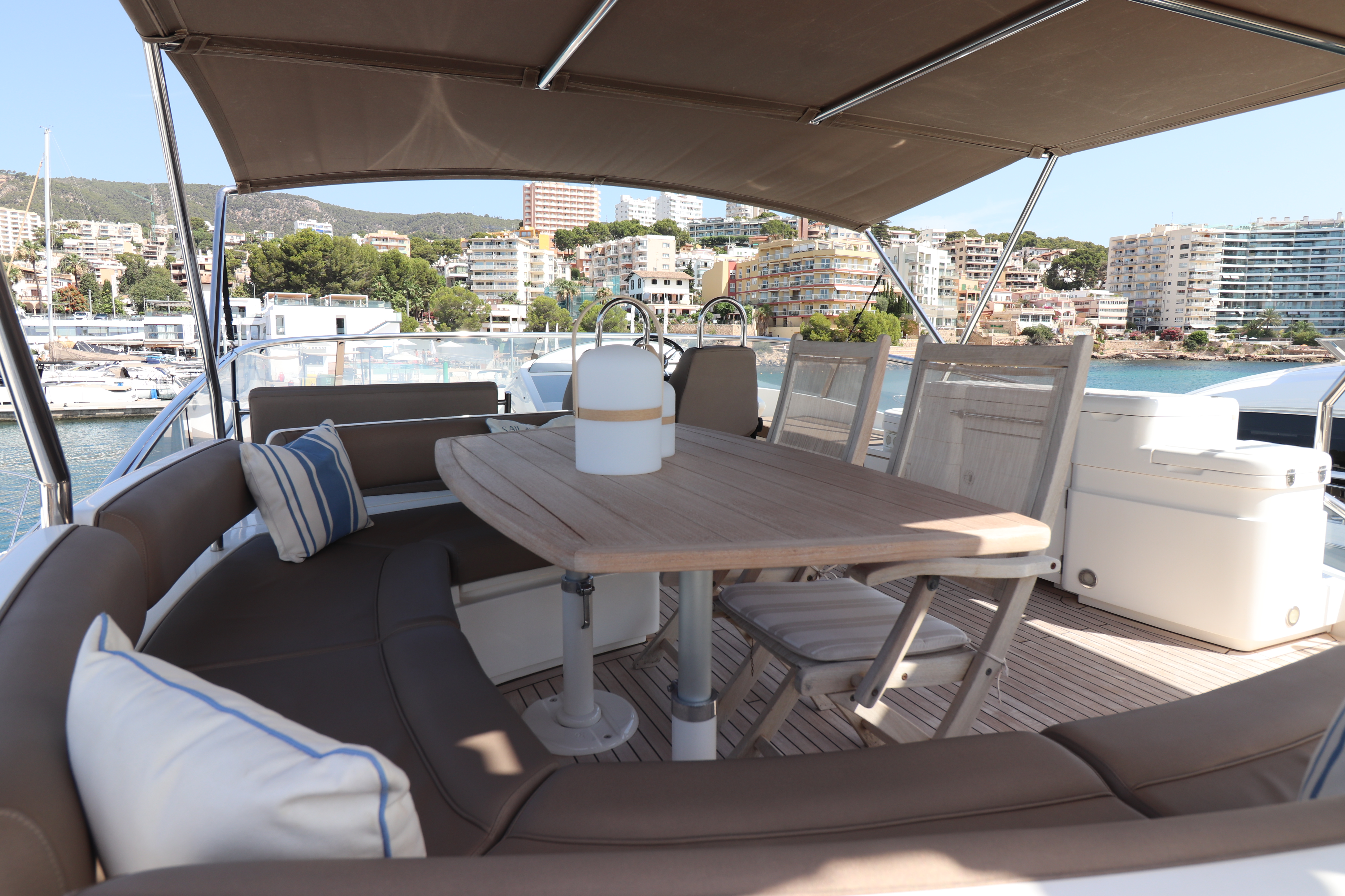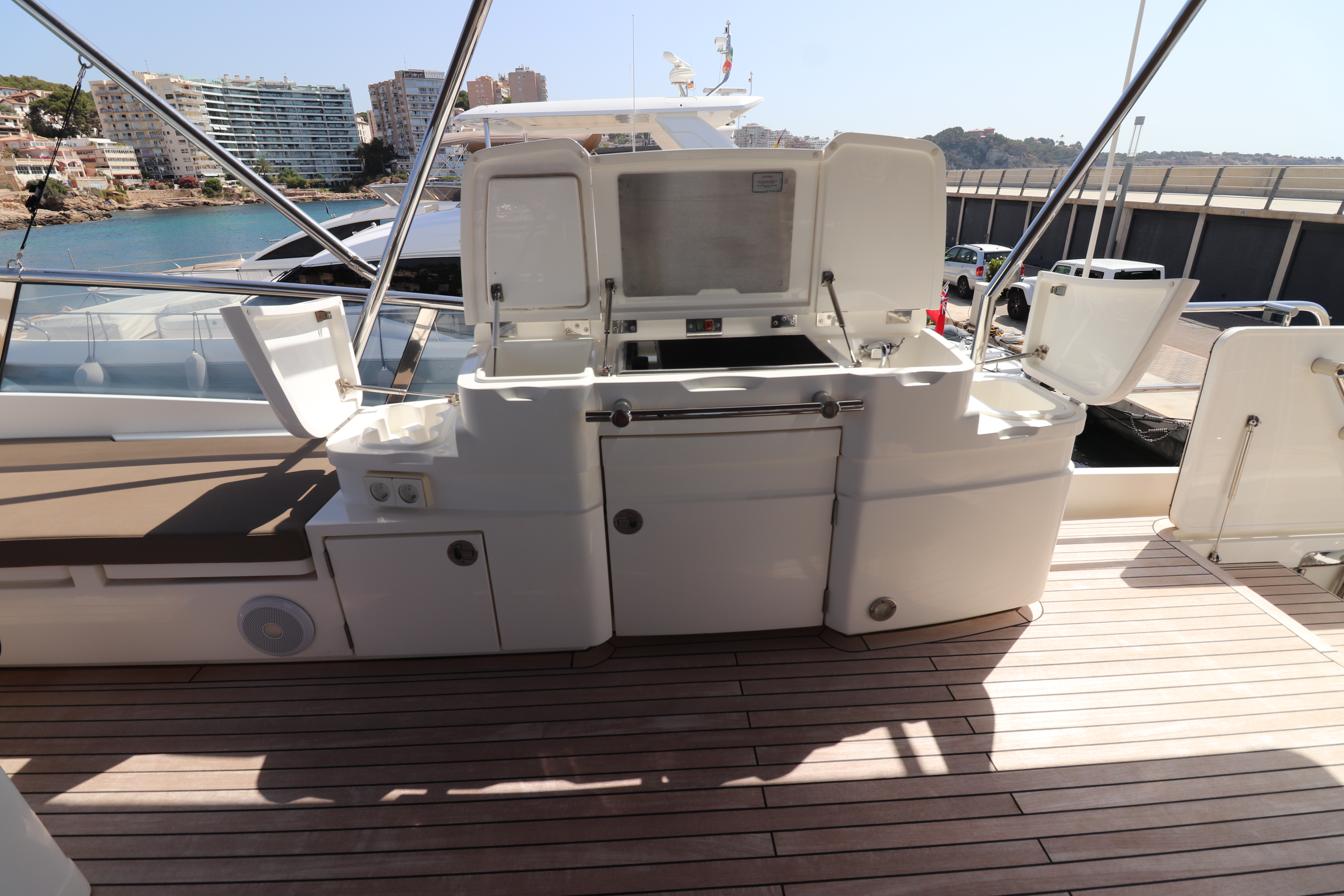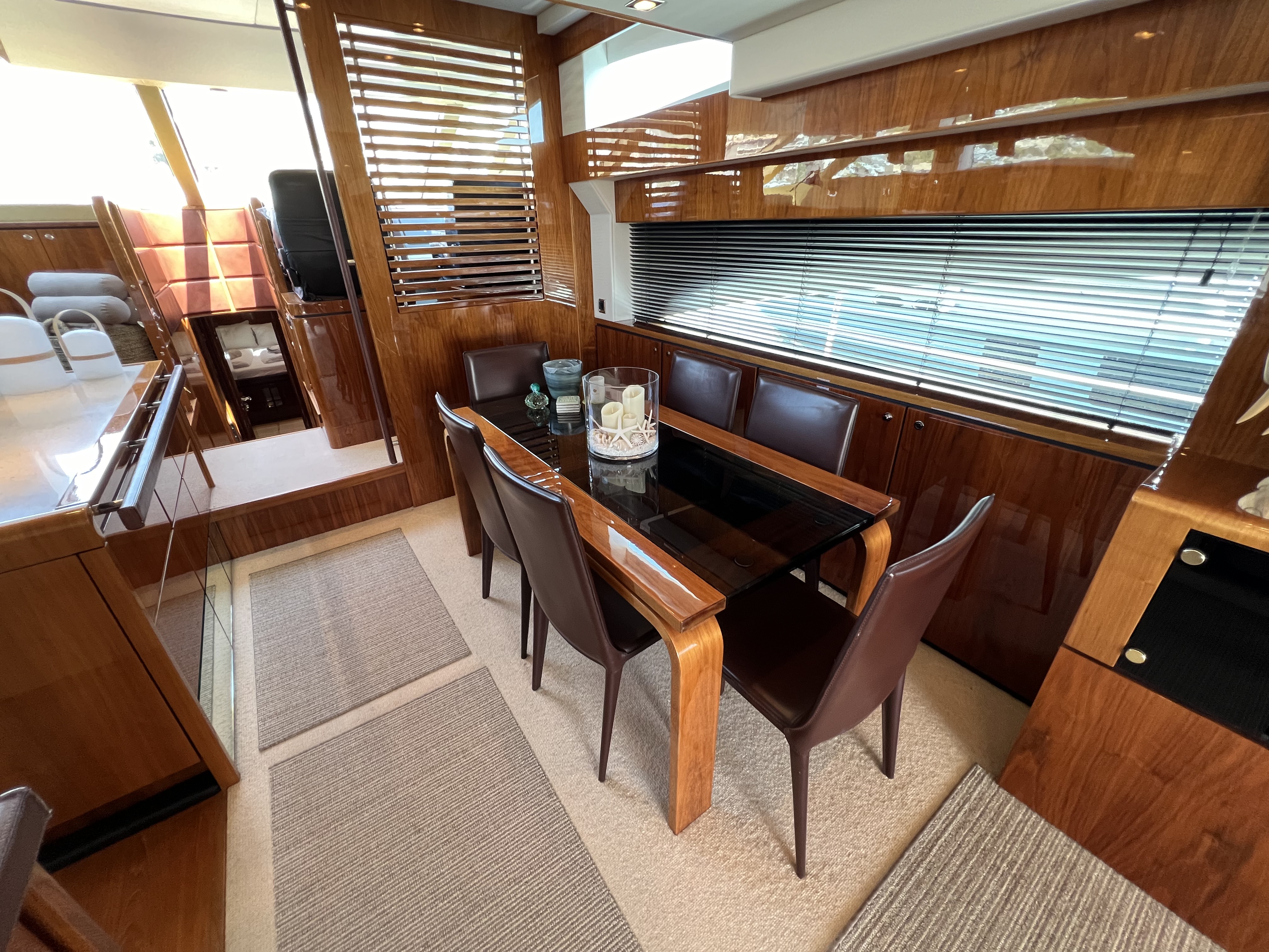 Entry into the saloon from the aft cockpit with central opening patios doors. The salon has a rise and fall Television on the stdb side and large L shaped sofa to the port side. The semi enclosed divide behind the sofa leads to an open plan Galley on the port side which faces the dining table on the stbd side. Forward of this the helm is located on the stdb side and a workstation has been cleverly positioned on the port side forward and above the Galley!