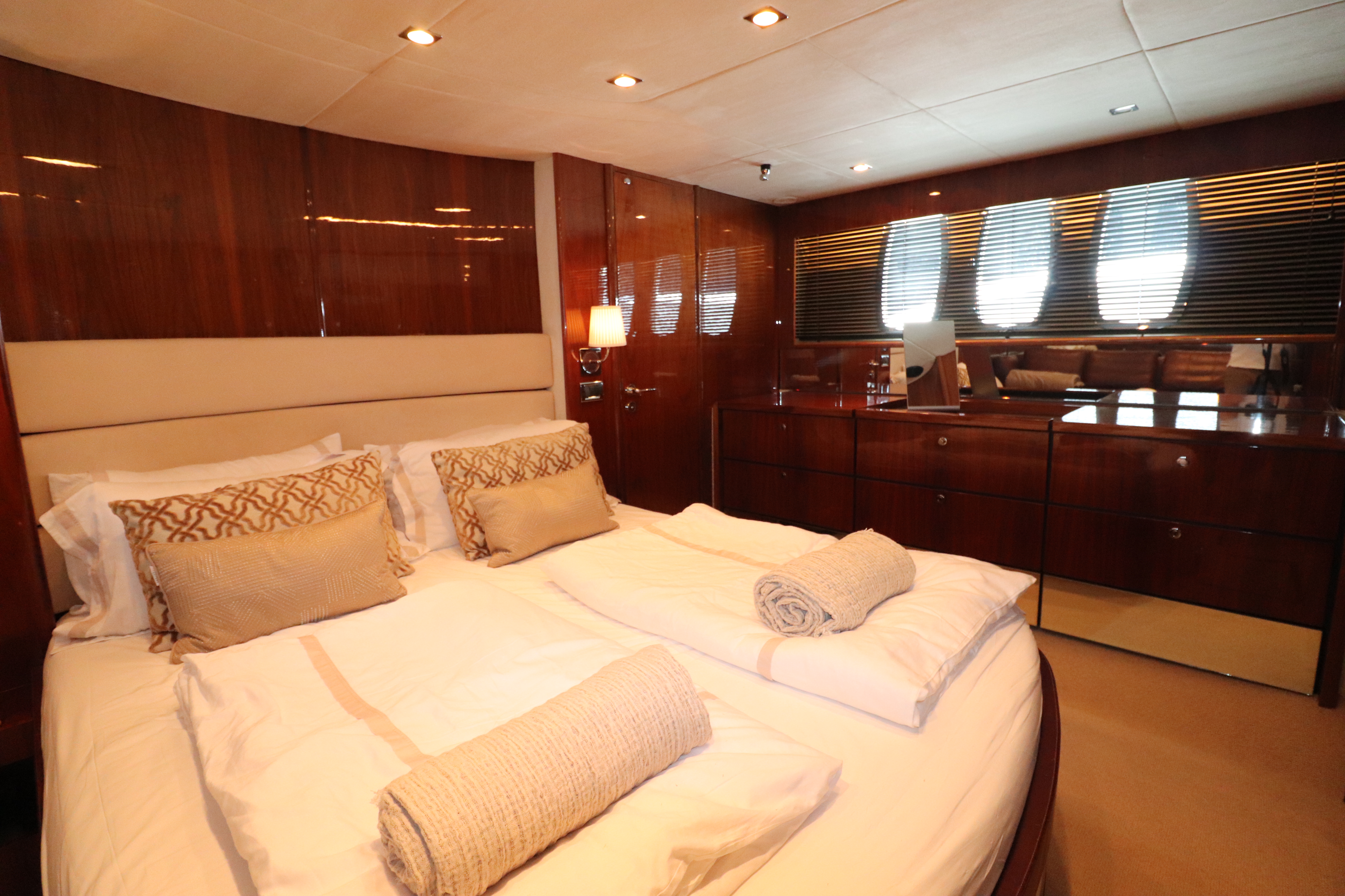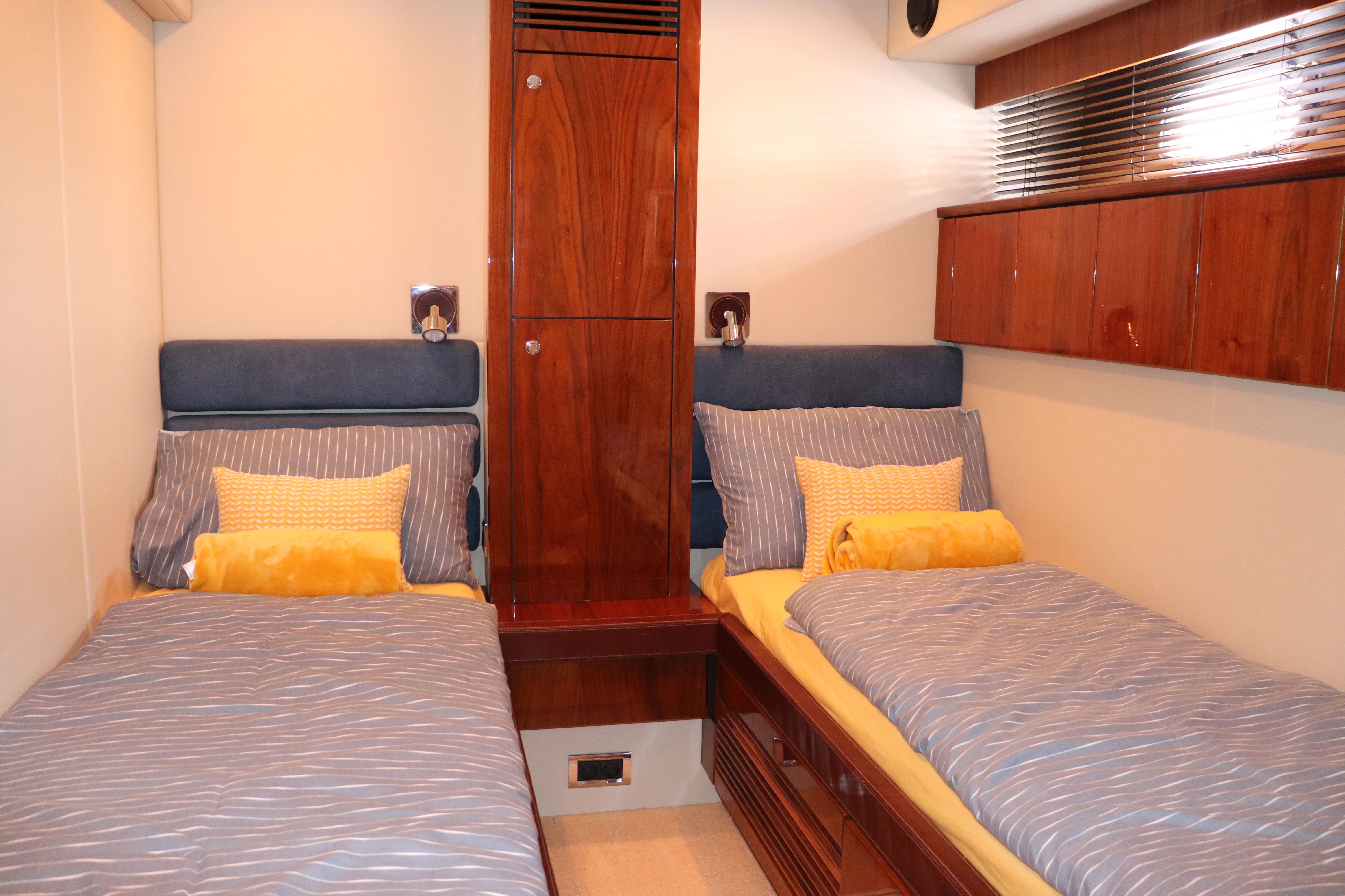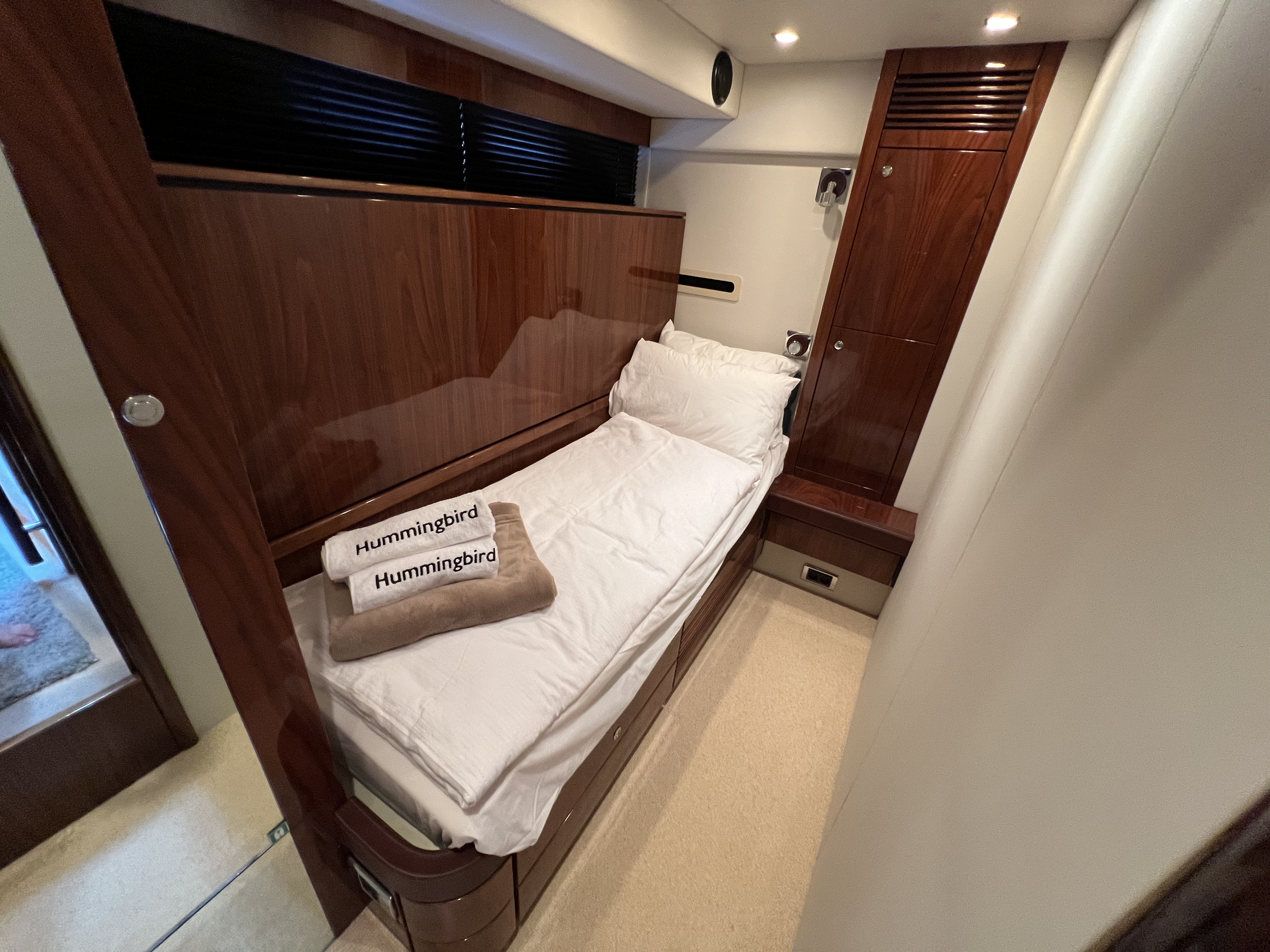 Central stairs lead down the accommodation, port side twin cabin with ensuite Head/ day head, forward to the double Guest cabin with en suite also. Moving back there is a Fourth twin Pullman cabin, the top bunk is foldable so the cabin set a single or bunks. Then we move aft the Full been owners cabin in the midship of the boat, with walk in wardrobe and well sized en suite!