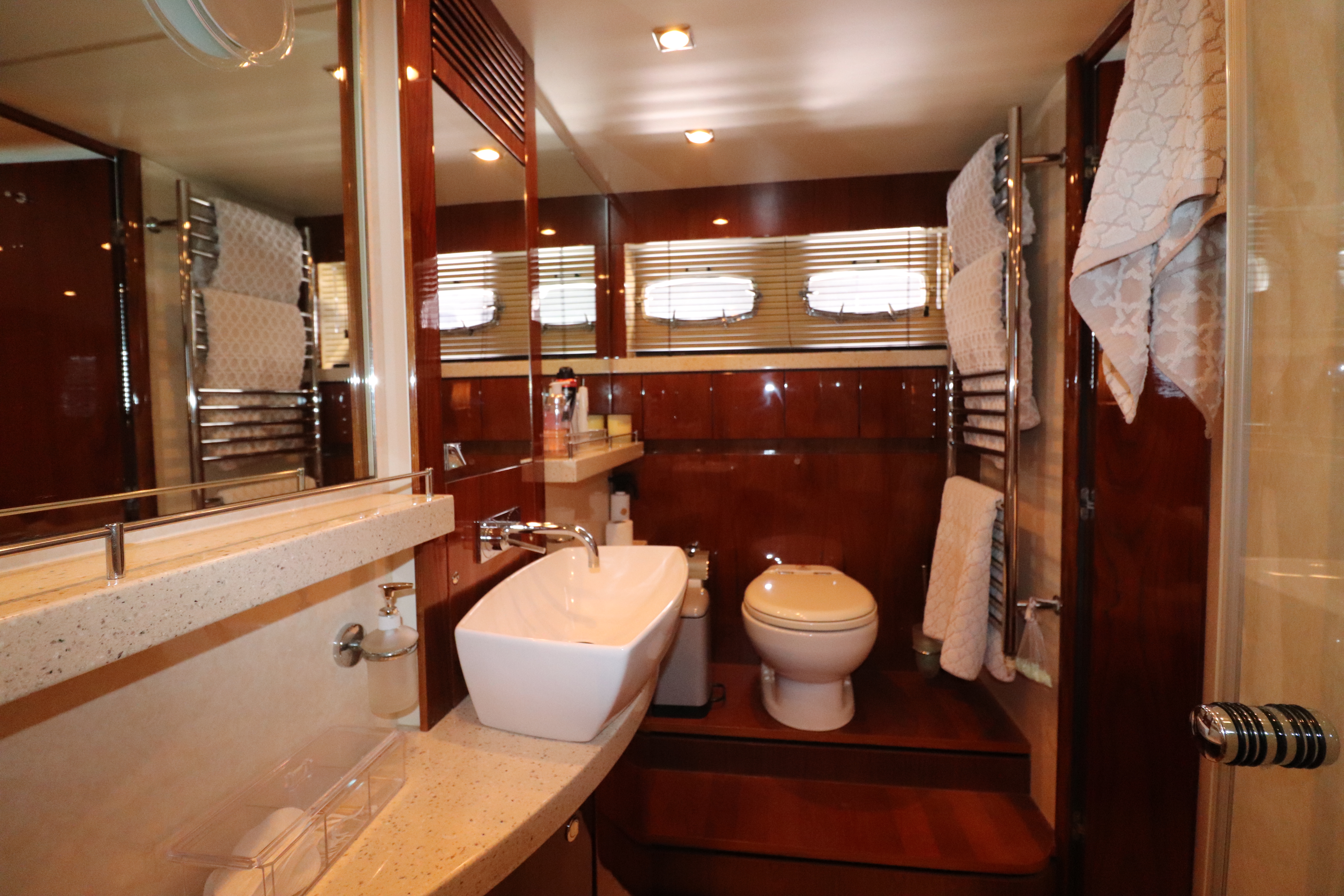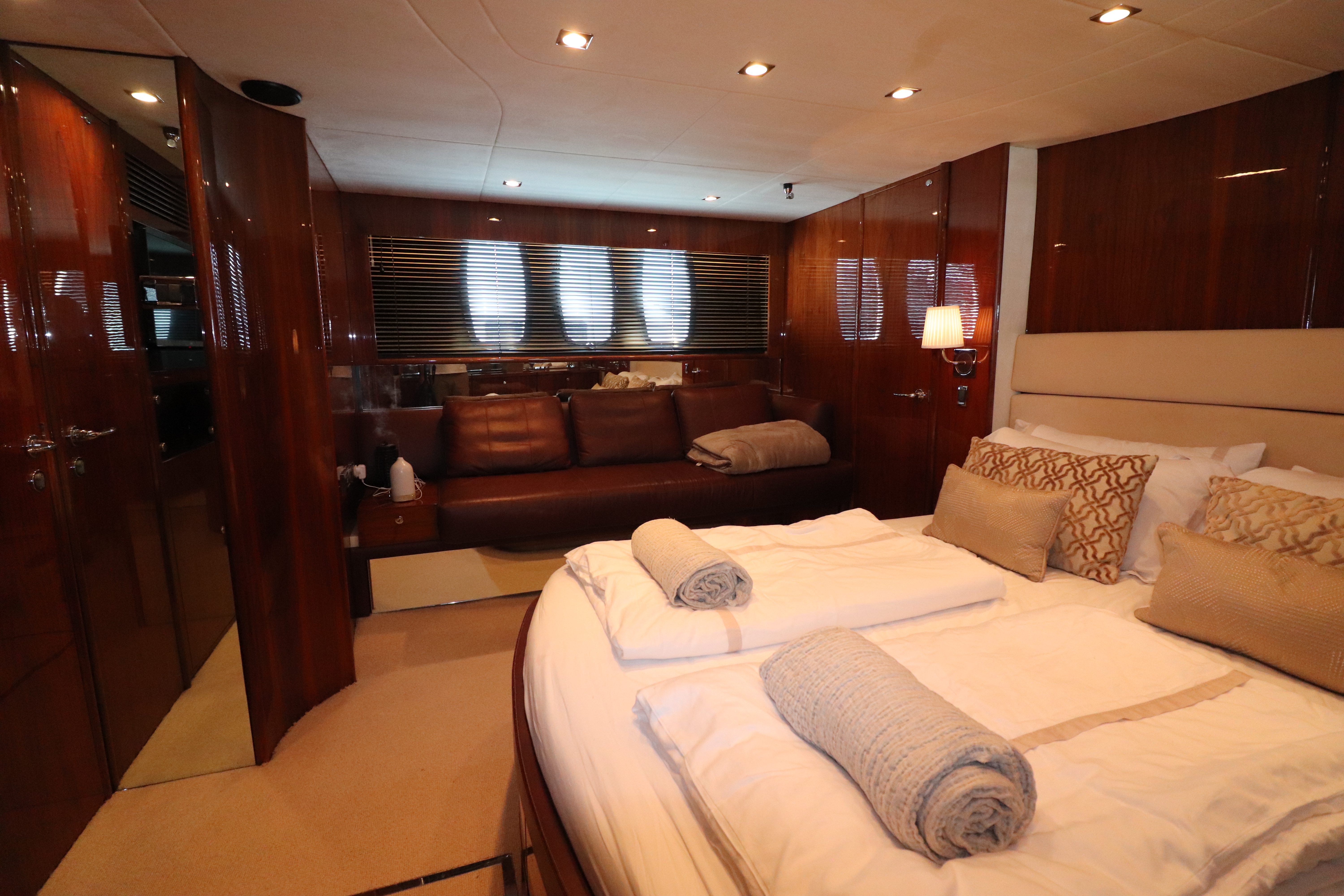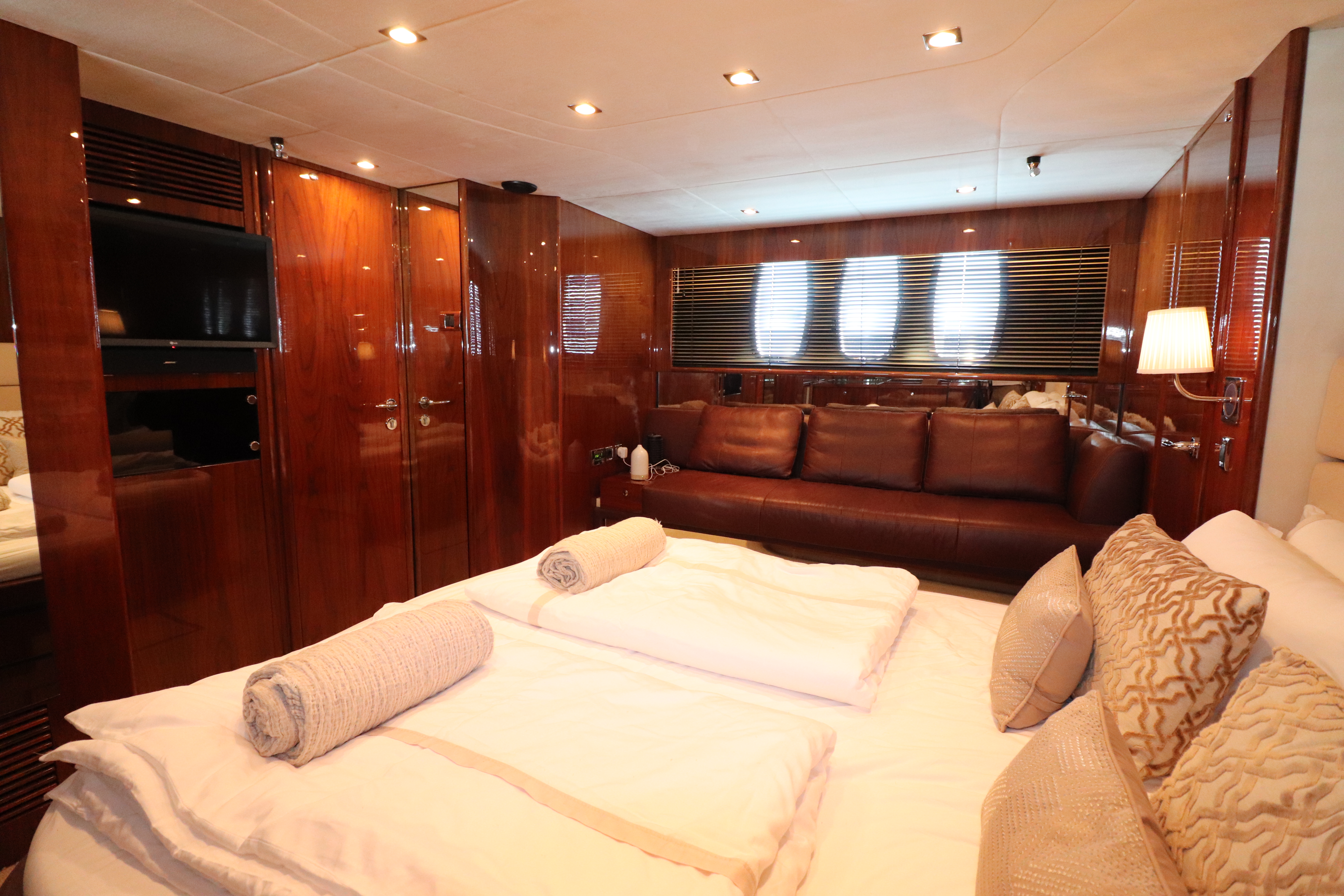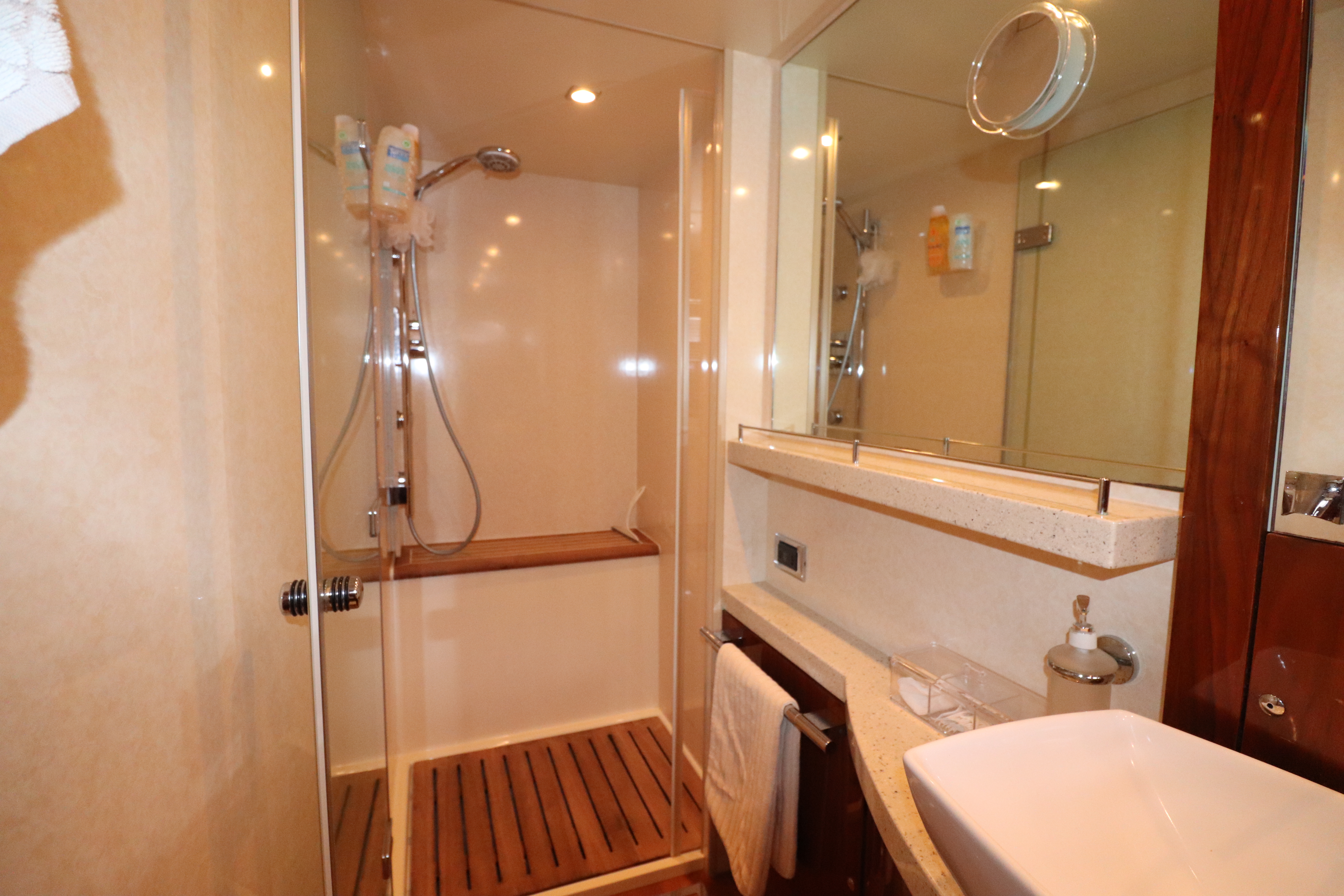 Central stairs lead down the accommodation, port side twin cabin with ensuite Head/ day head, forward to the double Guest cabin with en suite also. Moving back there is a Fourth twin Pullman cabin, the top bunk is foldable so the cabin set a single or bunks. Then we move aft the Full been owners cabin in the midship of the boat, with walk in wardrobe and well sized en suite!
