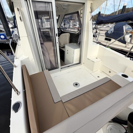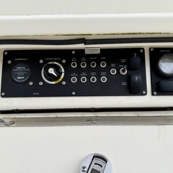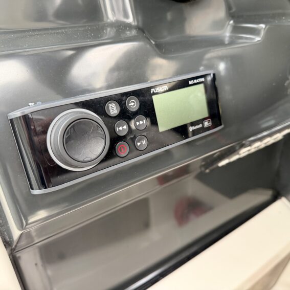 Externally, the cockpit offers plenty of space for relaxing or entertaining, with a cockpit table, cushioned seating, cup holders, and fishing rod holders for versatility. Stainless steel railings, navigation lights, and exterior lighting all add to the quality and safety of this capable cruiser. Additional highlights include an electric anchor windlass, bilge pumps, waste tank with pump-out, and a Fusion entertainment system with speakers for onboard enjoyment!