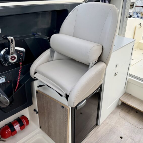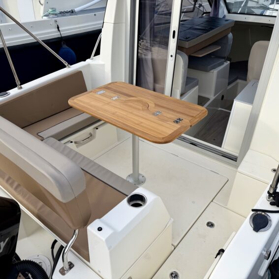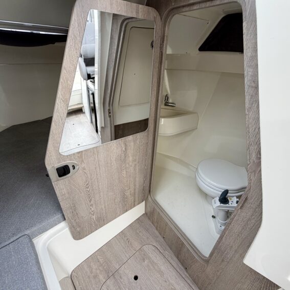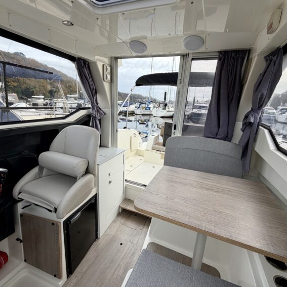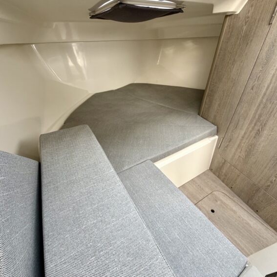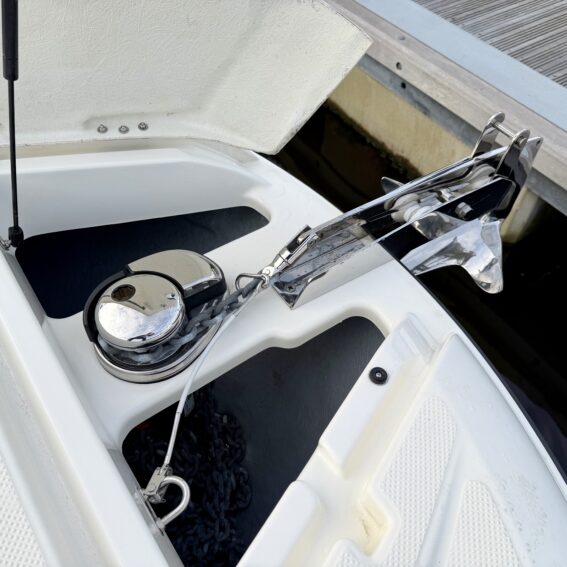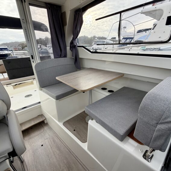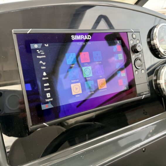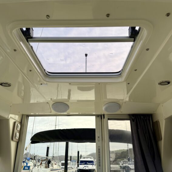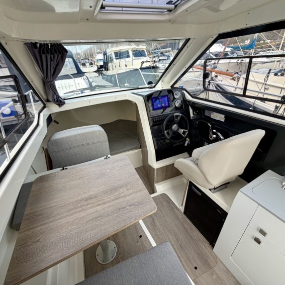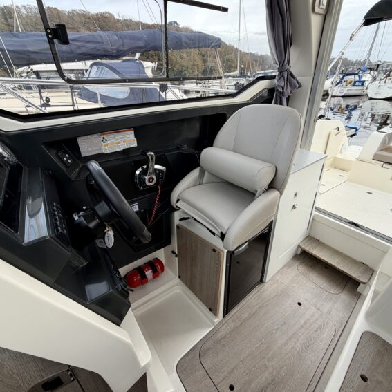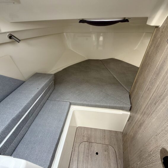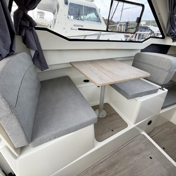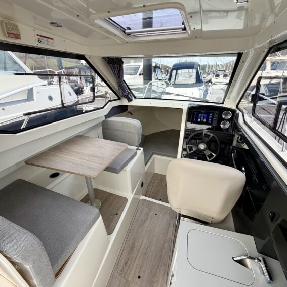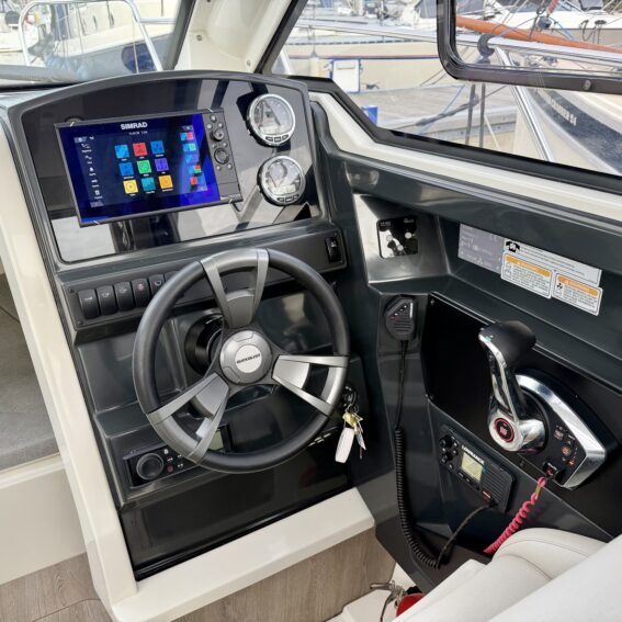 The helm area is well-appointed with a Simrad chartplotter, Lowrance VHF, Mercury engine dials, and a double USB charger, all complemented by a comfortable bolster seat for relaxed and confident navigation. The Webasto heating system and interior curtains ensure comfort on cooler days, while the manual opening roof hatch and full surround canvas covers provide flexibility whatever the weather!