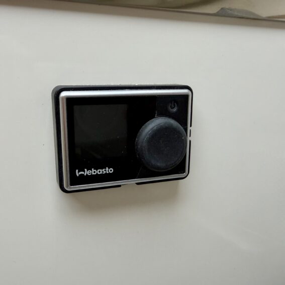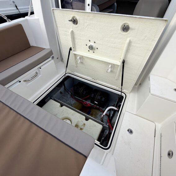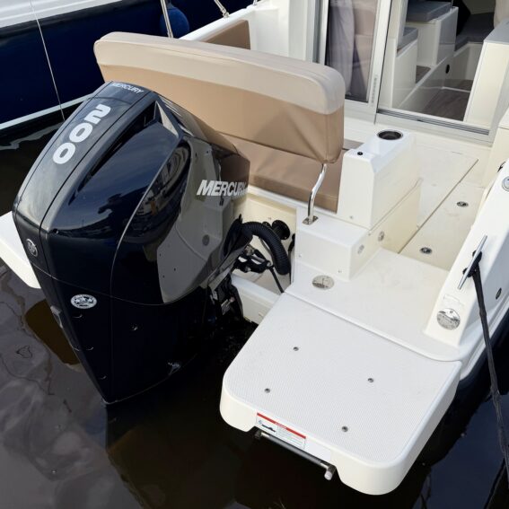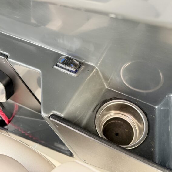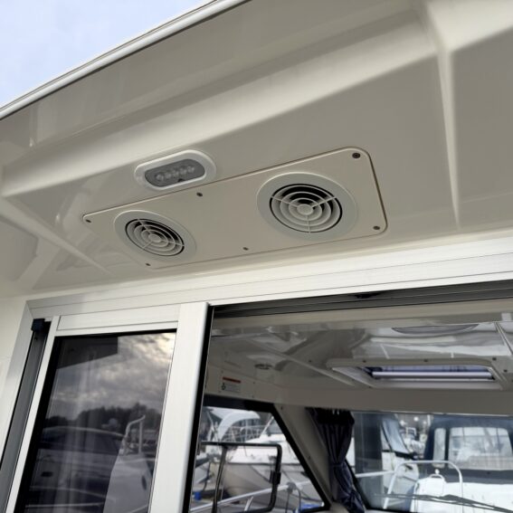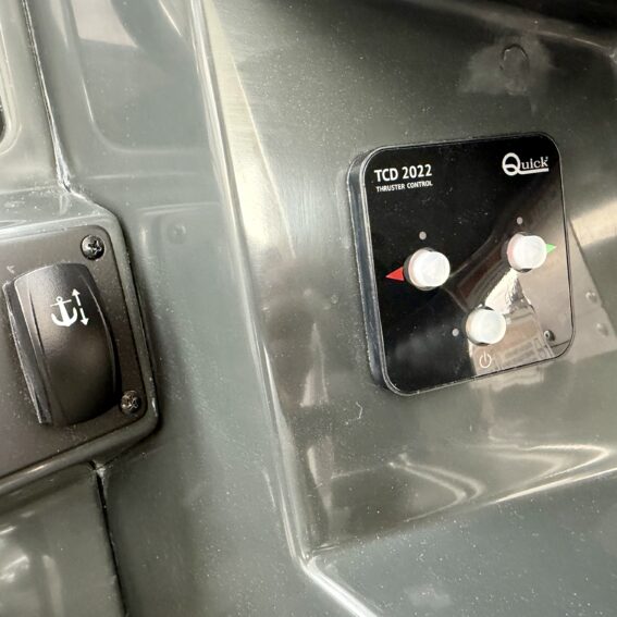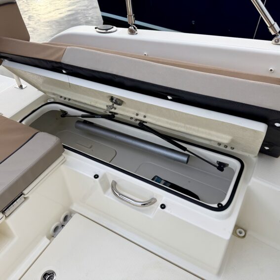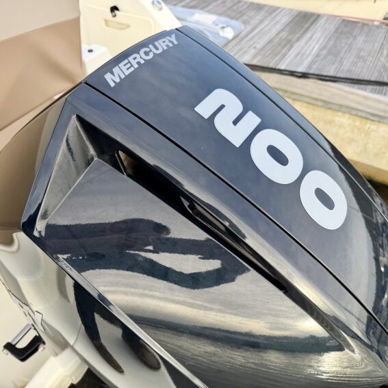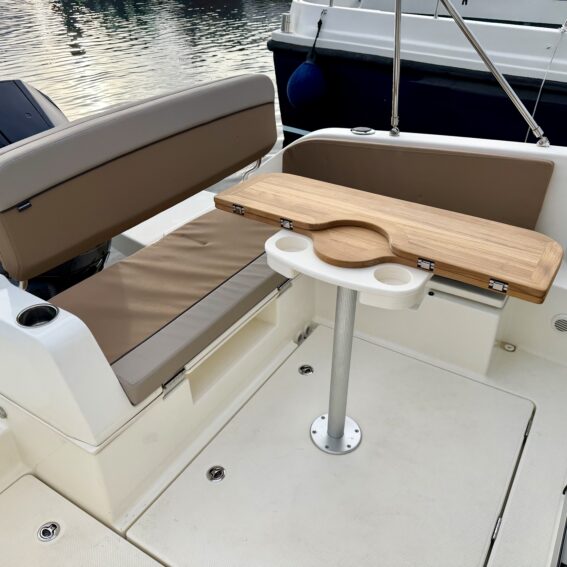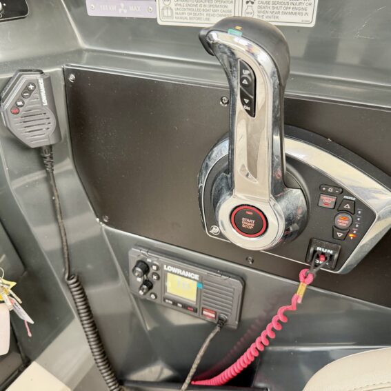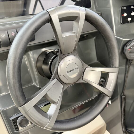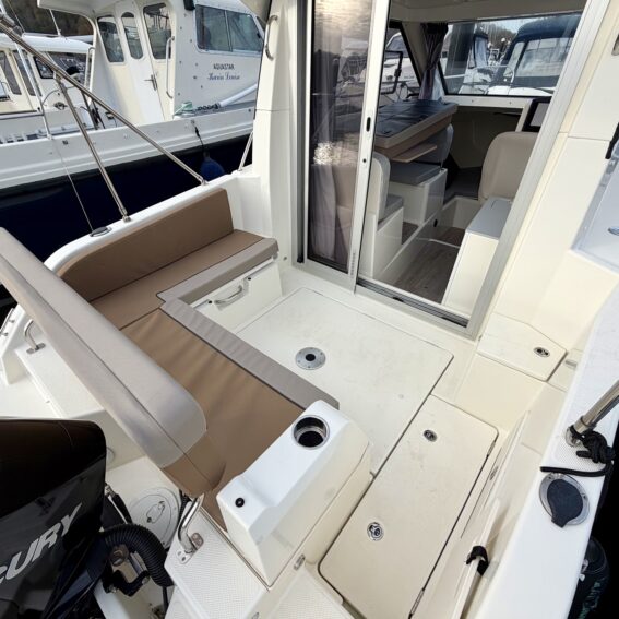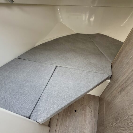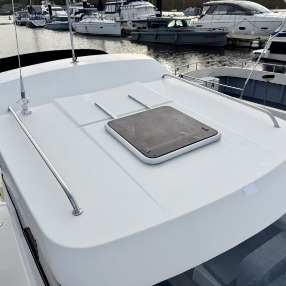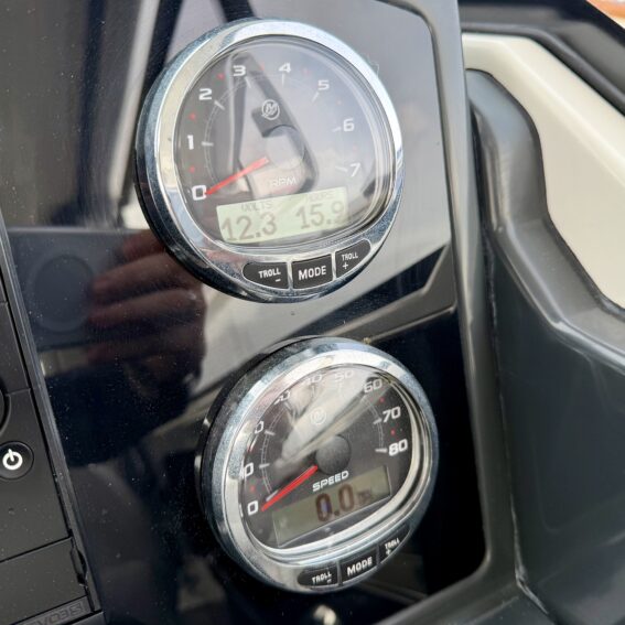 The helm area is well-appointed with a Simrad chartplotter, Lowrance VHF, Mercury engine dials, and a double USB charger, all complemented by a comfortable bolster seat for relaxed and confident navigation. The Webasto heating system and interior curtains ensure comfort on cooler days, while the manual opening roof hatch and full surround canvas covers provide flexibility whatever the weather!