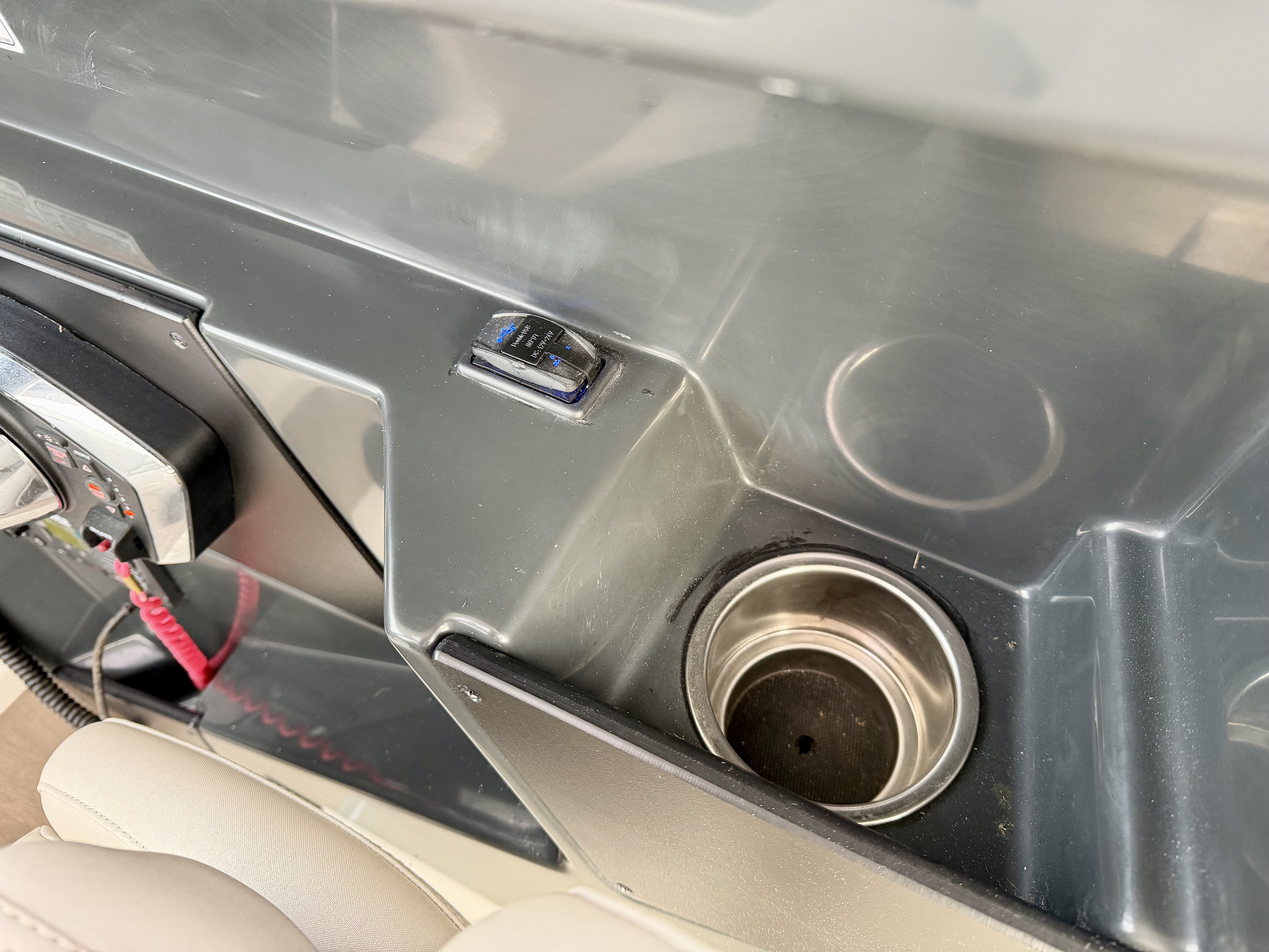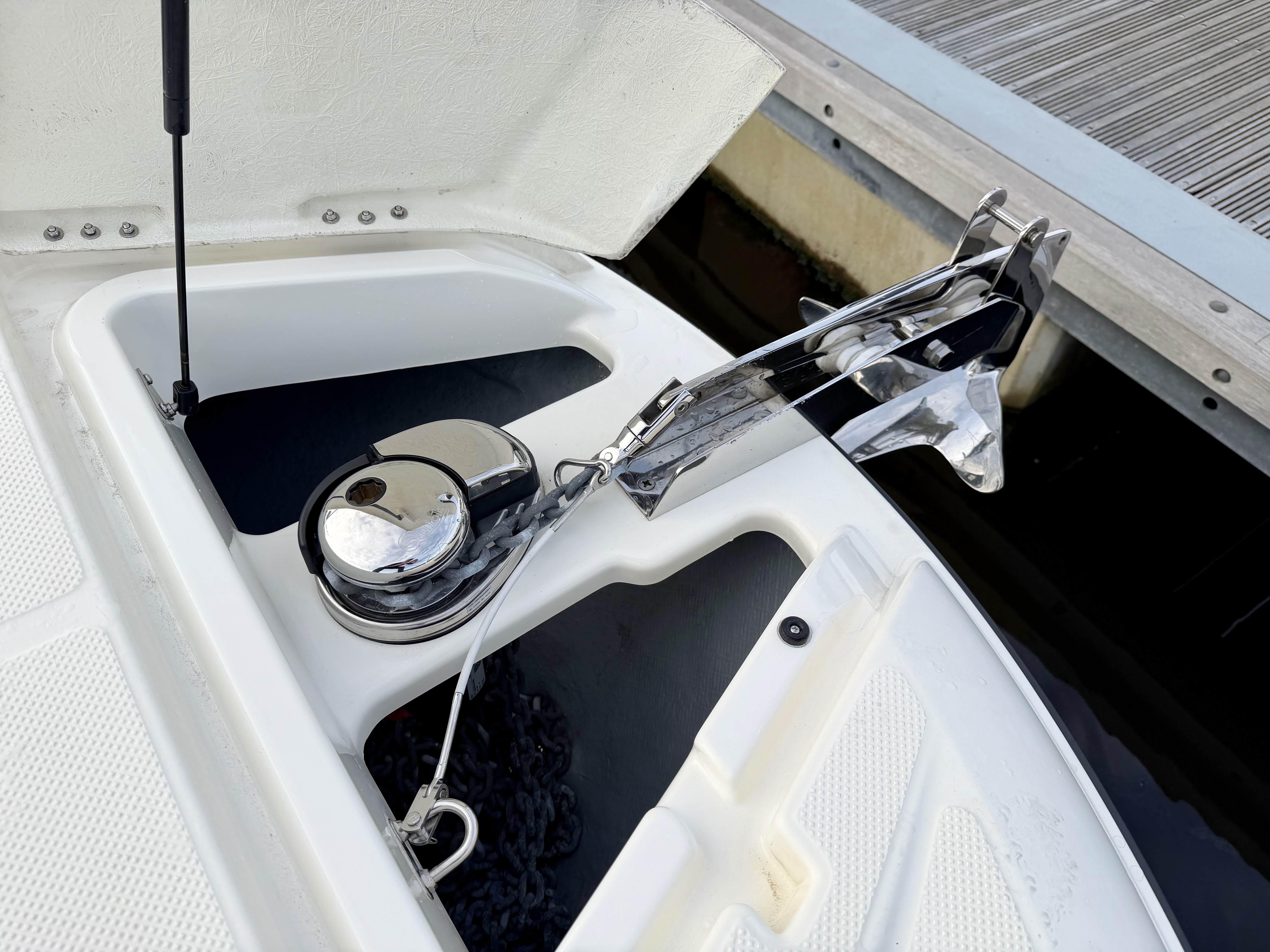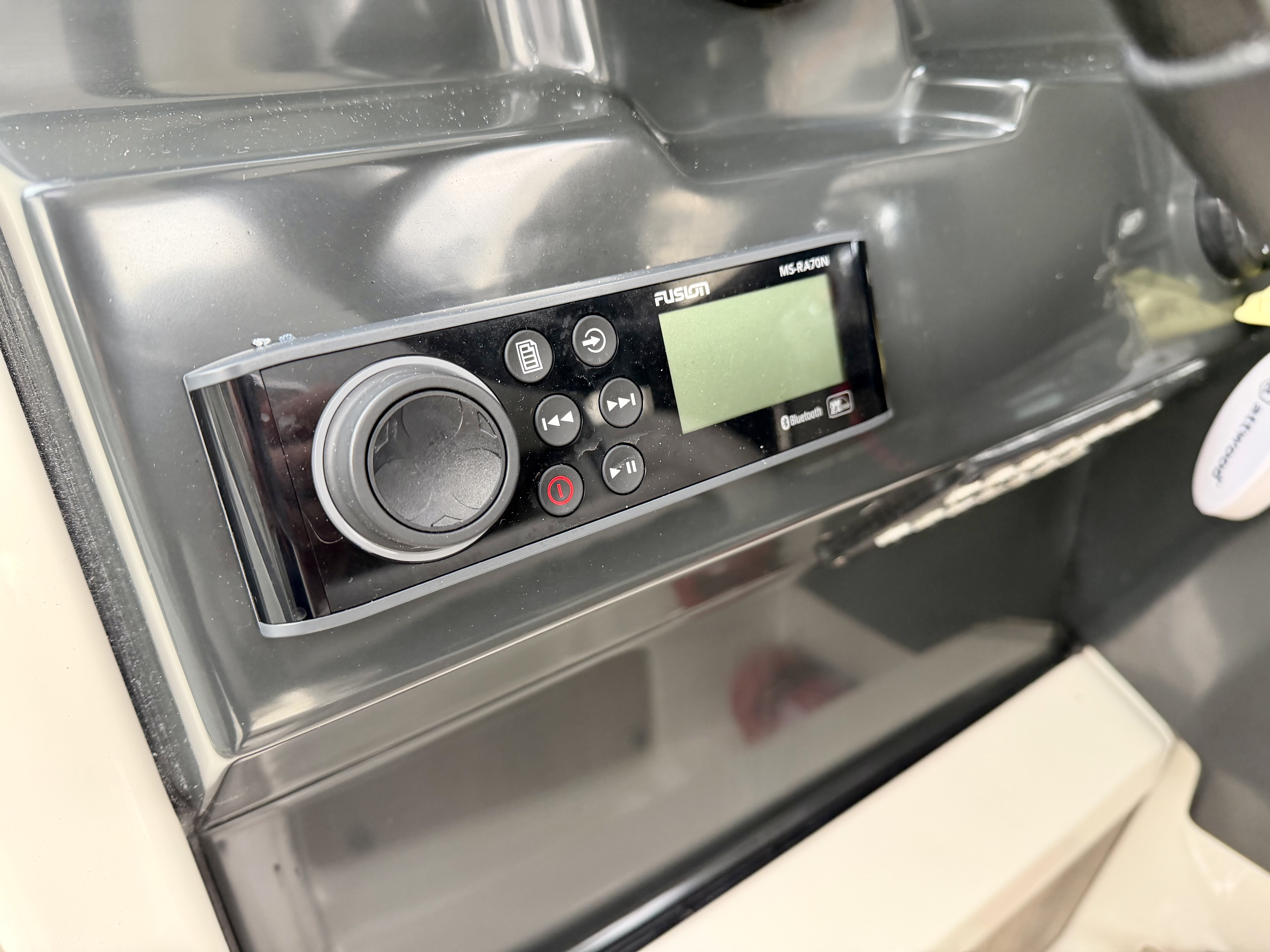 Externally, the cockpit offers plenty of space for relaxing or entertaining, with a cockpit table, cushioned seating, cup holders, and fishing rod holders for versatility. Stainless steel railings, navigation lights, and exterior lighting all add to the quality and safety of this capable cruiser. Additional highlights include an electric anchor windlass, bilge pumps, waste tank with pump-out, and a Fusion entertainment system with speakers for onboard enjoyment!