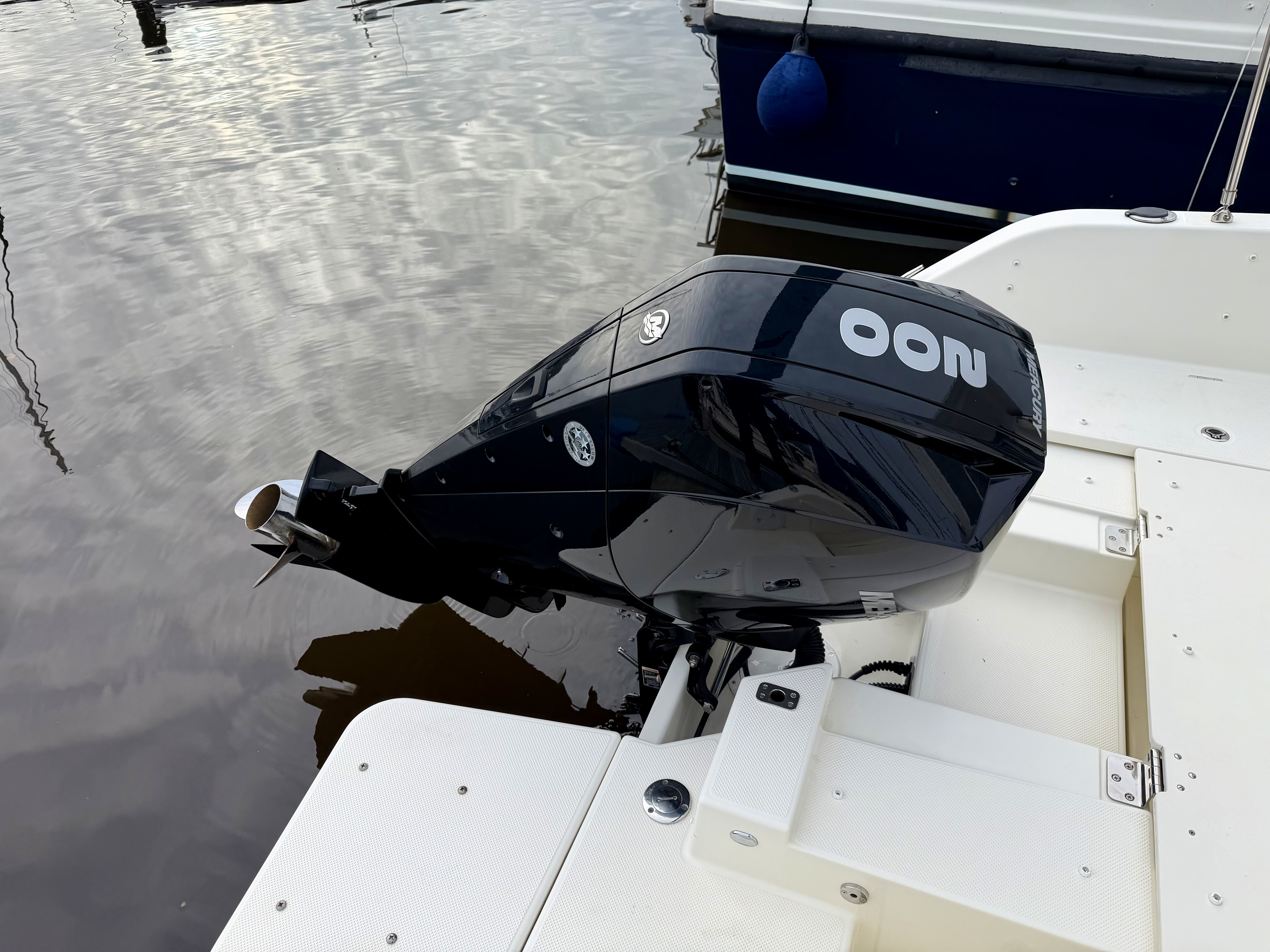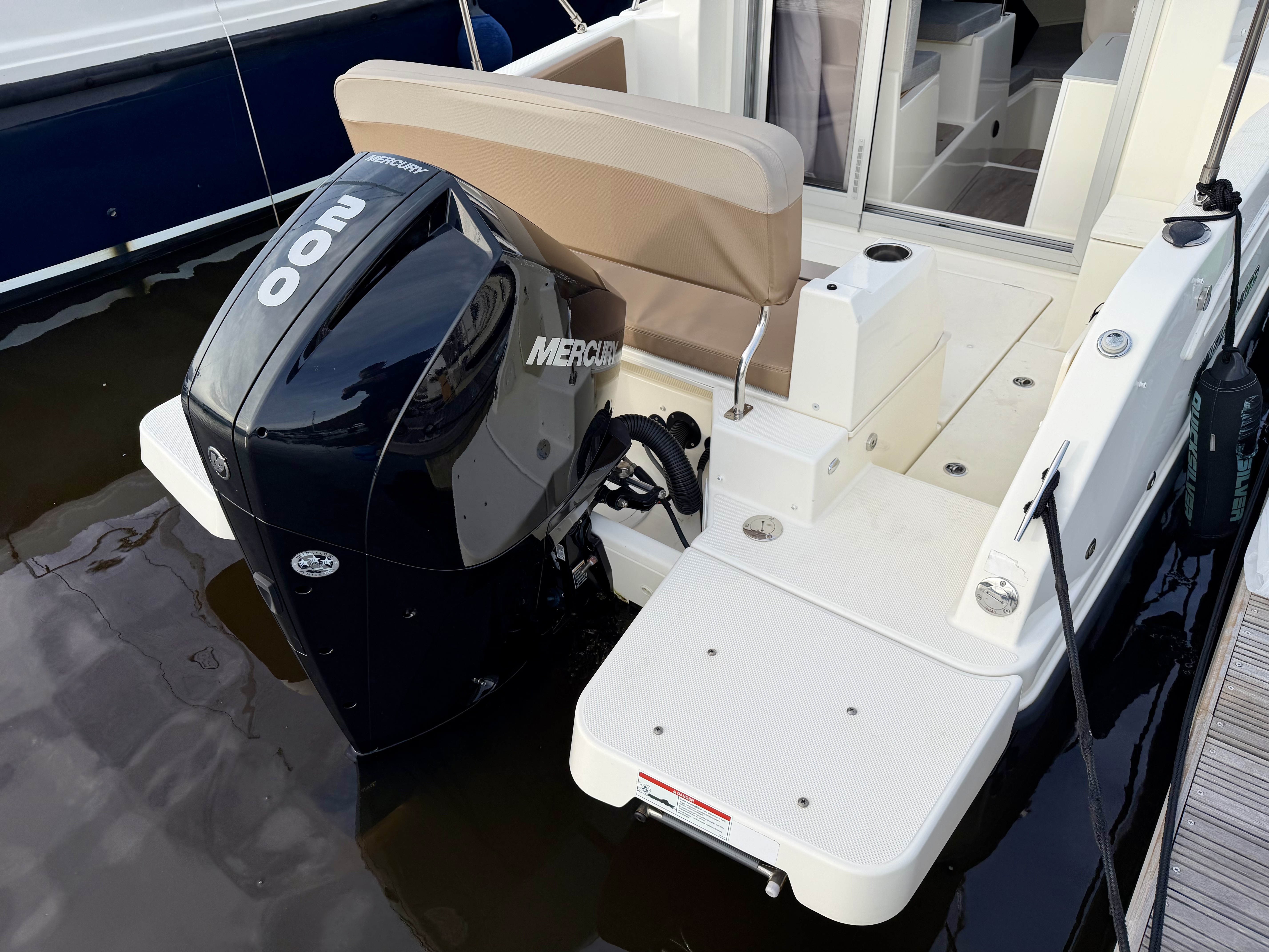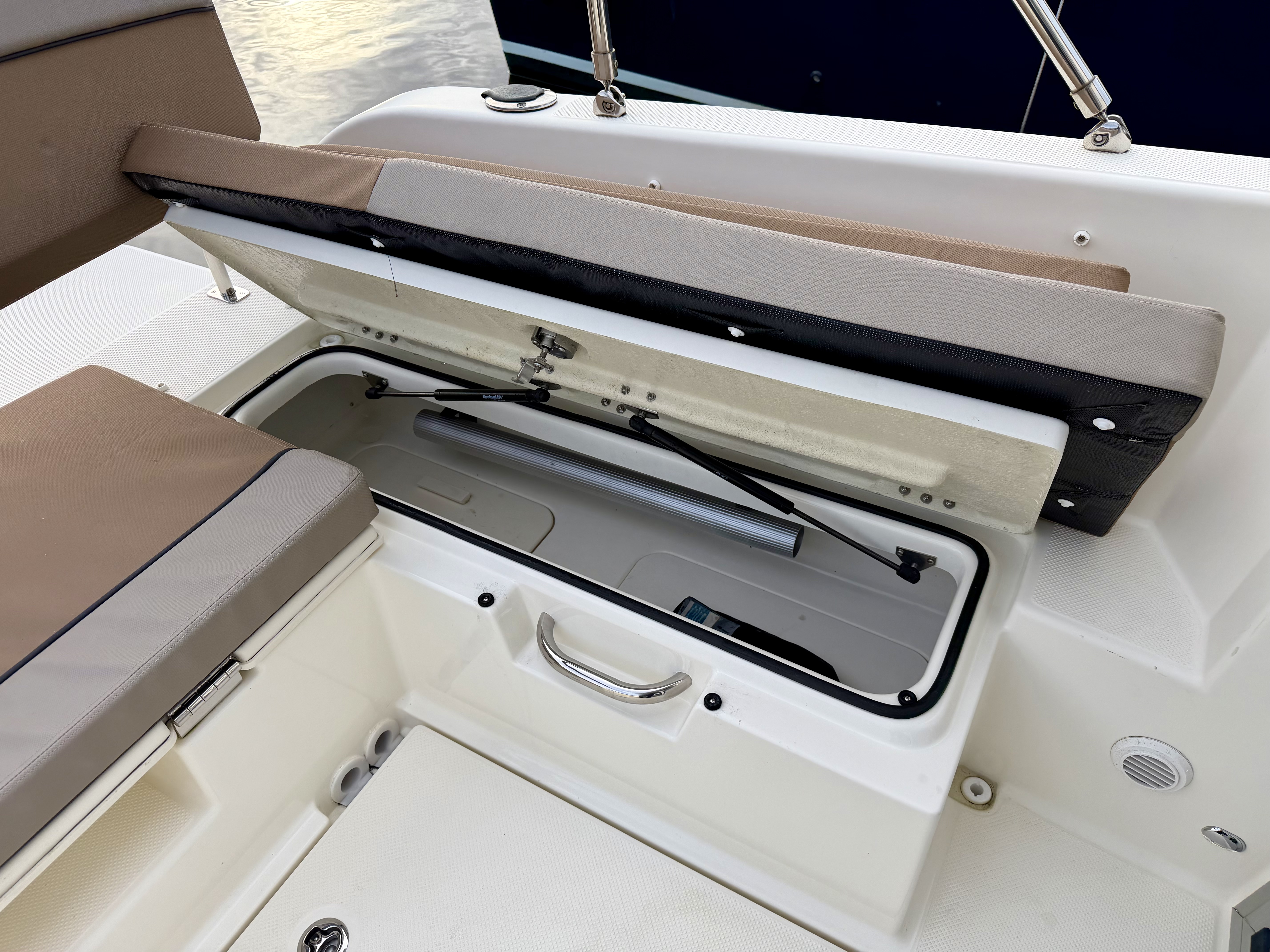 Externally, the cockpit offers plenty of space for relaxing or entertaining, with a cockpit table, cushioned seating, cup holders, and fishing rod holders for versatility. Stainless steel railings, navigation lights, and exterior lighting all add to the quality and safety of this capable cruiser. Additional highlights include an electric anchor windlass, bilge pumps, waste tank with pump-out, and a Fusion entertainment system with speakers for onboard enjoyment!