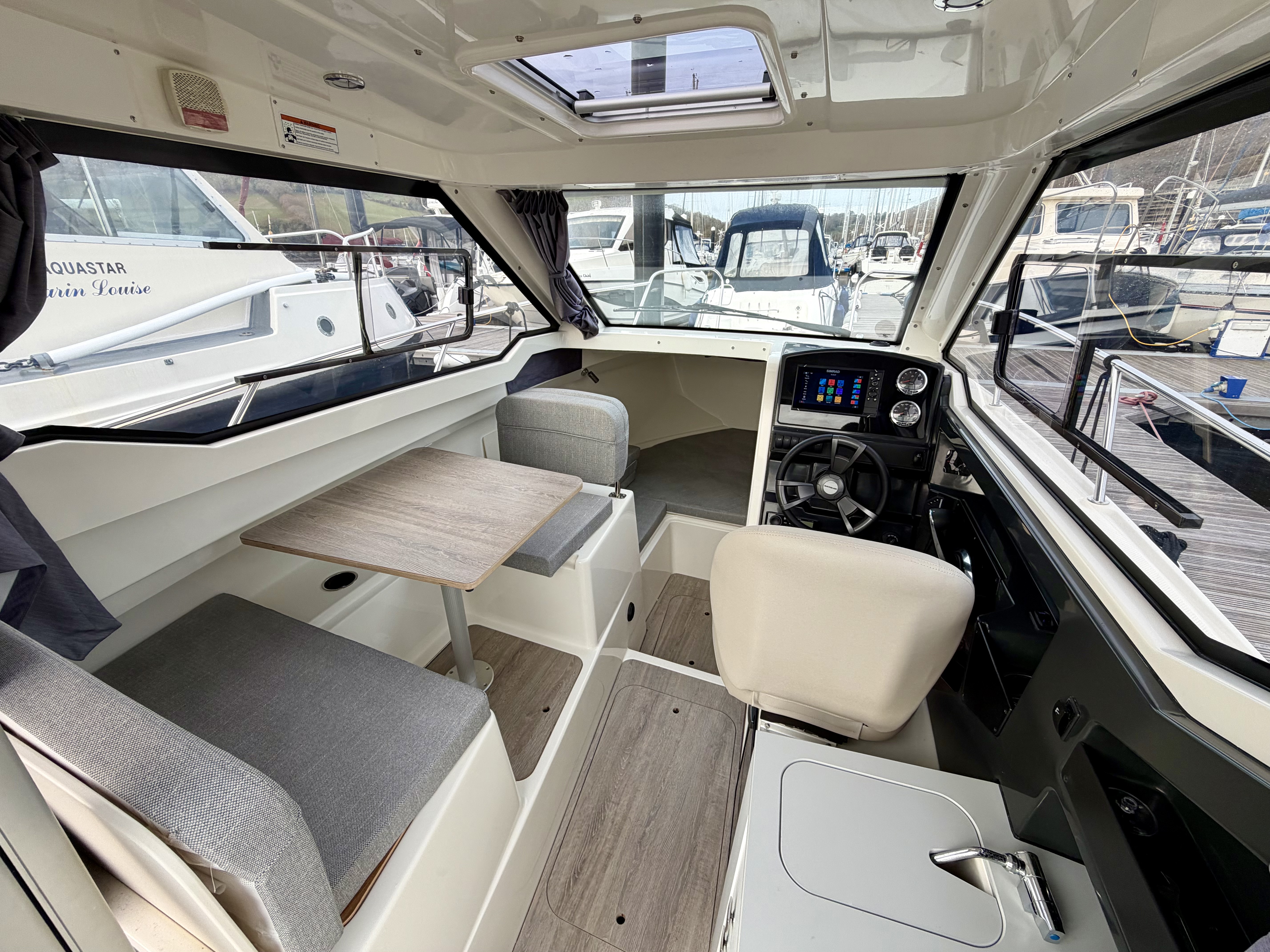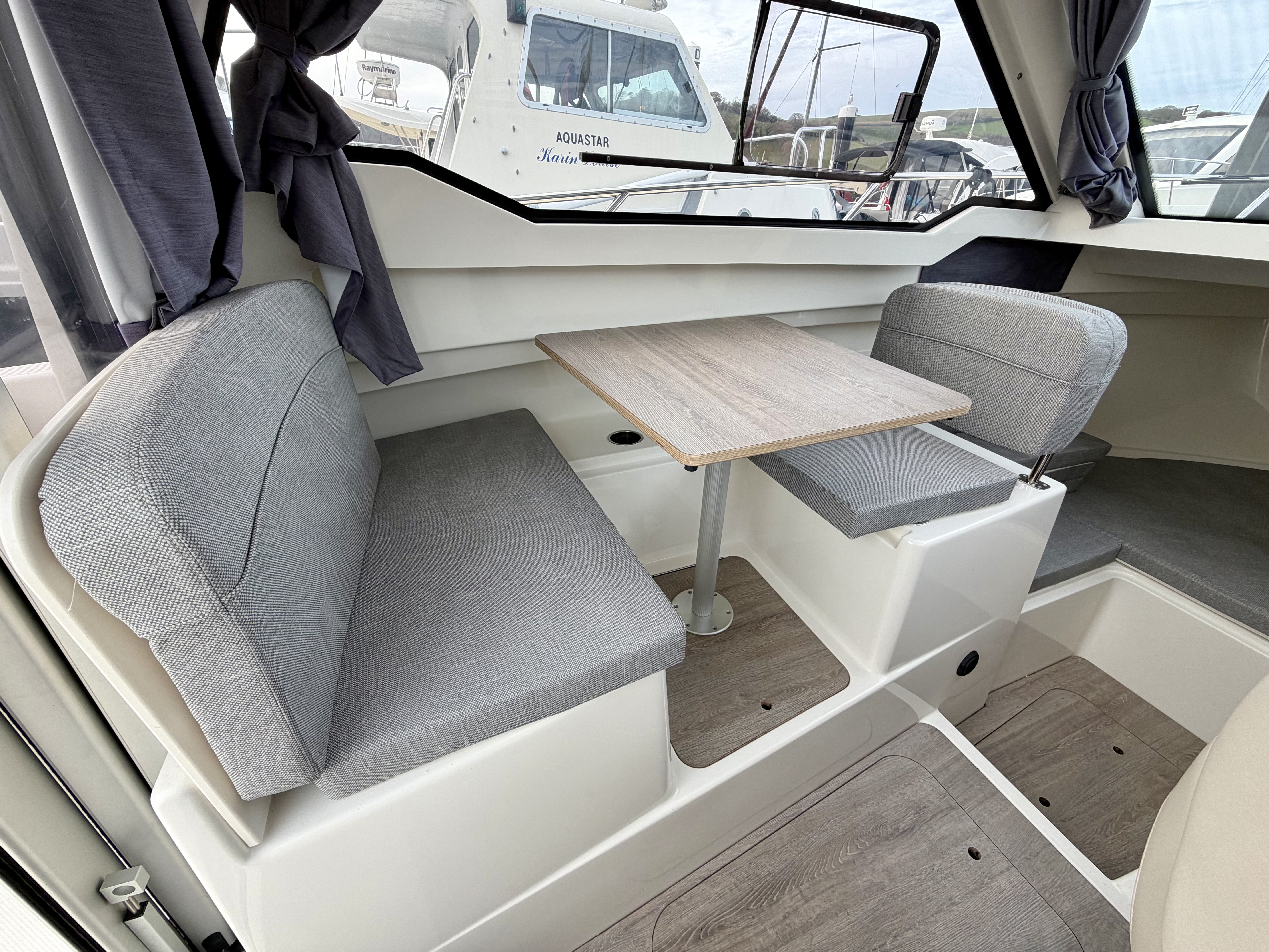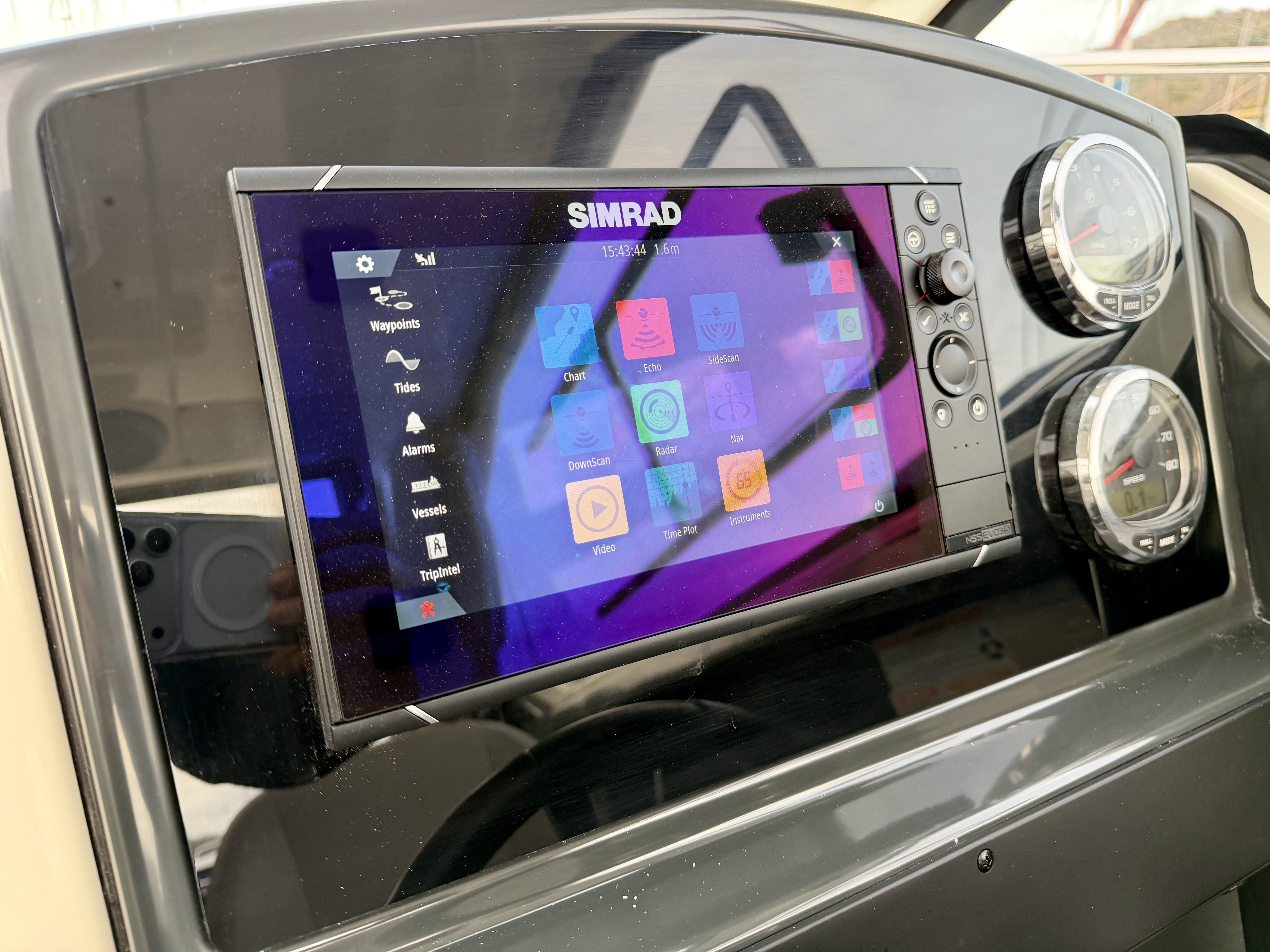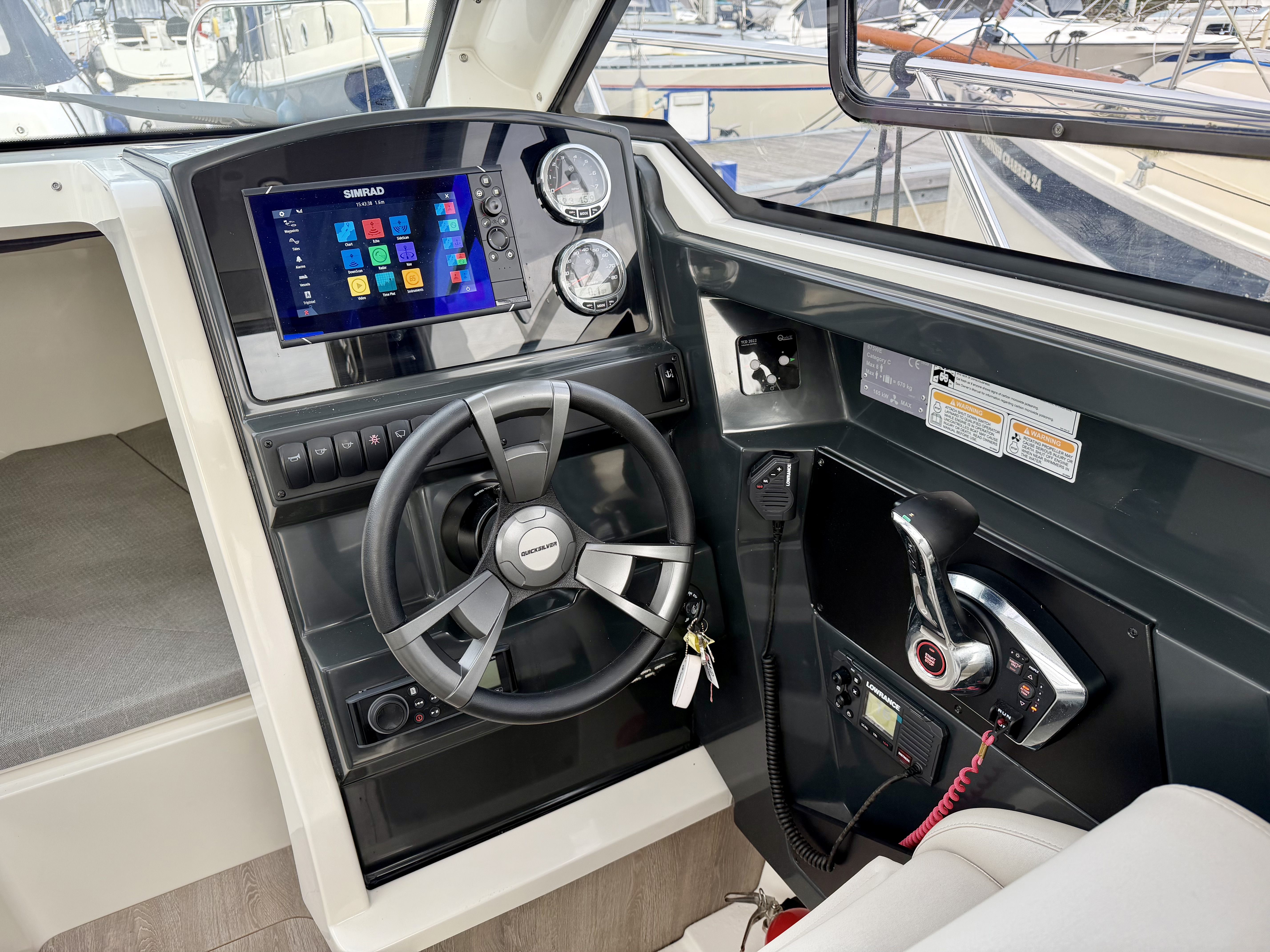 The helm area is well-appointed with a Simrad chartplotter, Lowrance VHF, Mercury engine dials, and a double USB charger, all complemented by a comfortable bolster seat for relaxed and confident navigation. The Webasto heating system and interior curtains ensure comfort on cooler days, while the manual opening roof hatch and full surround canvas covers provide flexibility whatever the weather!