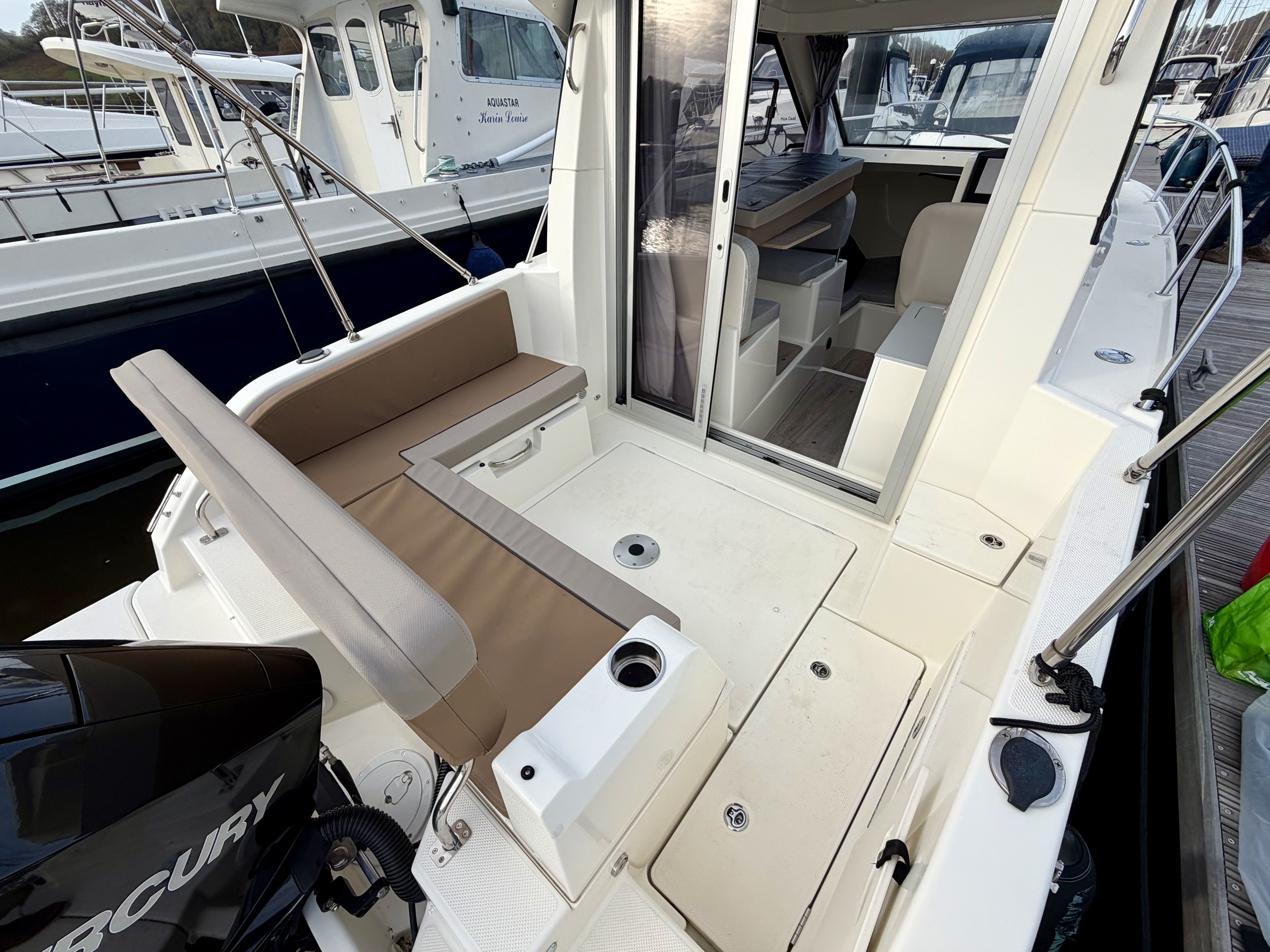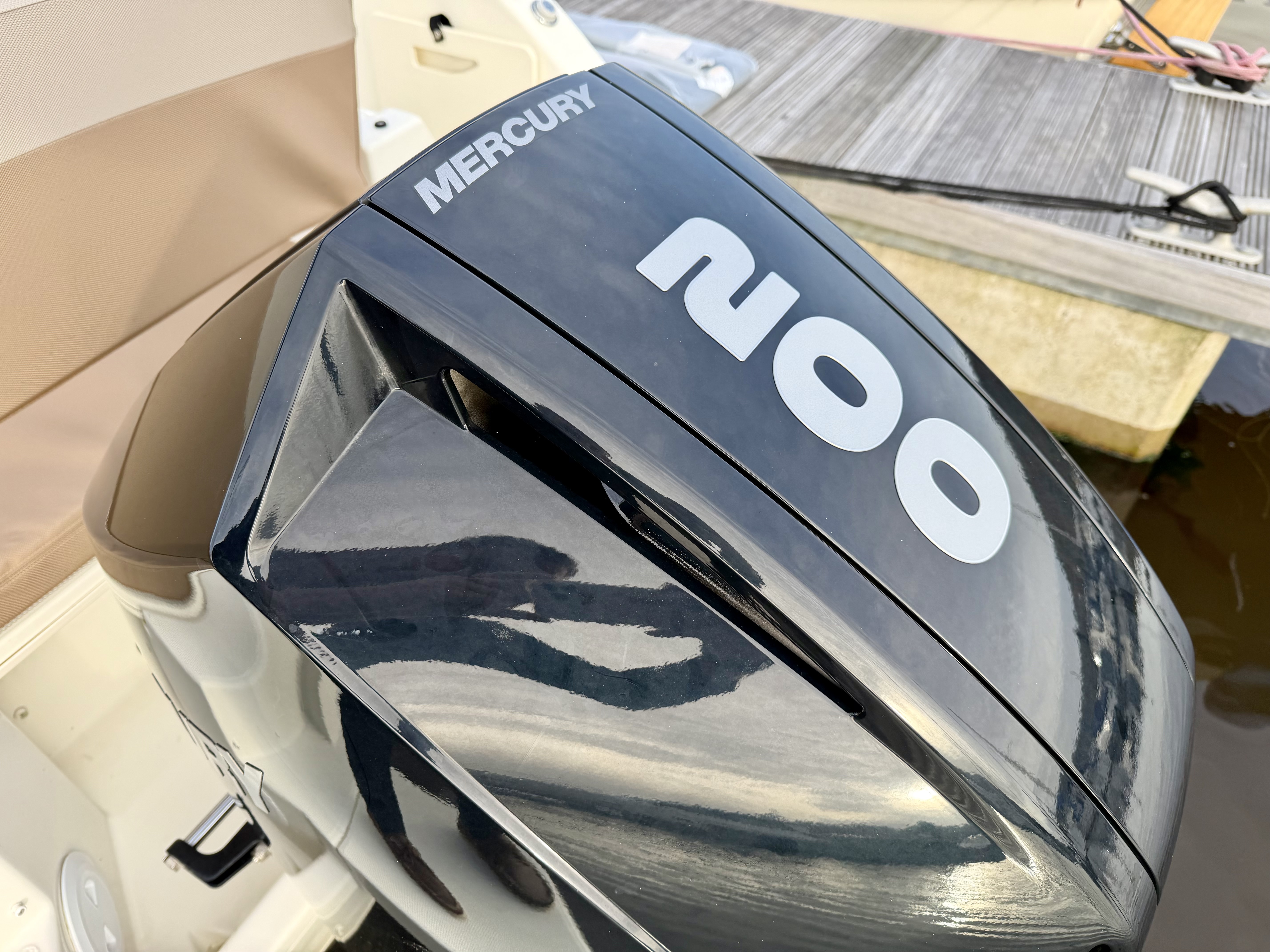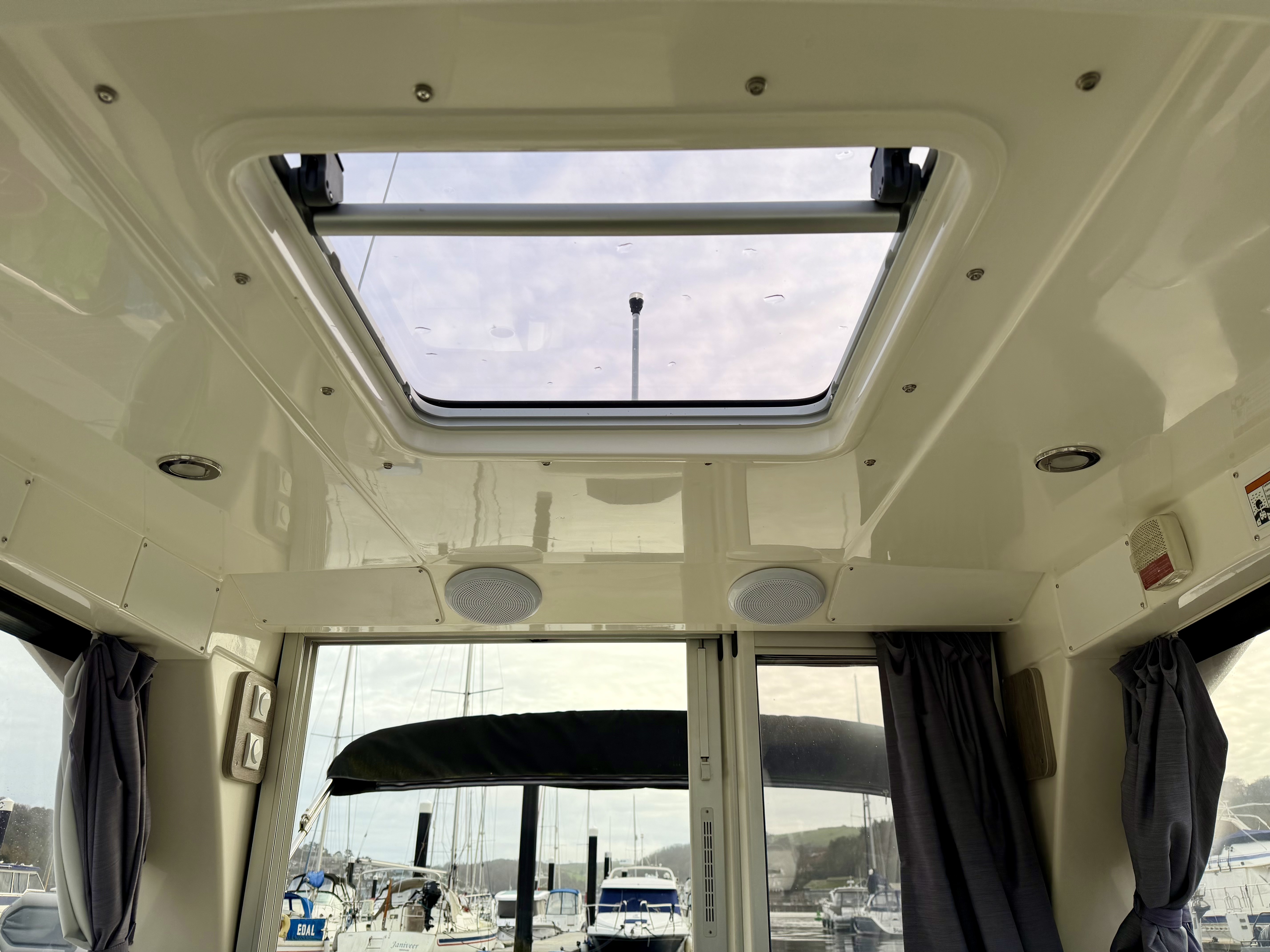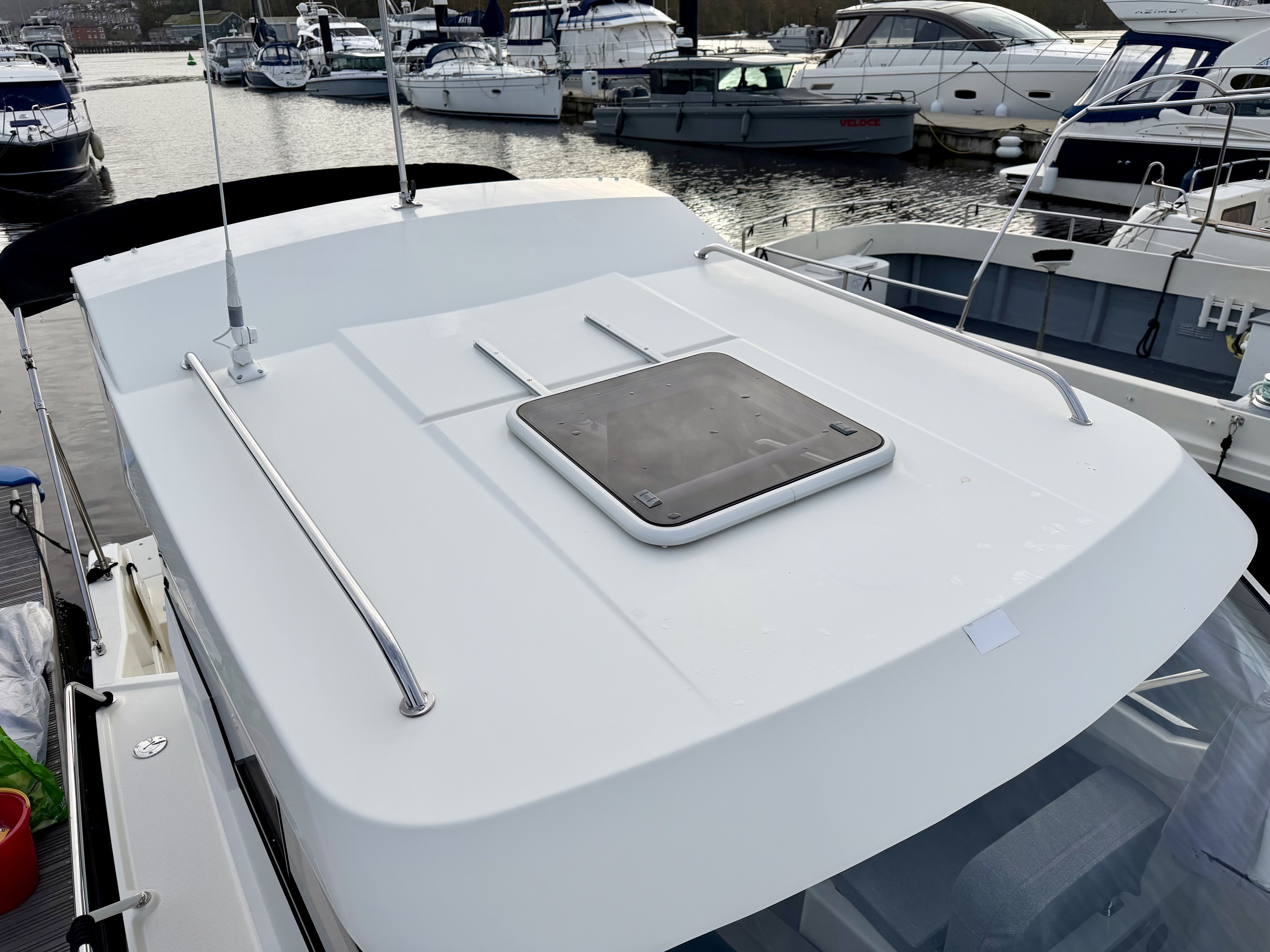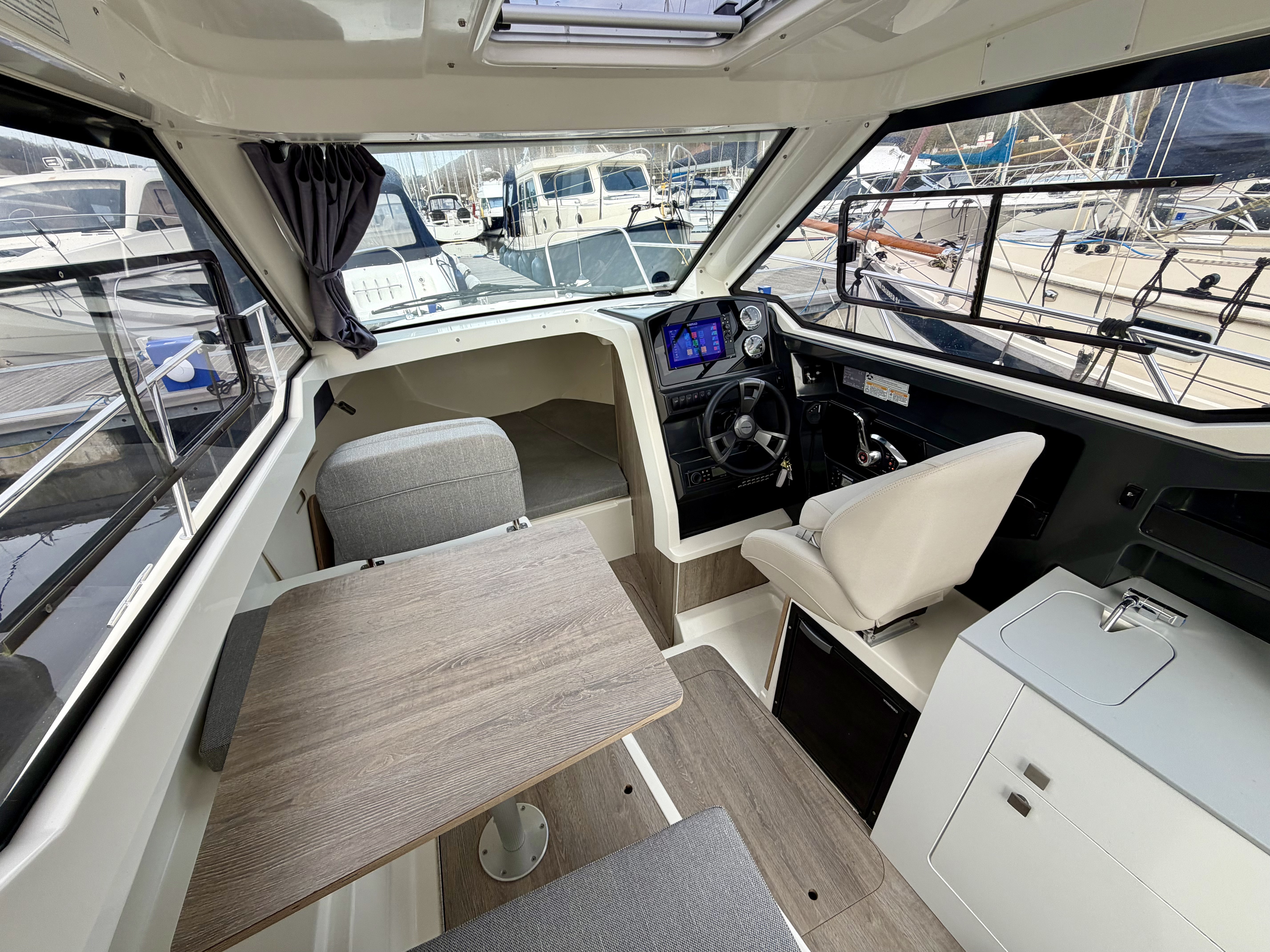 The helm area is well-appointed with a Simrad chartplotter, Lowrance VHF, Mercury engine dials, and a double USB charger, all complemented by a comfortable bolster seat for relaxed and confident navigation. The Webasto heating system and interior curtains ensure comfort on cooler days, while the manual opening roof hatch and full surround canvas covers provide flexibility whatever the weather!