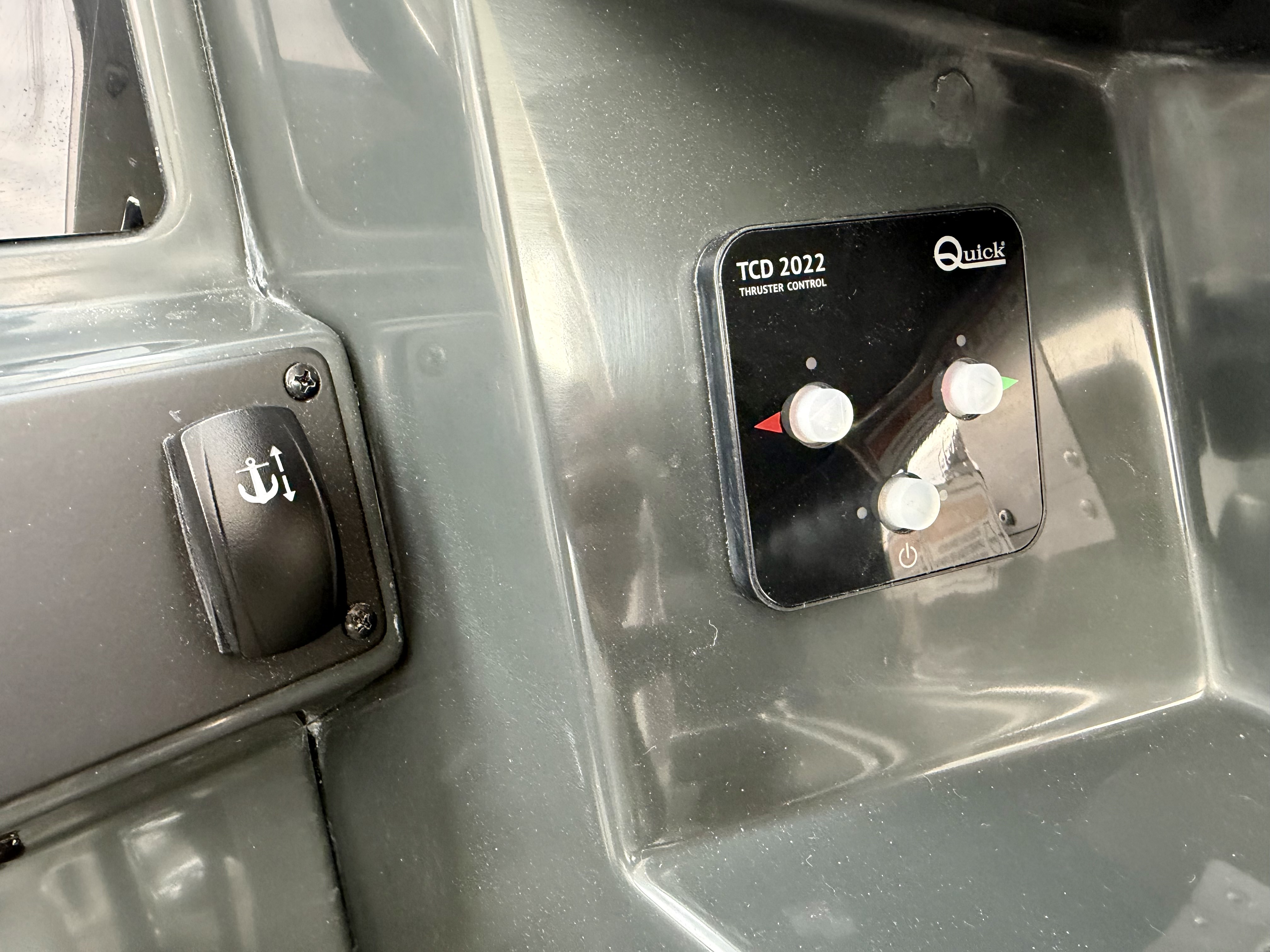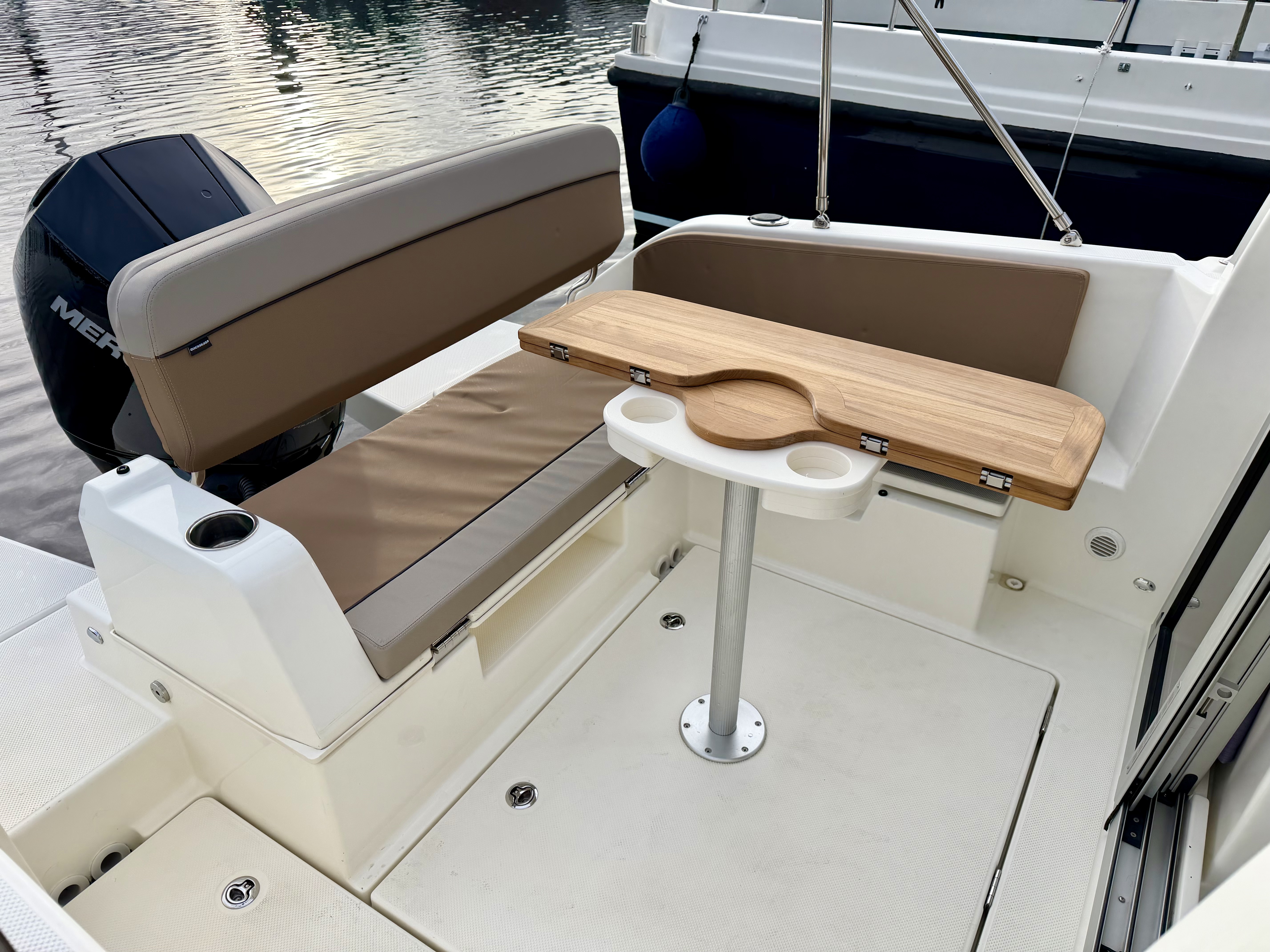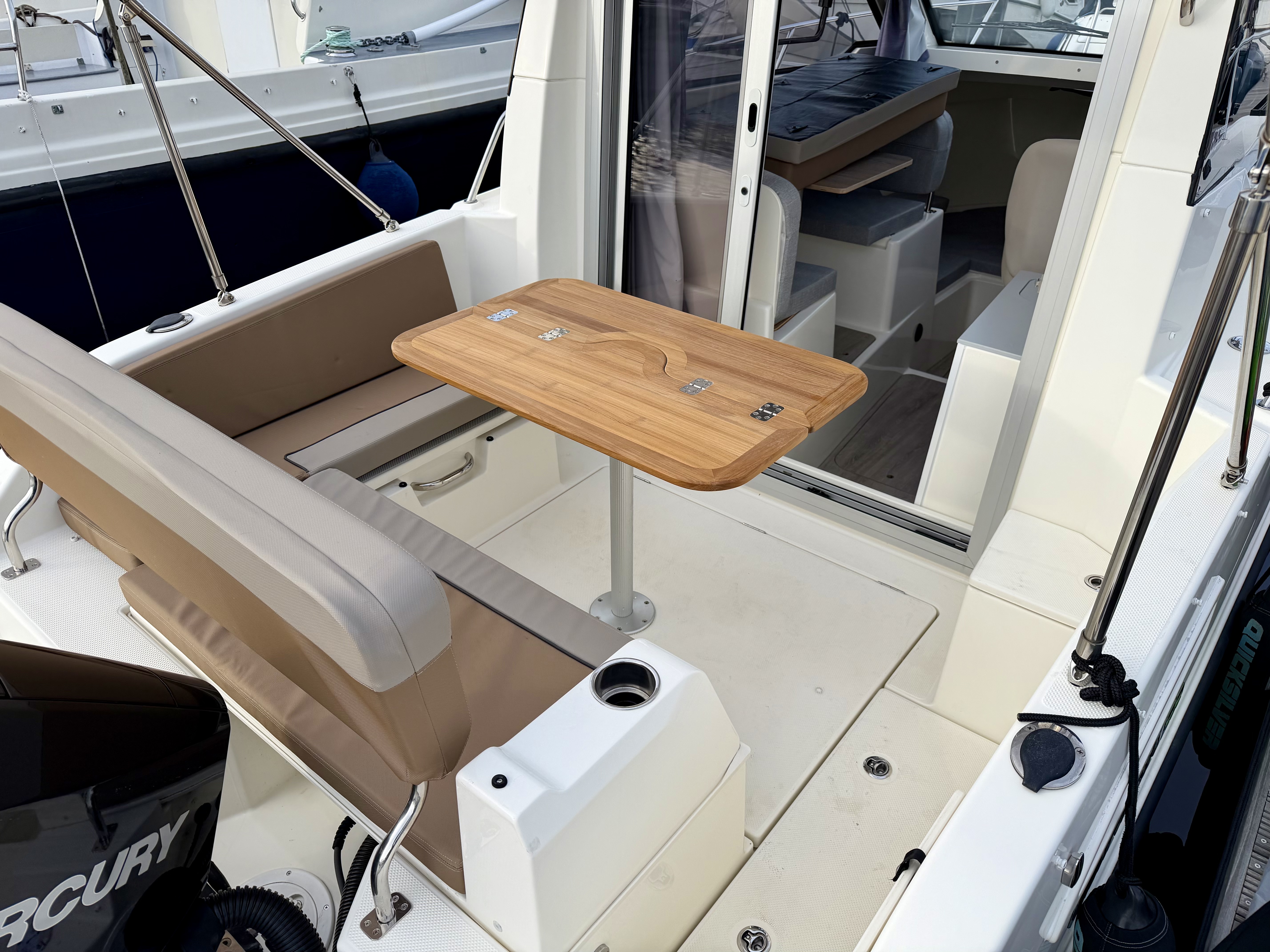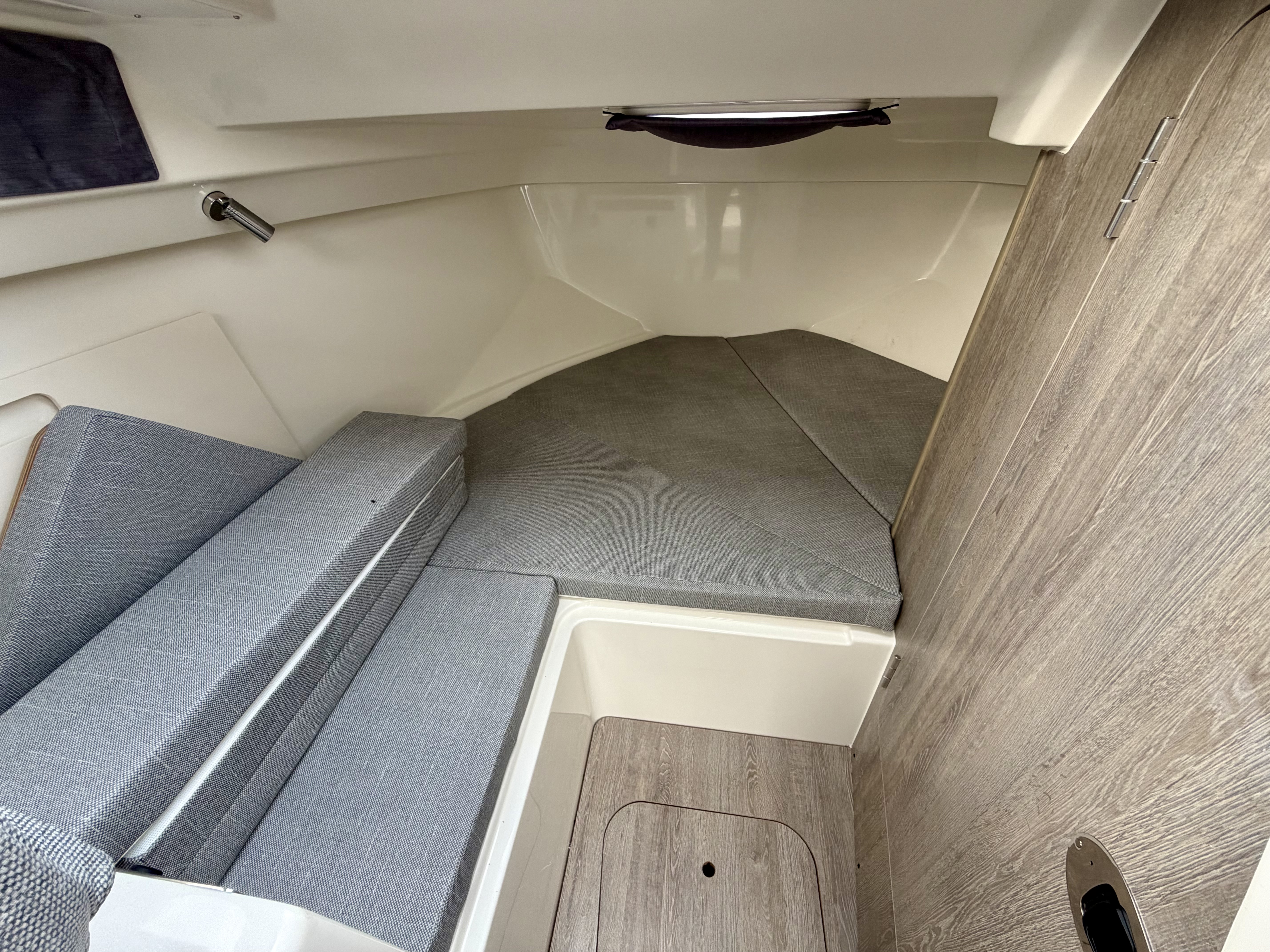 The helm area is well-appointed with a Simrad chartplotter, Lowrance VHF, Mercury engine dials, and a double USB charger, all complemented by a comfortable bolster seat for relaxed and confident navigation. The Webasto heating system and interior curtains ensure comfort on cooler days, while the manual opening roof hatch and full surround canvas covers provide flexibility whatever the weather!