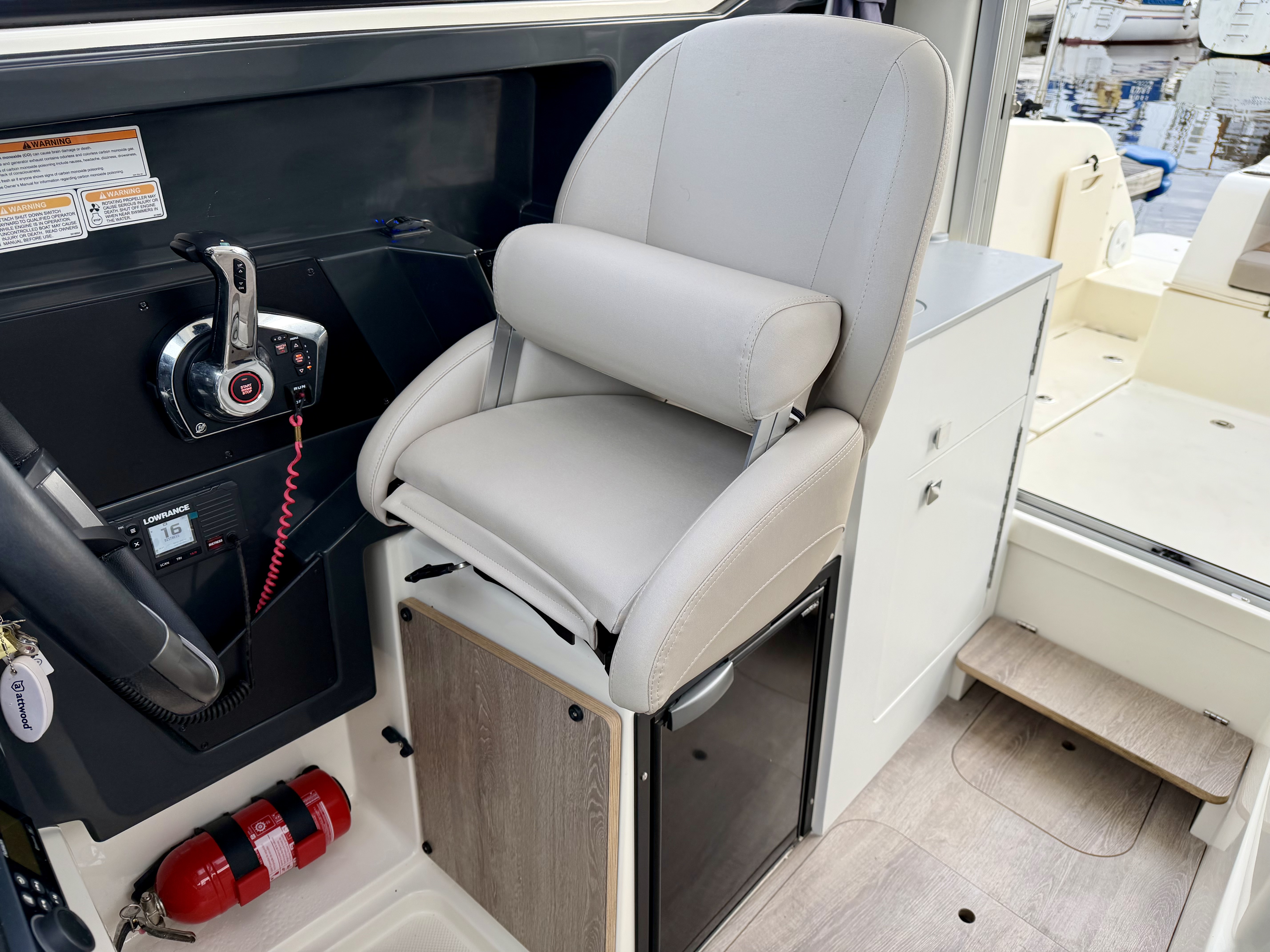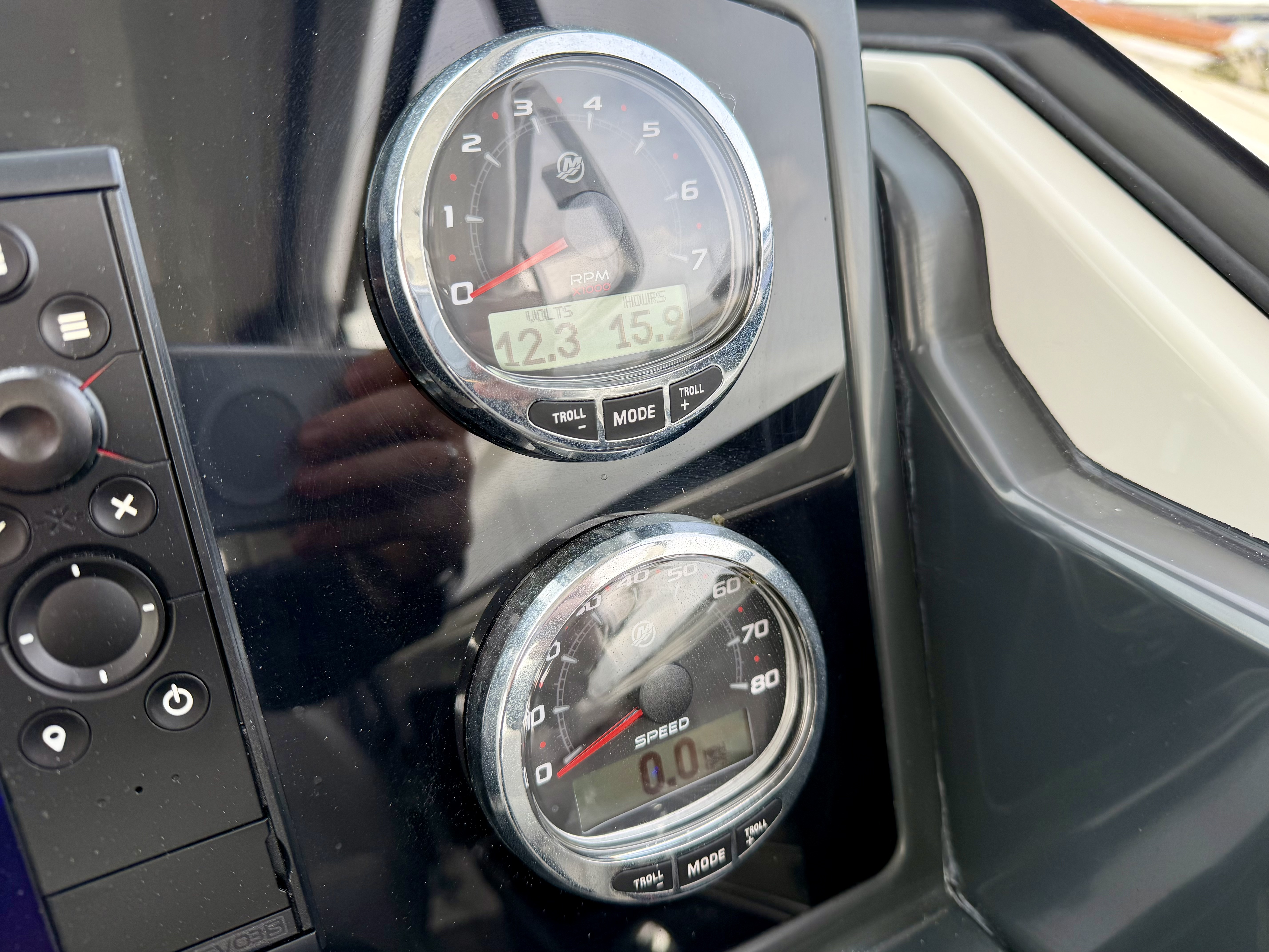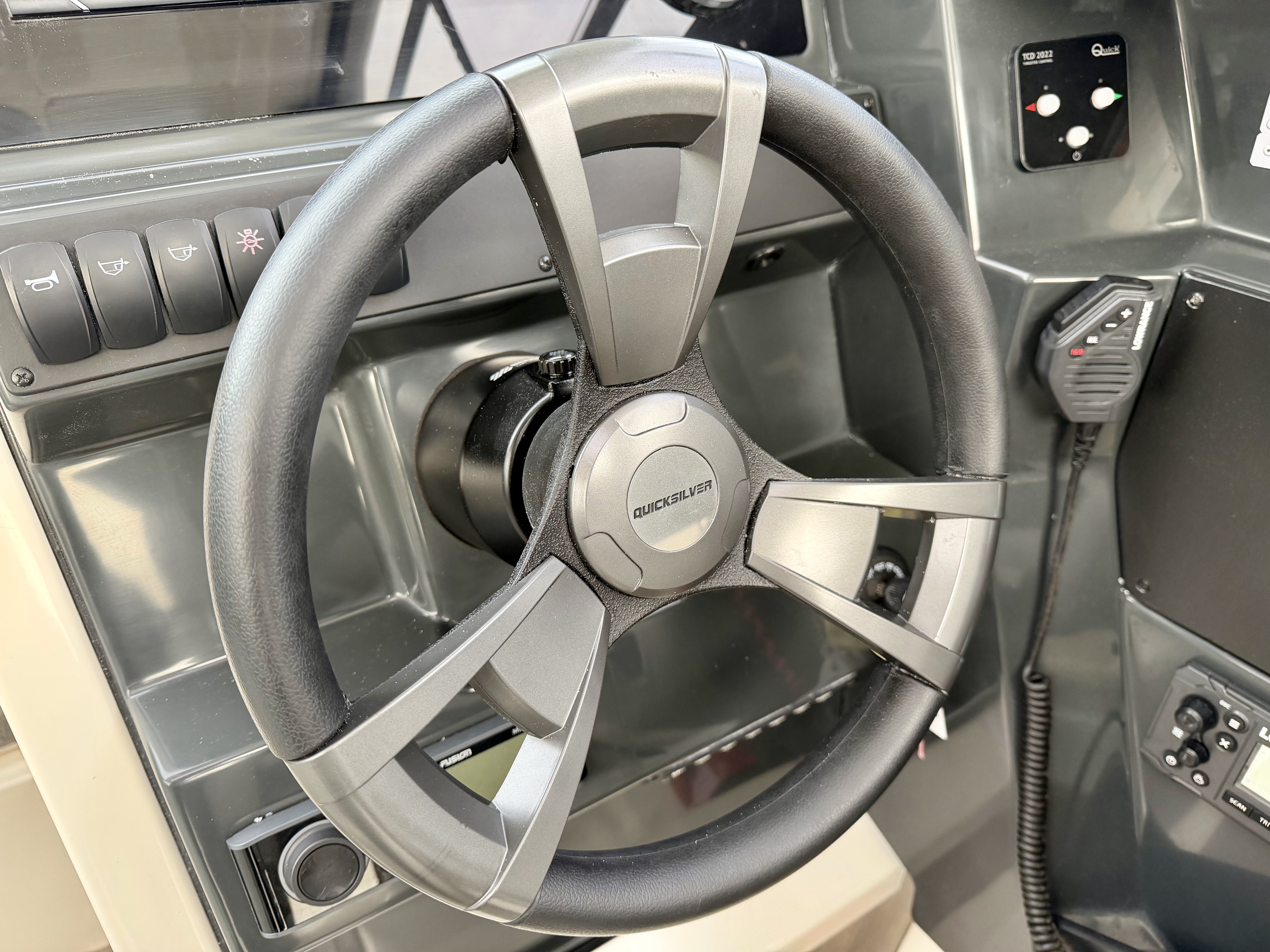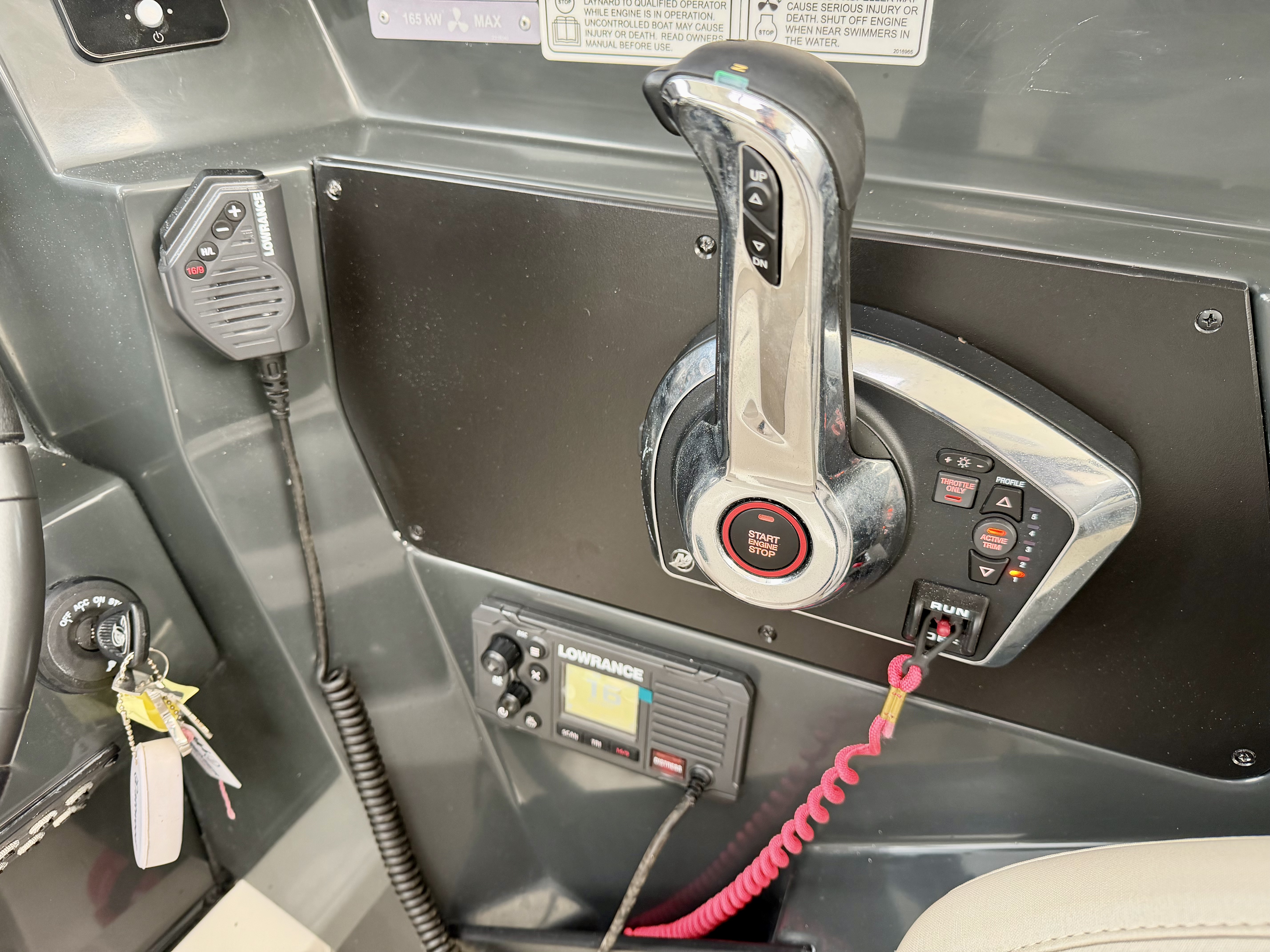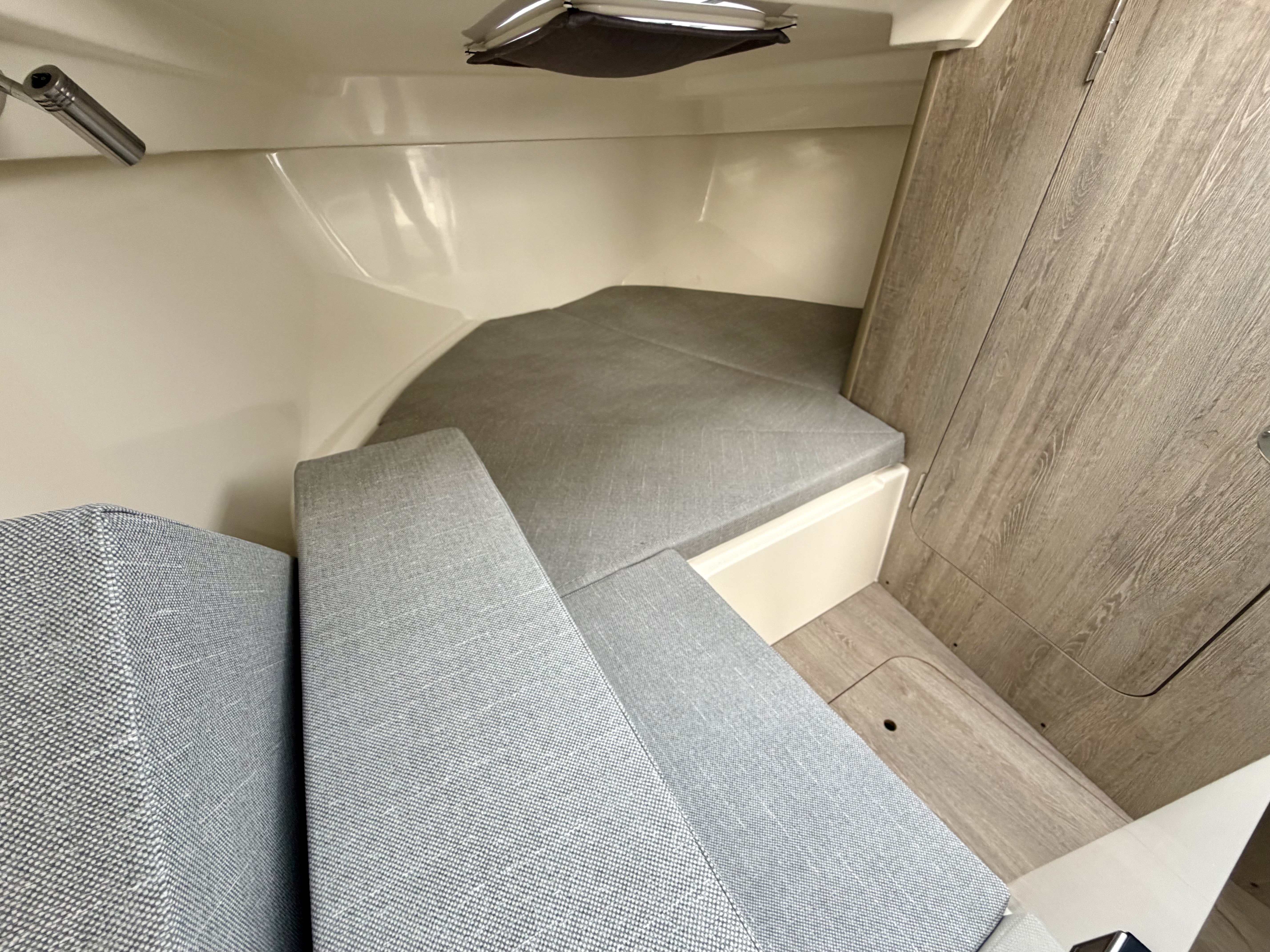 The helm area is well-appointed with a Simrad chartplotter, Lowrance VHF, Mercury engine dials, and a double USB charger, all complemented by a comfortable bolster seat for relaxed and confident navigation. The Webasto heating system and interior curtains ensure comfort on cooler days, while the manual opening roof hatch and full surround canvas covers provide flexibility whatever the weather!