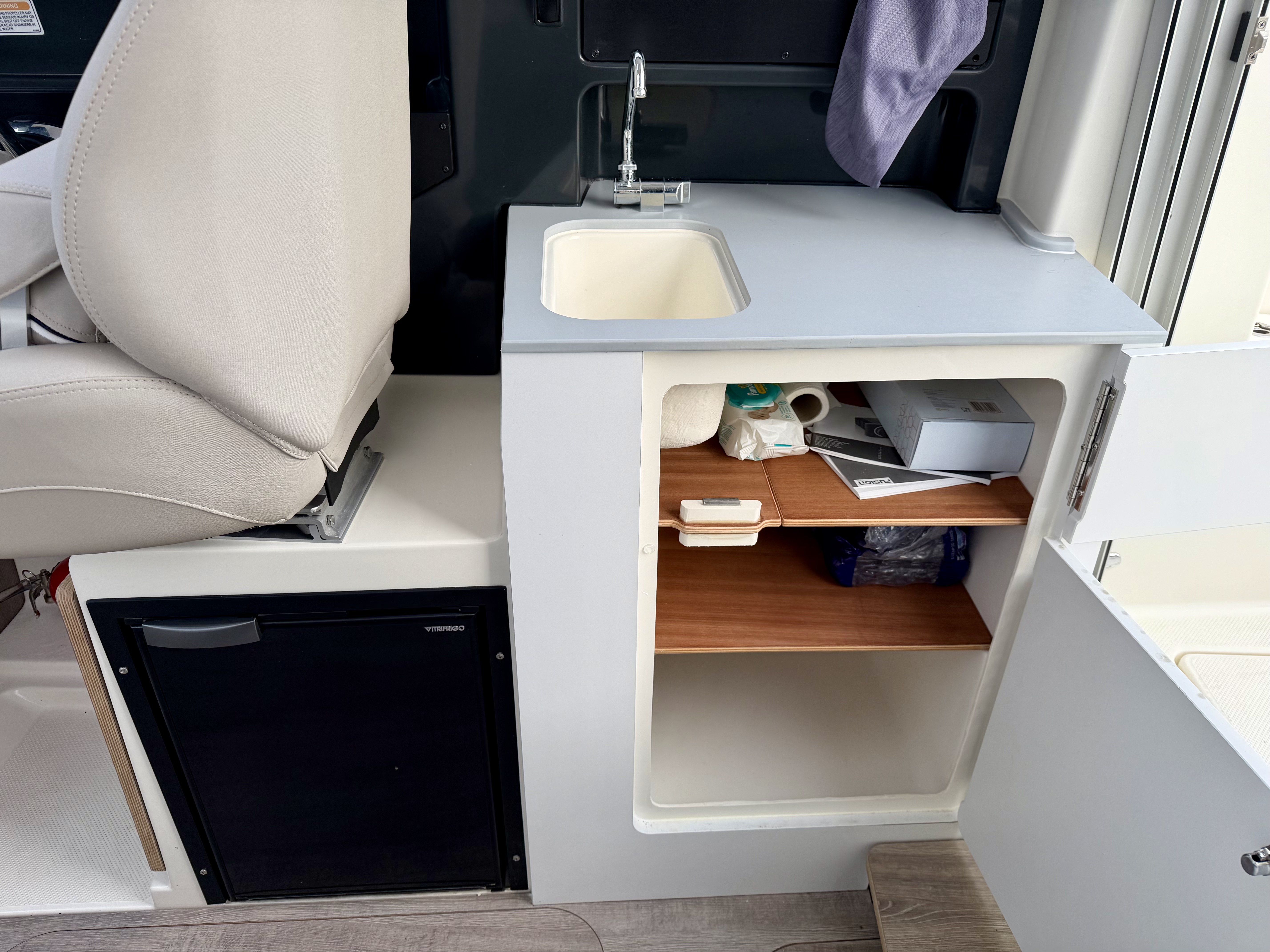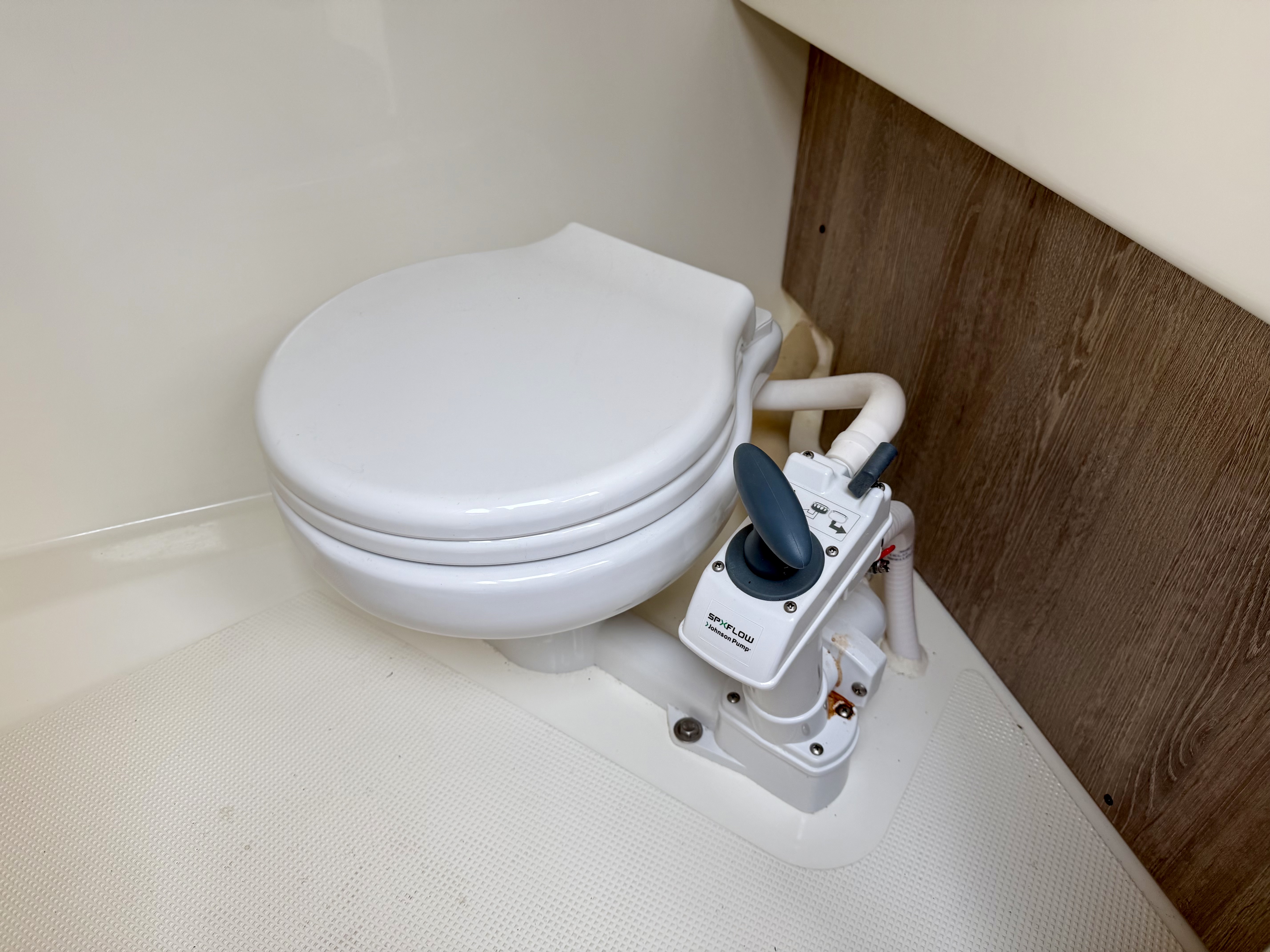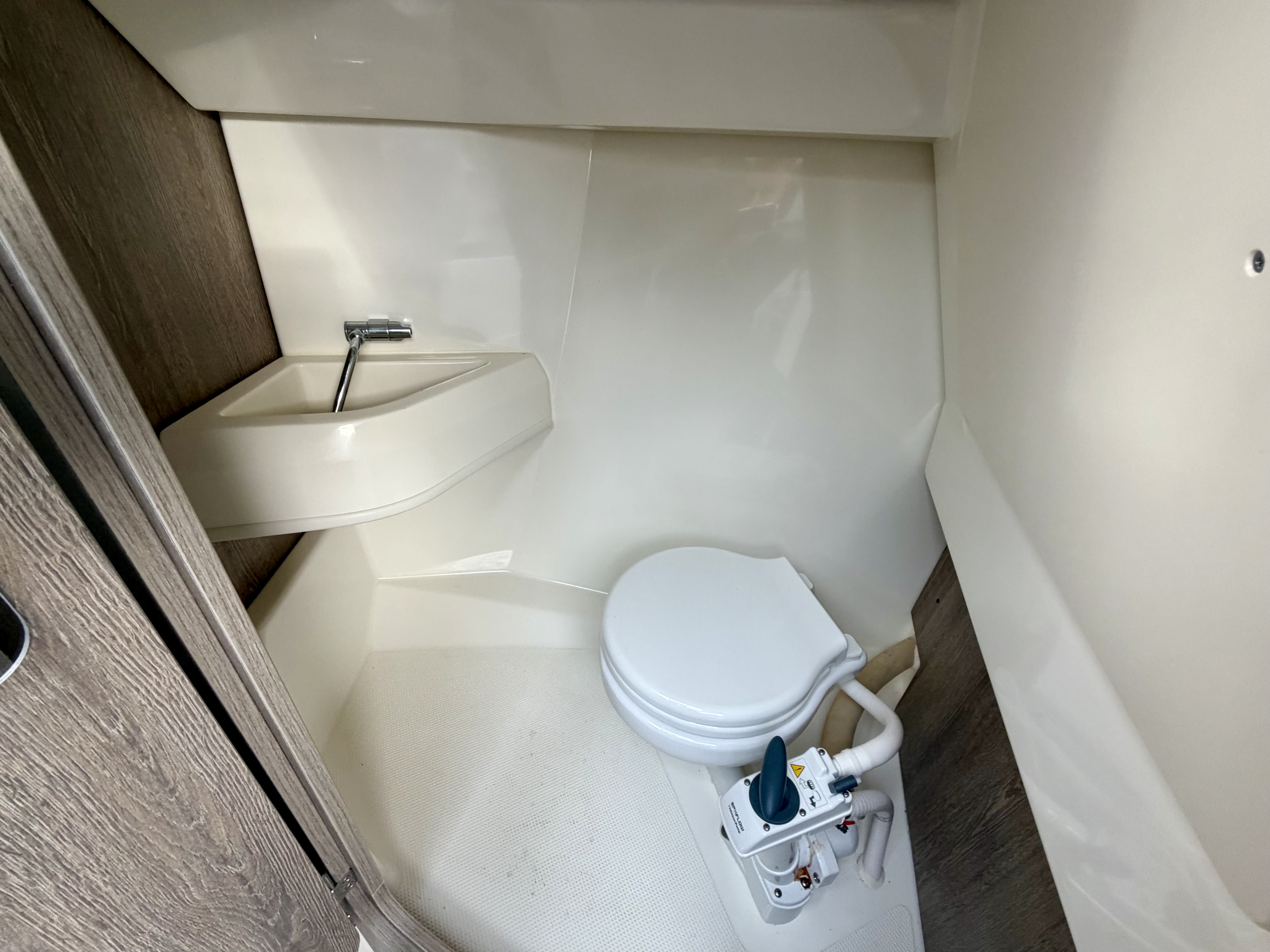 On board, the layout is designed for both day cruising and overnight stays, with a comfortable saloon that converts into a berth using in-fill cushions and a manual toilet in the enclosed heads compartment. The galley is neatly equipped with a sink and tap, refrigerator, and ample storage, making it easy to enjoy weekends away on the water!