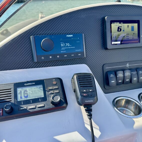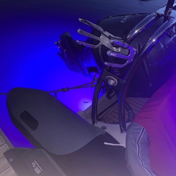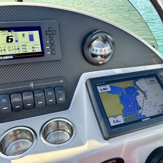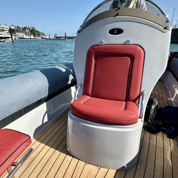 The S785 strikes an excellent balance between high-performance handling and practical comfort for family days out or coastal cruising. The layout includes twin reversible helm bolster seats, a sociable aft bench and removable table, and a forward bow seating area with infill cushion. There’s ample storage onboard and thoughtful features such as a stainless steel ski pole, an integrated A-frame with nav lights, a Garmin chartplotter, Fusion stereo system, and a VHF radio!