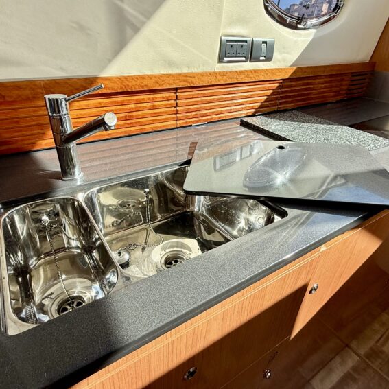 Inside, the layout is designed with comfort and practicality in mind. Light and airy living spaces complement well-appointed cabins, offering comfortable accommodation for family and friends whether for weekends away or longer cruising adventures. Her generous fuel and freshwater capacities give her excellent range and independence, perfect for exploring the English Riviera, the South West coastline, or further afield!