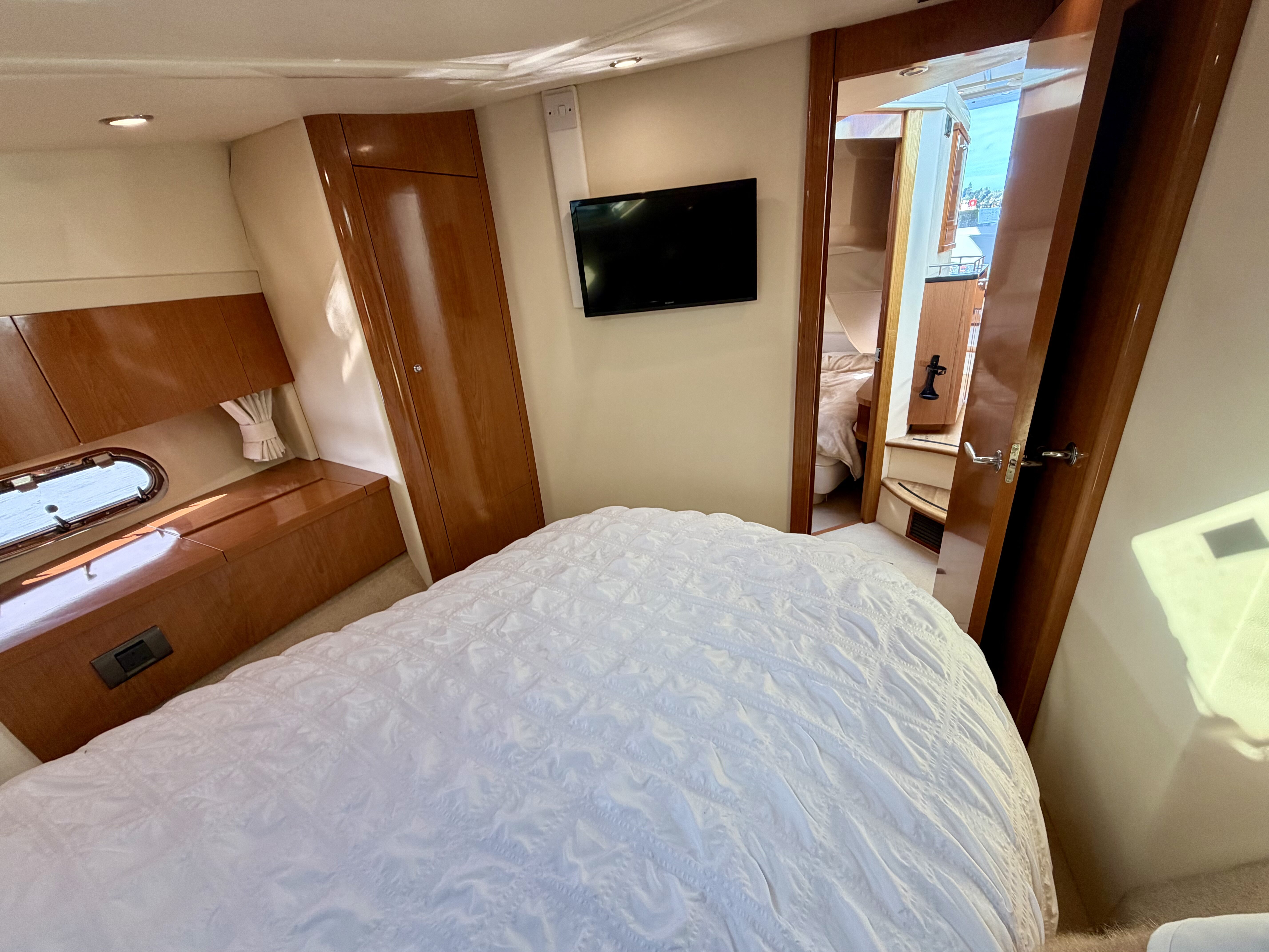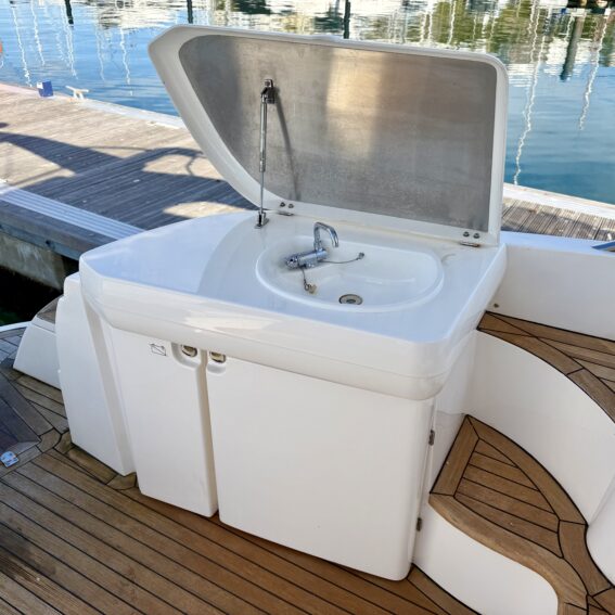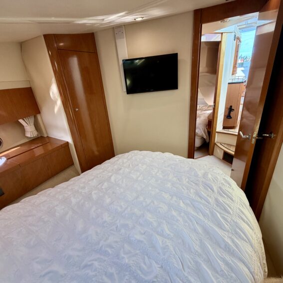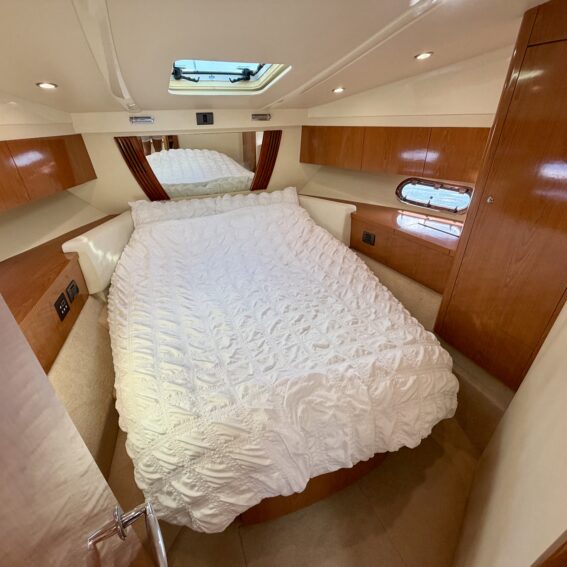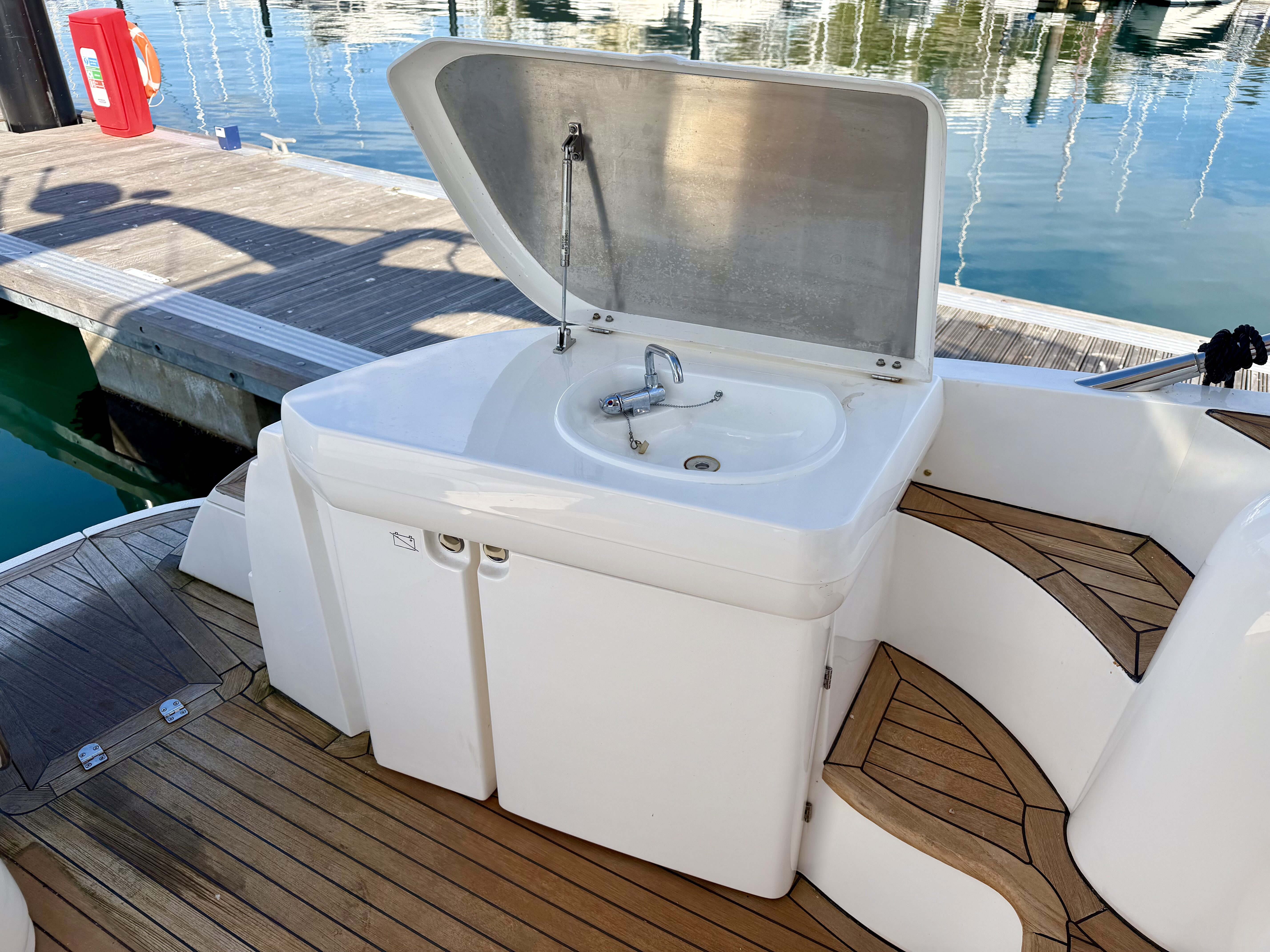 The Sealine F42/5 is renowned for its clever design and luxurious touches, and this example is no exception. Her spacious flybridge provides an excellent vantage point and is equipped with a wet bar and generous seating, creating an ideal space for entertaining and enjoying the open air. The innovative extended cockpit system (SECS) allows the transom to slide back, creating additional cockpit space when you want it most, while teak finishes throughout add to the sense of quality and refinement!