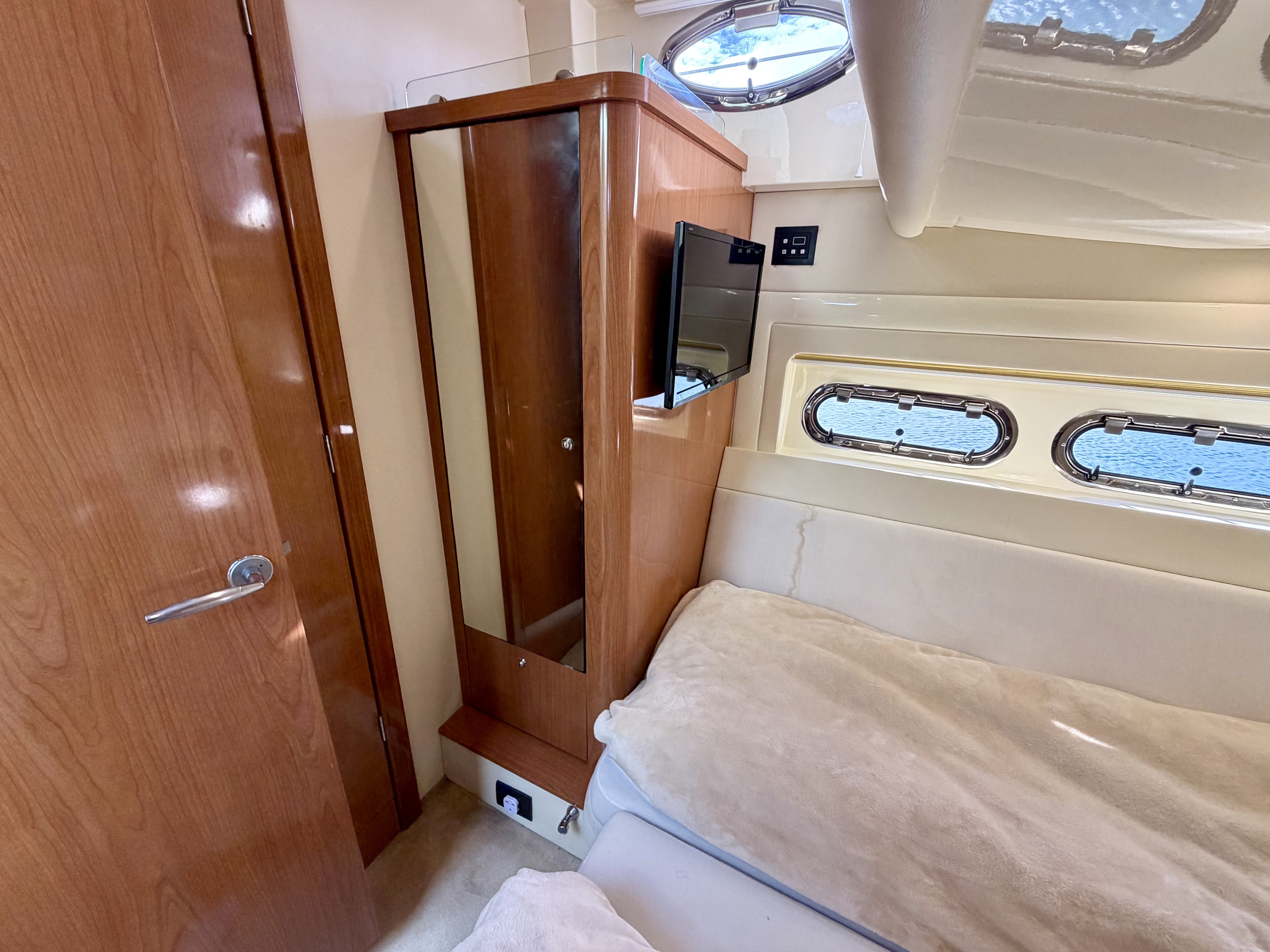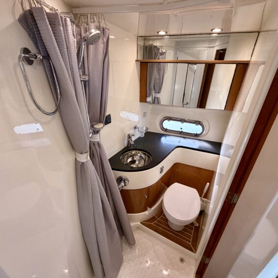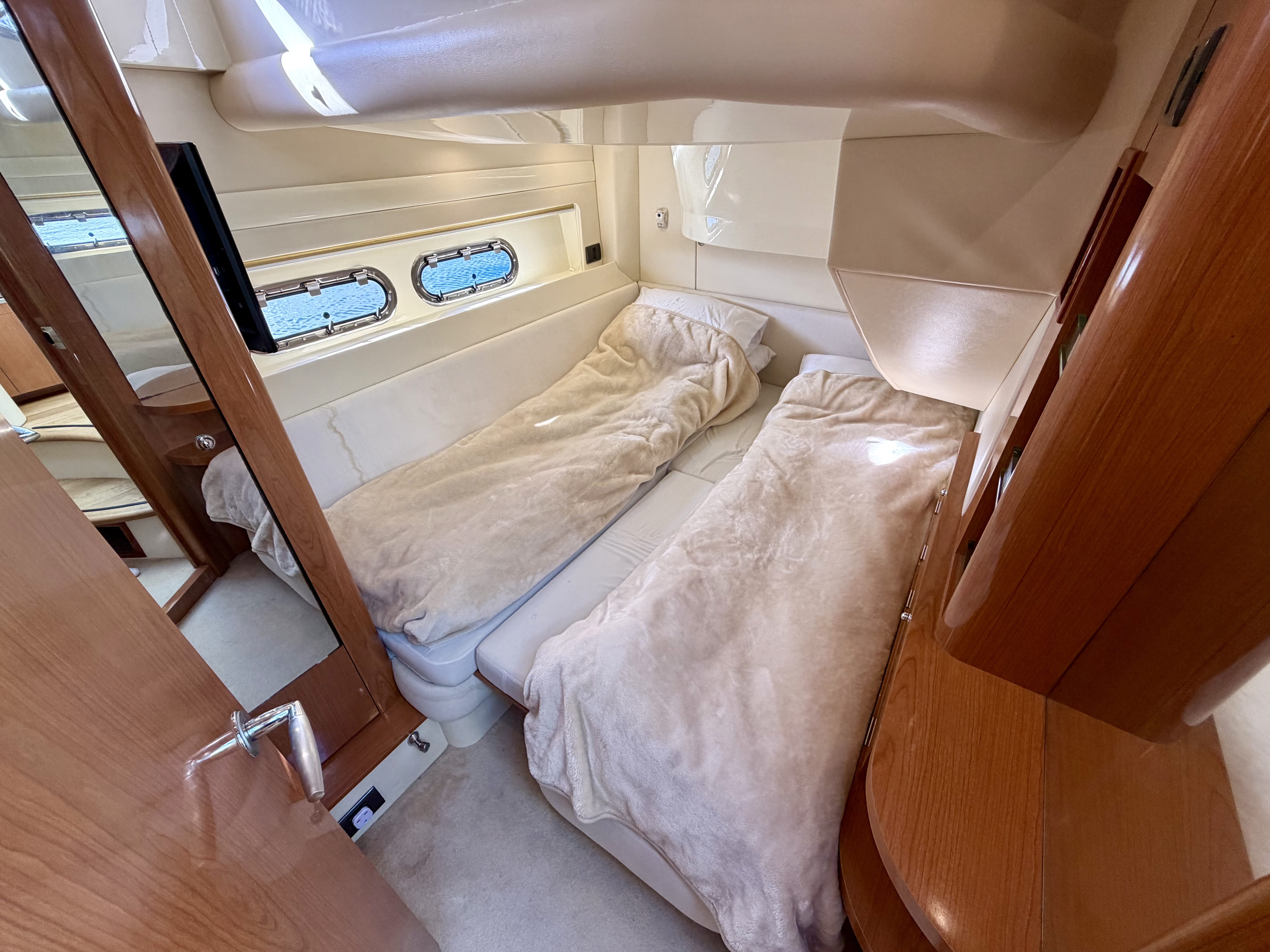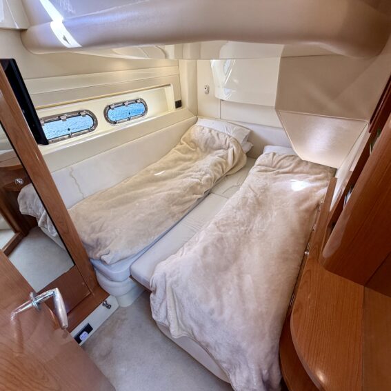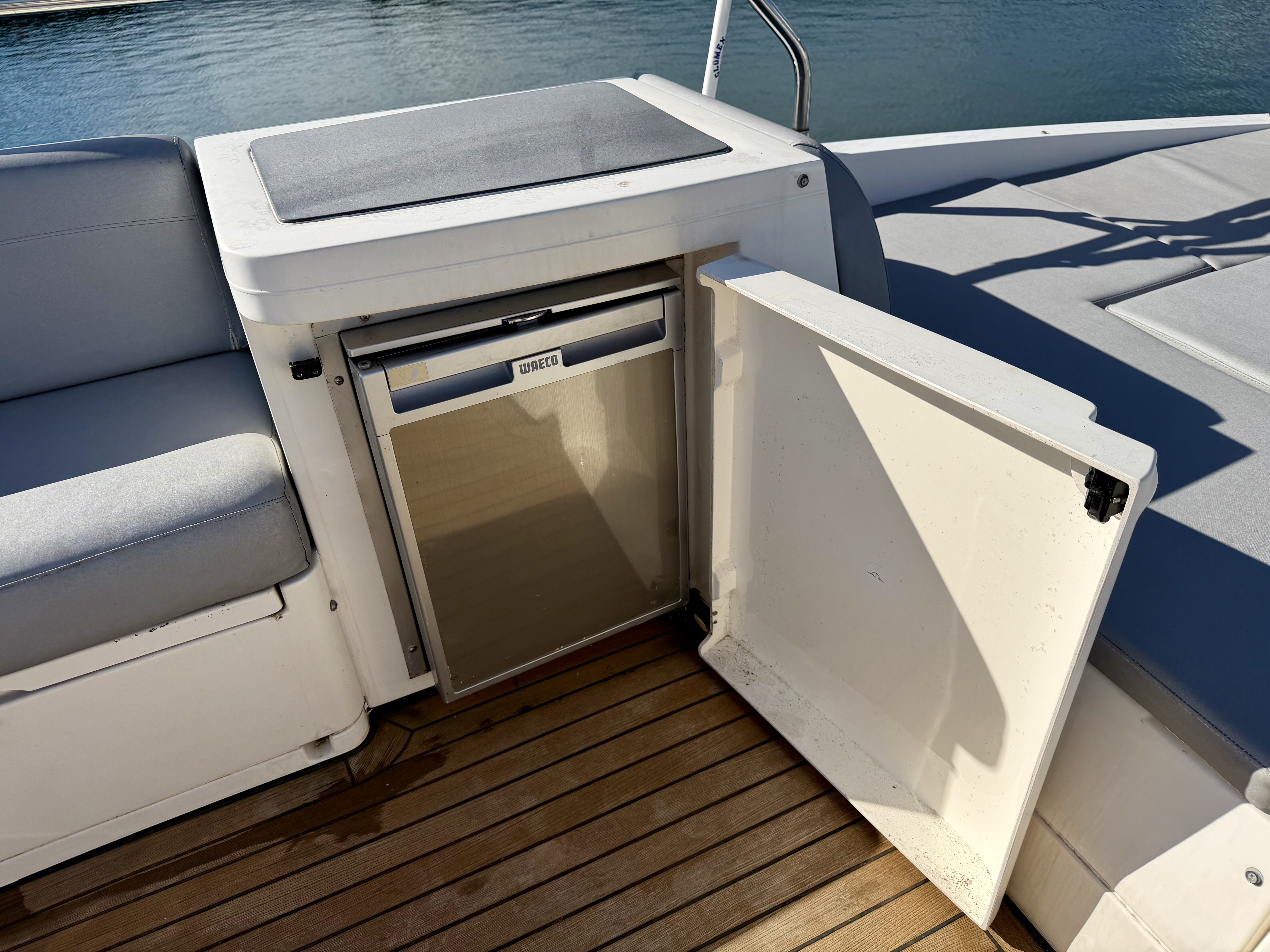 The Sealine F42/5 is renowned for its clever design and luxurious touches, and this example is no exception. Her spacious flybridge provides an excellent vantage point and is equipped with a wet bar and generous seating, creating an ideal space for entertaining and enjoying the open air. The innovative extended cockpit system (SECS) allows the transom to slide back, creating additional cockpit space when you want it most, while teak finishes throughout add to the sense of quality and refinement!