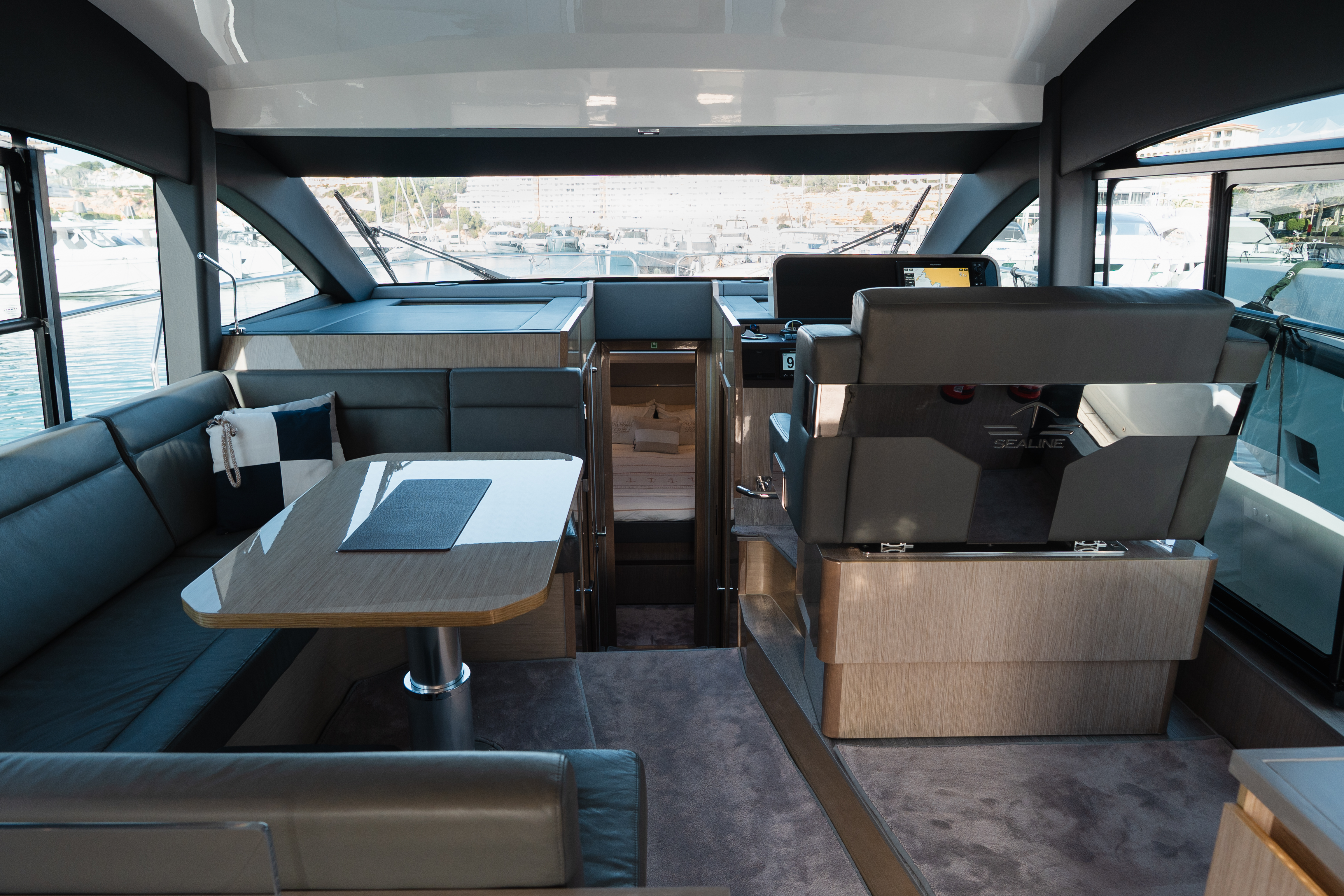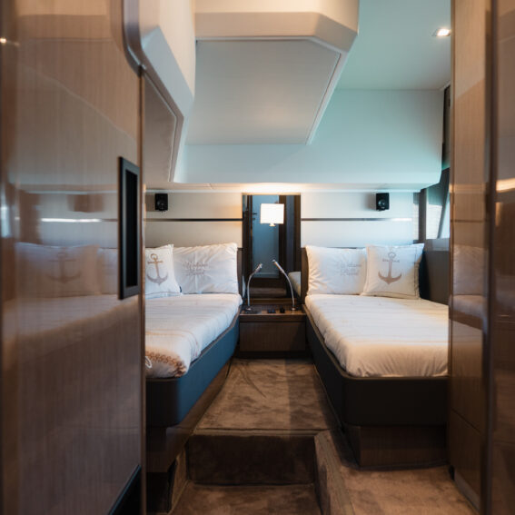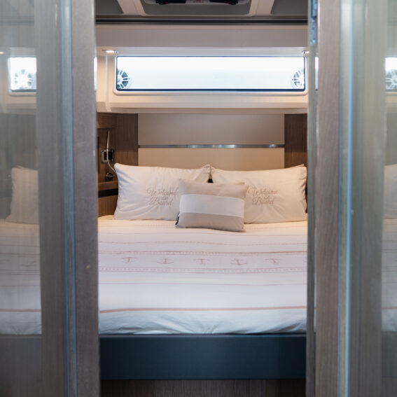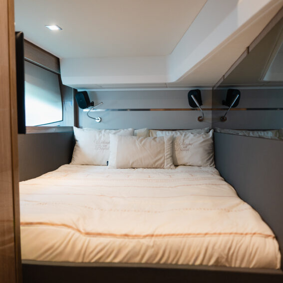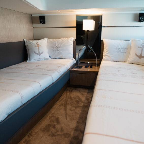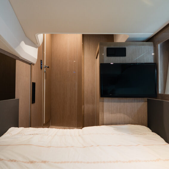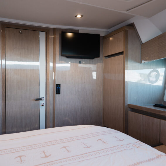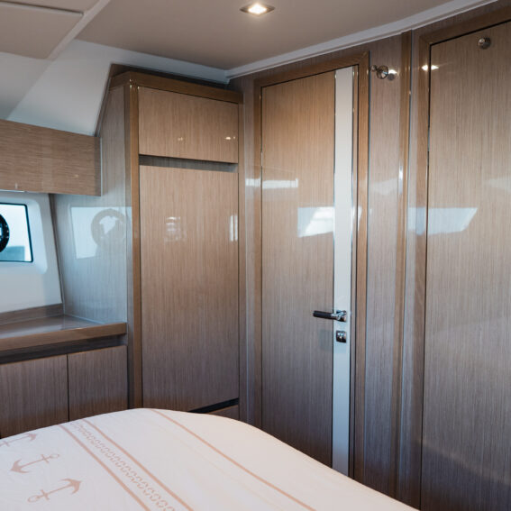 The Sealine F430 impresses with a smartly designed layout featuring three cabins and two bathrooms, offering the ideal balance between privacy and sociable living. The spacious master cabin amidships is a true retreat, complete with an en-suite bathroom, generous storage, and large windows that fill the space with natural light. The forward VIP cabin and additional guest cabin offer equally refined comfort, making this yacht perfect for family cruising or hosting friends in style!
