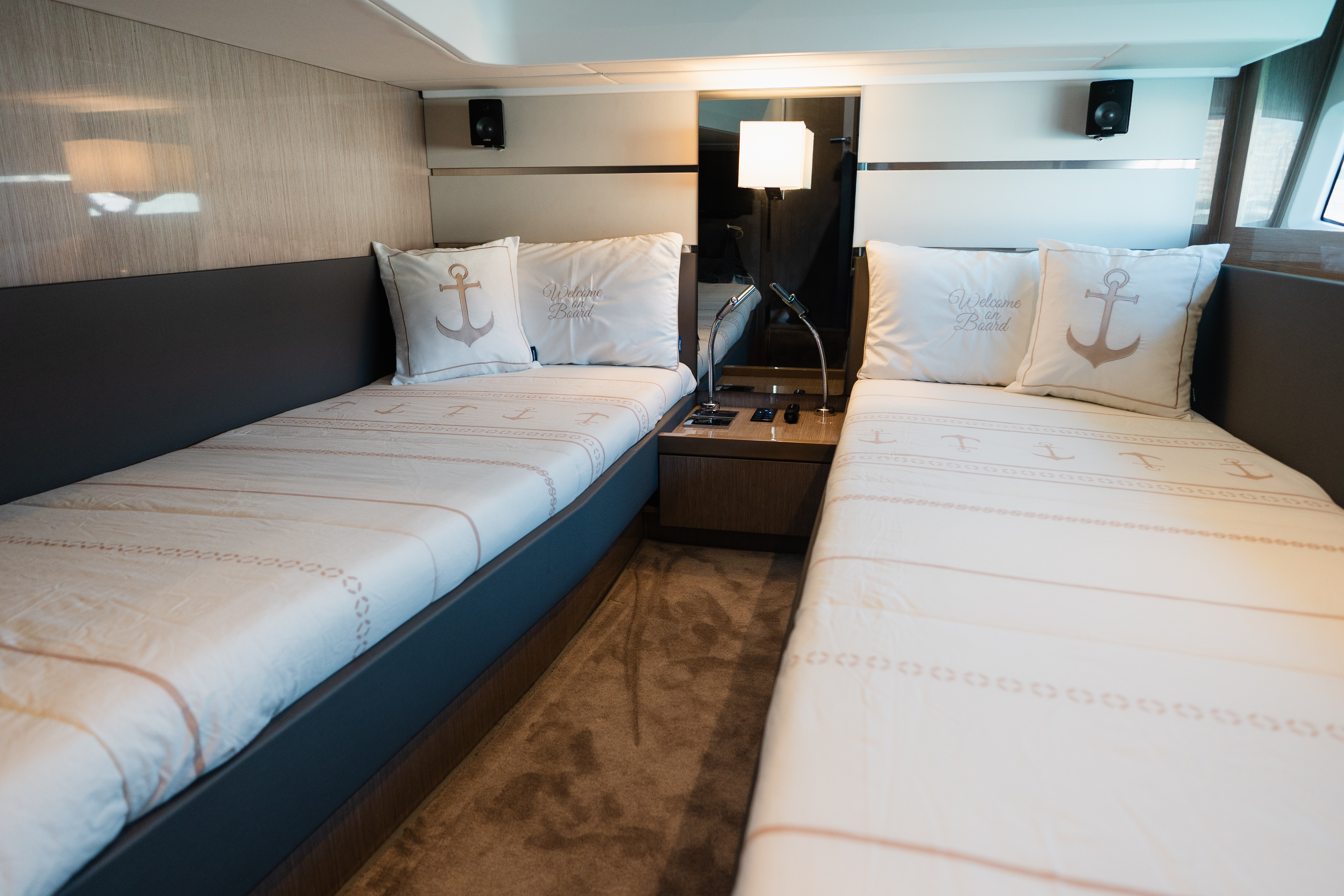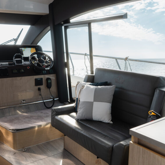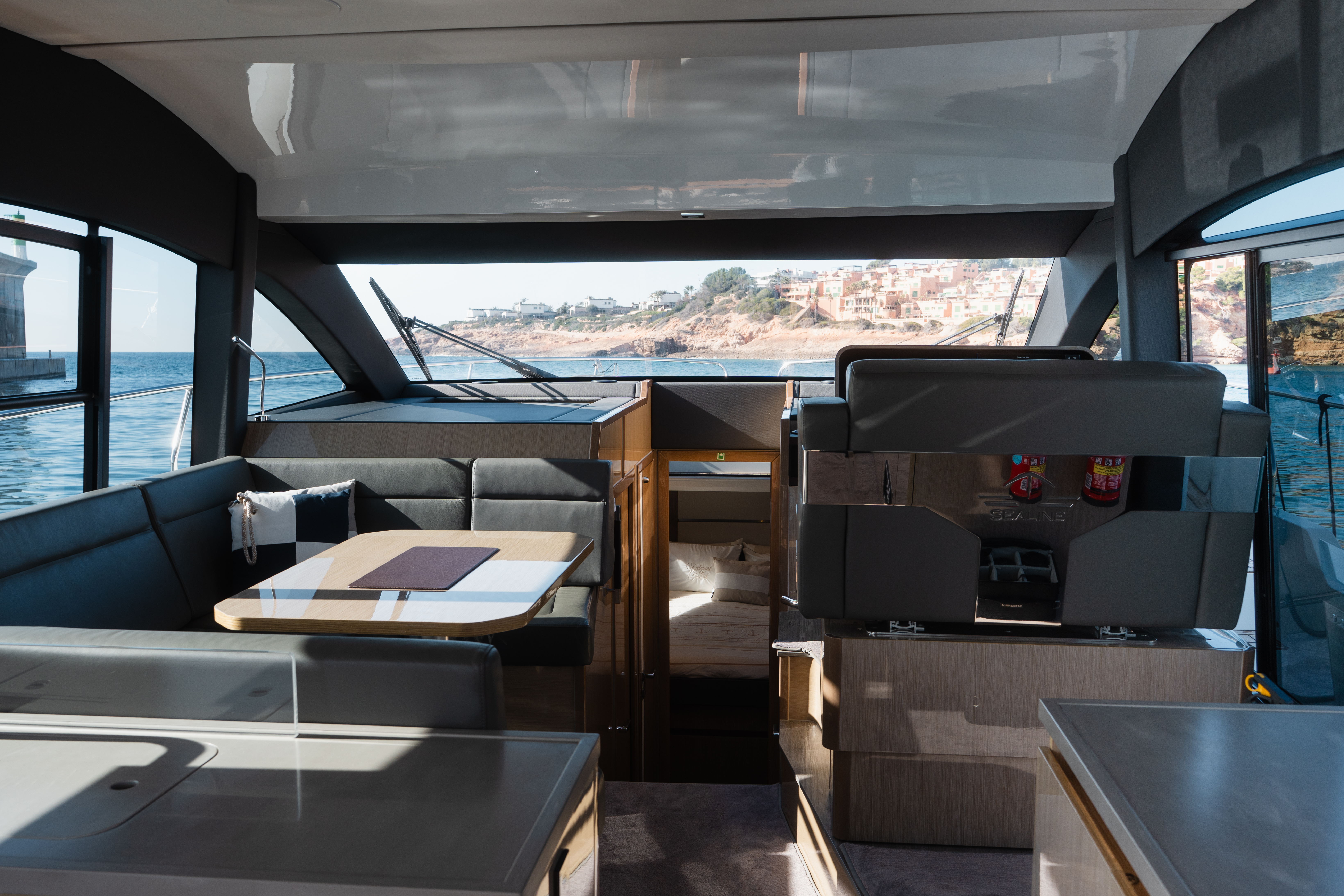 The Sealine F430 impresses with a smartly designed layout featuring three cabins and two bathrooms, offering the ideal balance between privacy and sociable living. The spacious master cabin amidships is a true retreat, complete with an en-suite bathroom, generous storage, and large windows that fill the space with natural light. The forward VIP cabin and additional guest cabin offer equally refined comfort, making this yacht perfect for family cruising or hosting friends in style!