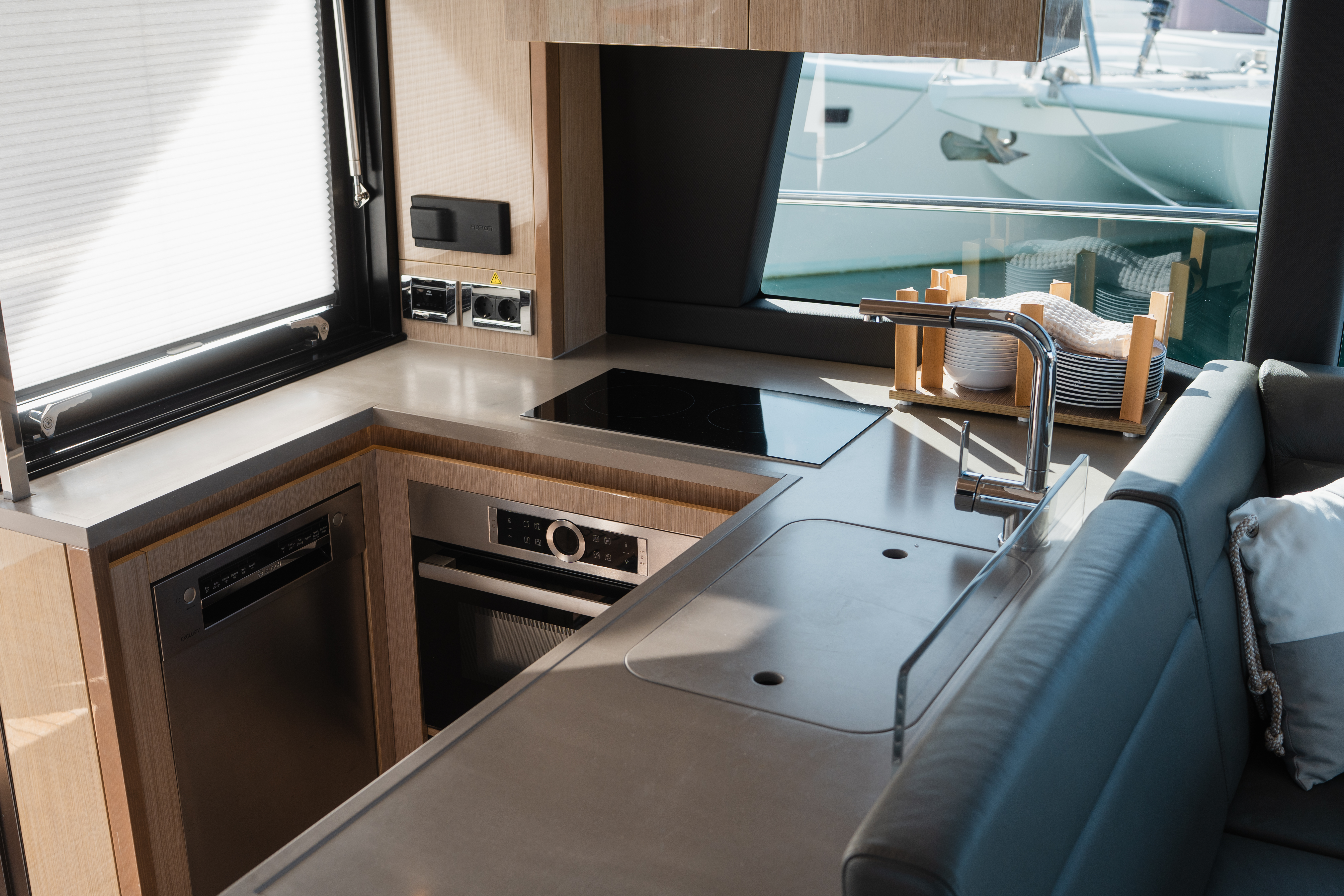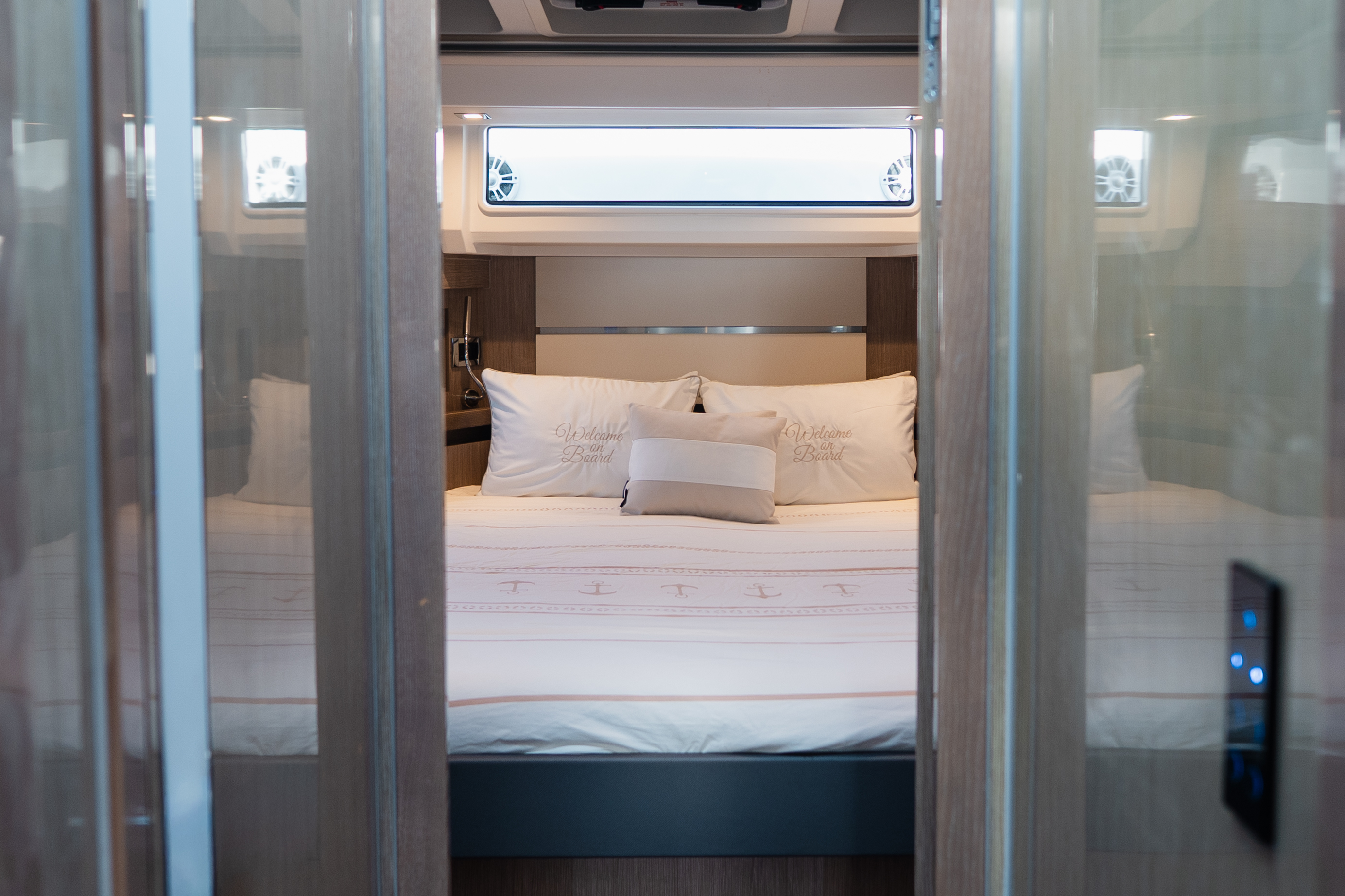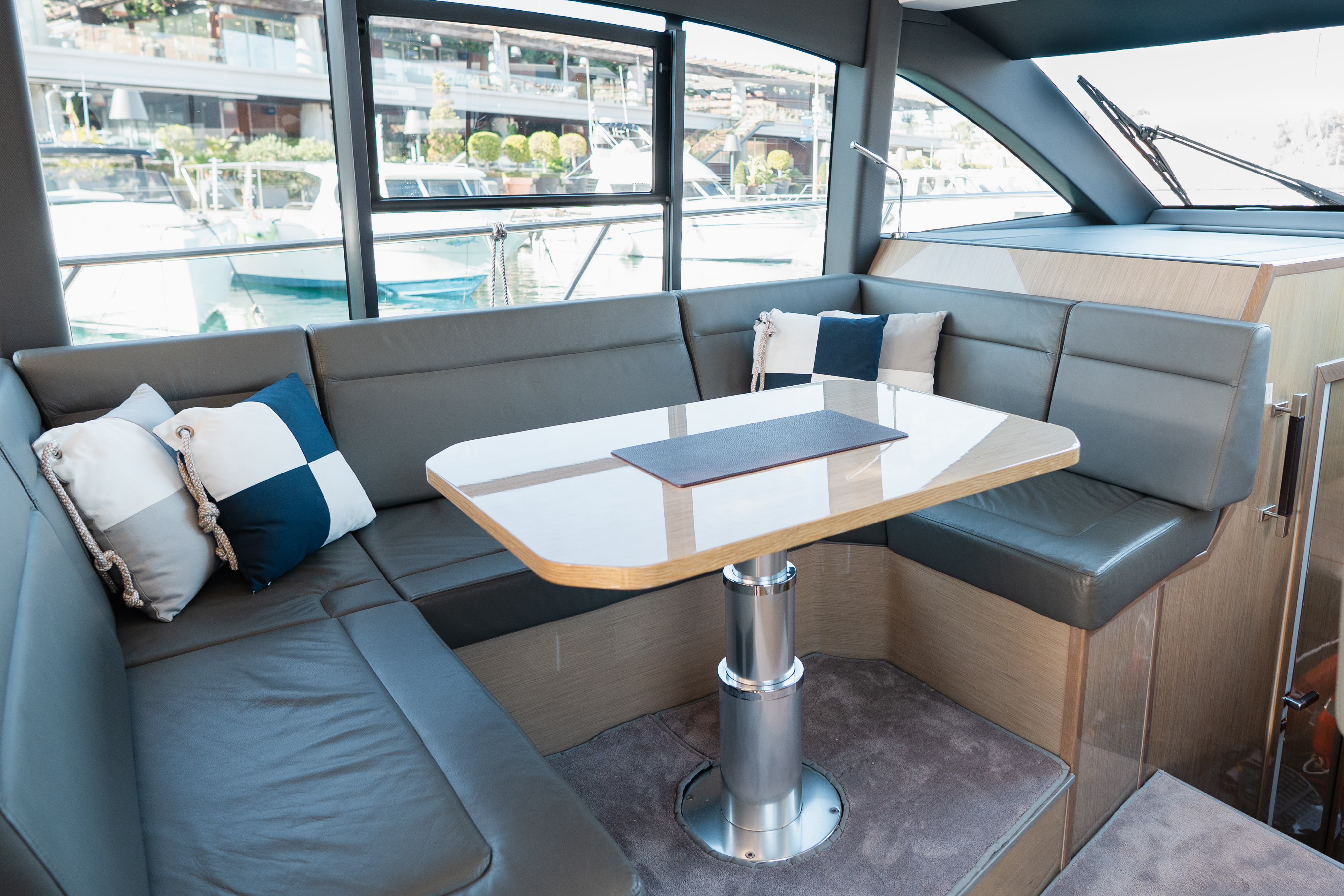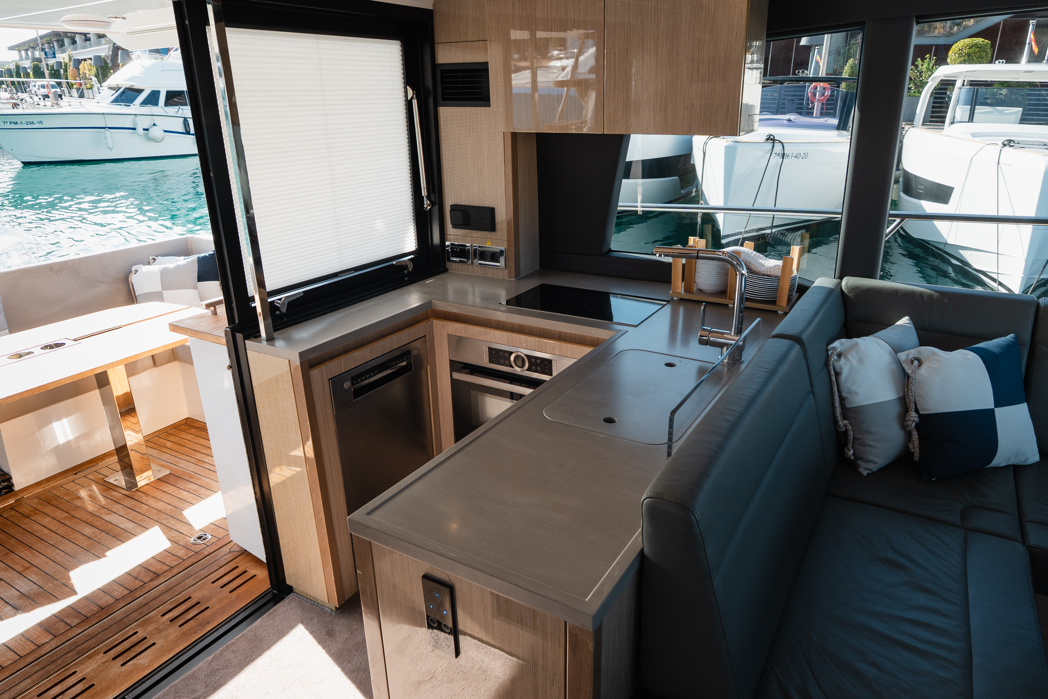 Powered by IPS drives for smooth, efficient handling, she combines performance and elegance in perfect harmony. Her striking design features expansive hull windows that bathe the interior in natural light, sumptuous leather upholstery, and distinctive details such as genuine slate wall panels and piano-lacquer cabinetry. A sophisticated blend of craftsmanship and contemporary style!