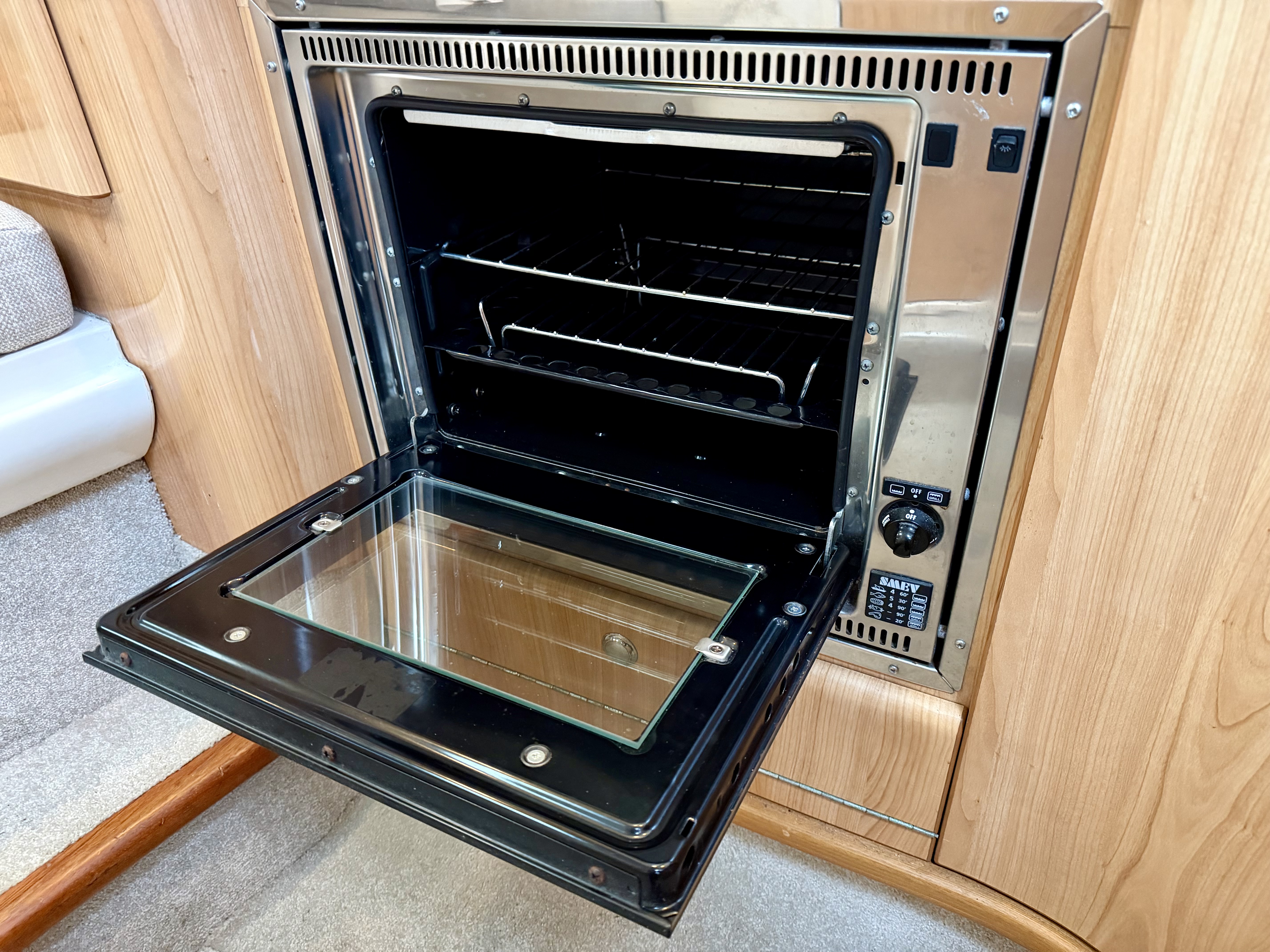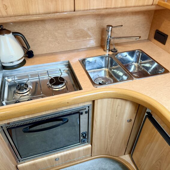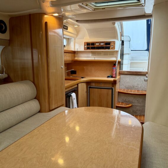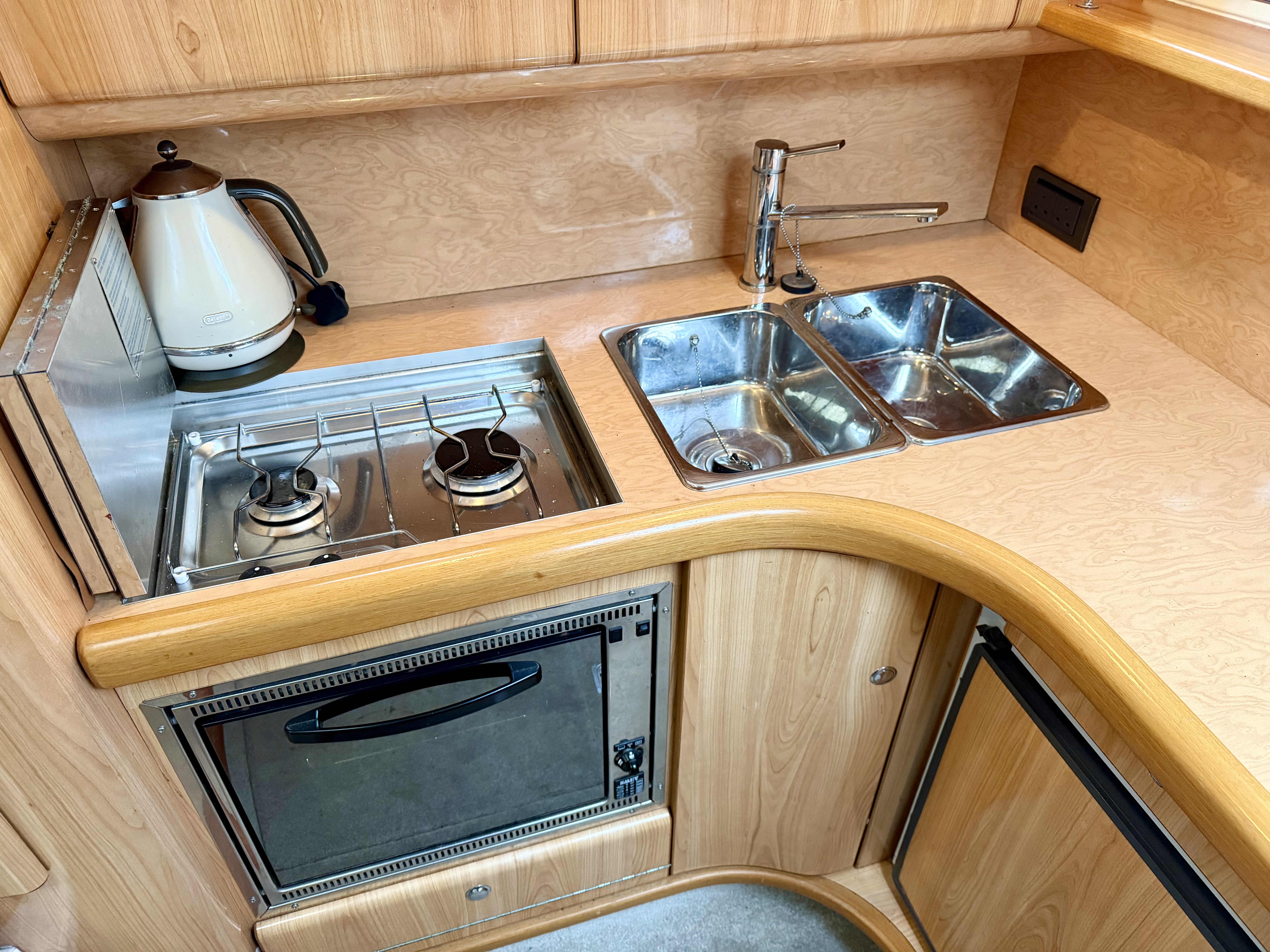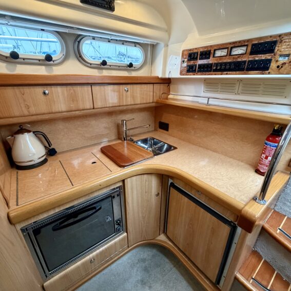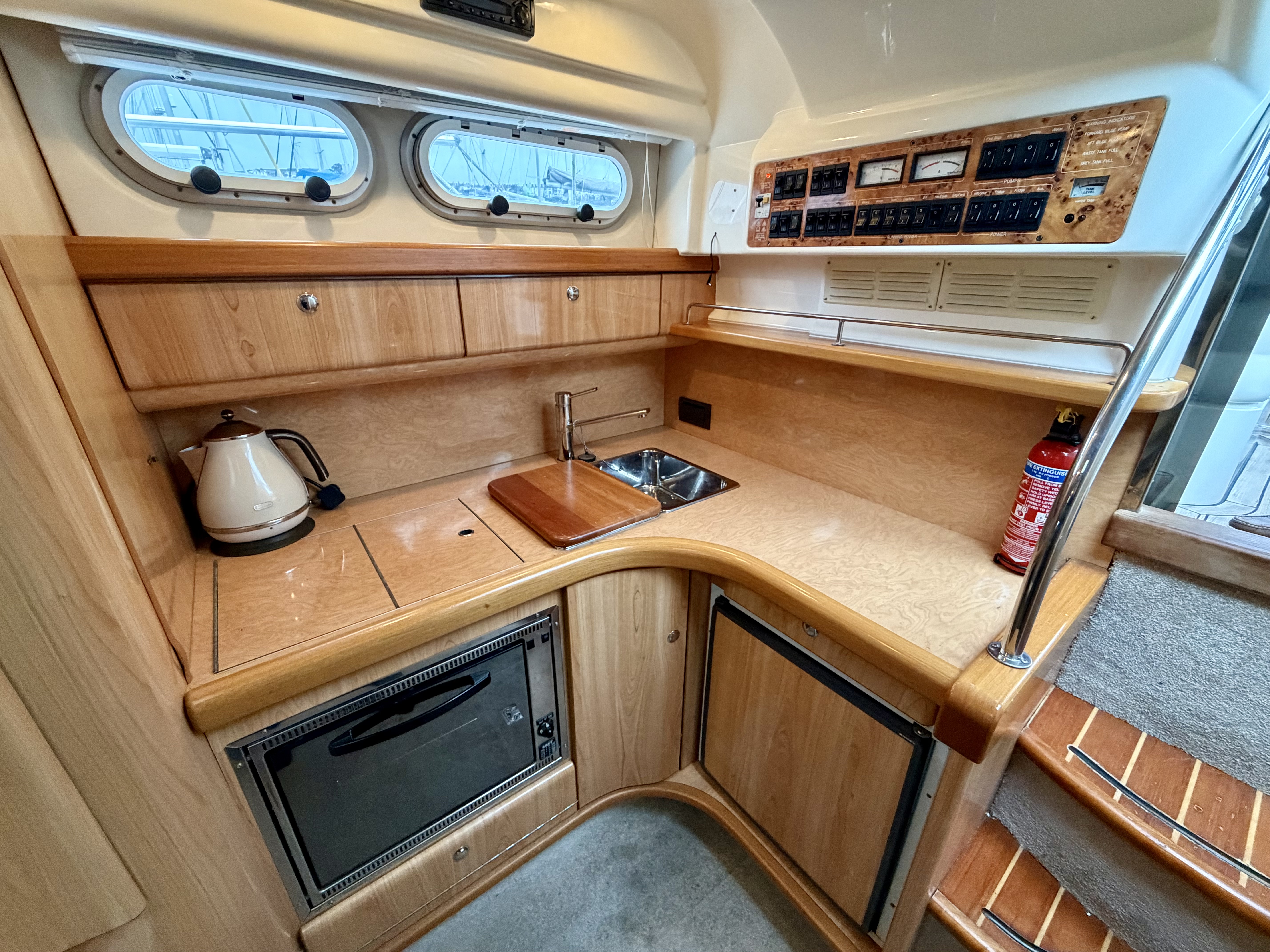 The cockpit features elegant teak flooring and a teak-laid bathing platform, complemented by a well-equipped wetbar complete with a fridge and gas hob — perfect for entertaining onboard. Below deck, the accommodation is stylish and practical, offering a bright and inviting space ideal for weekends away or extended coastal cruising!