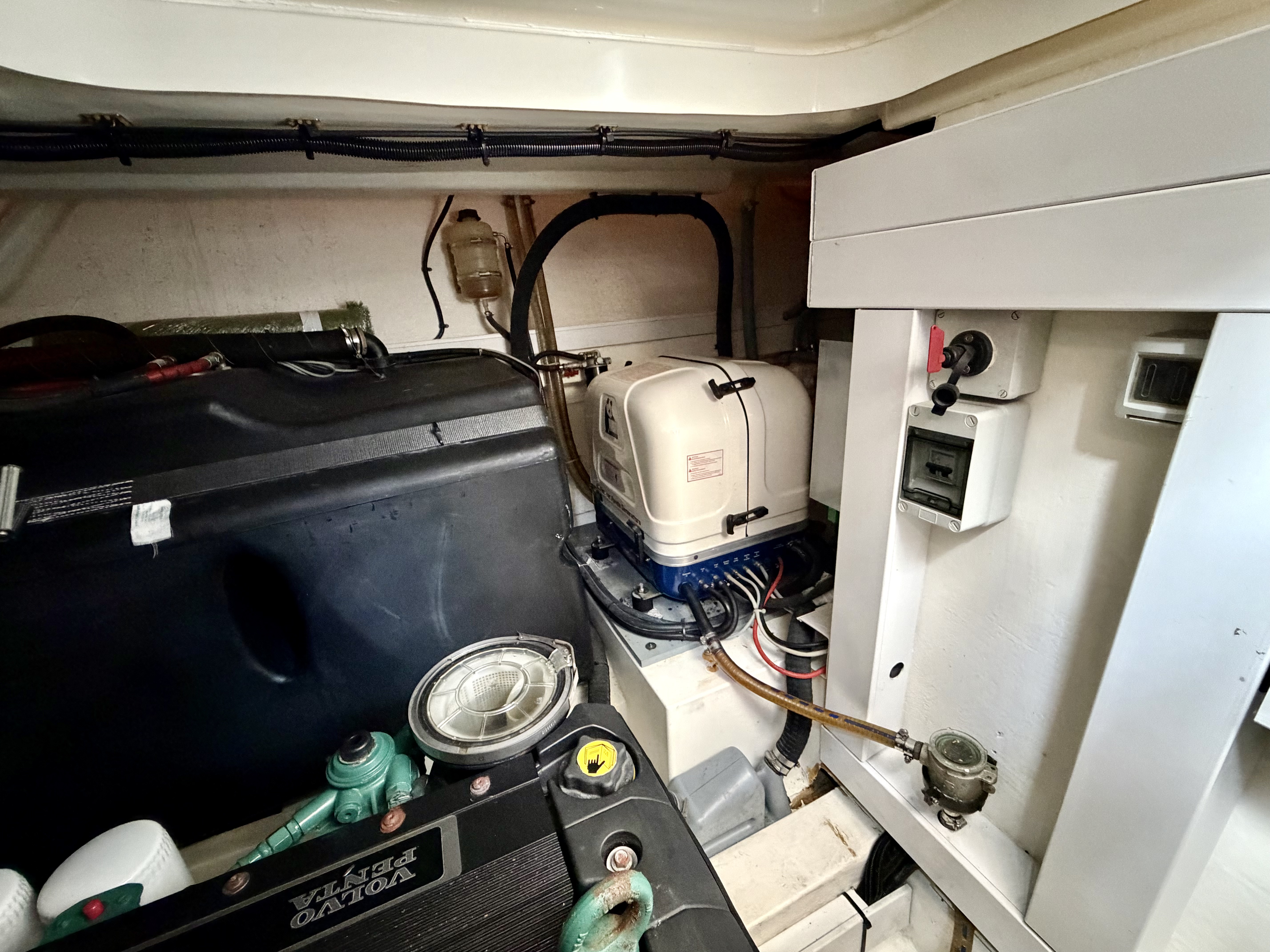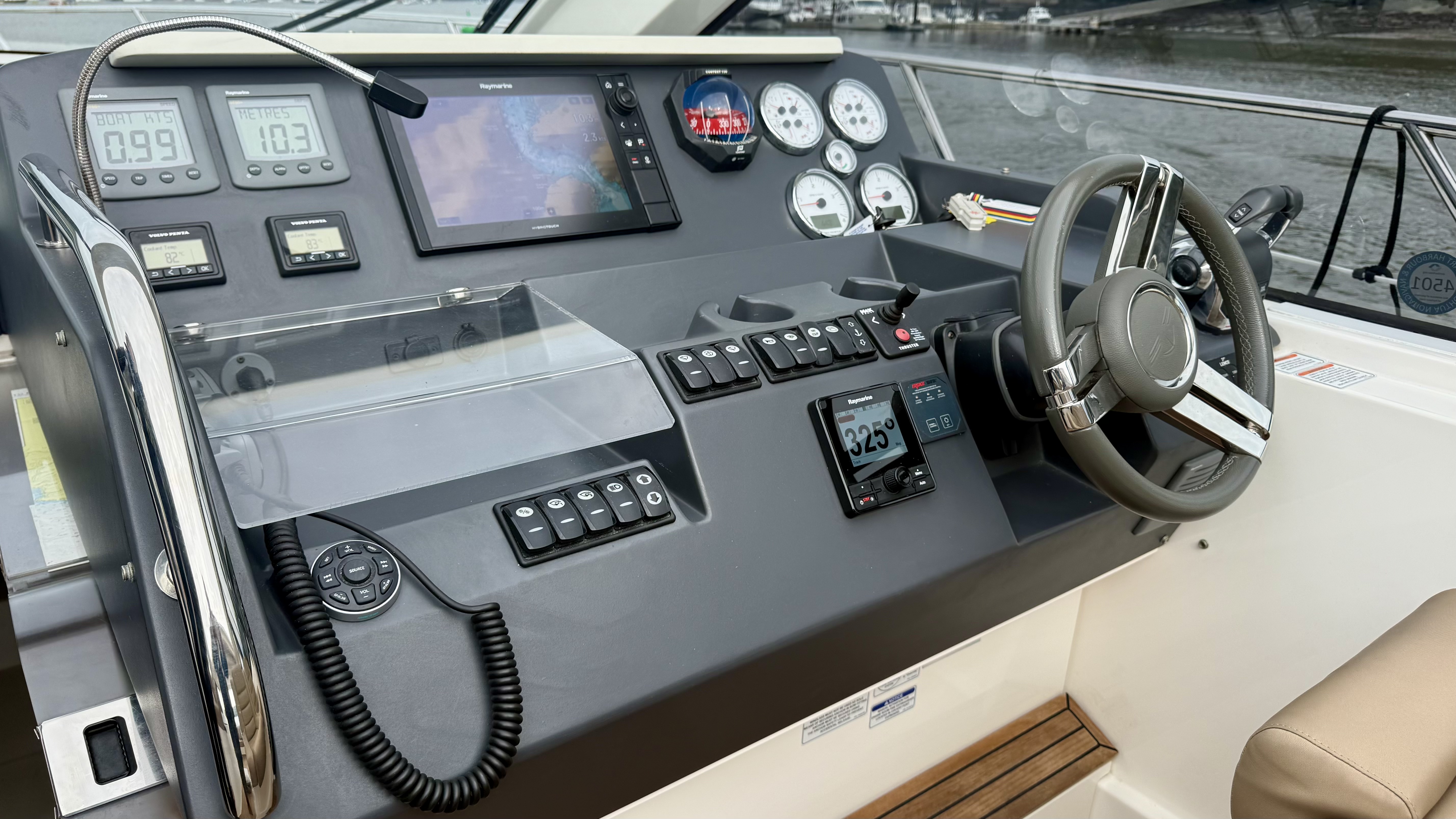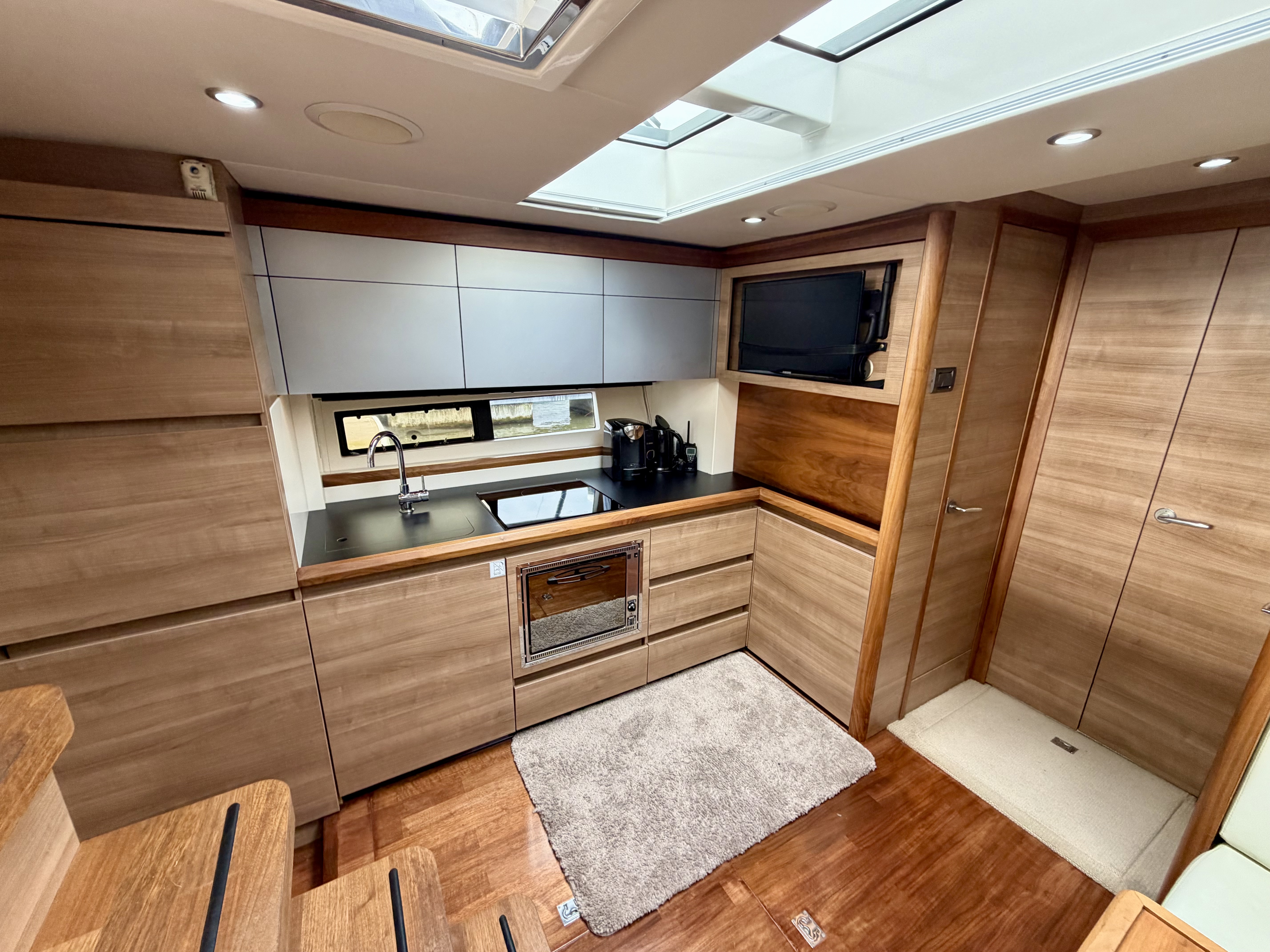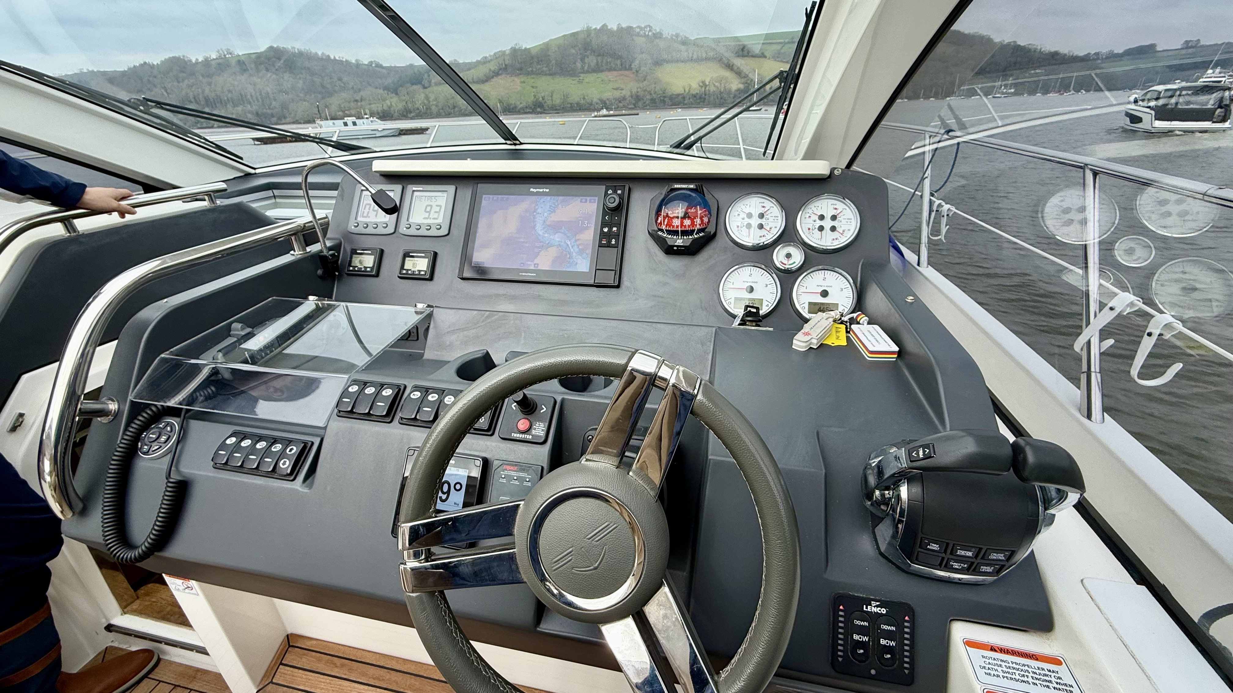 Handling is straightforward and precise thanks to the twin D6 engines, Lenco trim tabs and a Max Power bow thruster. Navigation is well catered for with a full Raymarine suite including HybridTouch chartplotter, radar, autopilot and data display, alongside VHF, compass and Volvo Penta engine data screens. An electric anchor windlass with stainless steel anchor, navigation lights, horn and windscreen wipers further underline her cruising credentials. Shore power and a Fischer Panda generator by Fischer Panda provide complete independence whether berthed or at anchor!
