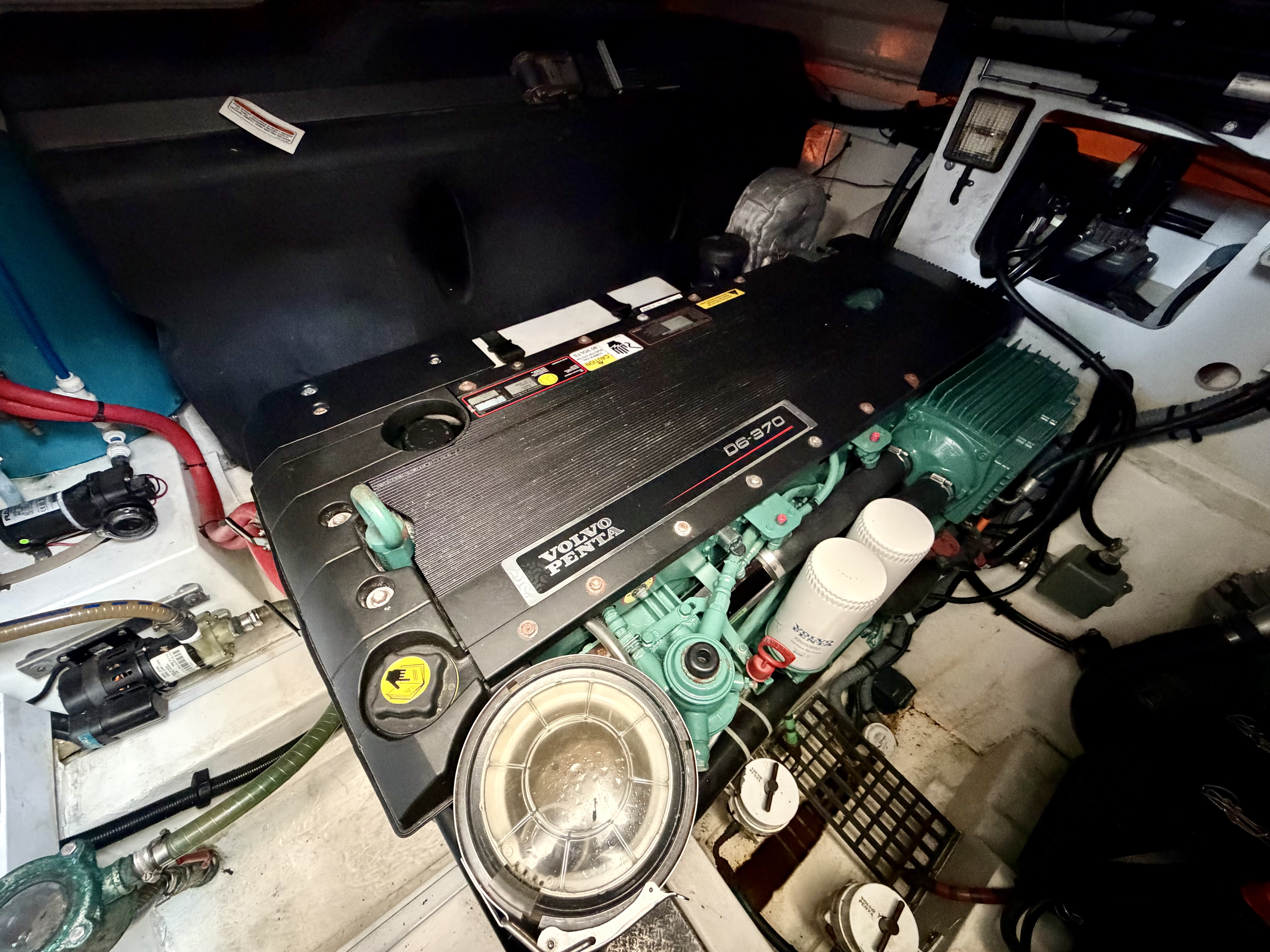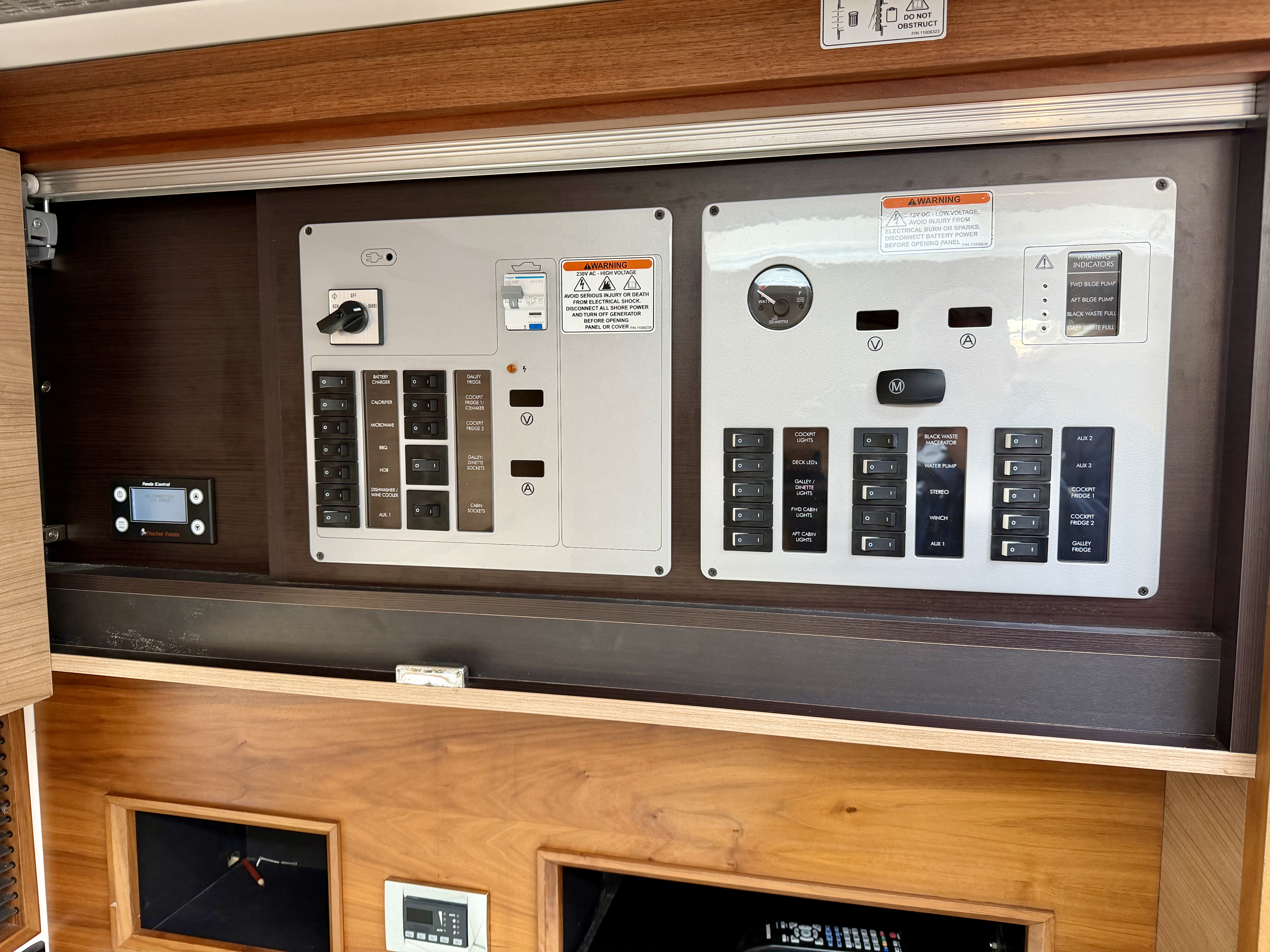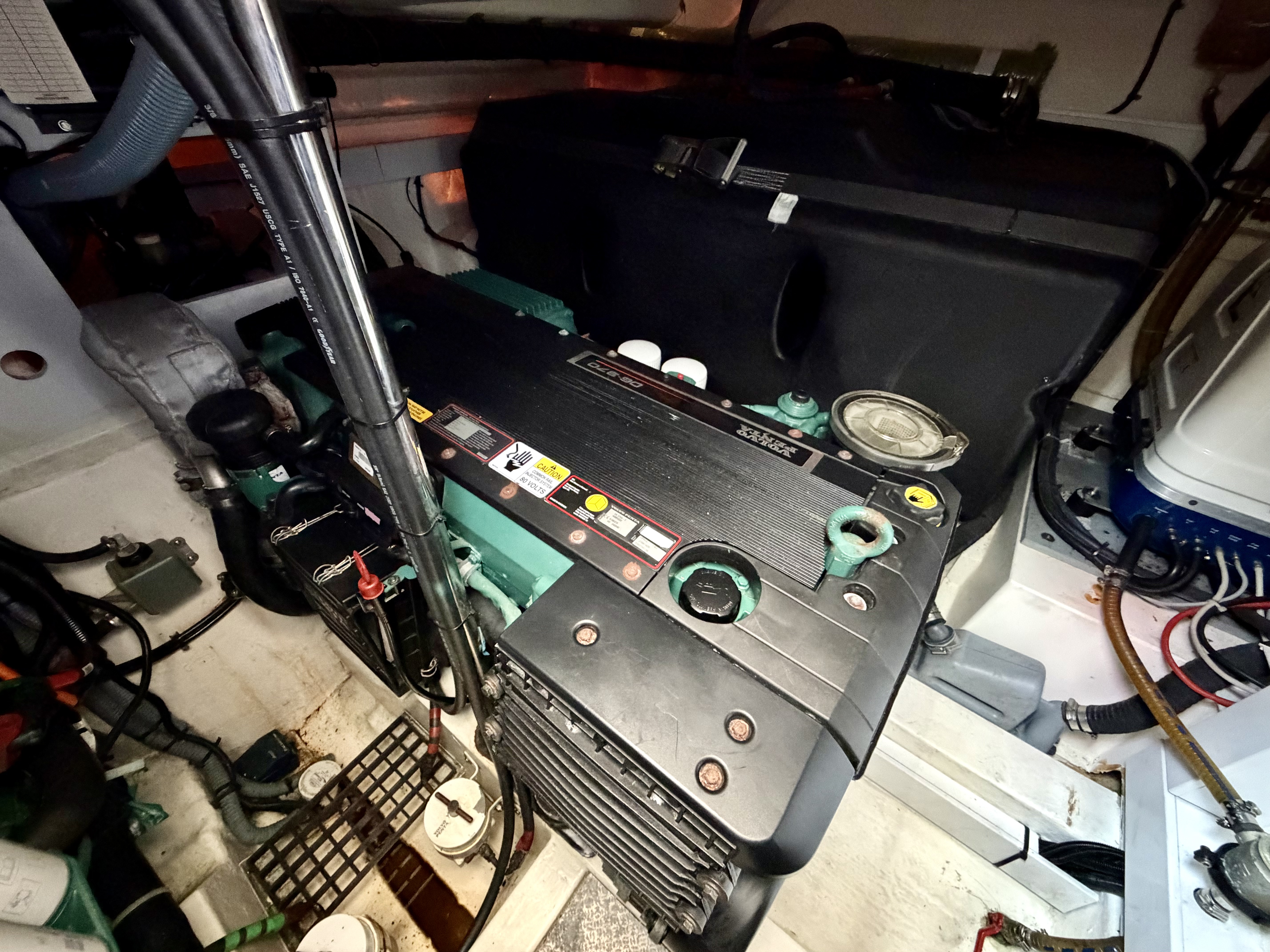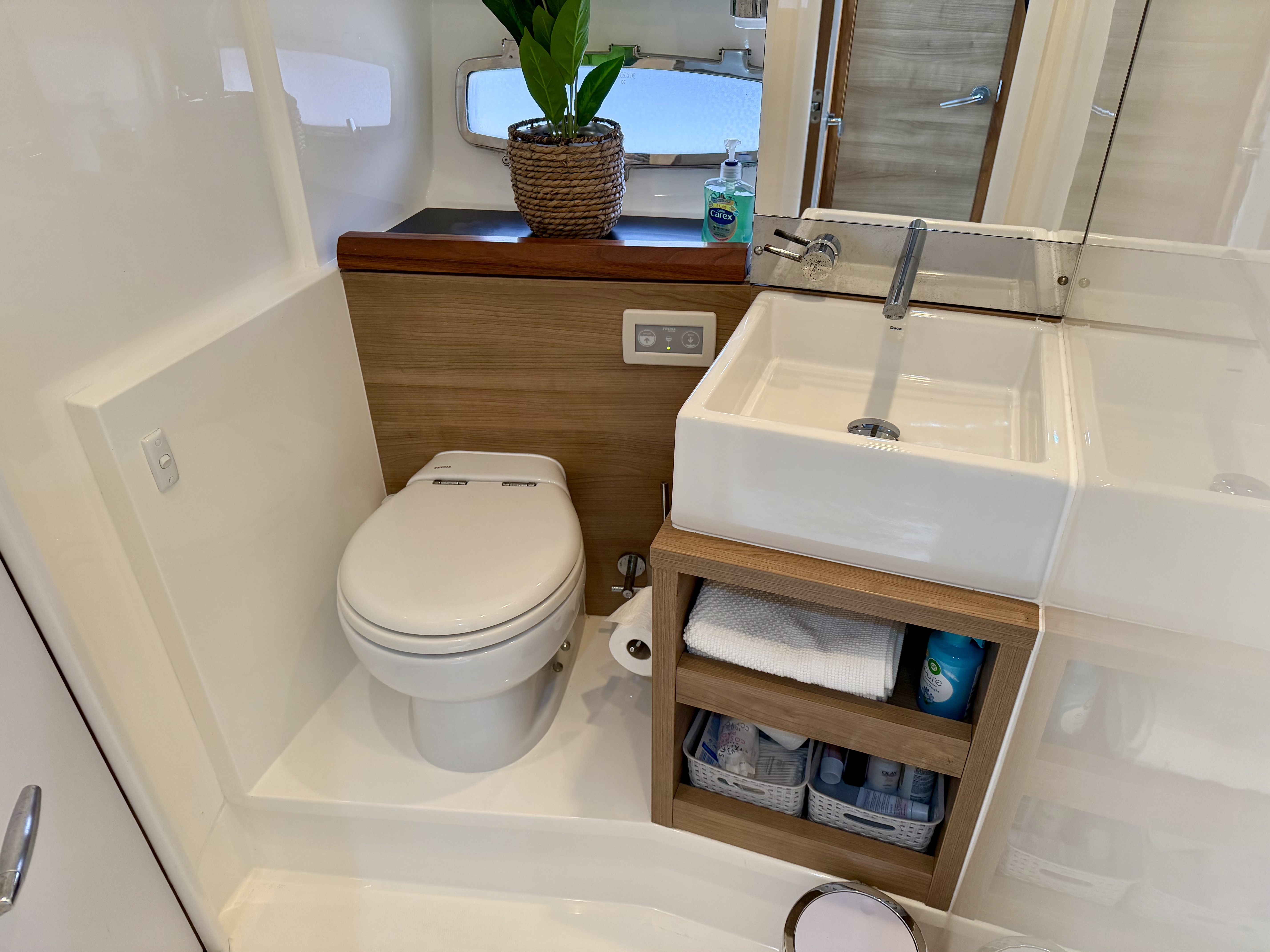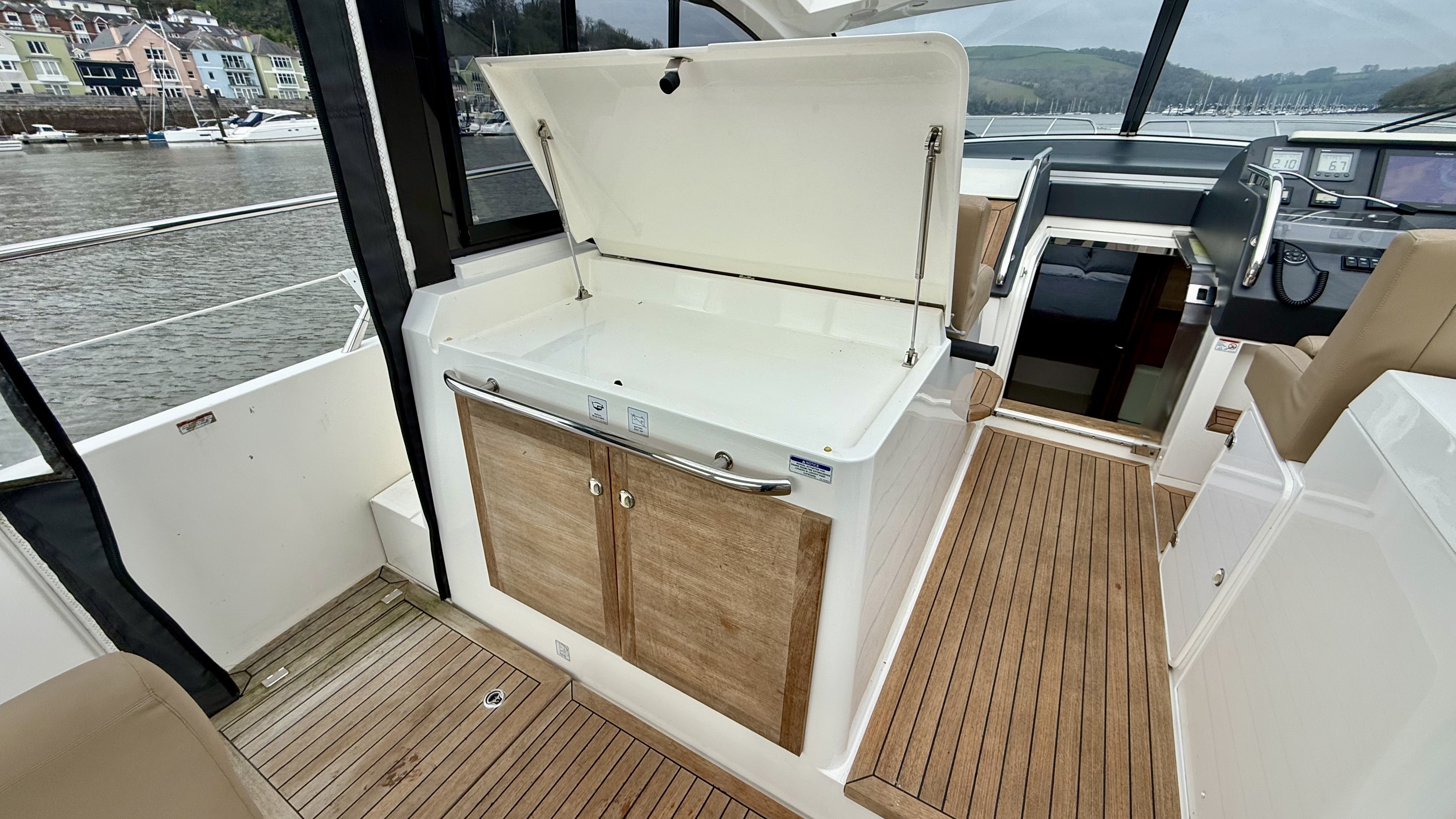 Handling is straightforward and precise thanks to the twin D6 engines, Lenco trim tabs and a Max Power bow thruster. Navigation is well catered for with a full Raymarine suite including HybridTouch chartplotter, radar, autopilot and data display, alongside VHF, compass and Volvo Penta engine data screens. An electric anchor windlass with stainless steel anchor, navigation lights, horn and windscreen wipers further underline her cruising credentials. Shore power and a Fischer Panda generator by Fischer Panda provide complete independence whether berthed or at anchor!