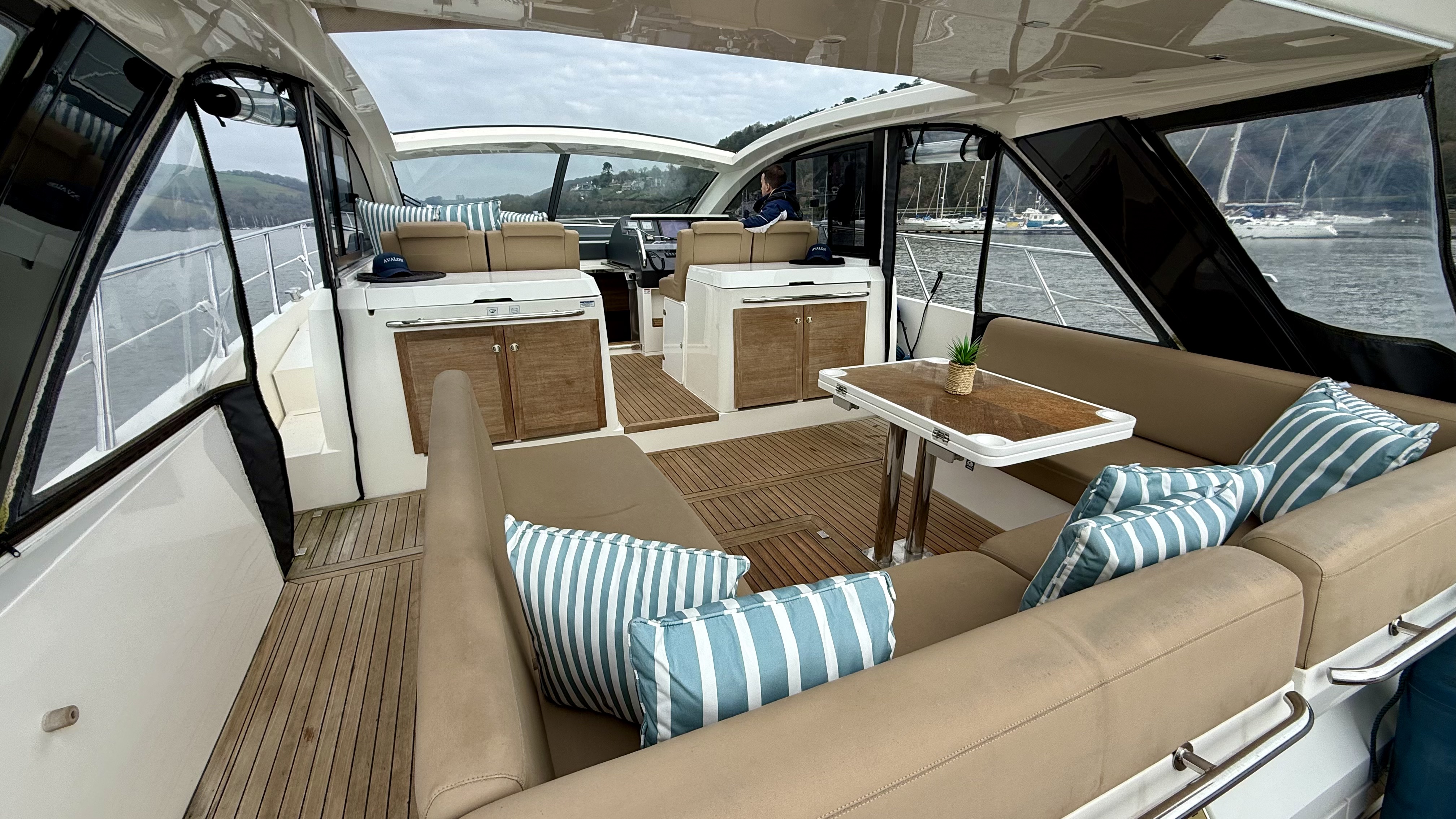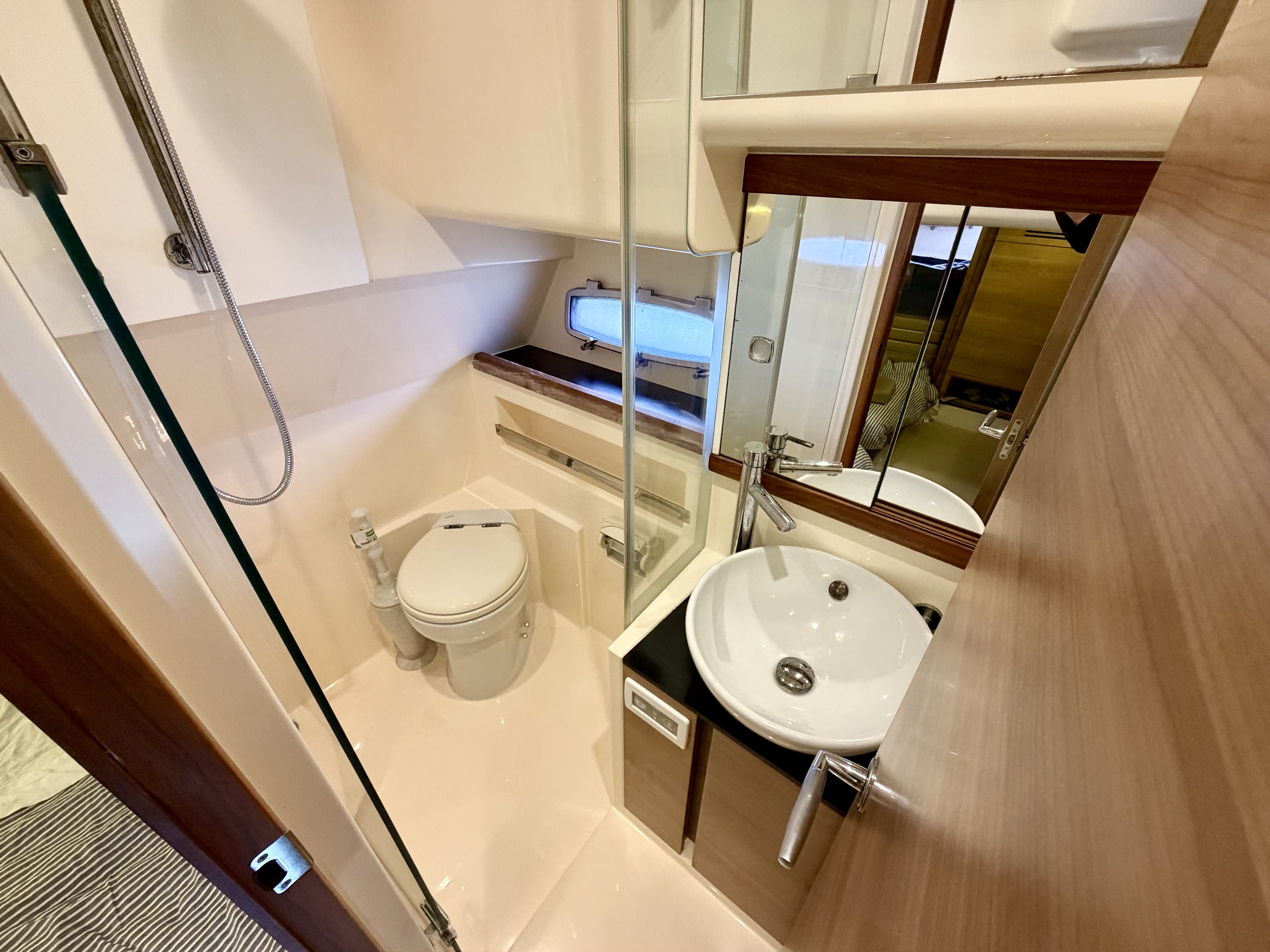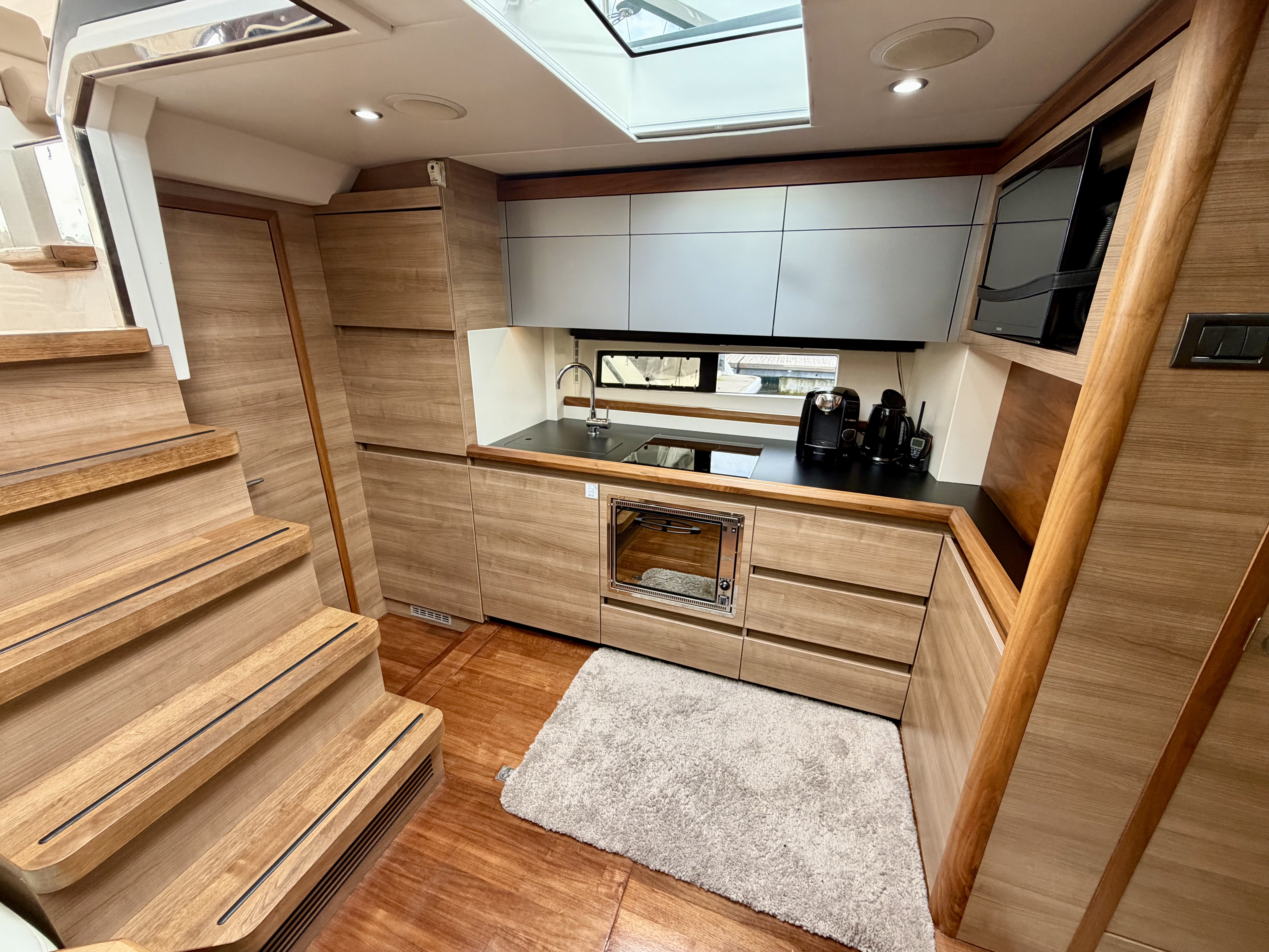 Below deck, the Sealine’s innovative design creates a bright and welcoming interior with impressive headroom and space. The layout offers two generous cabins and two electric heads, complemented by a full-sized separate shower room for added comfort. The saloon and aft cabin are both fitted with flat screen TVs, while a Fusion entertainment system delivers quality audio throughout. The galley is exceptionally well appointed, featuring a fridge-freezer, gas oven, three-burner hob, microwave, sink and tap, as well as a dedicated wine cooler—ideal for extended stays on board. A hot and cold air system ensures year-round usability!