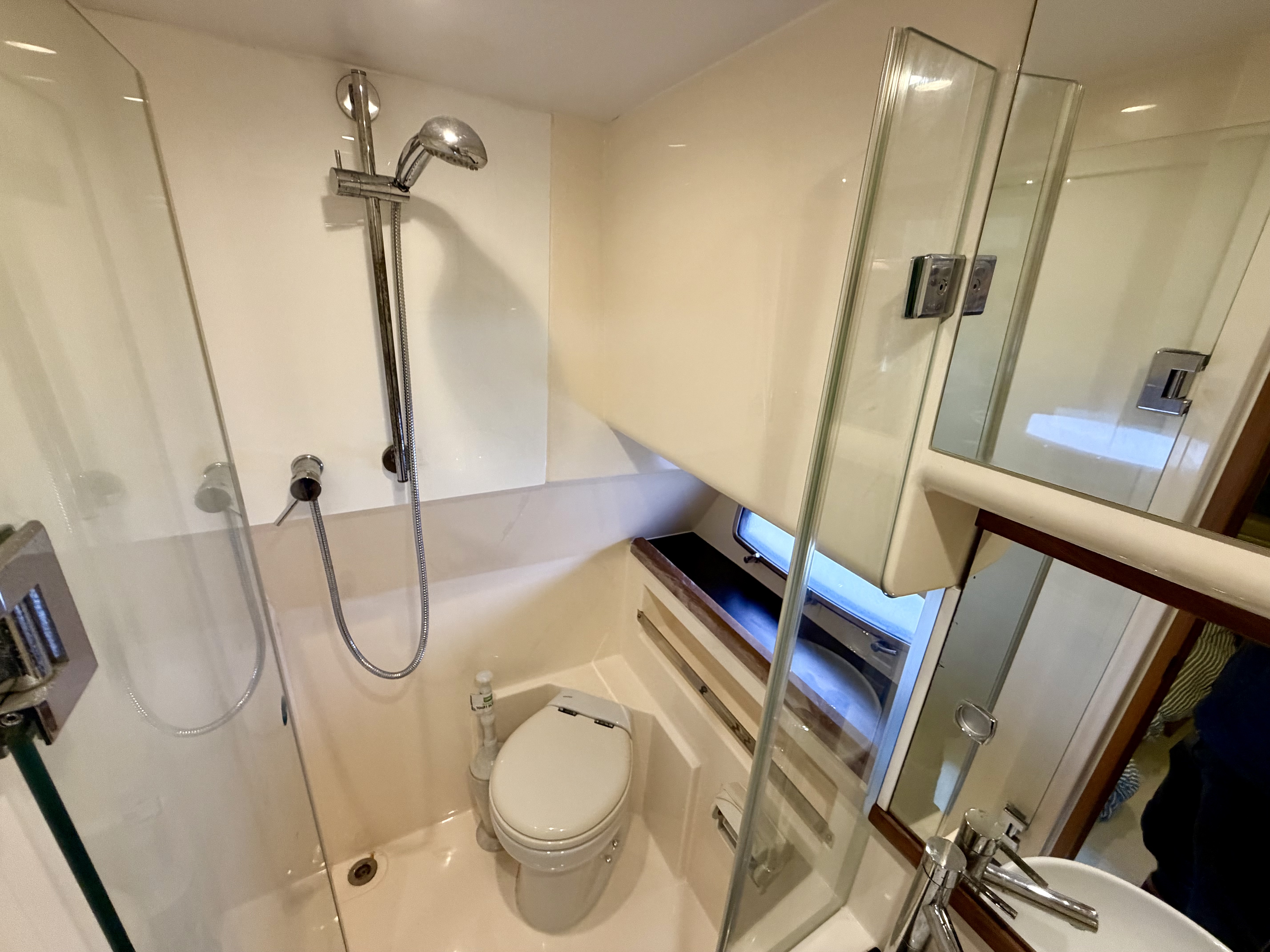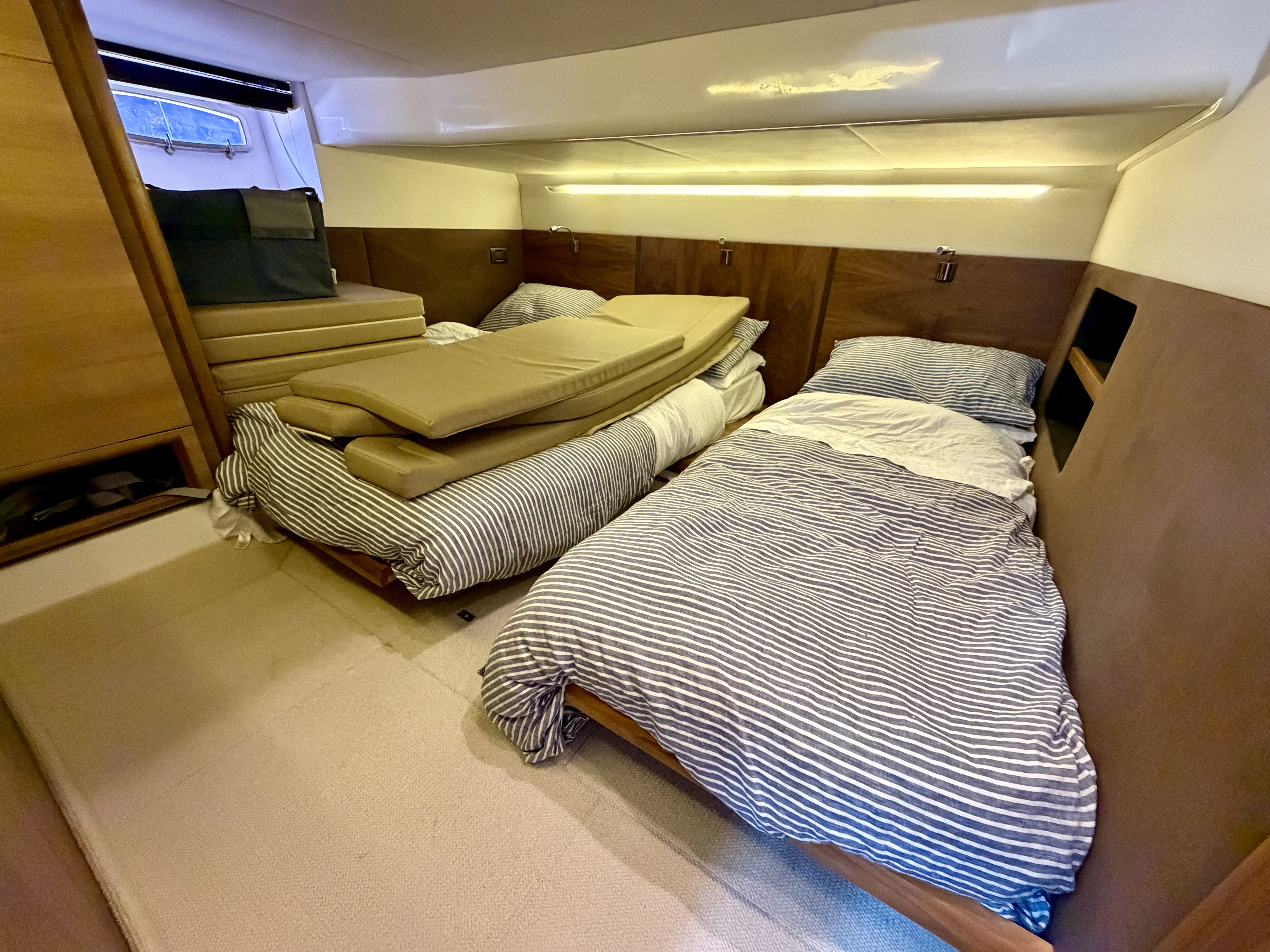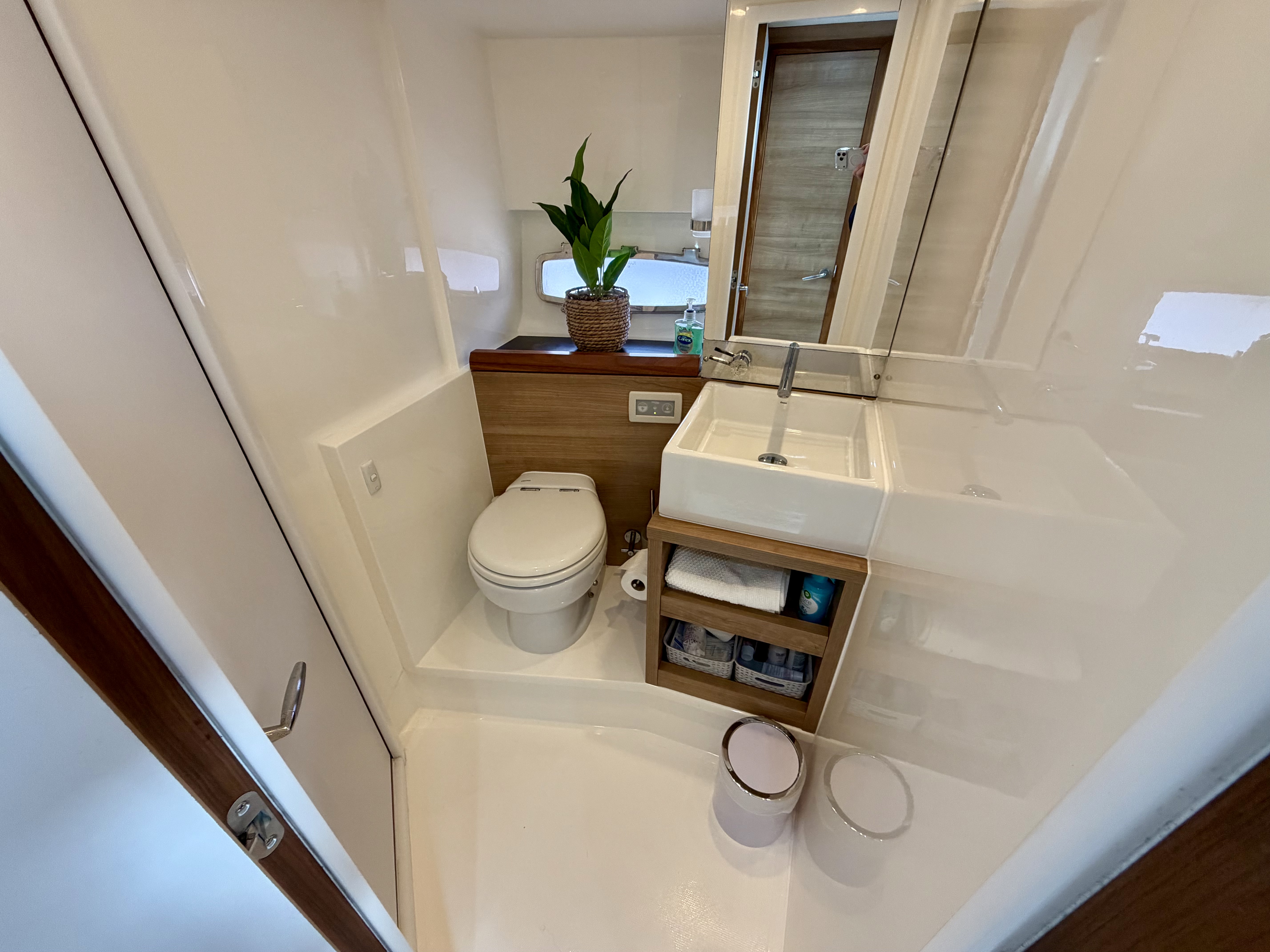 Below deck, the Sealine’s innovative design creates a bright and welcoming interior with impressive headroom and space. The layout offers two generous cabins and two electric heads, complemented by a full-sized separate shower room for added comfort. The saloon and aft cabin are both fitted with flat screen TVs, while a Fusion entertainment system delivers quality audio throughout. The galley is exceptionally well appointed, featuring a fridge-freezer, gas oven, three-burner hob, microwave, sink and tap, as well as a dedicated wine cooler—ideal for extended stays on board. A hot and cold air system ensures year-round usability!