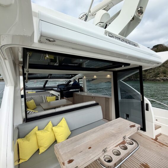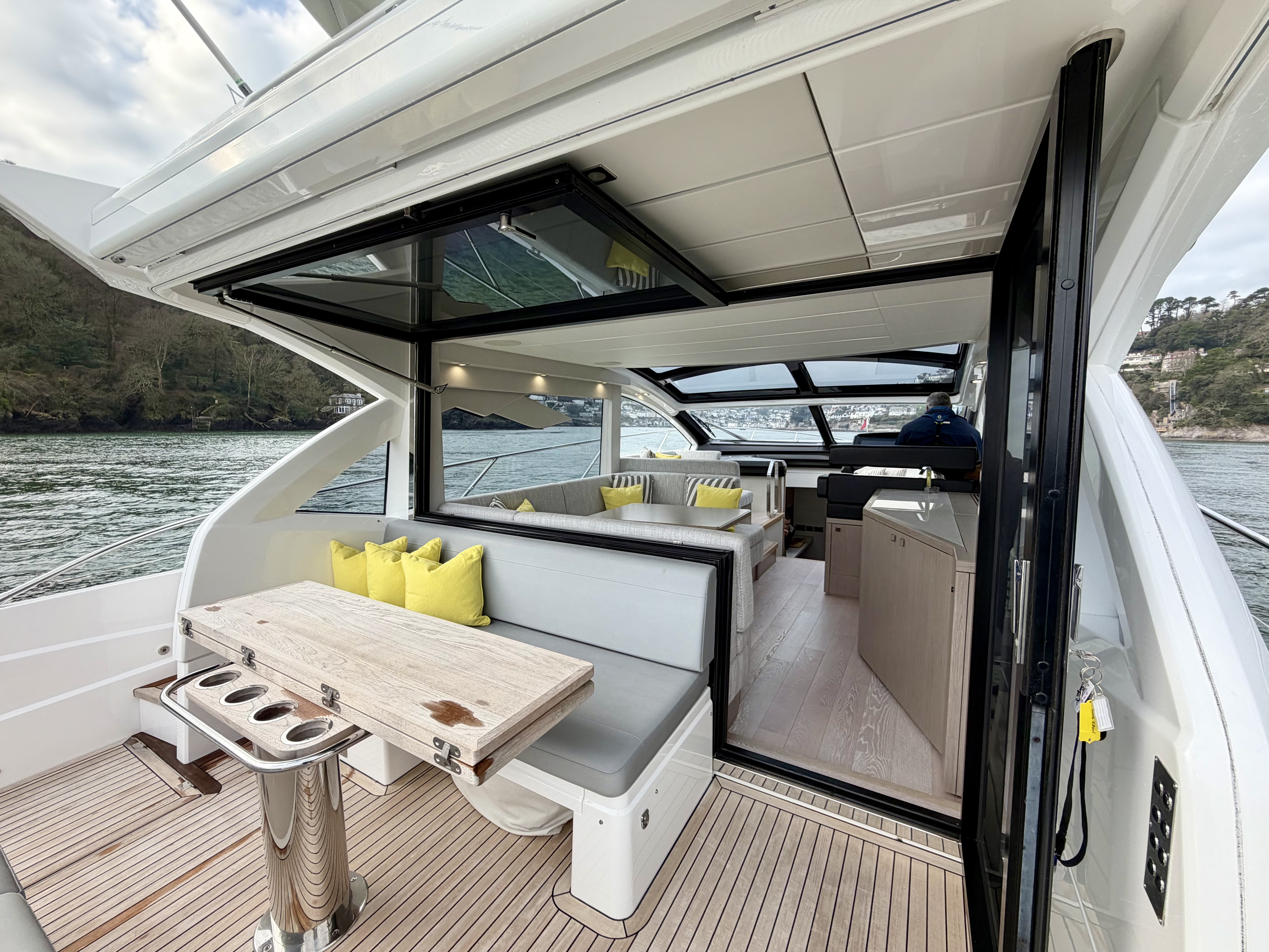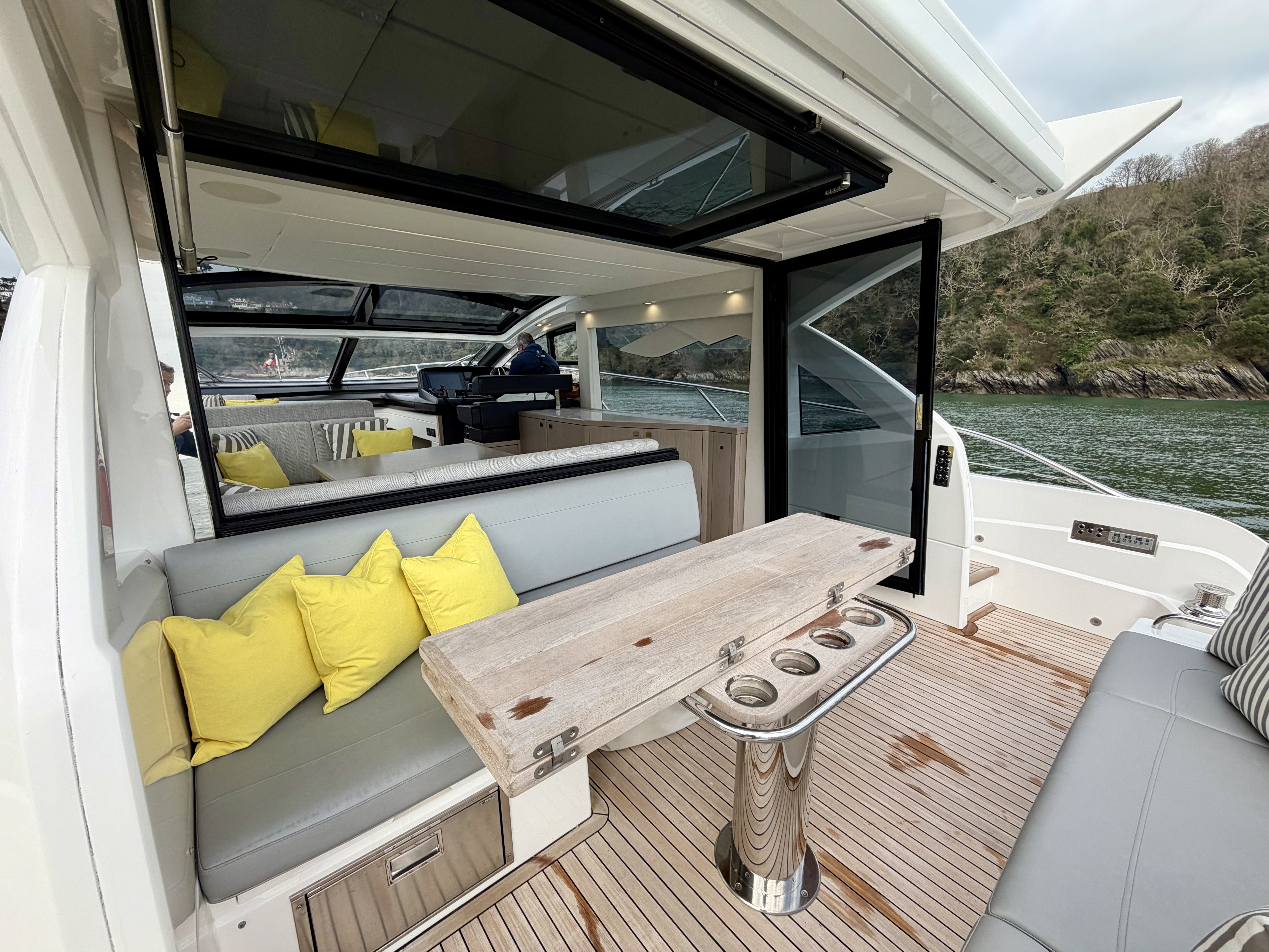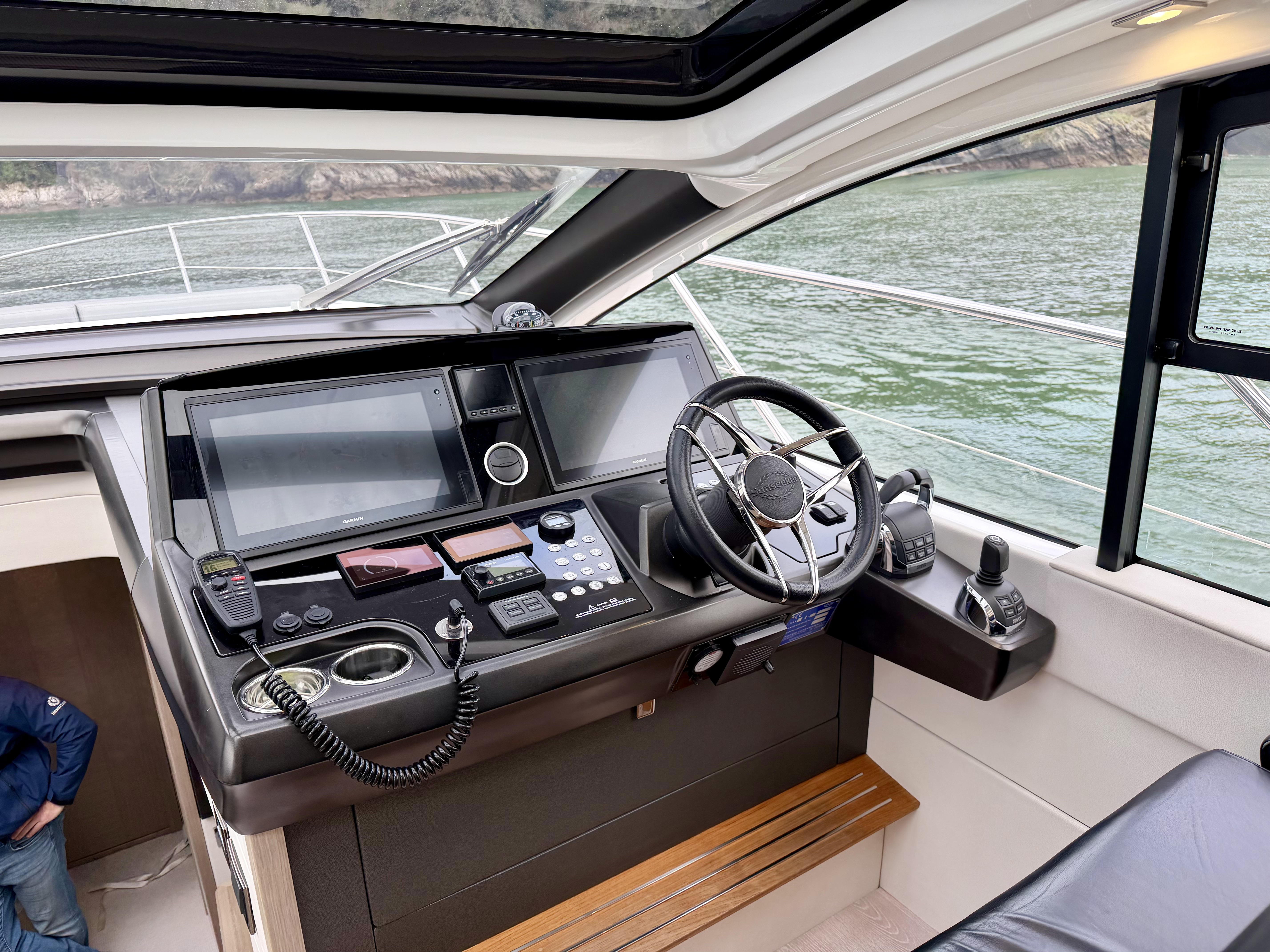 Electric opening drop window on the starboard side at the helm