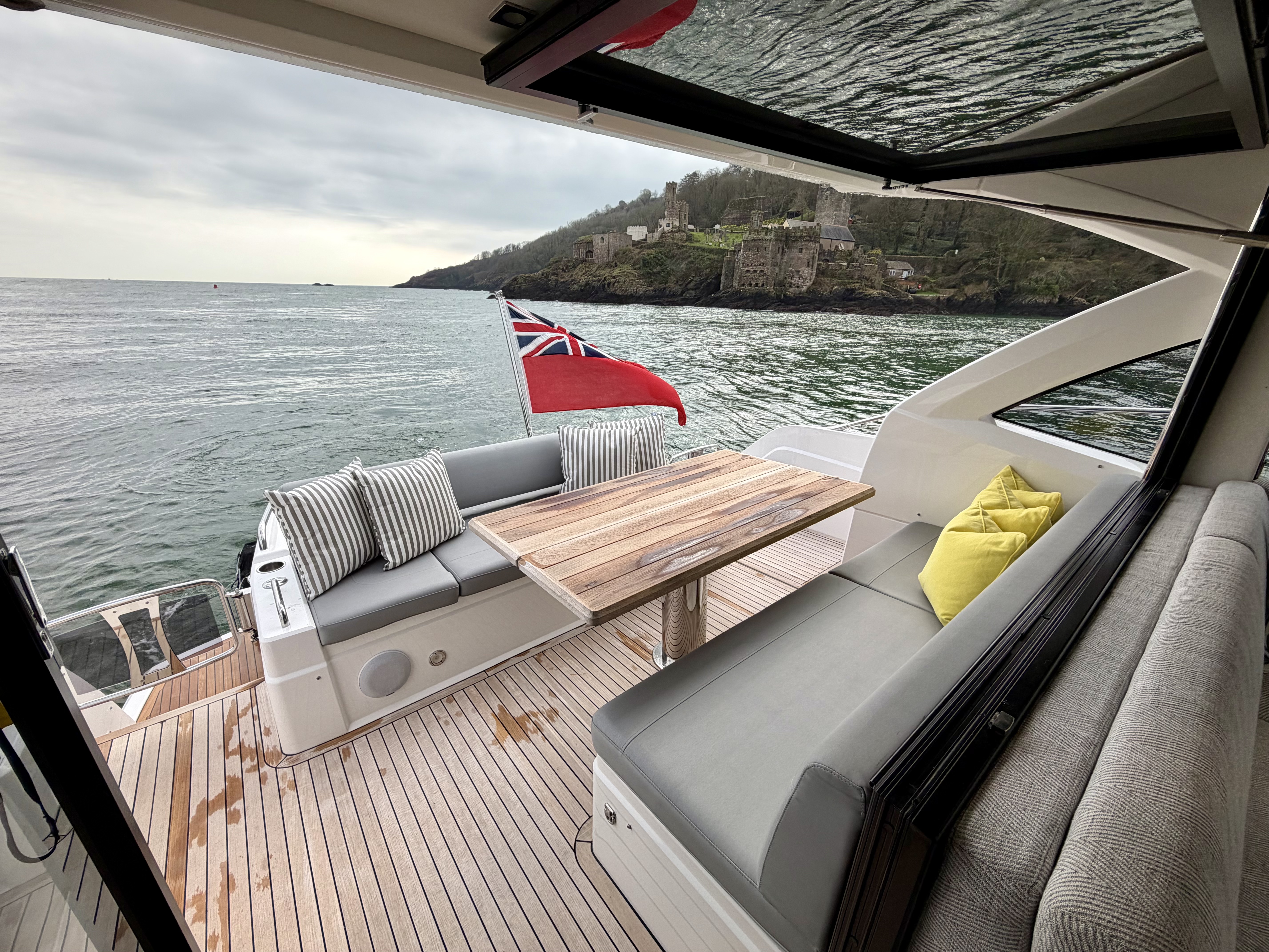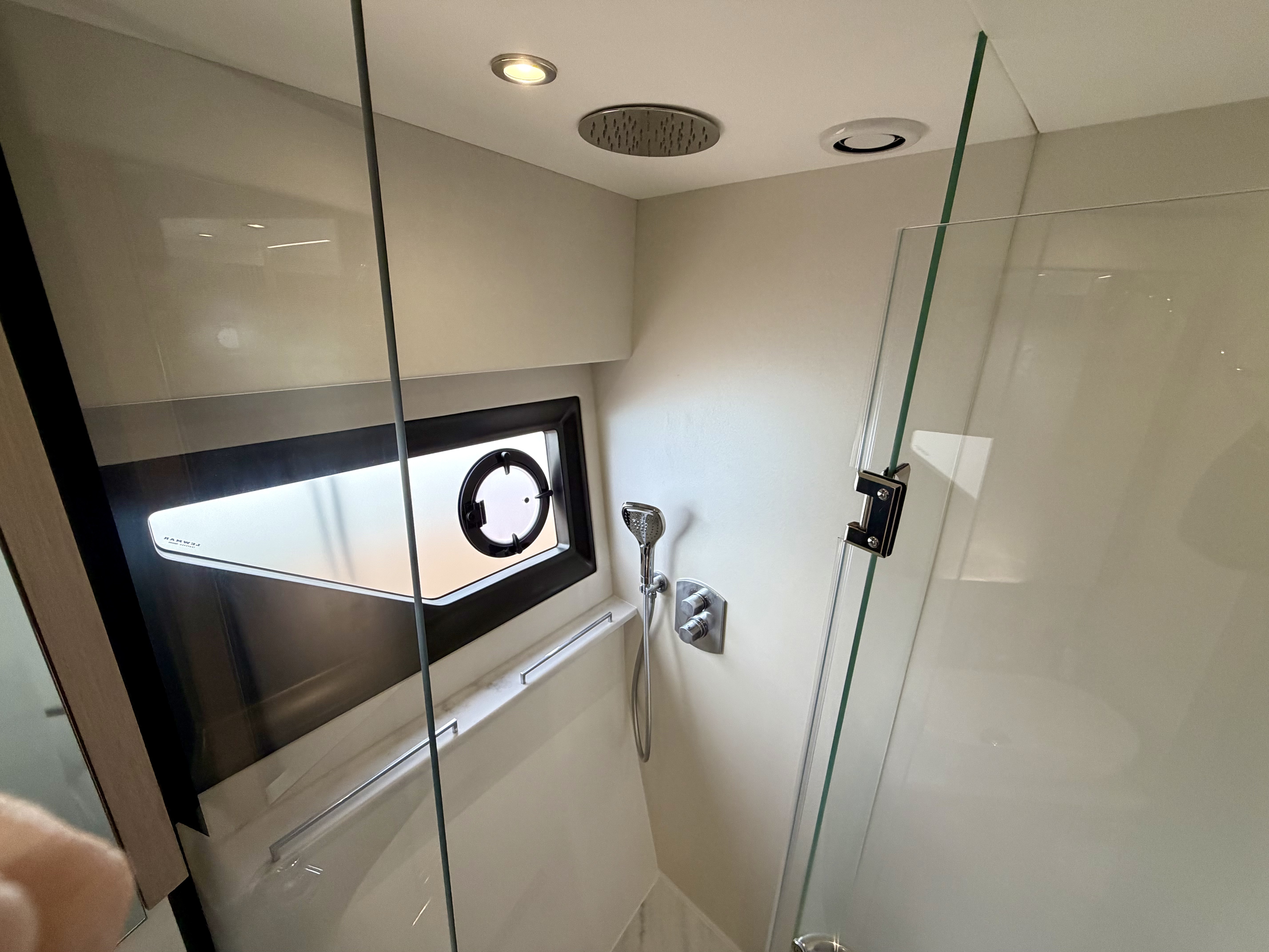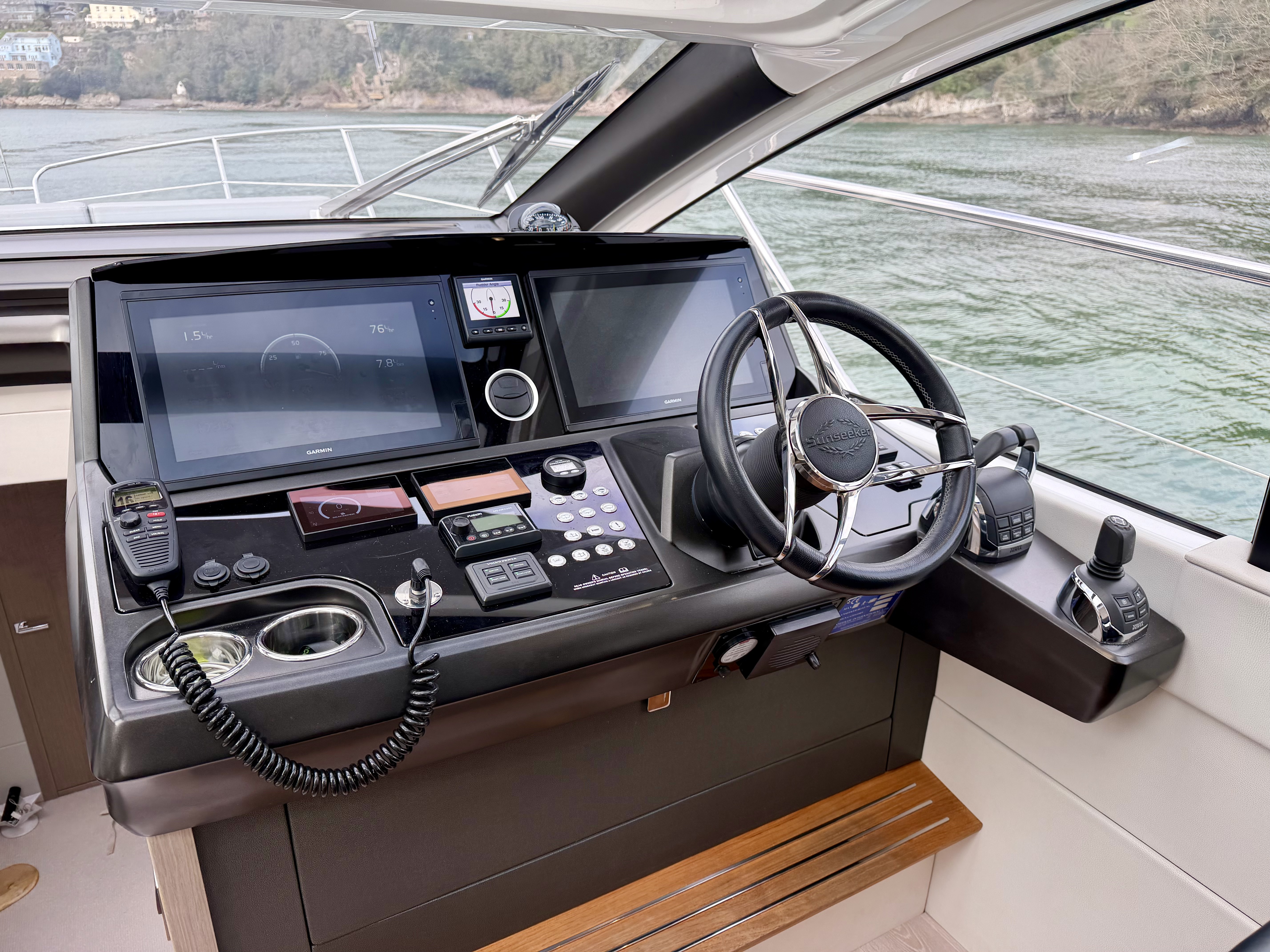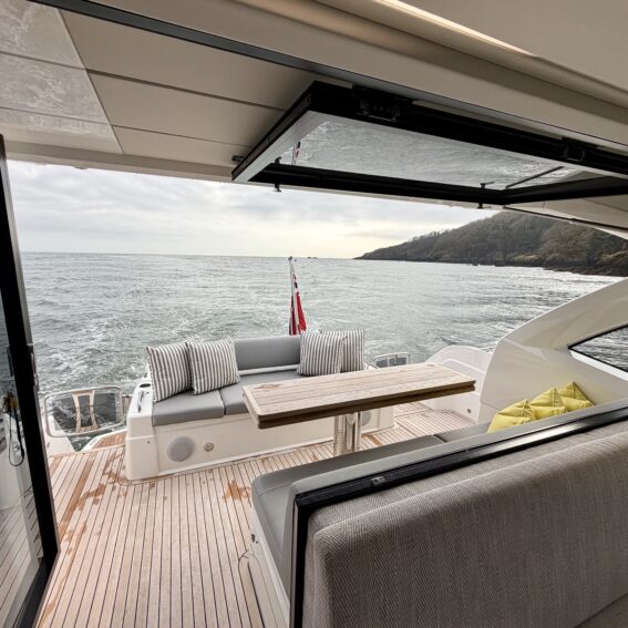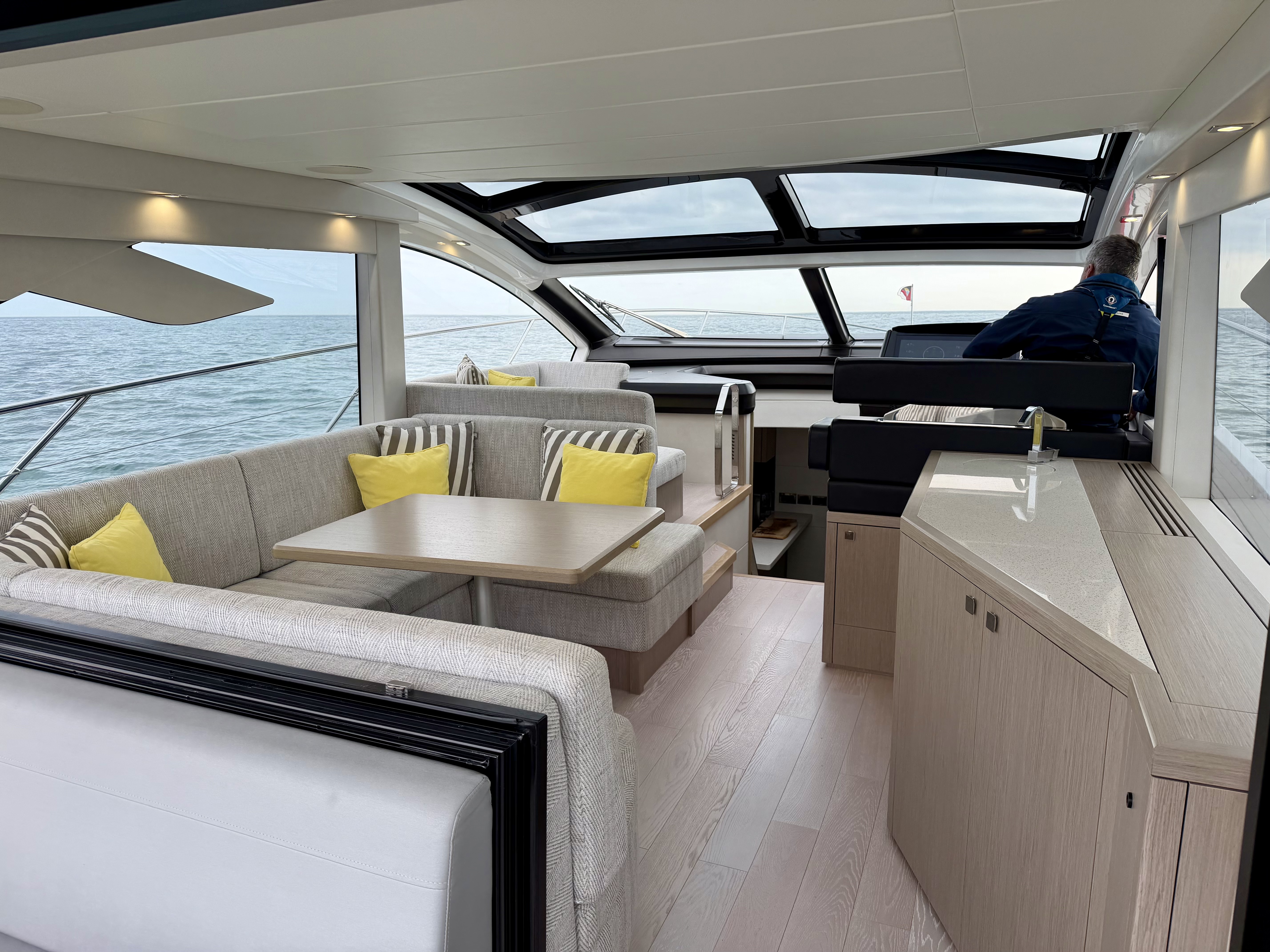 Electric opening drop window on the starboard side at the helm