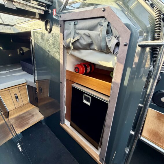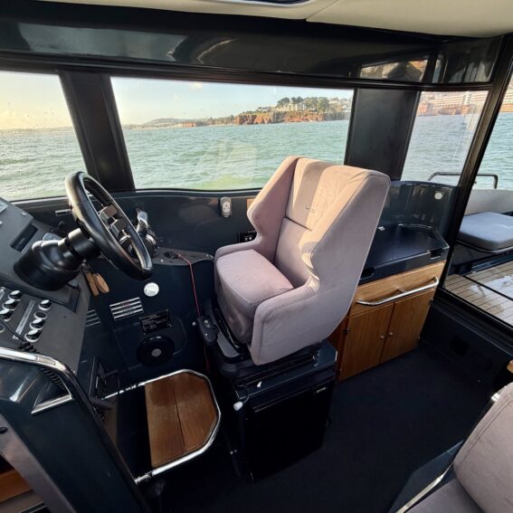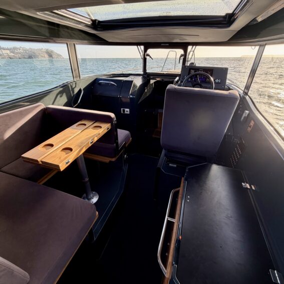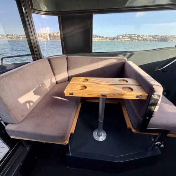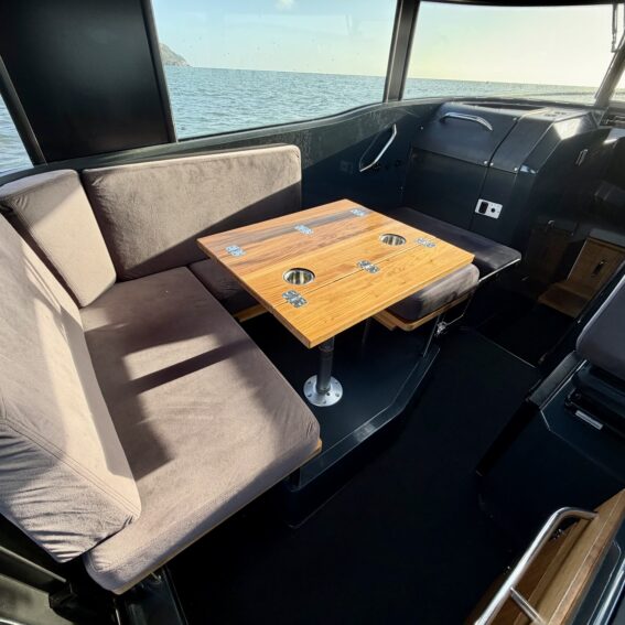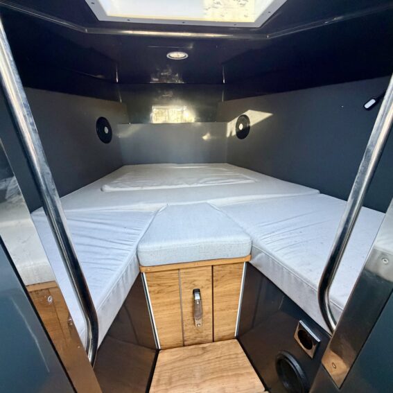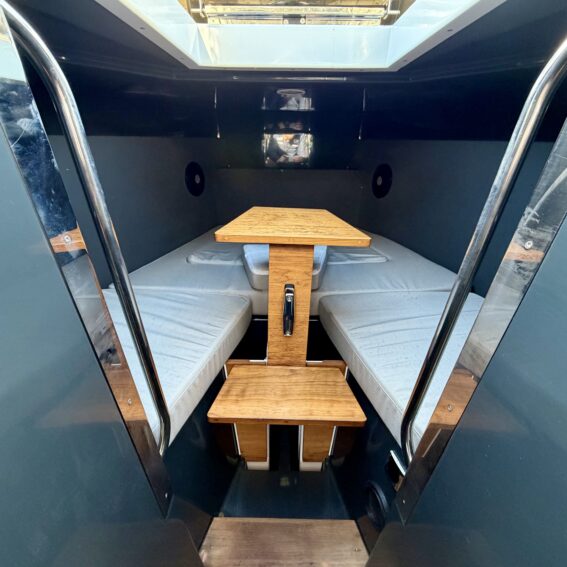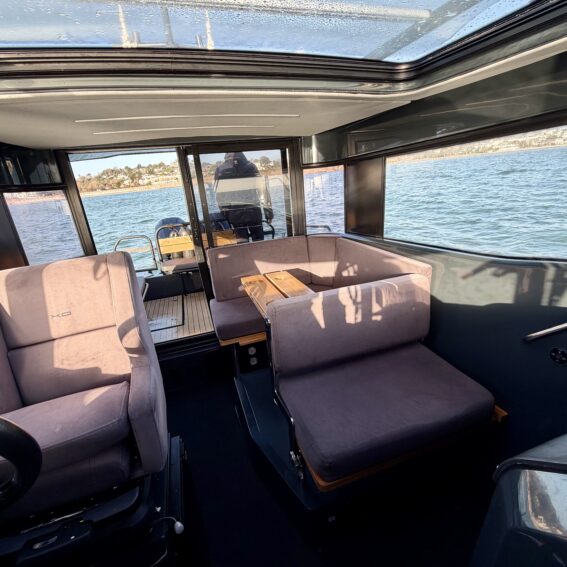 The aluminium hull and synthetic teak decking provide durability and low maintenance, while the spacious cockpit features aft gates, mooring cleats, storage lockers, cup holders, and deck lights. Access to the bow is facilitated by sliding foredeck access and stainless-steel handrails, with an anchor locker and Lewmar bow thruster enhancing convenience and manoeuvrability!