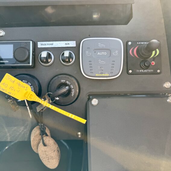 For navigation and safety, the boat is fitted with a Simrad chartplotter, VHF, compass, navigation lights, searchlight, horn, and both automatic and manual bilge pumps, along with fire extinguishers. Performance and handling are enhanced with the Mente Marina Auto Trim System and trim tabs. Additional features include roof racks and fenders with ropes!