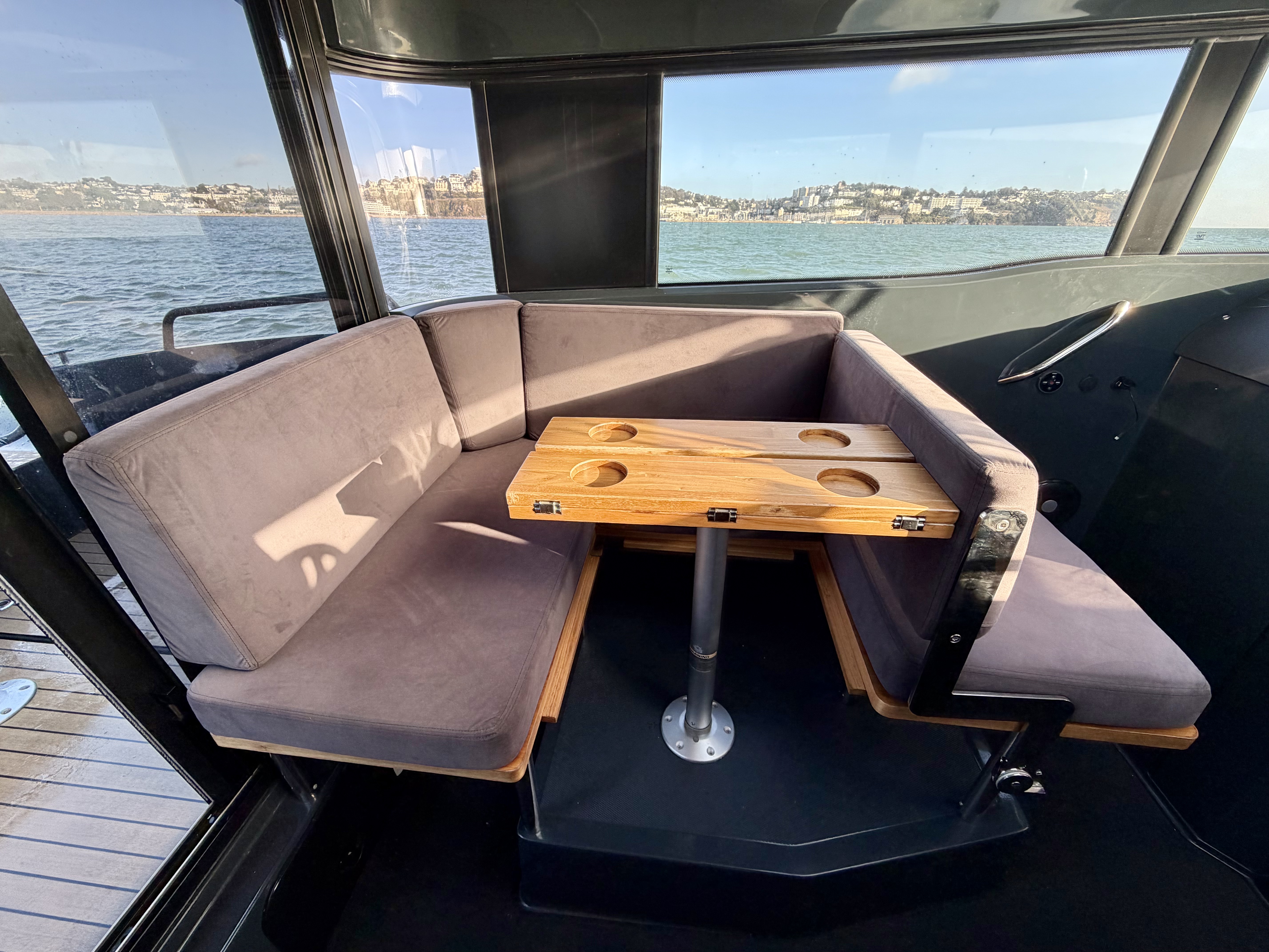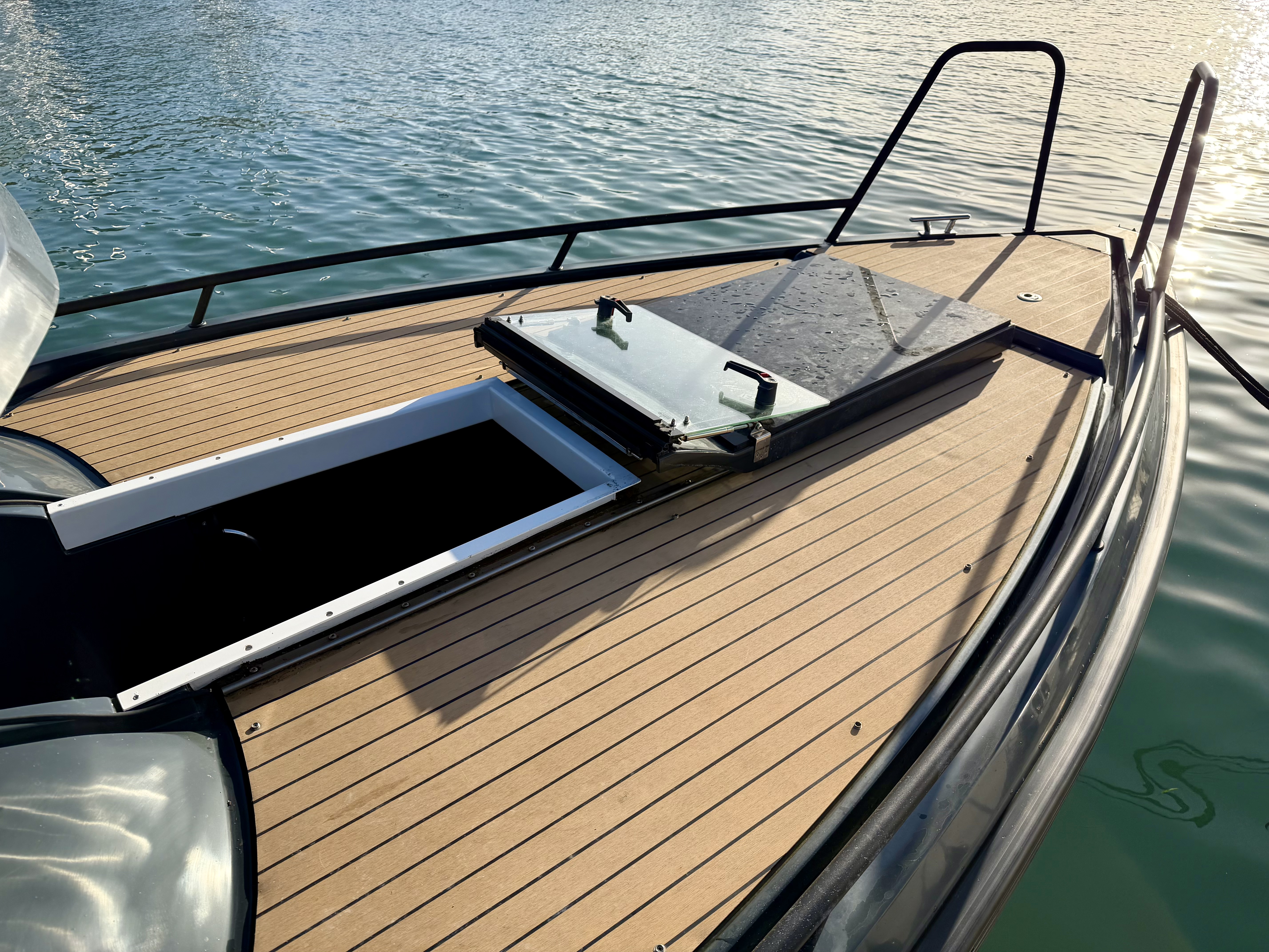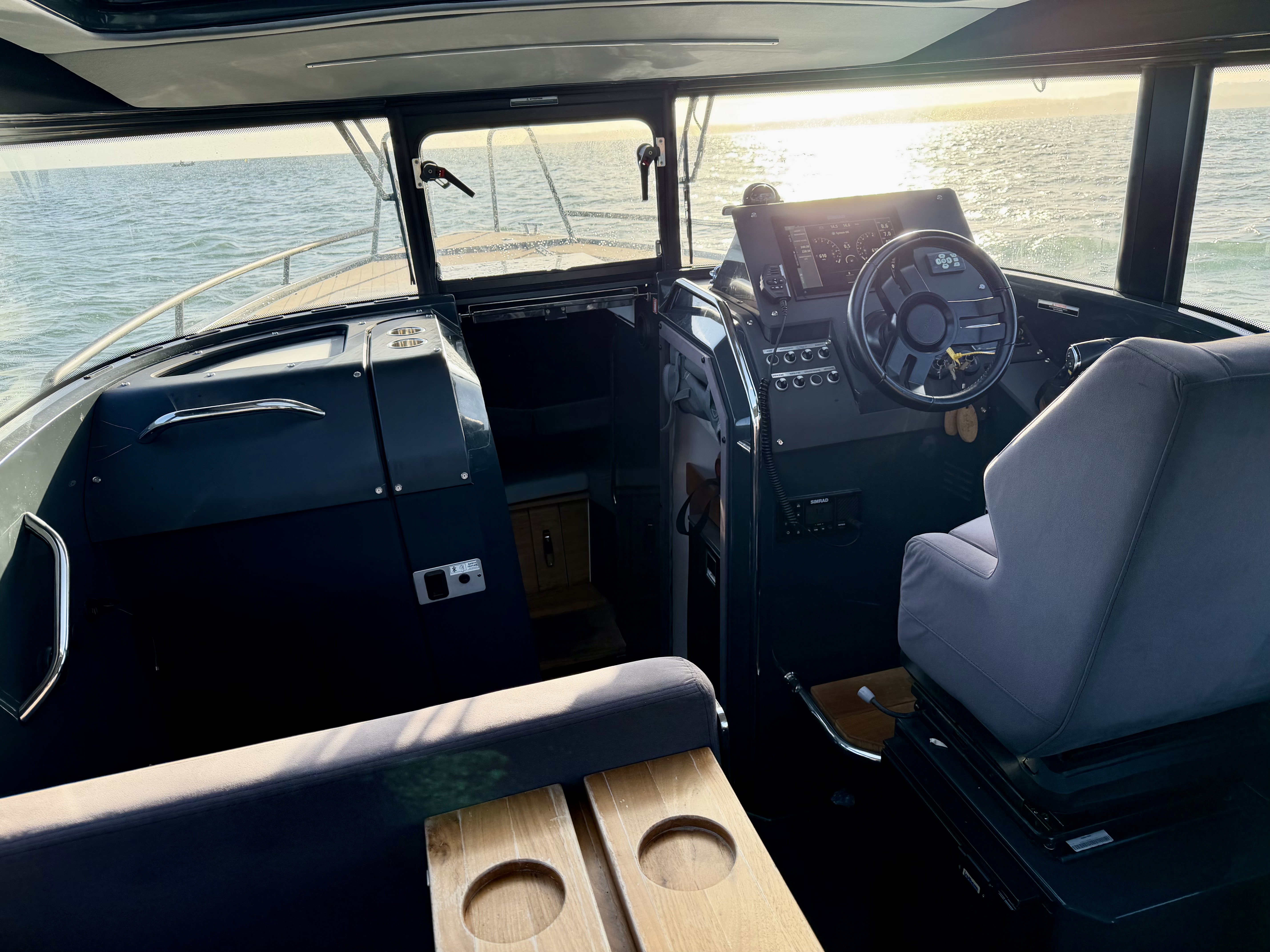The aluminium hull and synthetic teak decking provide durability and low maintenance, while the spacious cockpit features aft gates, mooring cleats, storage lockers, cup holders, and deck lights. Access to the bow is facilitated by sliding foredeck access and stainless-steel handrails, with an anchor locker and Lewmar bow thruster enhancing convenience and manoeuvrability!